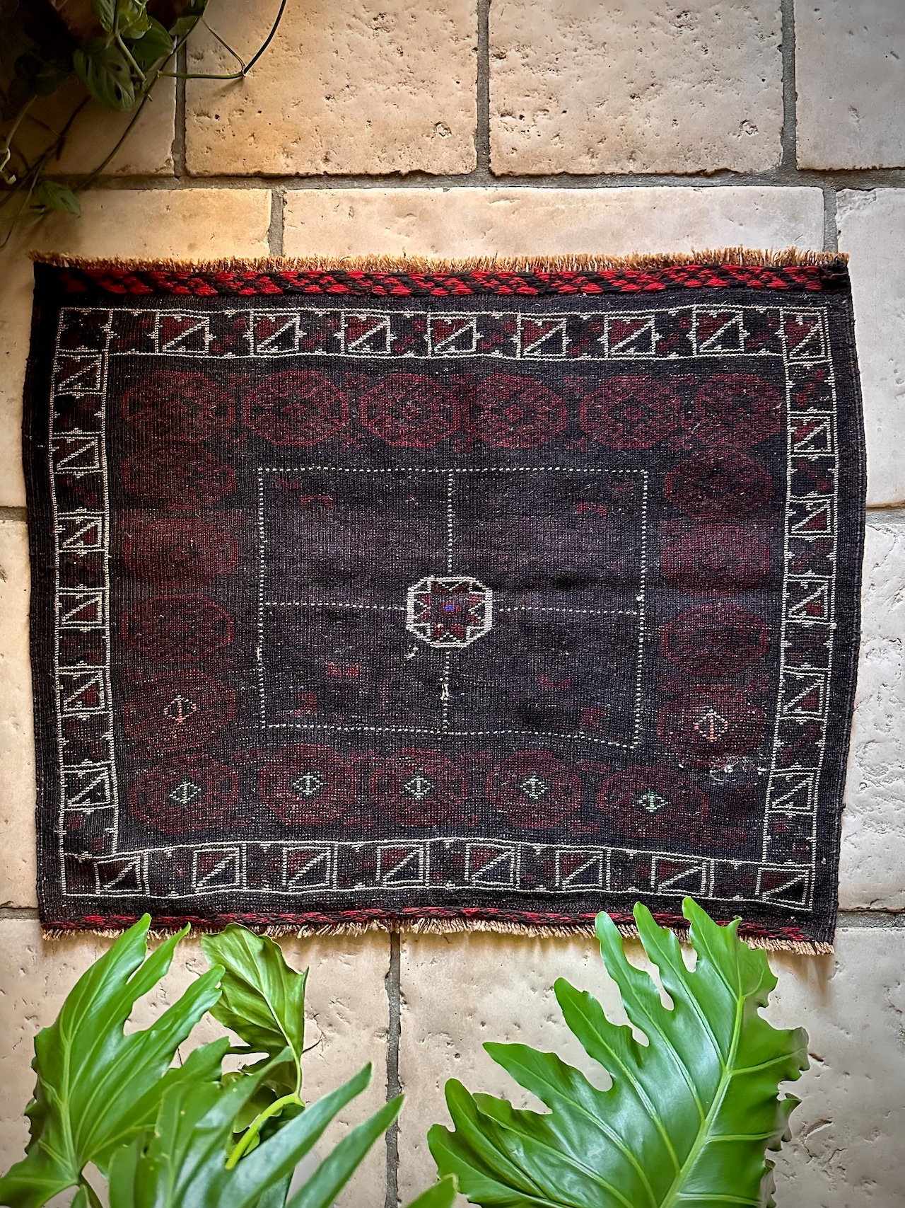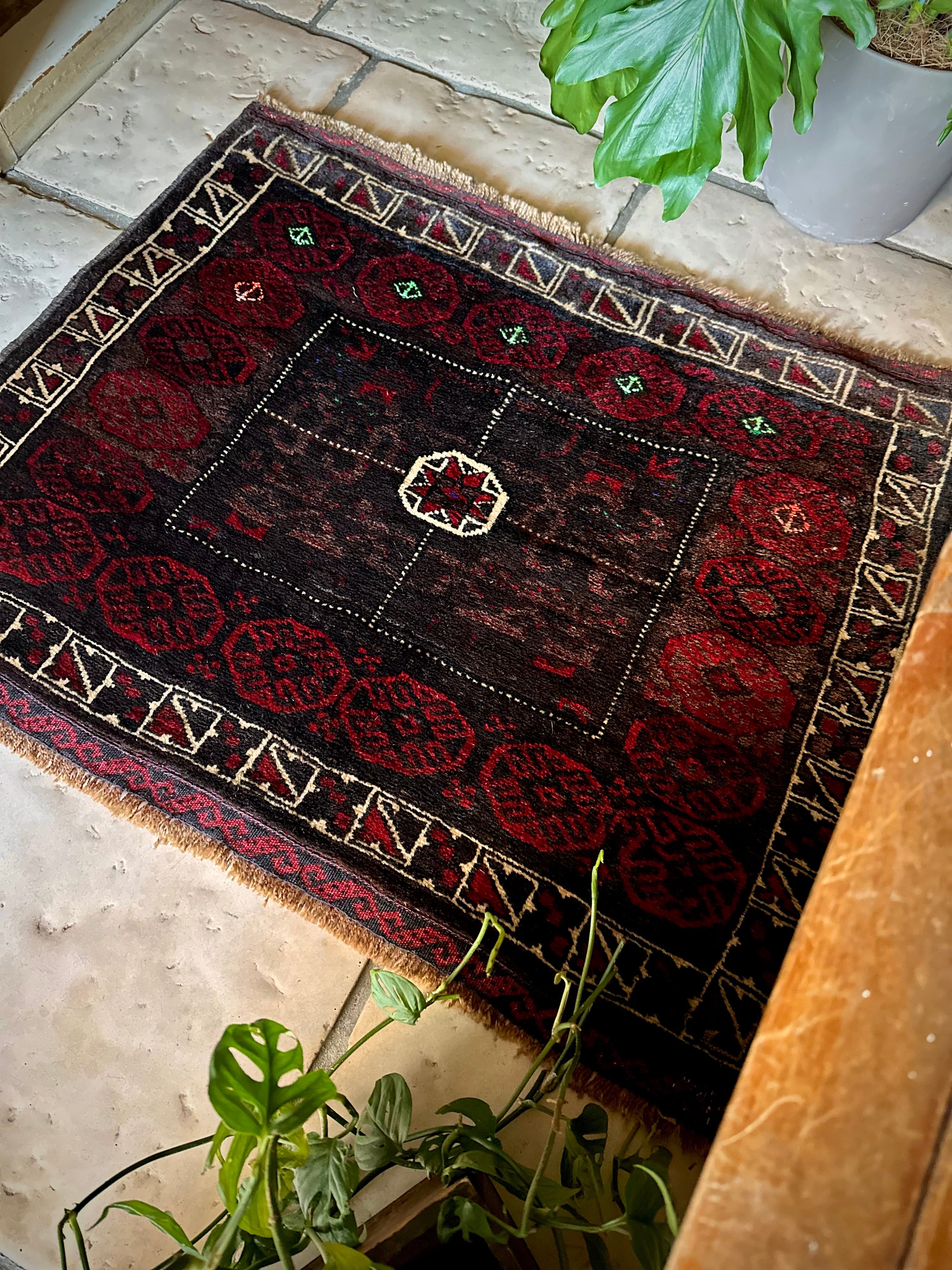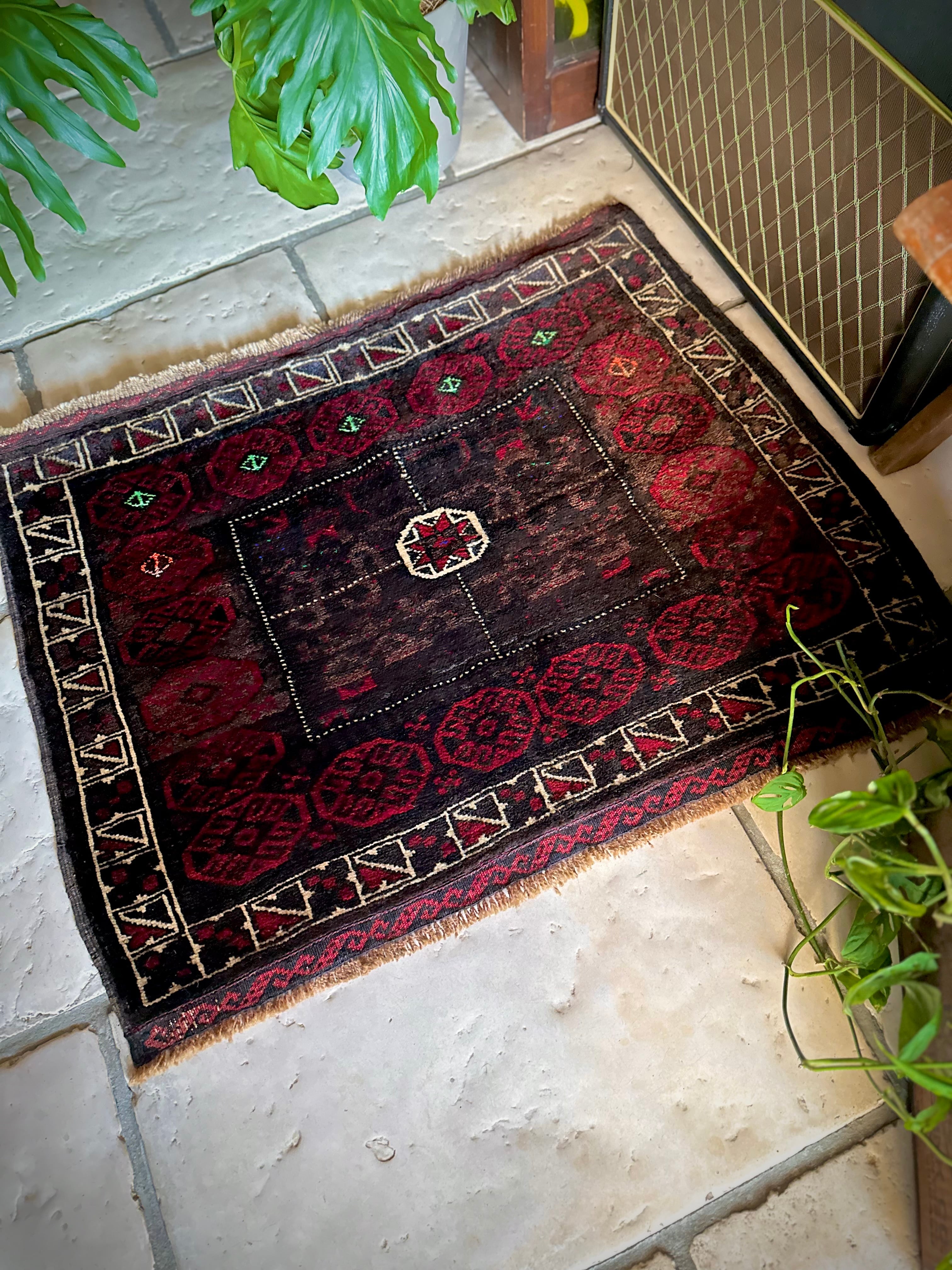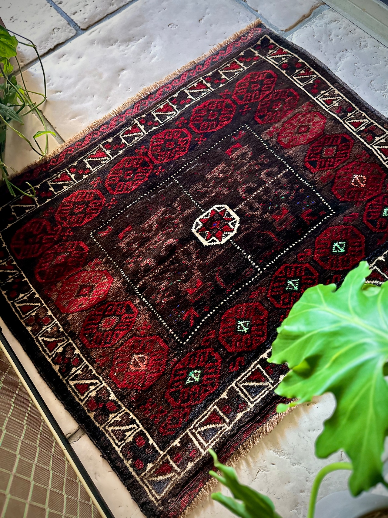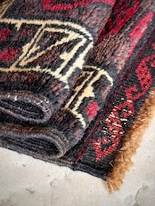 中央に幸運を司る八芒星に鈍く輝くボルドーの柄が描かれたブラックベースがかっこいい雰囲気のこちらは、アフガニスタンはヘラート州に居住するバルーチ族のトライバルラグで、元はラクダなどに背負わせるホルジンと呼ばれる振り分け用バッグの表皮のみをラグに仕立て直したモノになります。