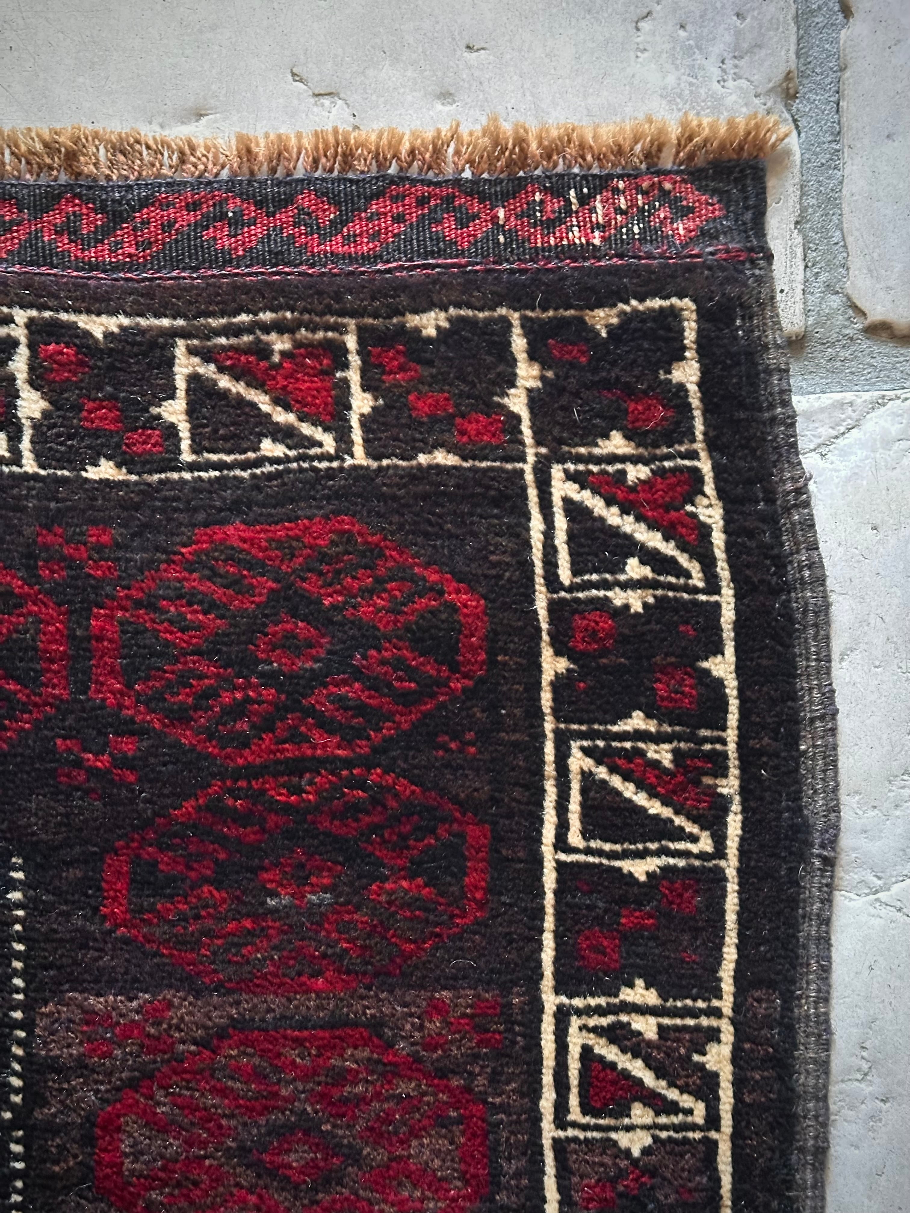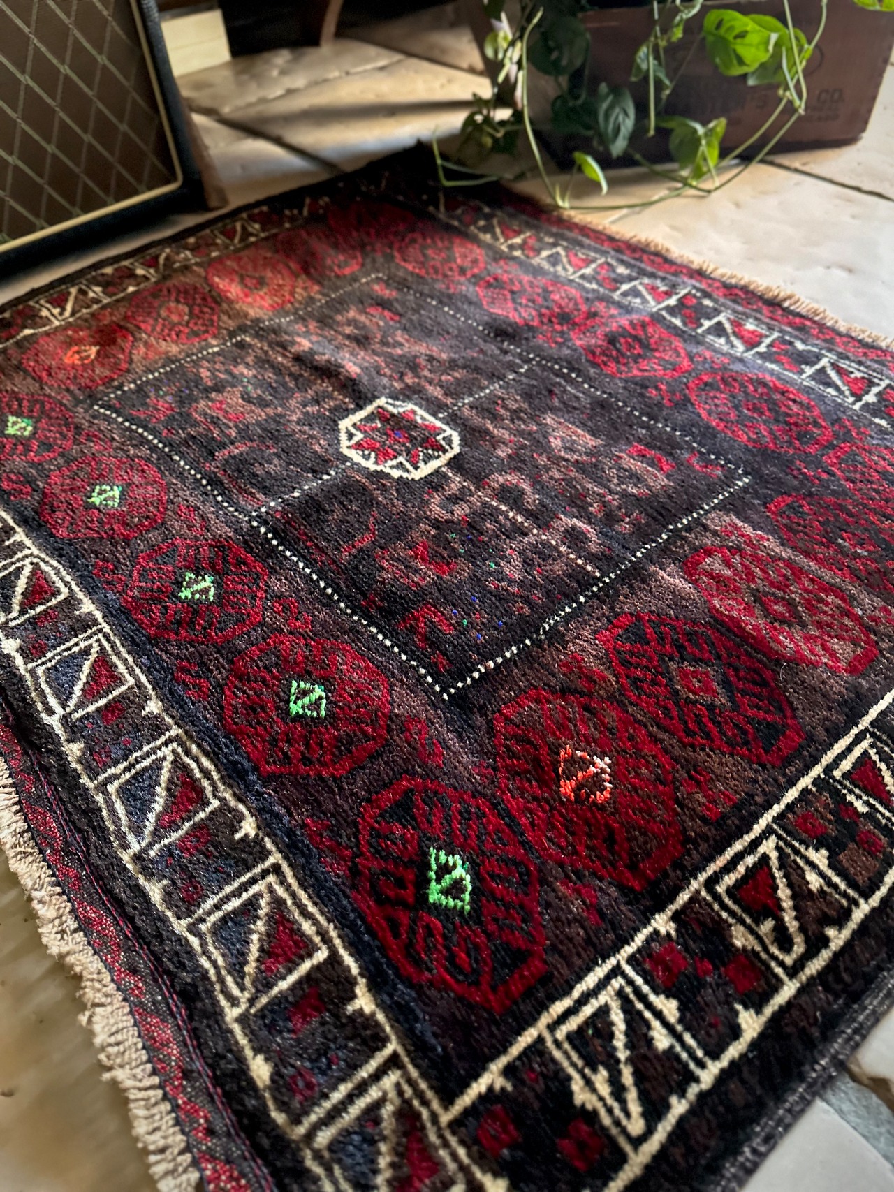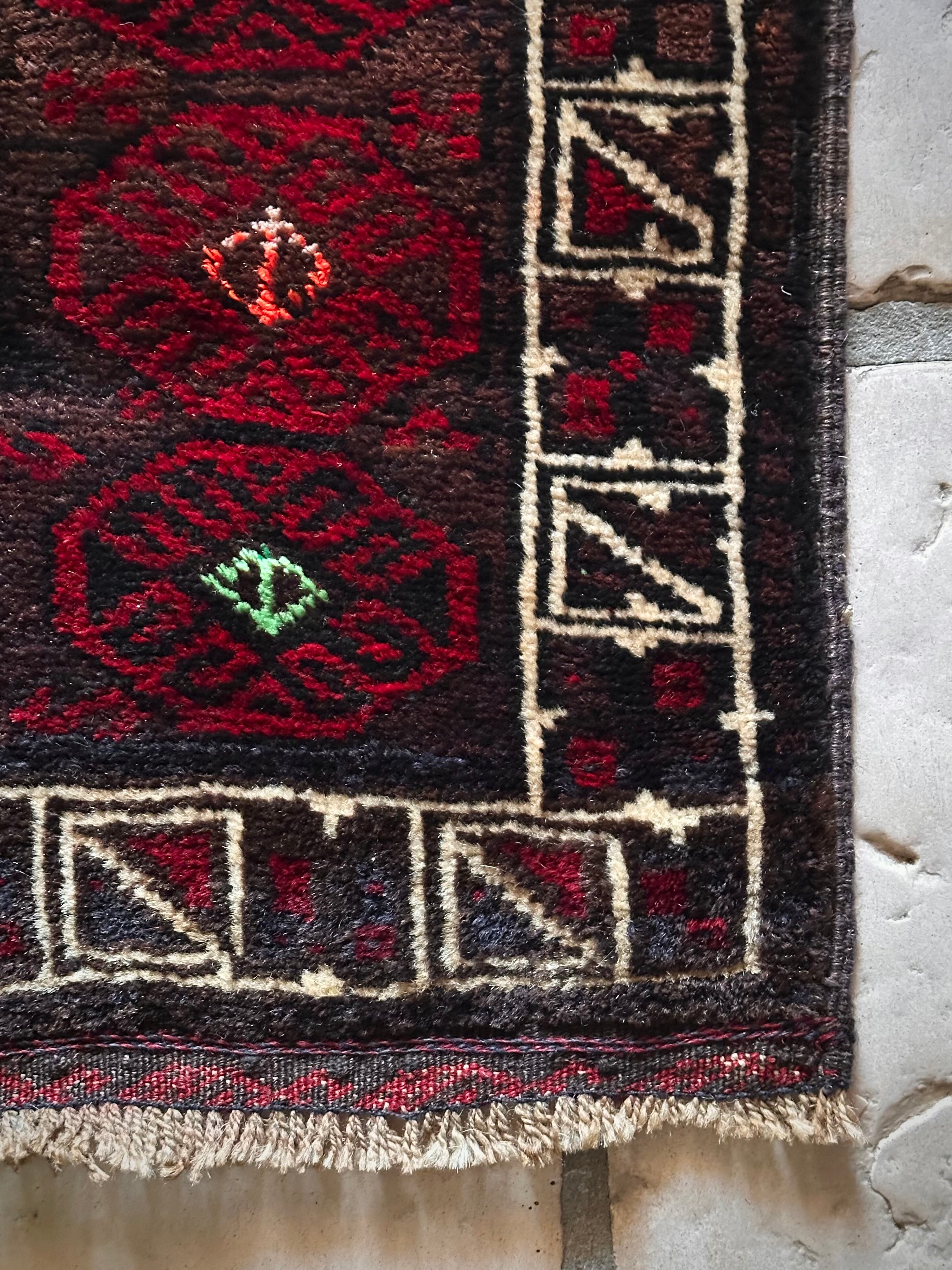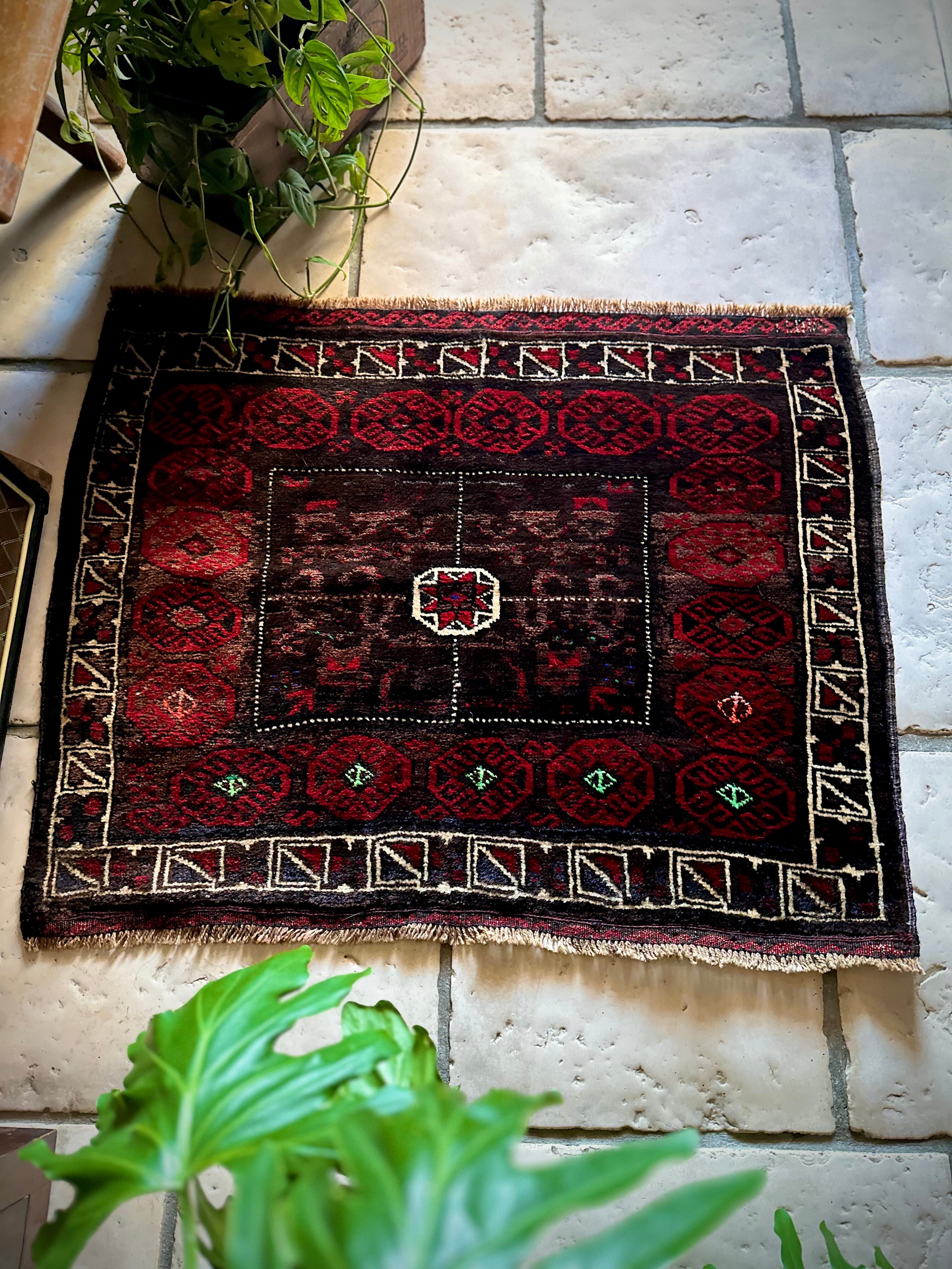 中央に幸運を司る八芒星に鈍く輝くボルドーの柄が描かれたブラックベースがかっこいい雰囲気のこちらは、アフガニスタンはヘラート州に居住するバルーチ族のトライバルラグで、元はラクダなどに背負わせるホルジンと呼ばれる振り分け用バッグの表皮のみをラグに仕立て直したモノになります。