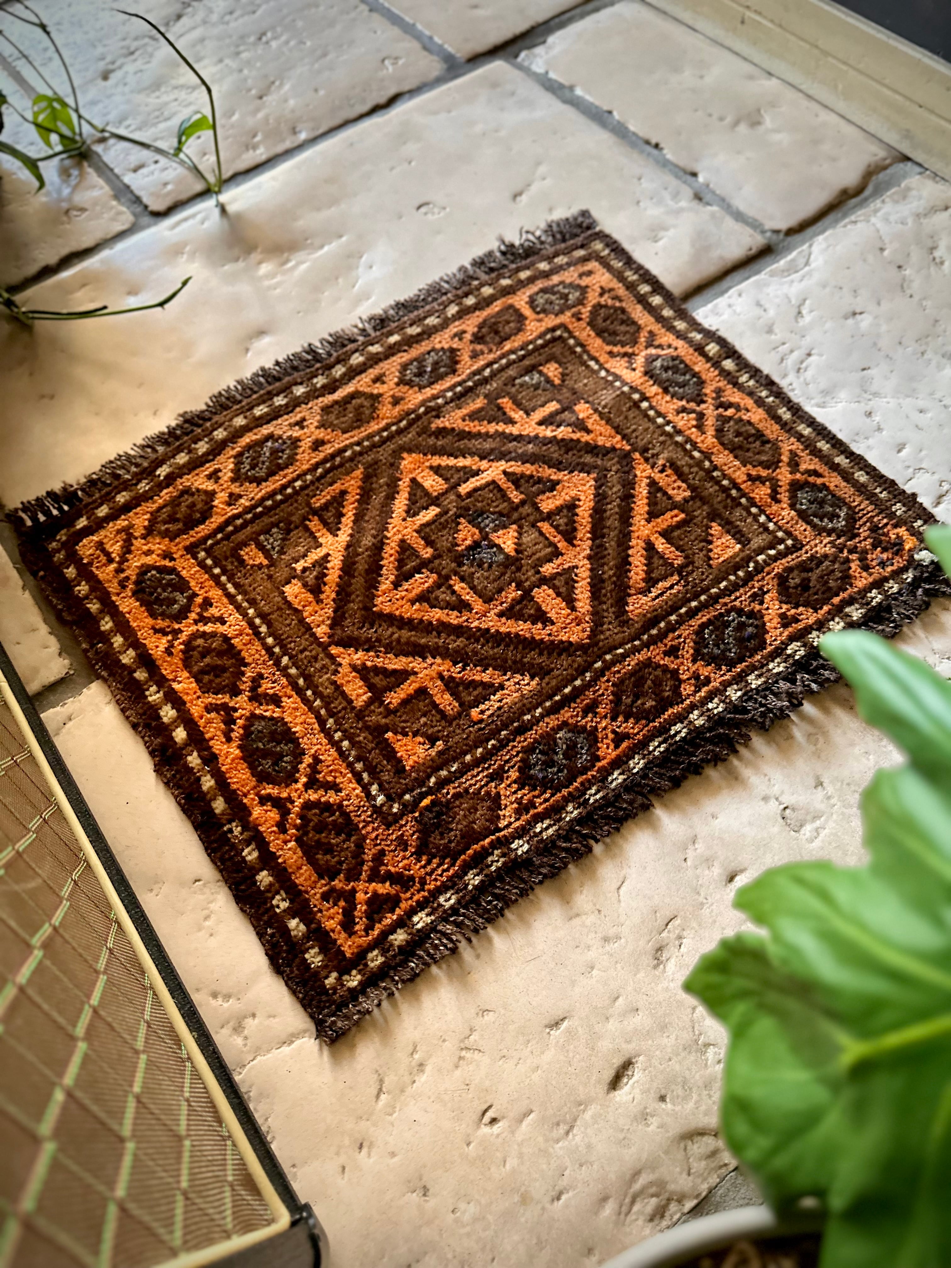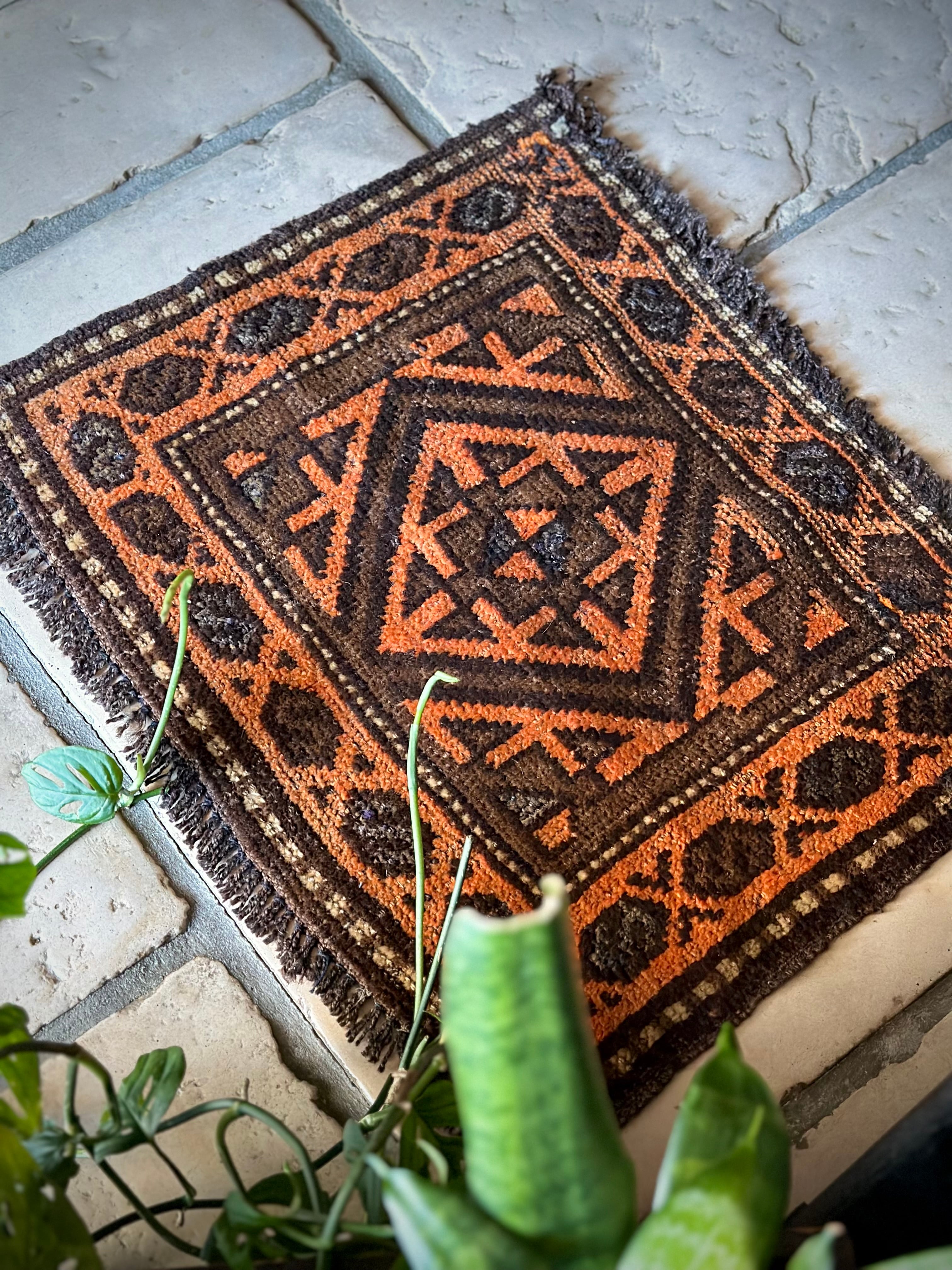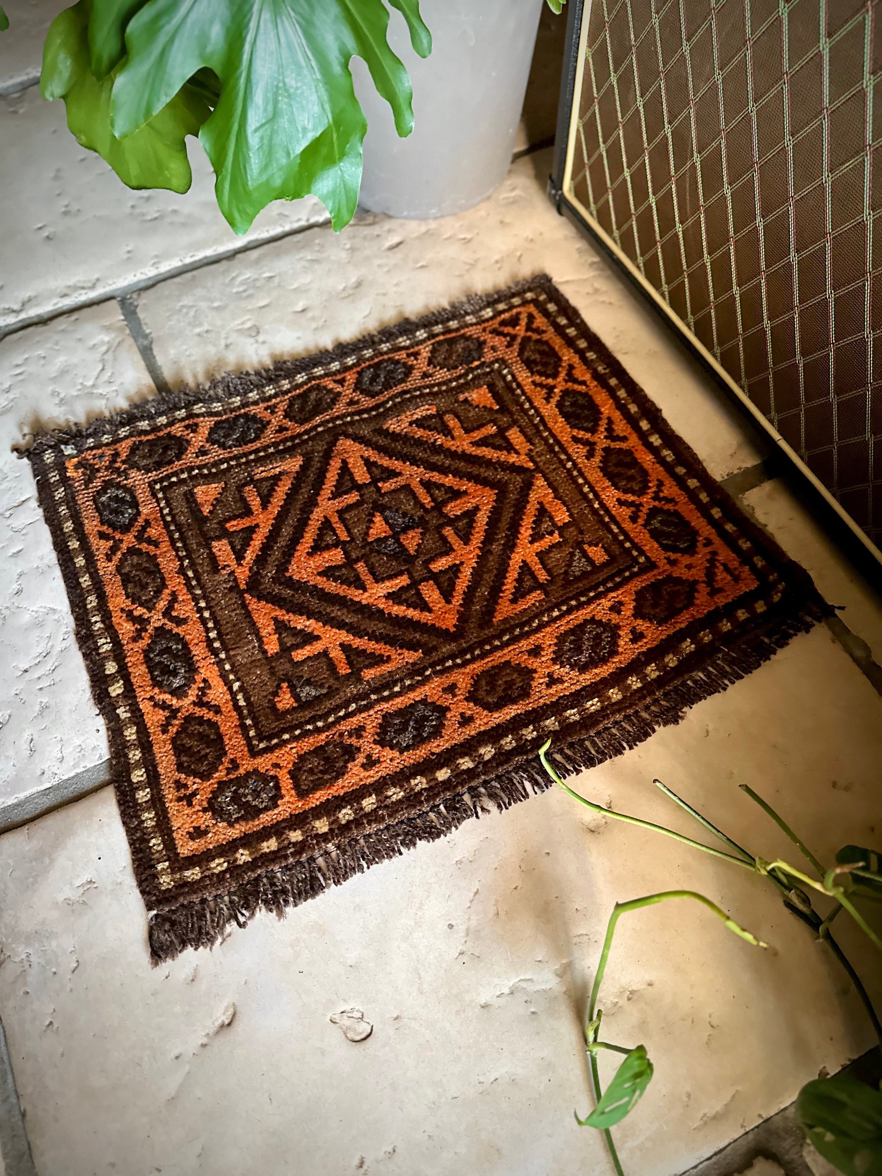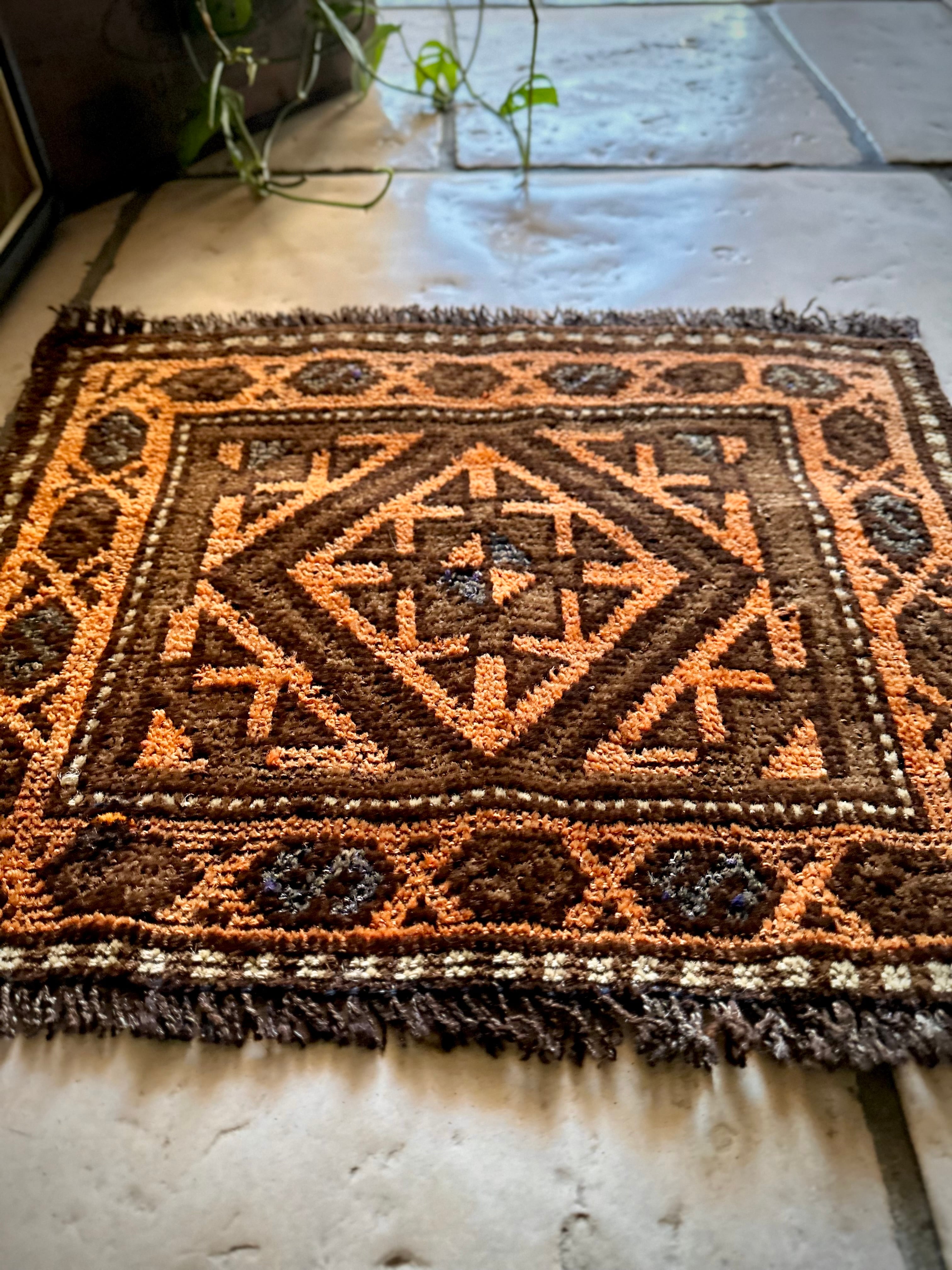 ちょっとしたお部屋のアクセントに植物の鉢置きとしても活用出来るミニラグなサイズ感で、ソファの座面や壁掛けとしても良い雰囲気でしょうか。