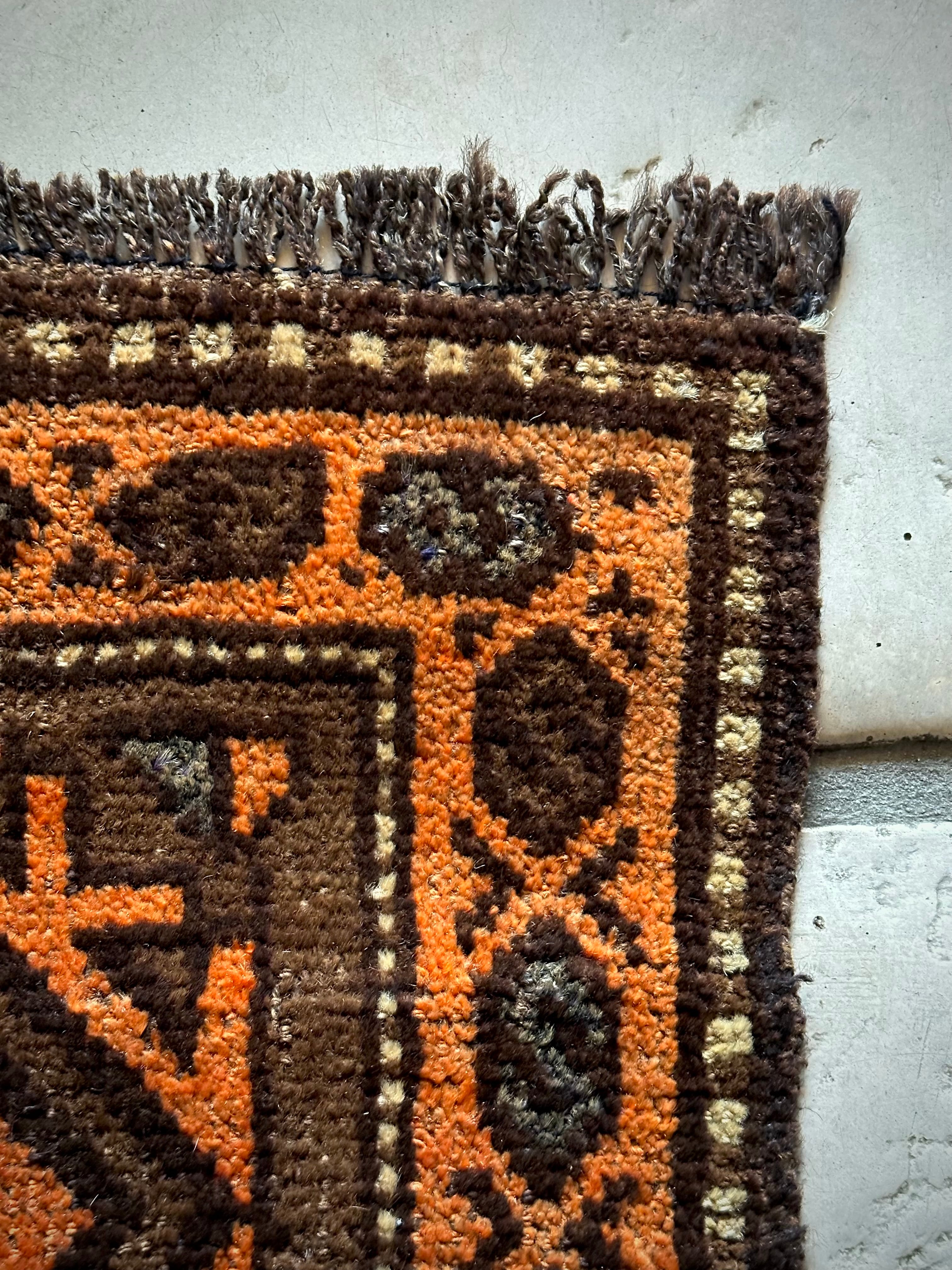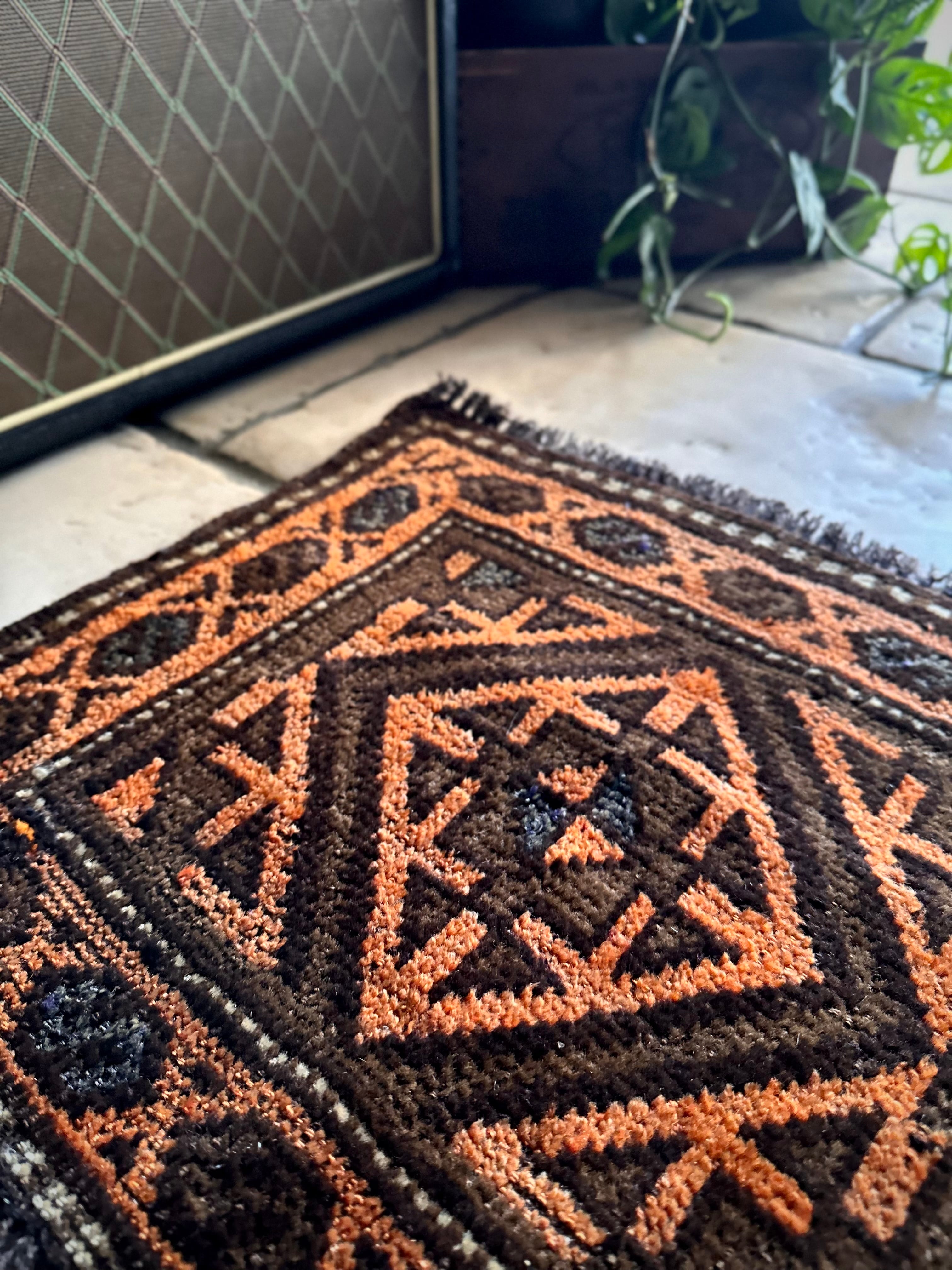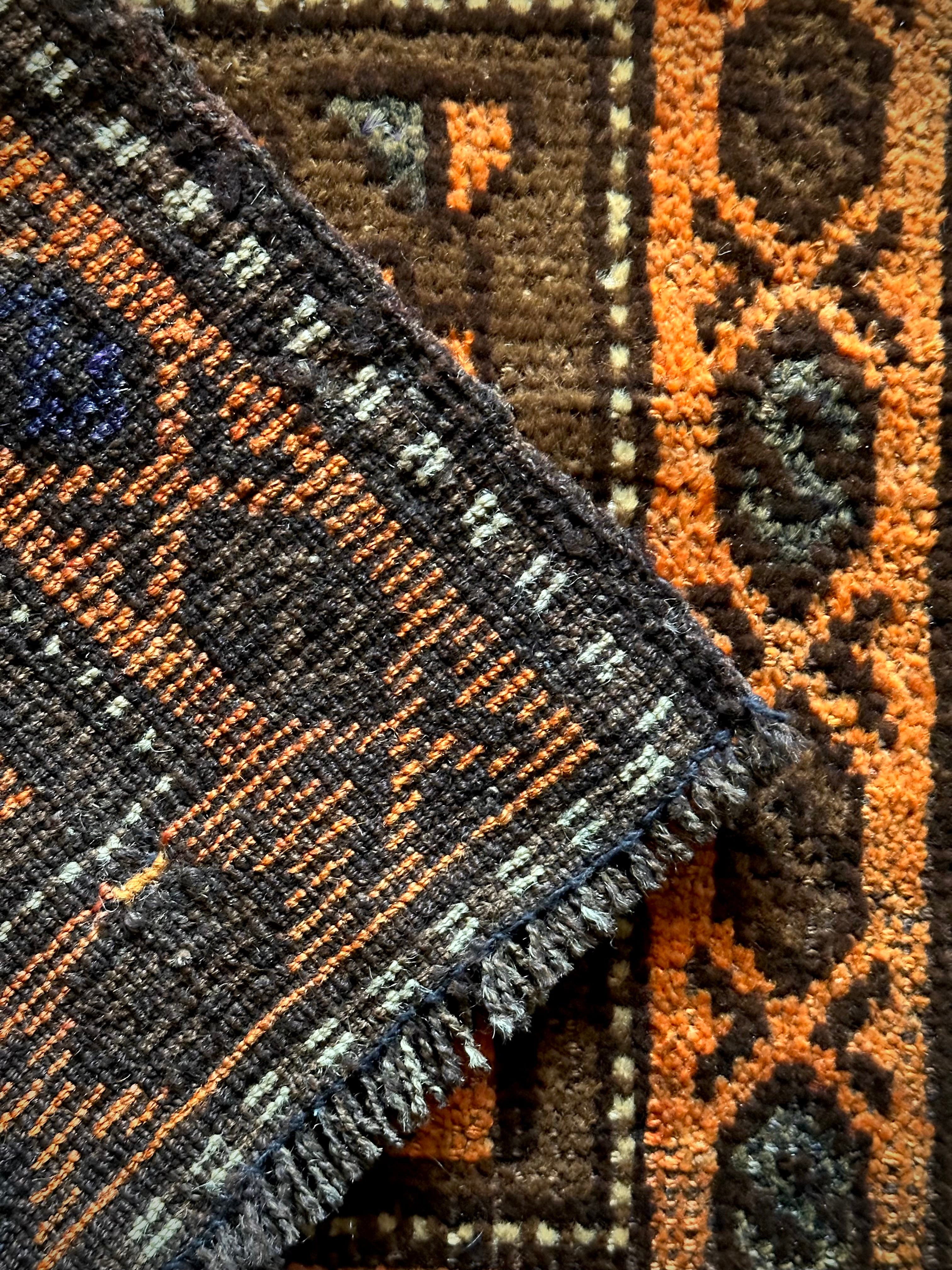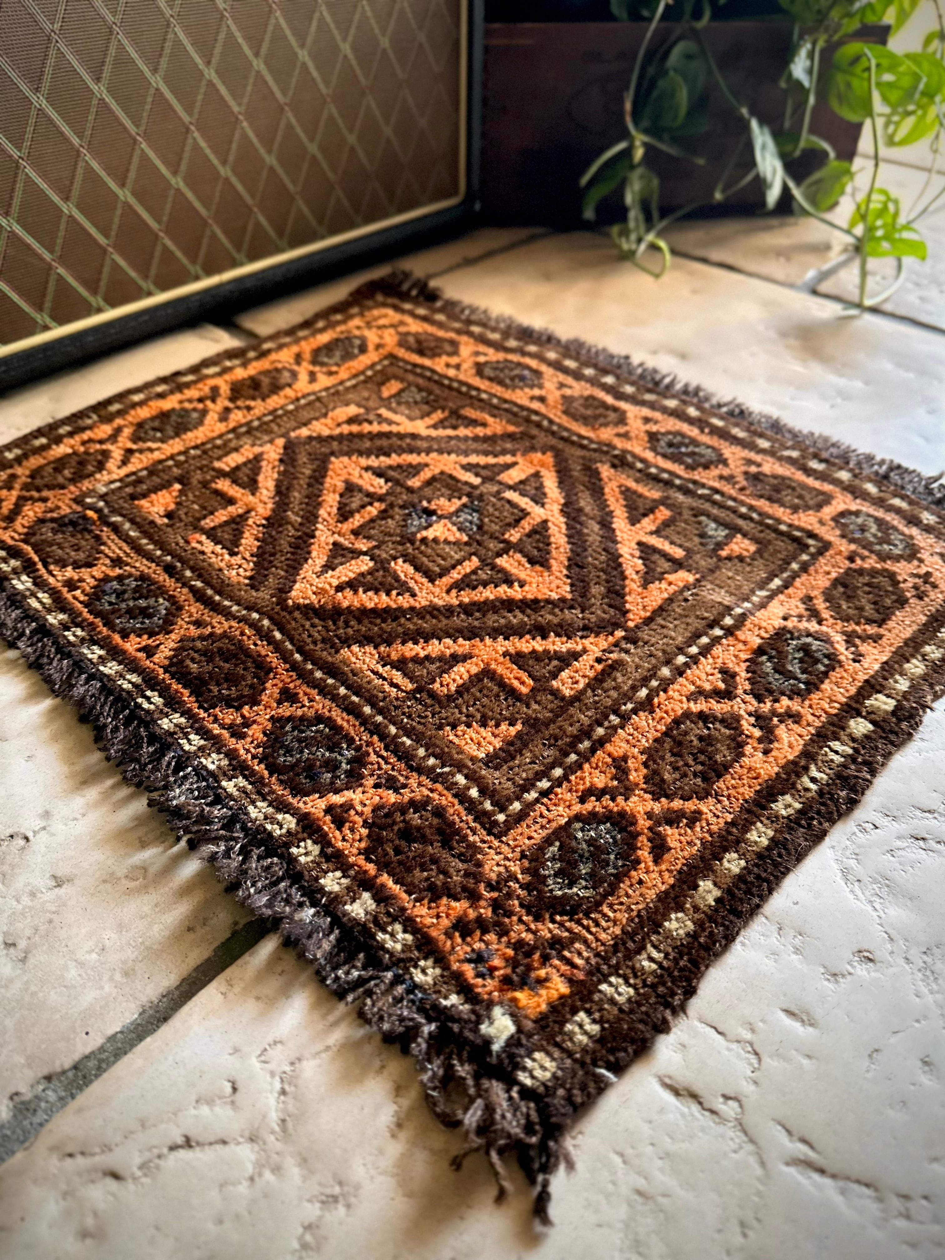 何にでも合わせやすそうなテラコッタとブラウンの配色に大振りなギュル紋様がおおらかな雰囲気を醸し出しているこちらは、アフガニスタンはヘラート州に居住するバルーチ族のトライバルラグで、元はラクダなどに背負わせるホルジンと呼ばれる振り分け用バッグの表皮のみをラグに仕立て直したモノになります。