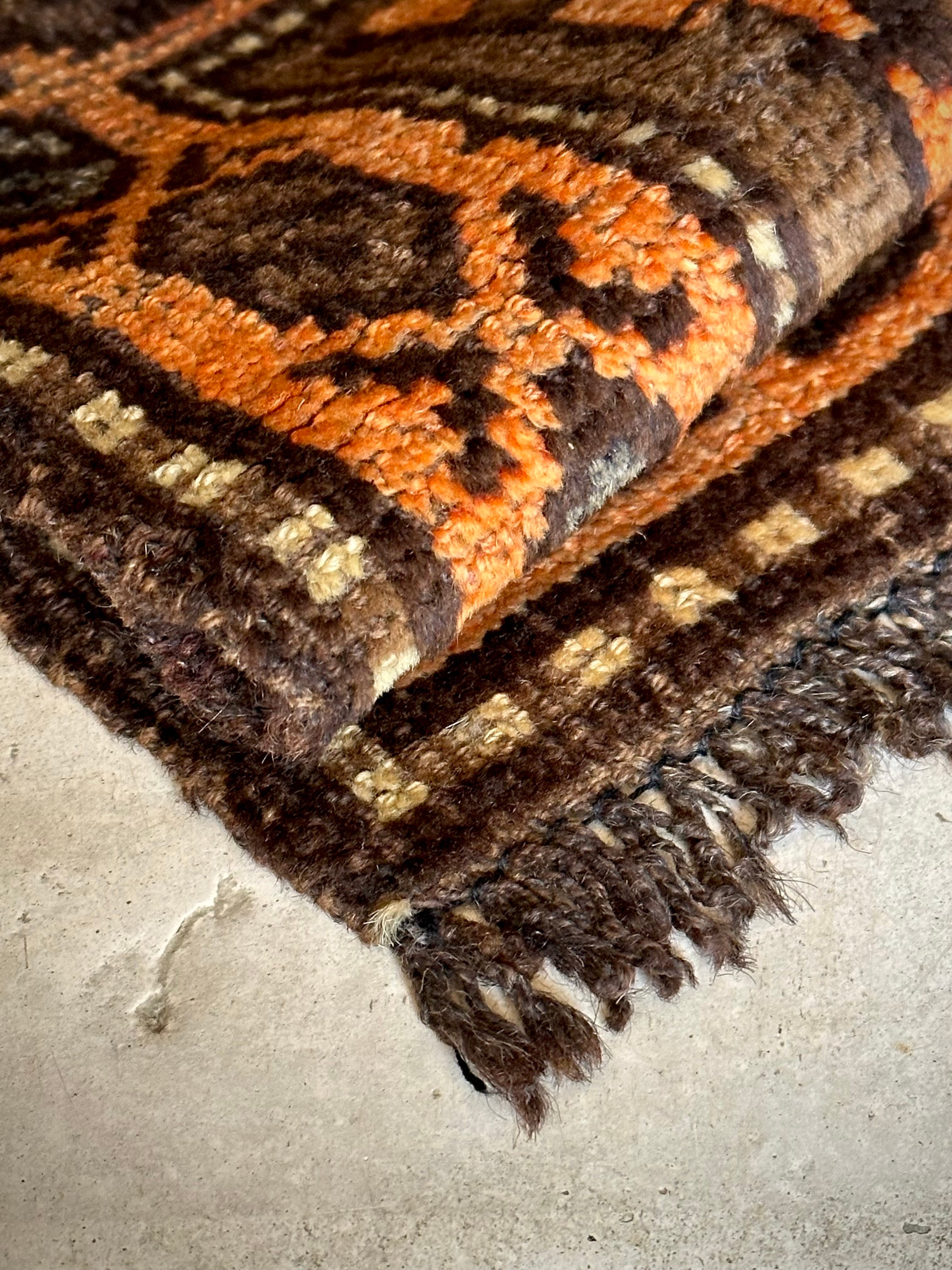 経年としては45年のヴィンテージラグらしく、元からざっくりとした織りにヤレ感などはありますが、特に目立つ汚れやダメージにリペア箇所は見当たらないグッドなコンディションで、パイル自体は短めのサラッとした肌触りのアクセントラグになります。