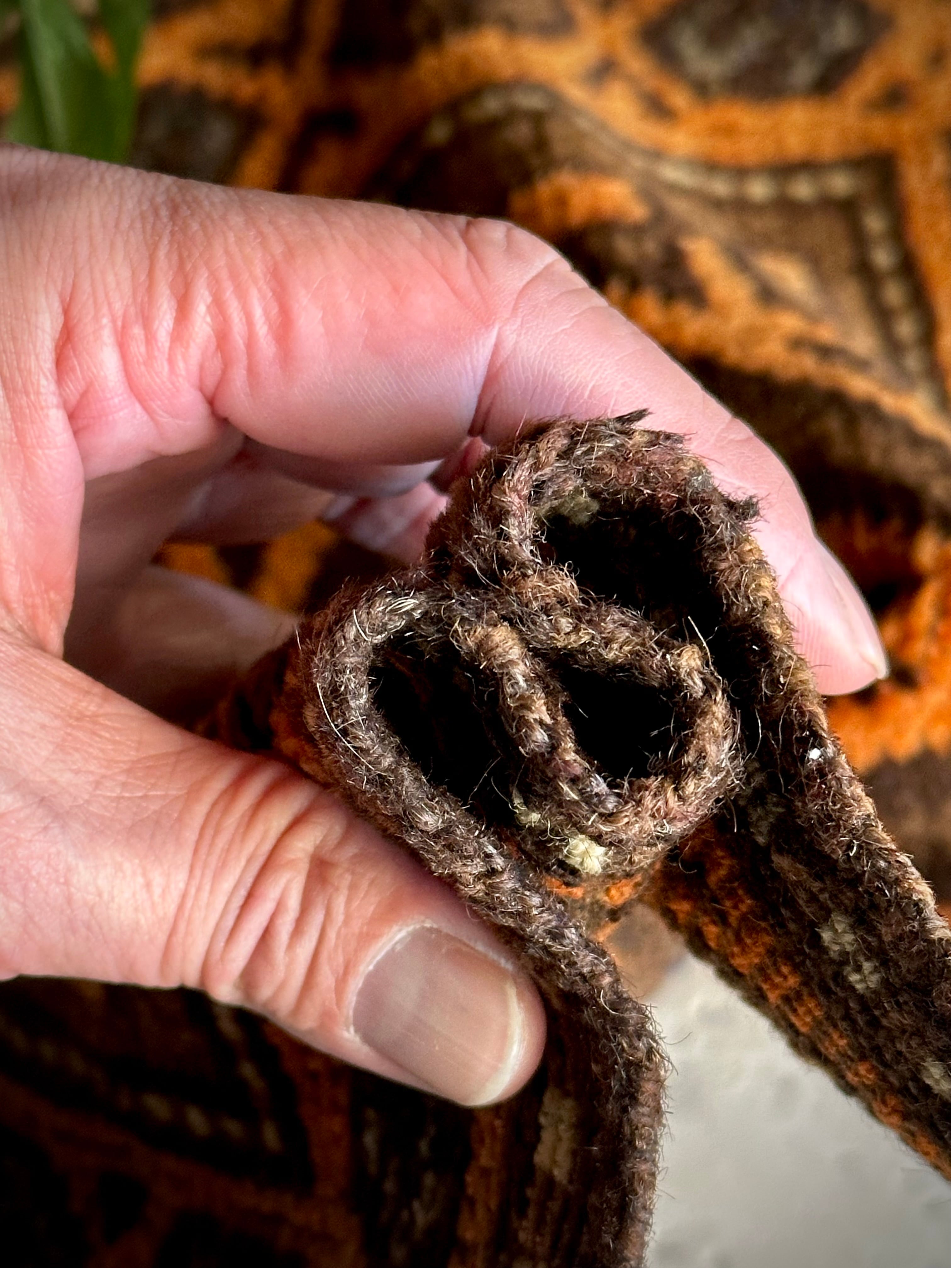 最後にラグそのものに関しては羊毛特有の匂いがあり、採寸は中央付近で計測していますが、手織りならではの歪みによる誤差や水洗いクリーニングによる縮み、また草木染めによる経年劣化の色ムラなどがありますが、それもまたヴィンテージラグの魅力かとご理解ください。