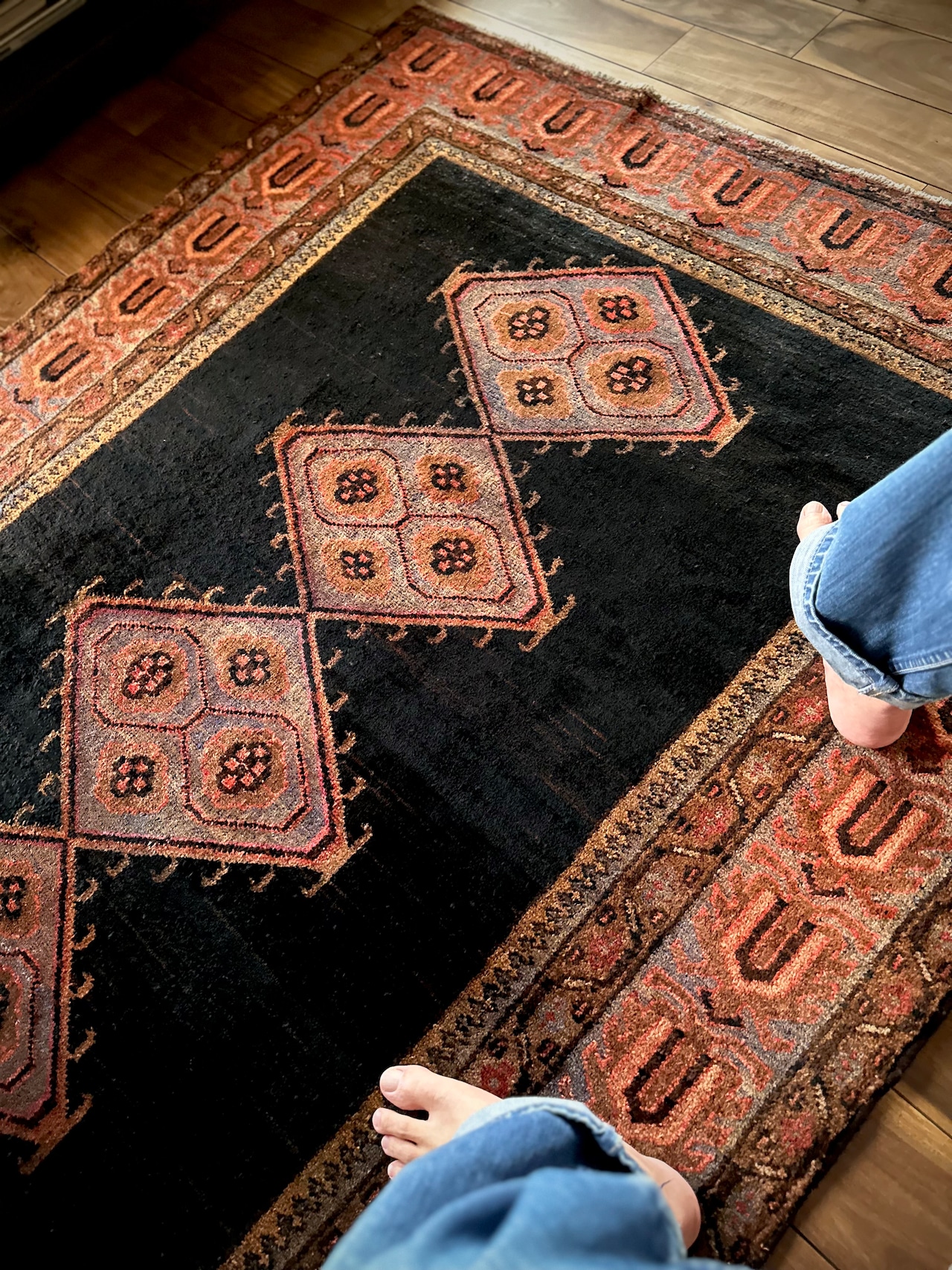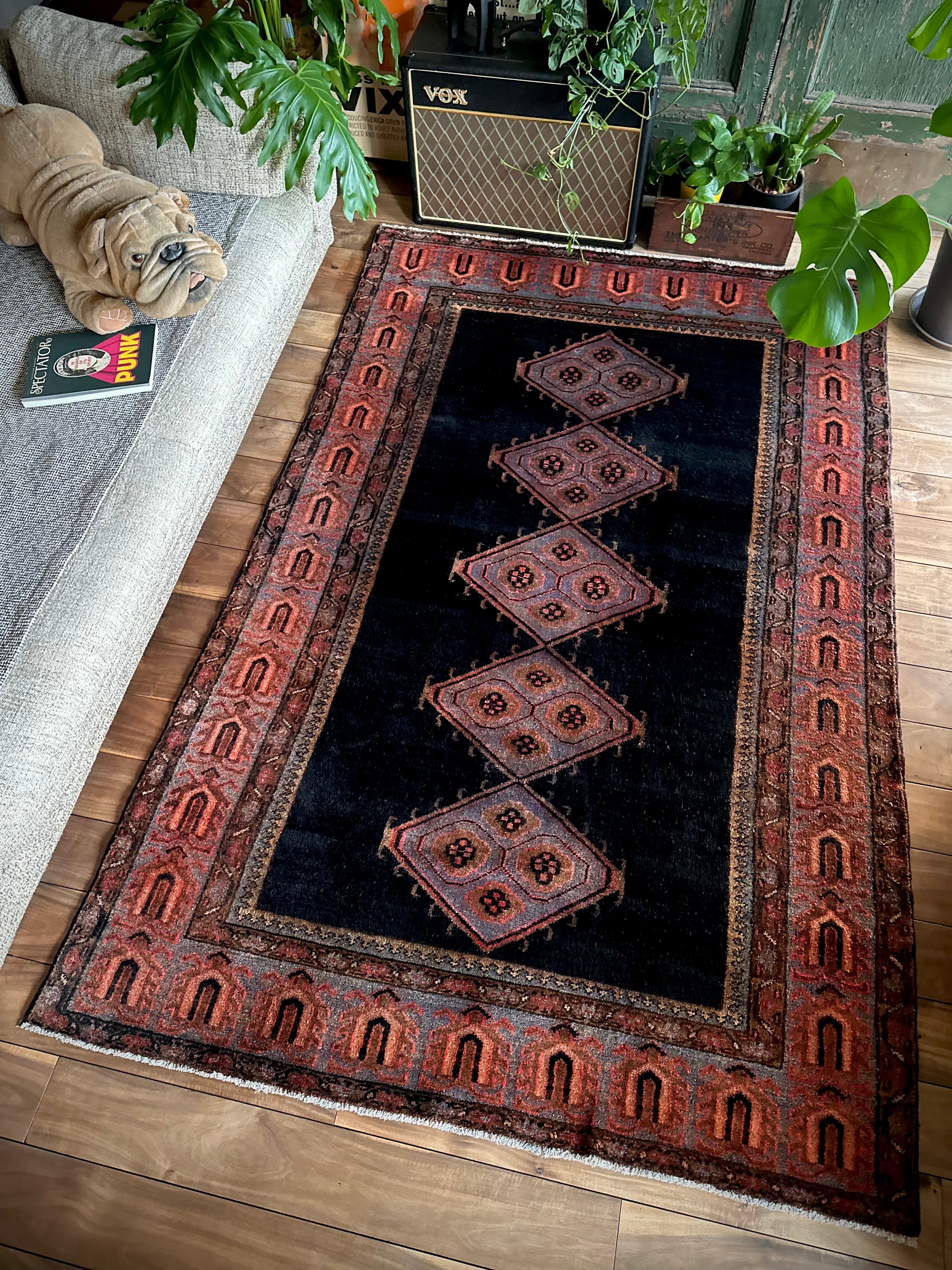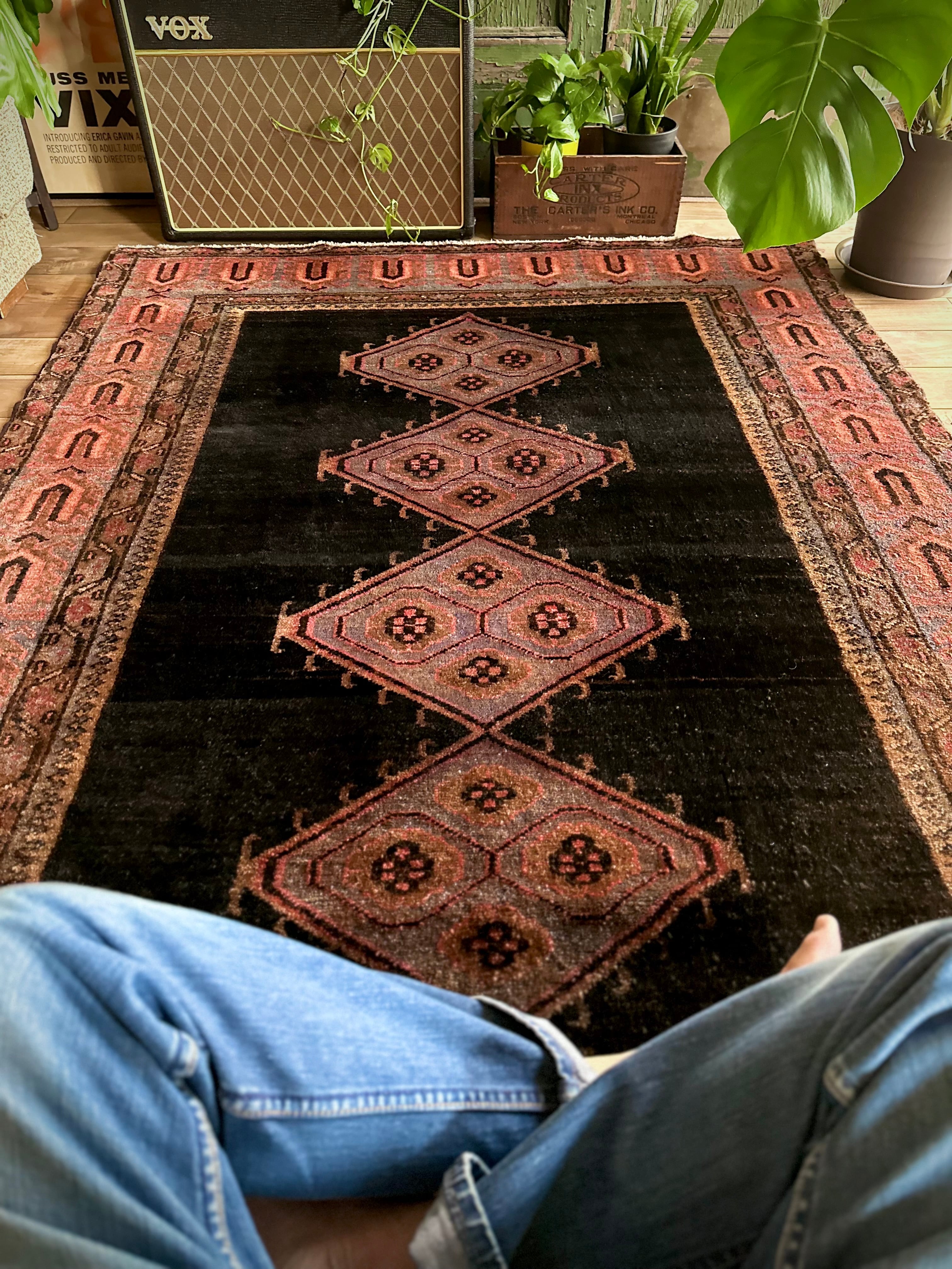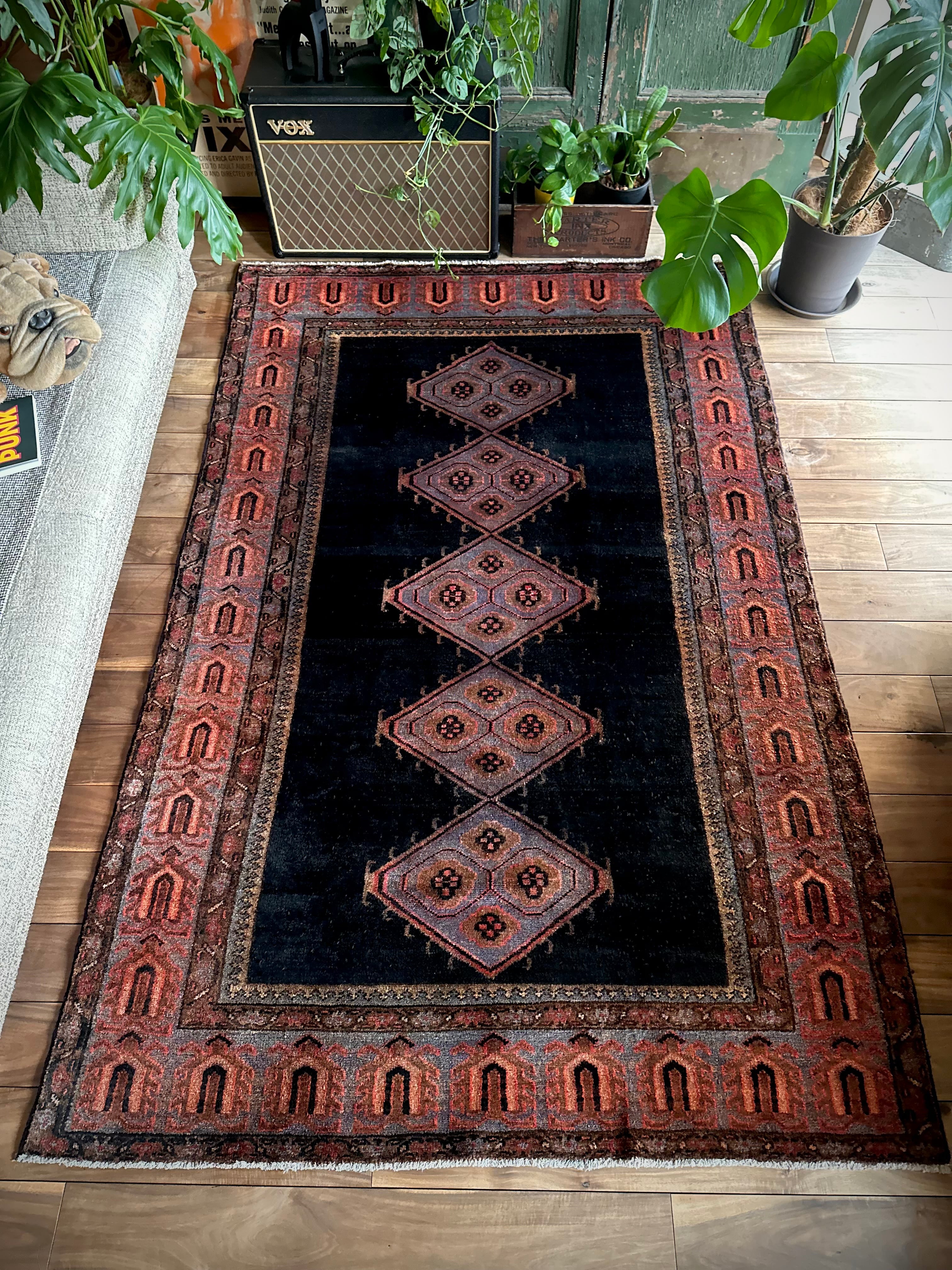 こういった近隣の村々で手織りされたトライバル以外のラグは集積場の名称で判別されますが、ブルーグレーの奇妙なメダリオンよろしく、全体的になんとも言えない愚鈍な配色が個人的には激渋で堪りませんわと、リビングに敷かれた実物はもっとかっこいい雰囲気を醸し出しています。
