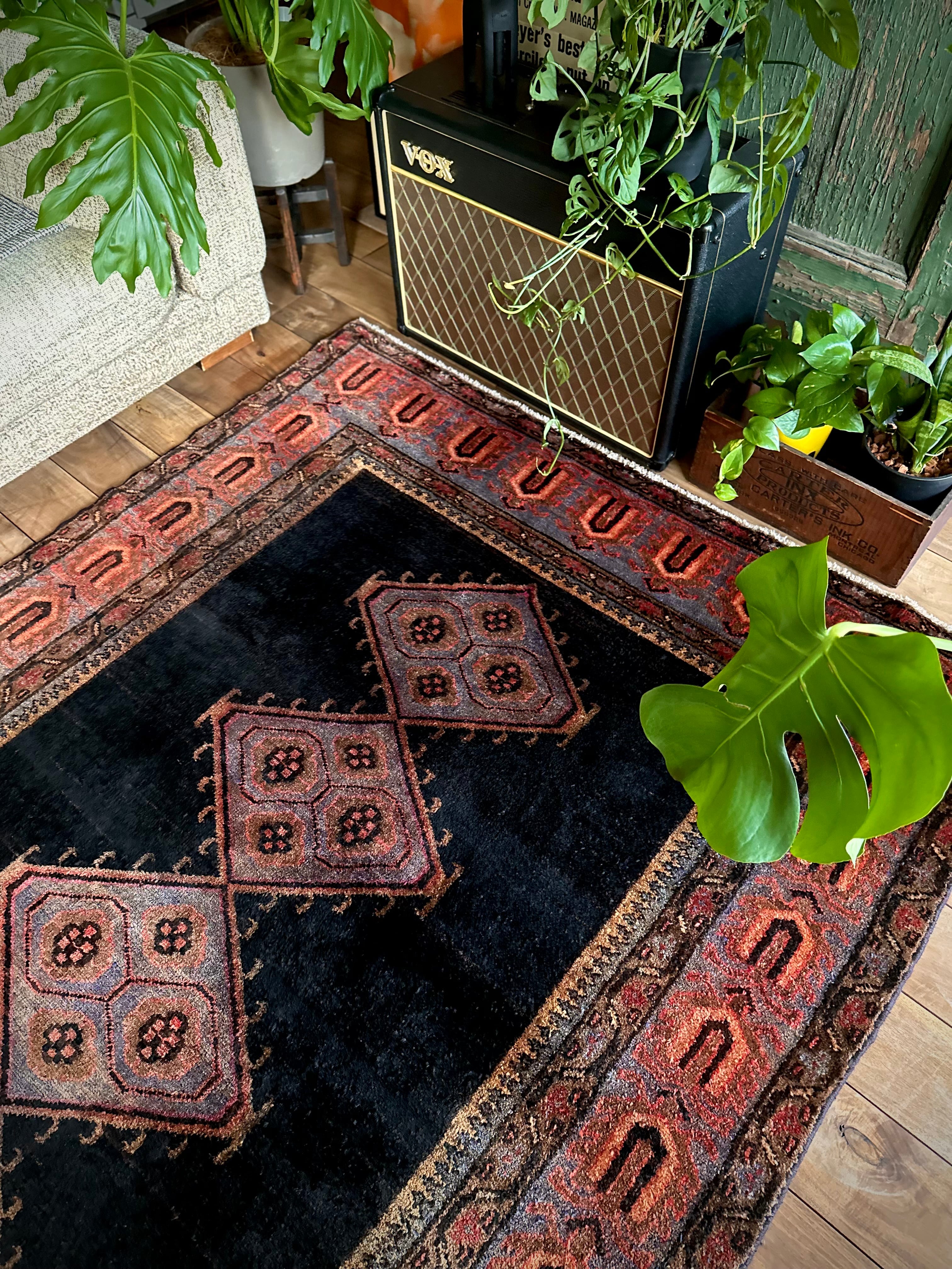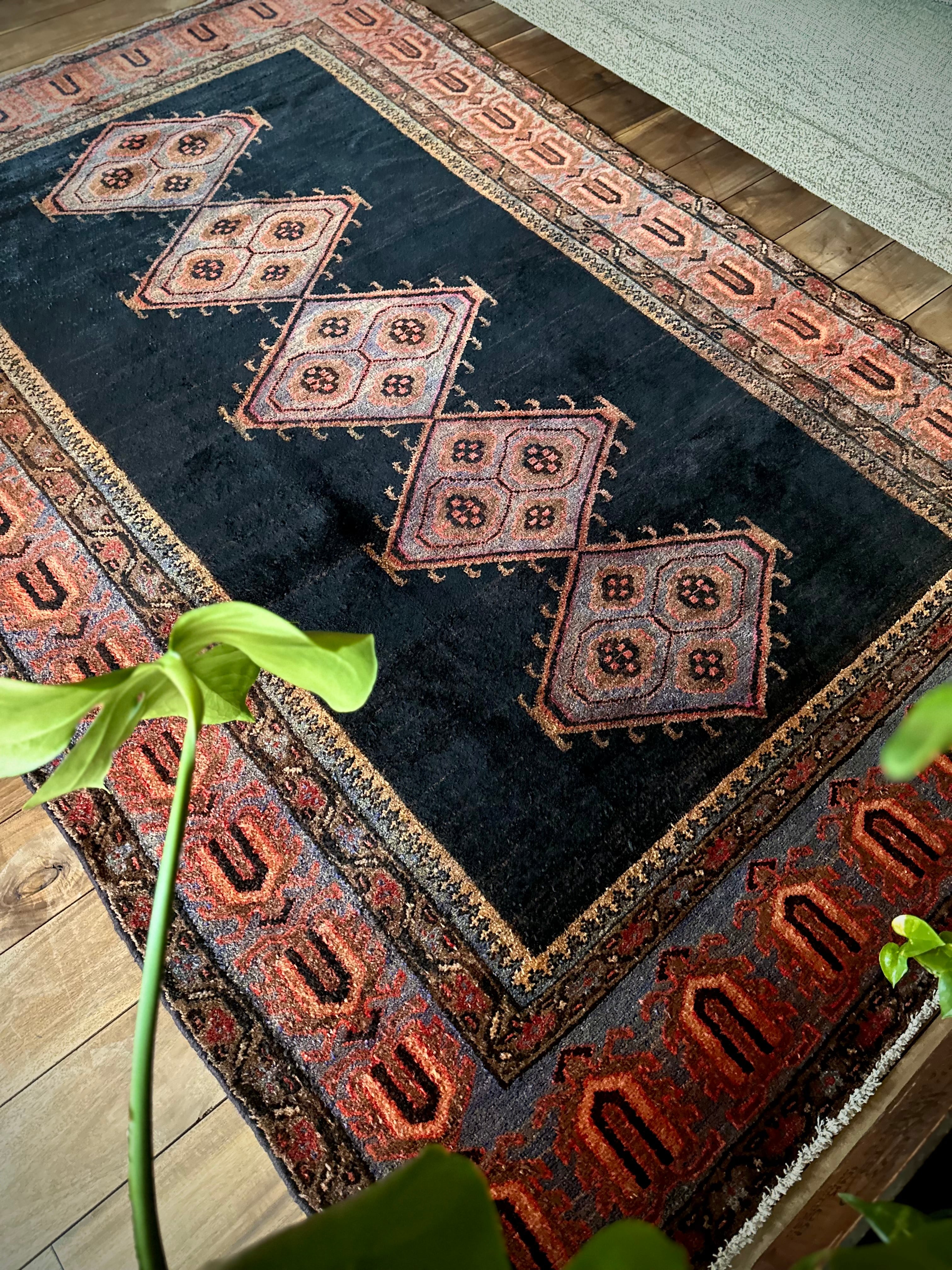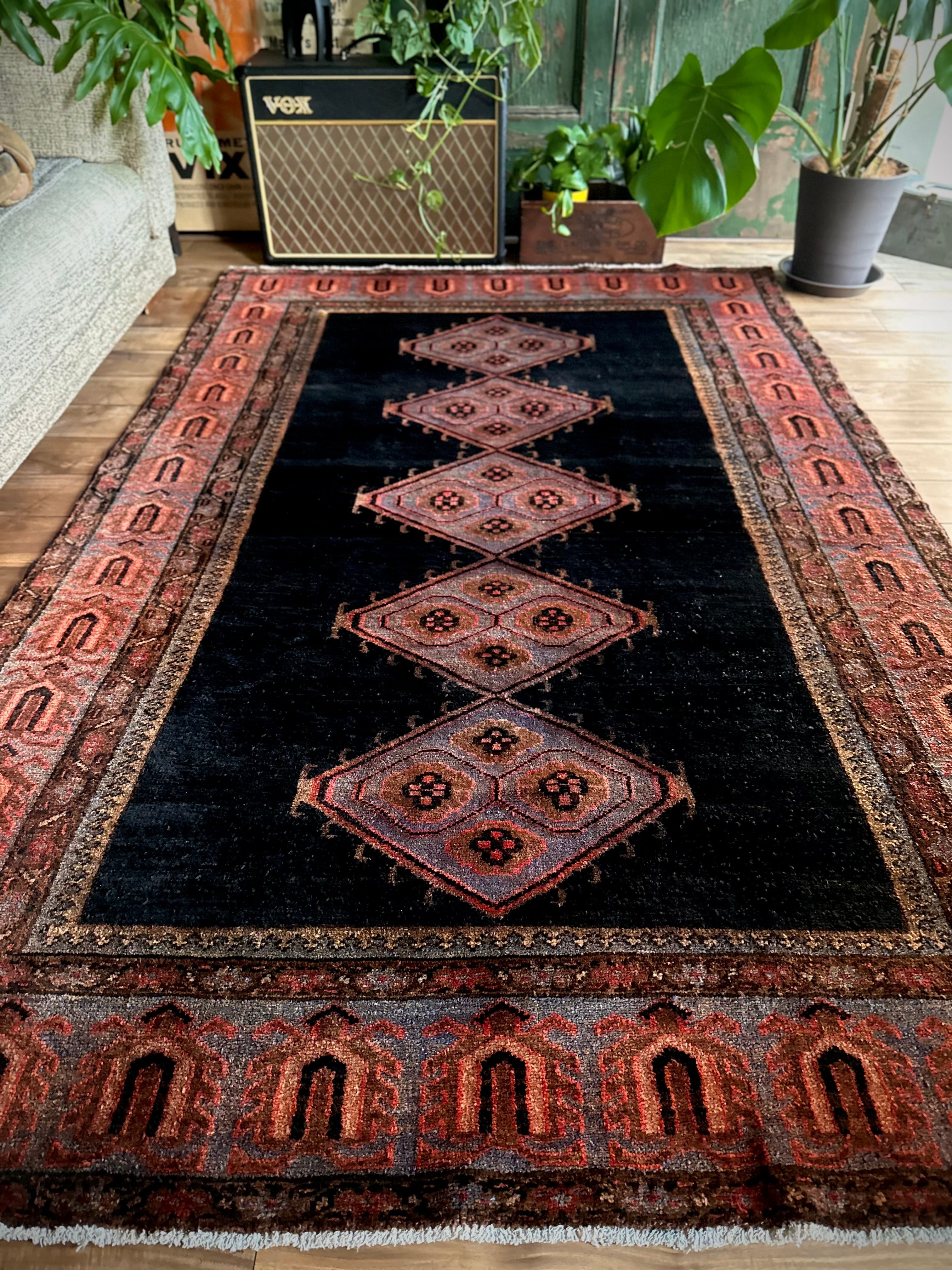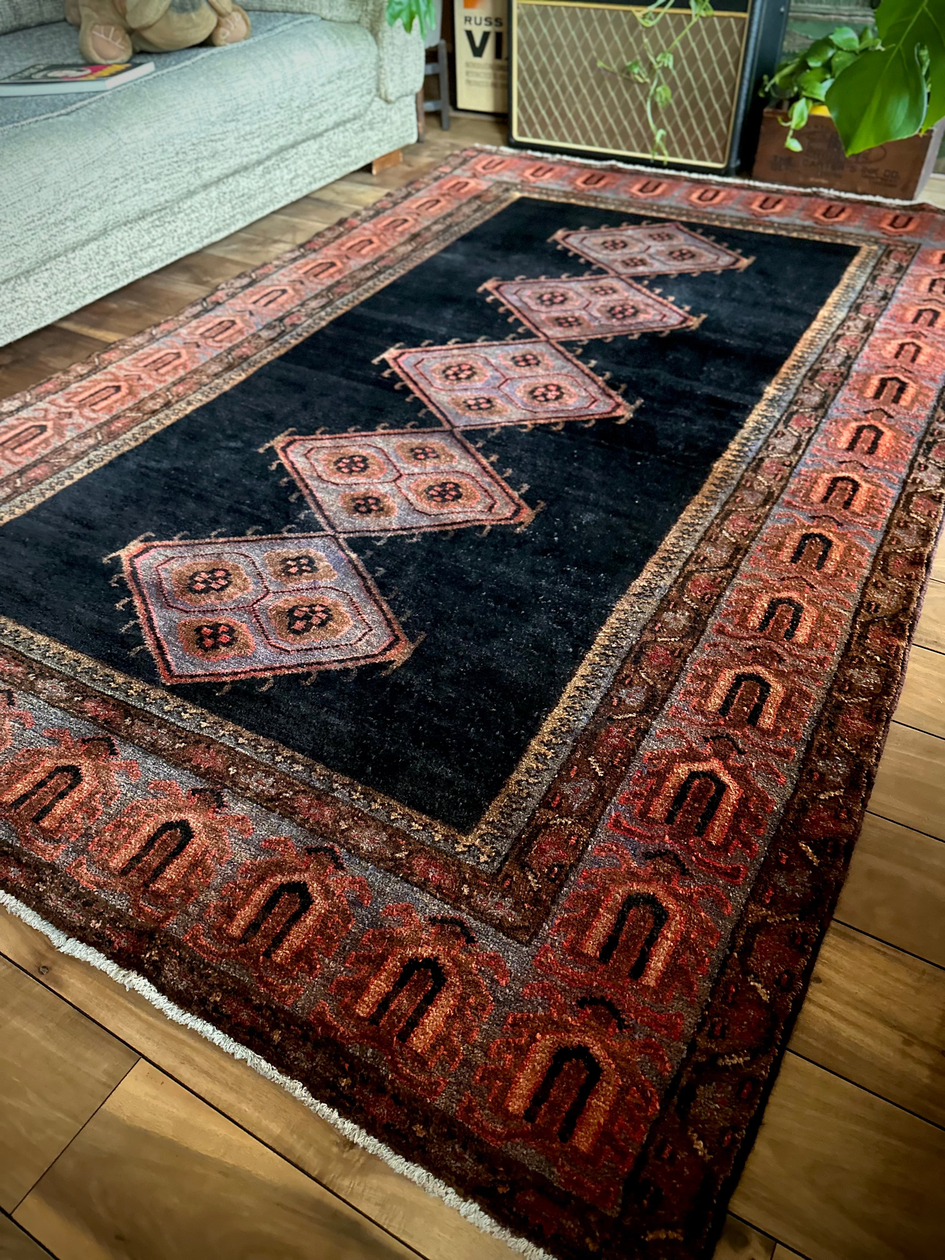 経年としては45年のヴィンテージラグらしく、それなりの使用感にヤレ感がありシラーゼも巻き直しされていますが、特に目立つ汚れやダメージのないグッドなコンディションで、パイル自体はほど良い長さでみっちりとしていて、がっしりとした質実剛健なメインラグがお部屋の温度を引き上げてくれます。