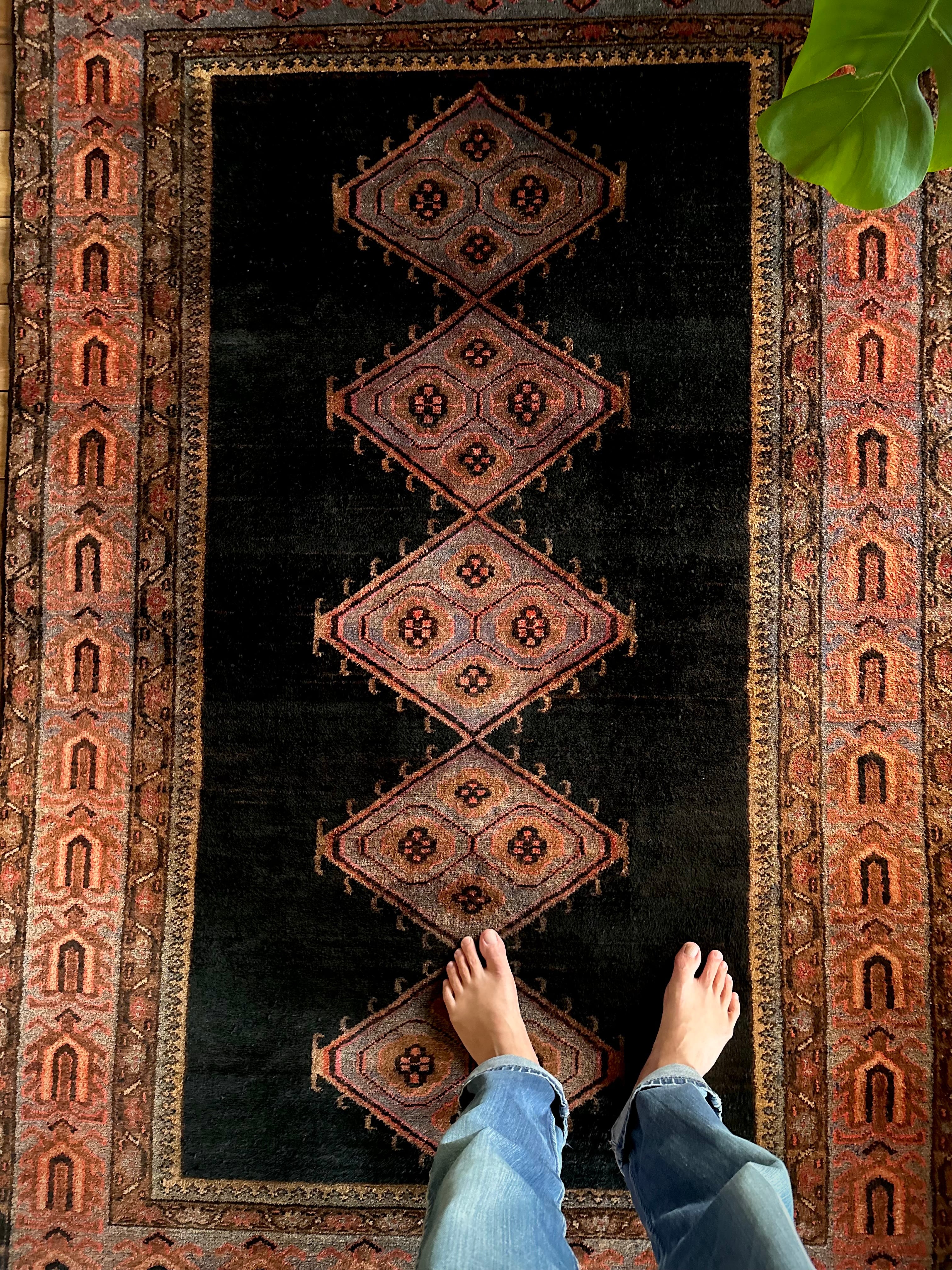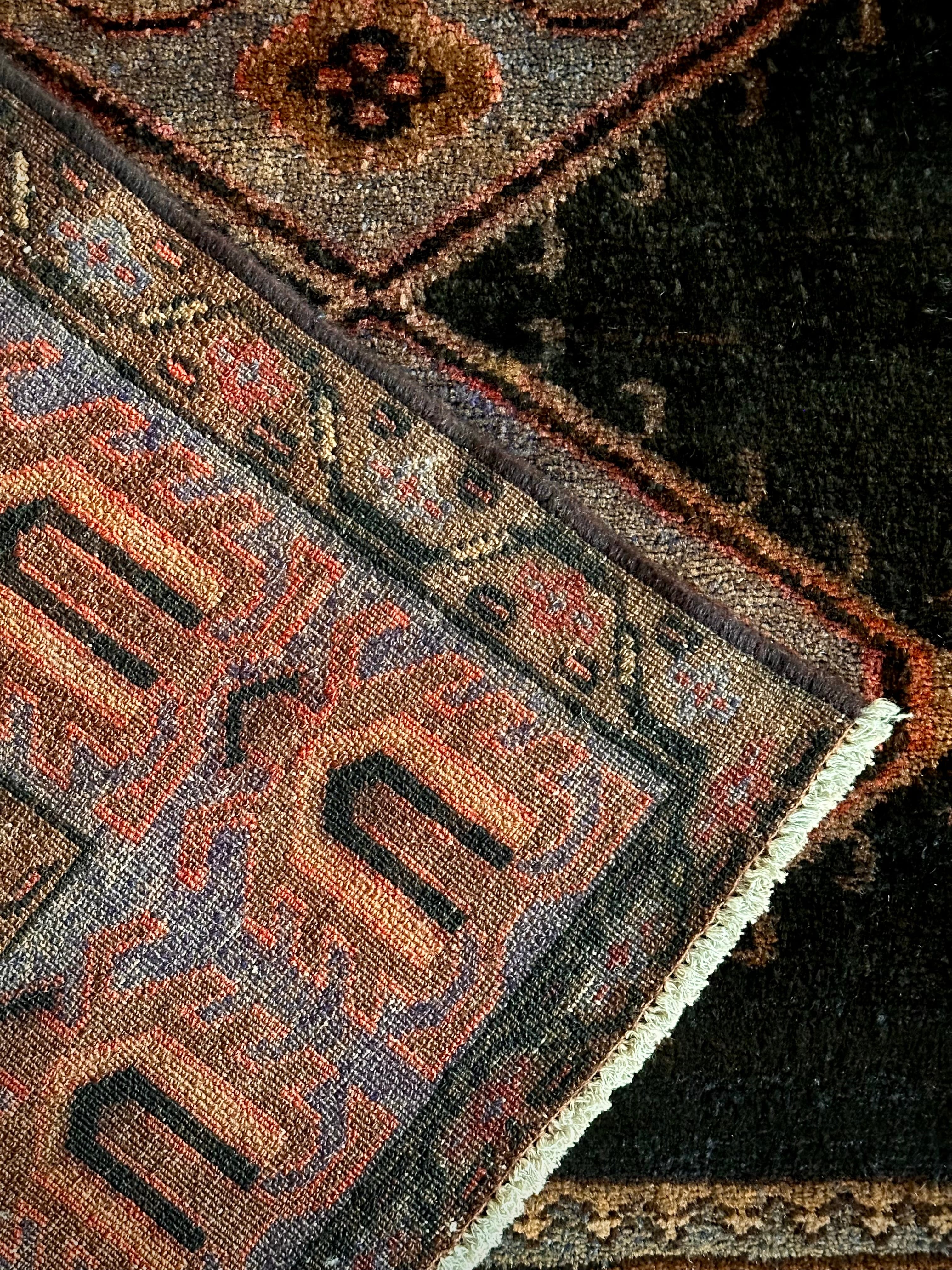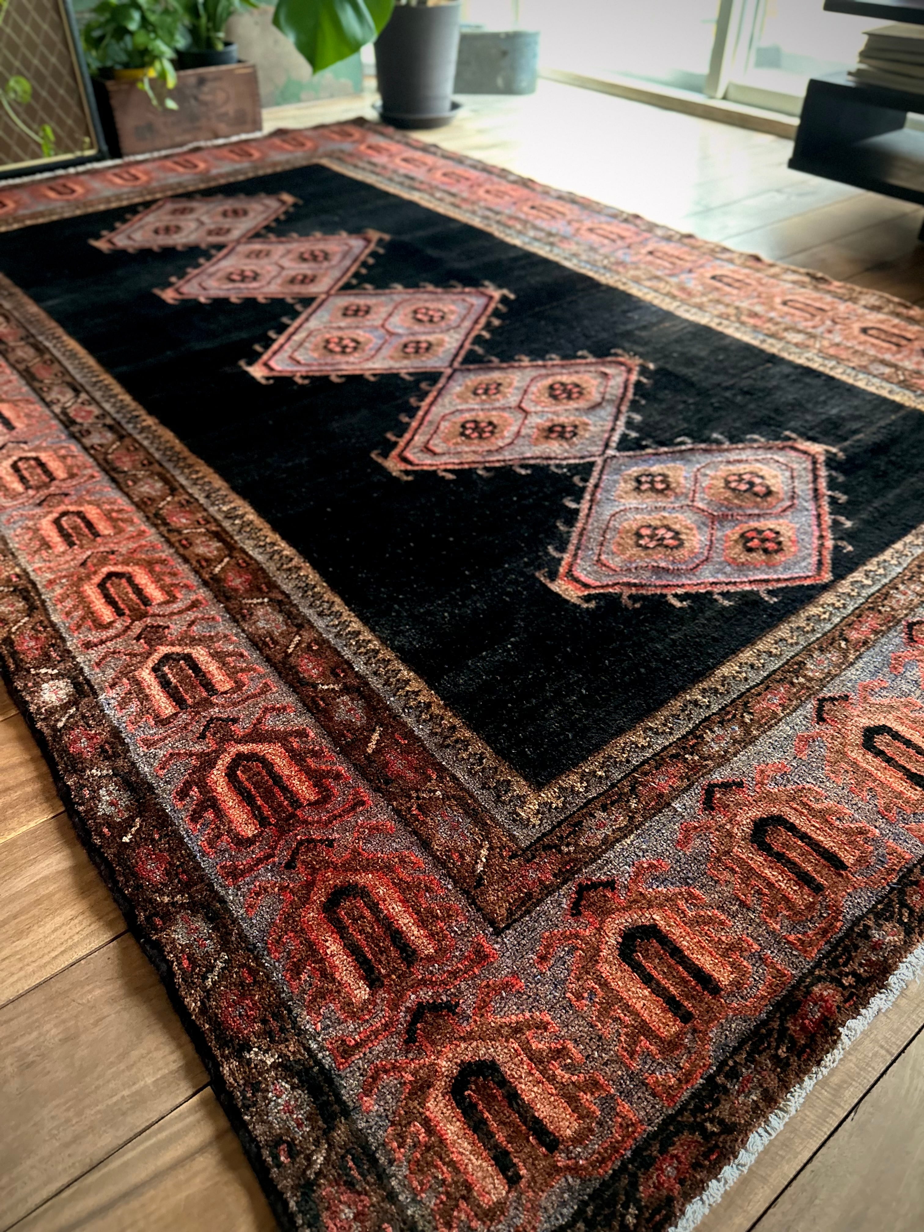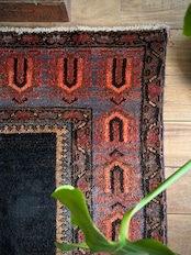 ややアブラッシュがかったブラック1色のプレインなデザインのフィールドが圧倒的なインパクトを放つこちらは、イラン南部のファールズ州にあるペルシャ絨毯の集積場であるシラーズからの1枚で、おそらく部族産ではないヴィレッジラグかと思われます。