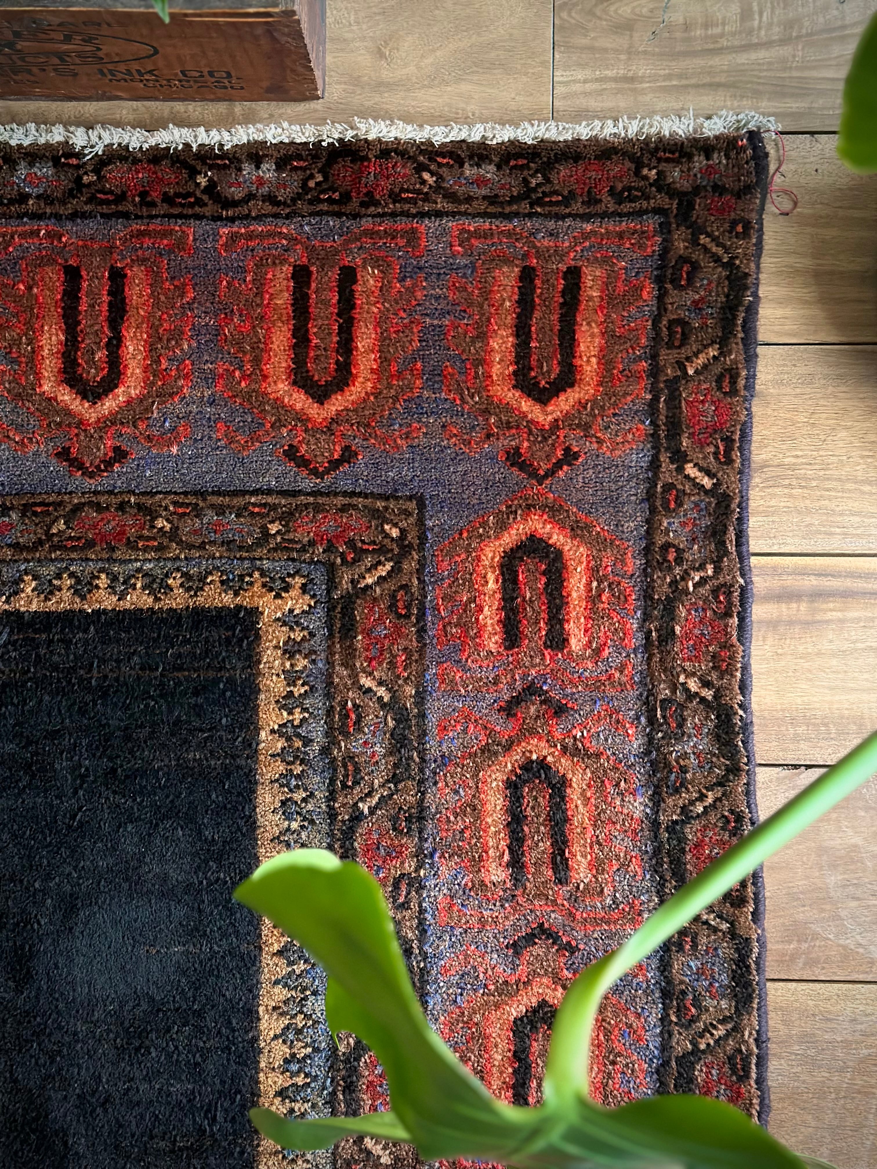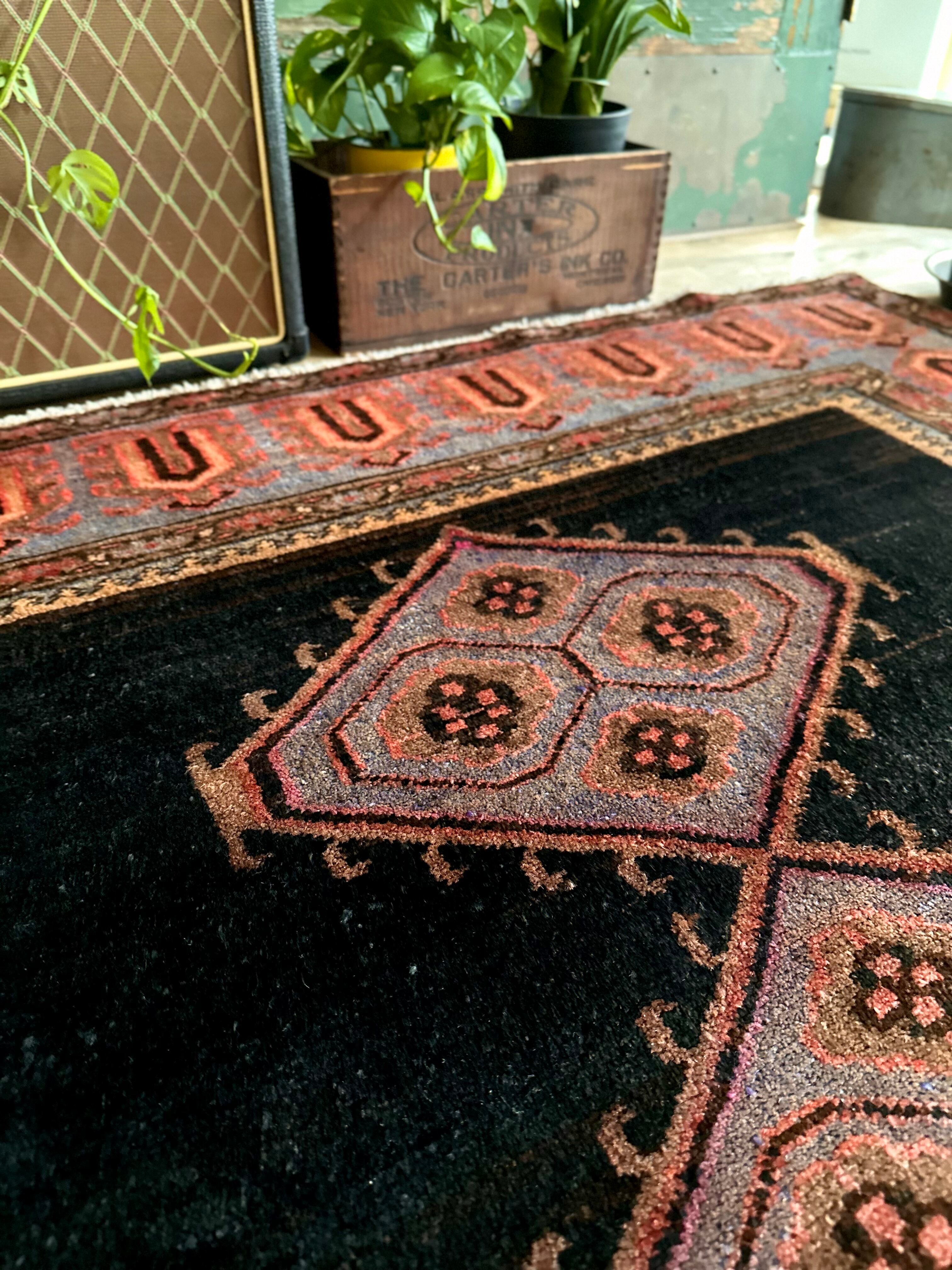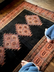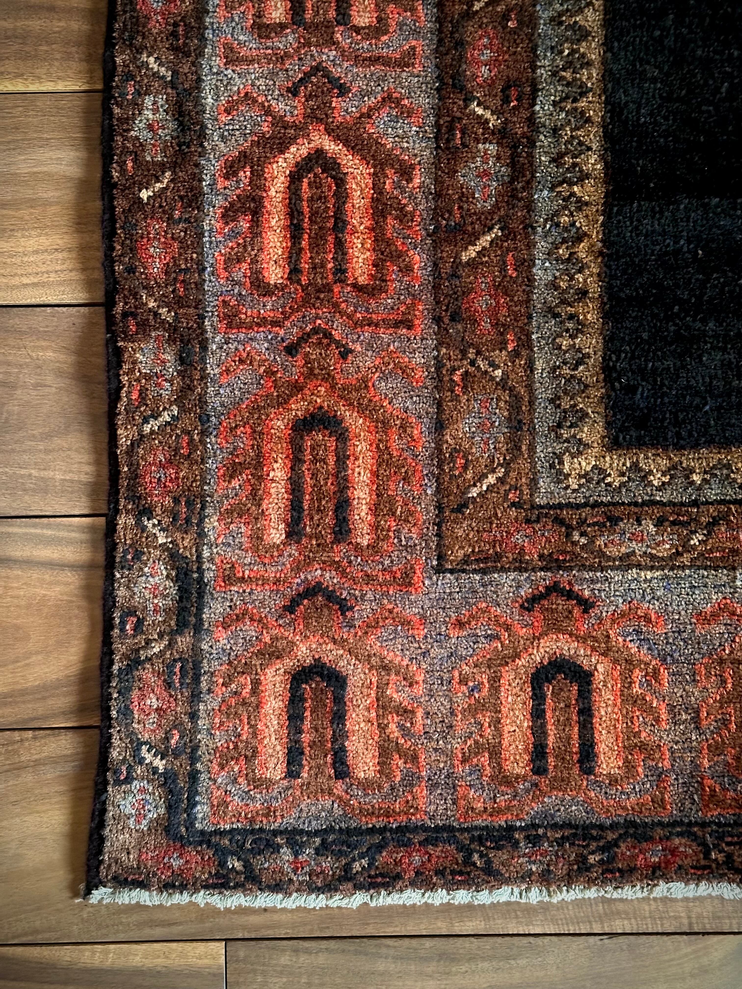 ややアブラッシュがかったブラック1色のプレインなデザインのフィールドが圧倒的なインパクトを放つこちらは、イラン南部のファールズ州にあるペルシャ絨毯の集積場であるシラーズからの1枚で、おそらく部族産ではないヴィレッジラグかと思われます。