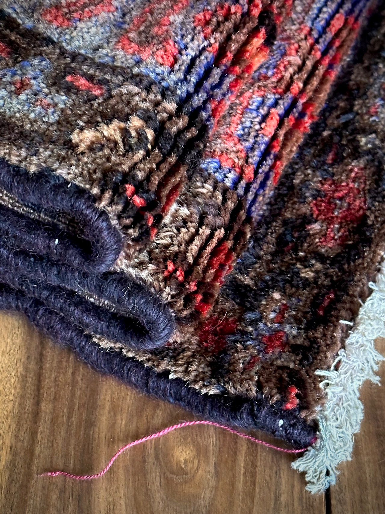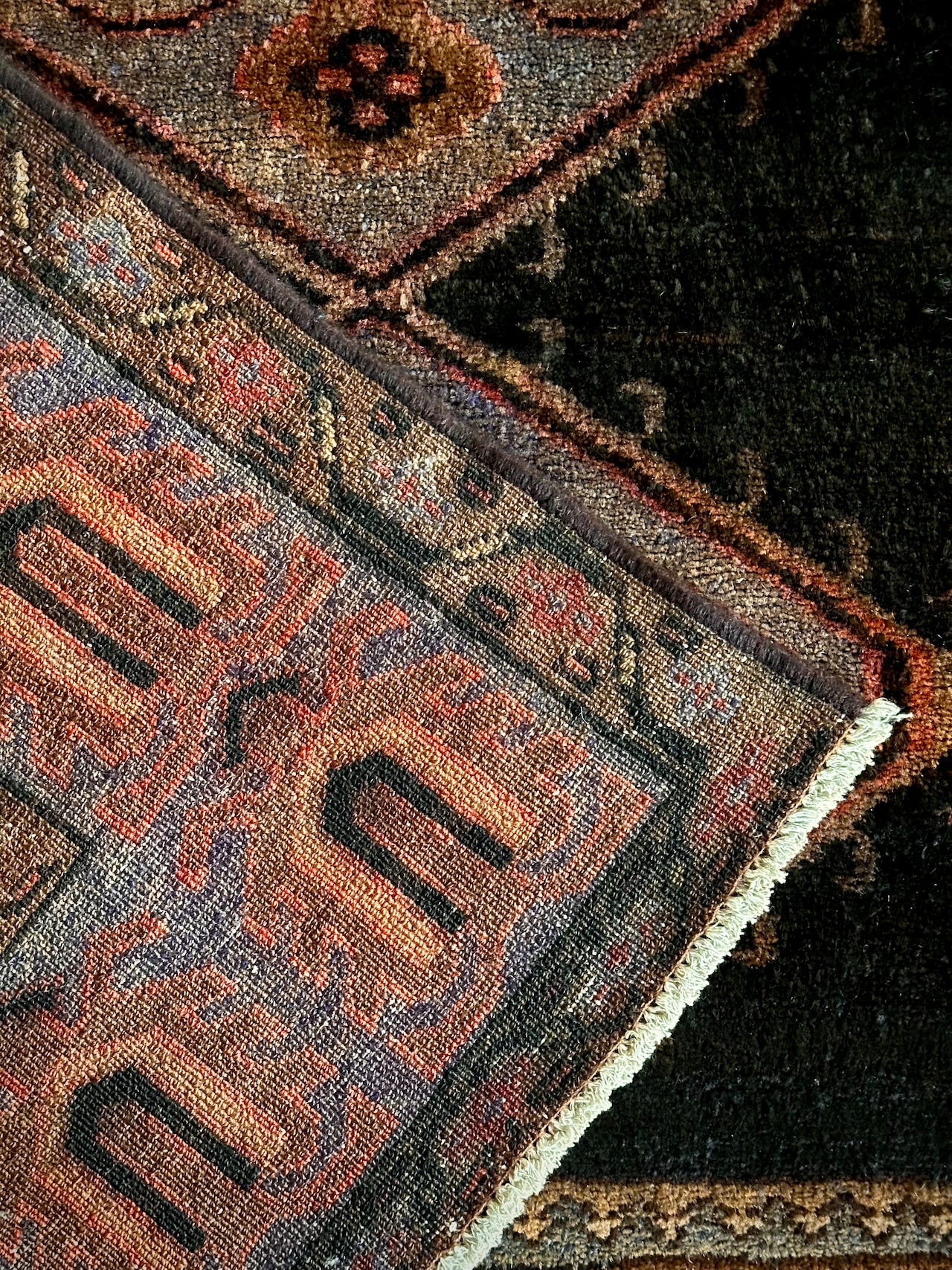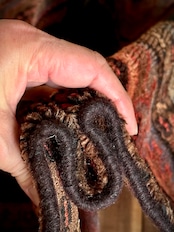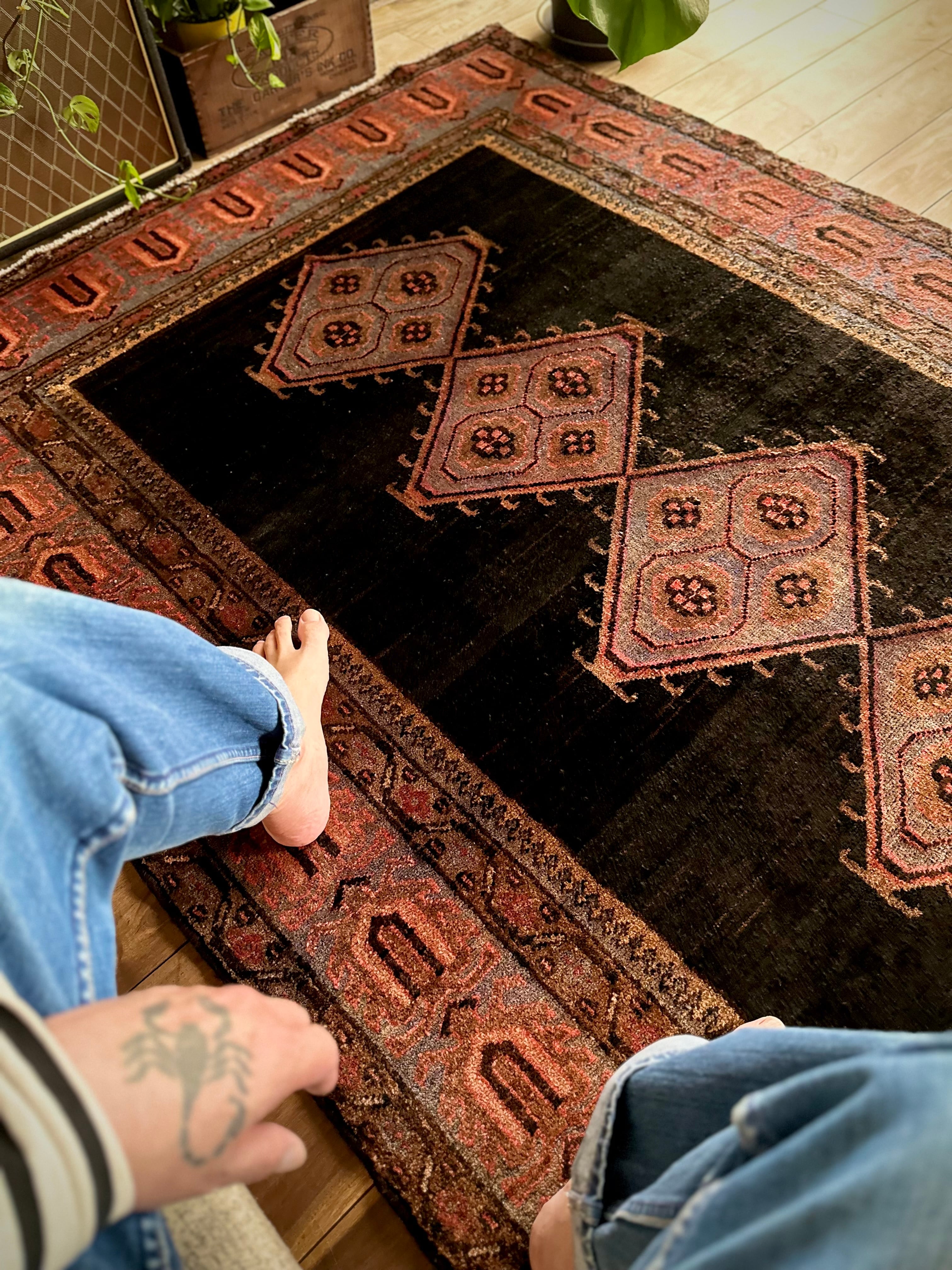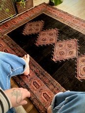 最後にラグそのものに関しては羊毛特有の匂いがあり、採寸は中央付近で計測していますが、手織りならではの歪みによる誤差や水洗いクリーニングによる縮み、また草木染めによる経年劣化の色ムラなどがありますが、それもまたヴィンテージラグの魅力かとご理解ください。
