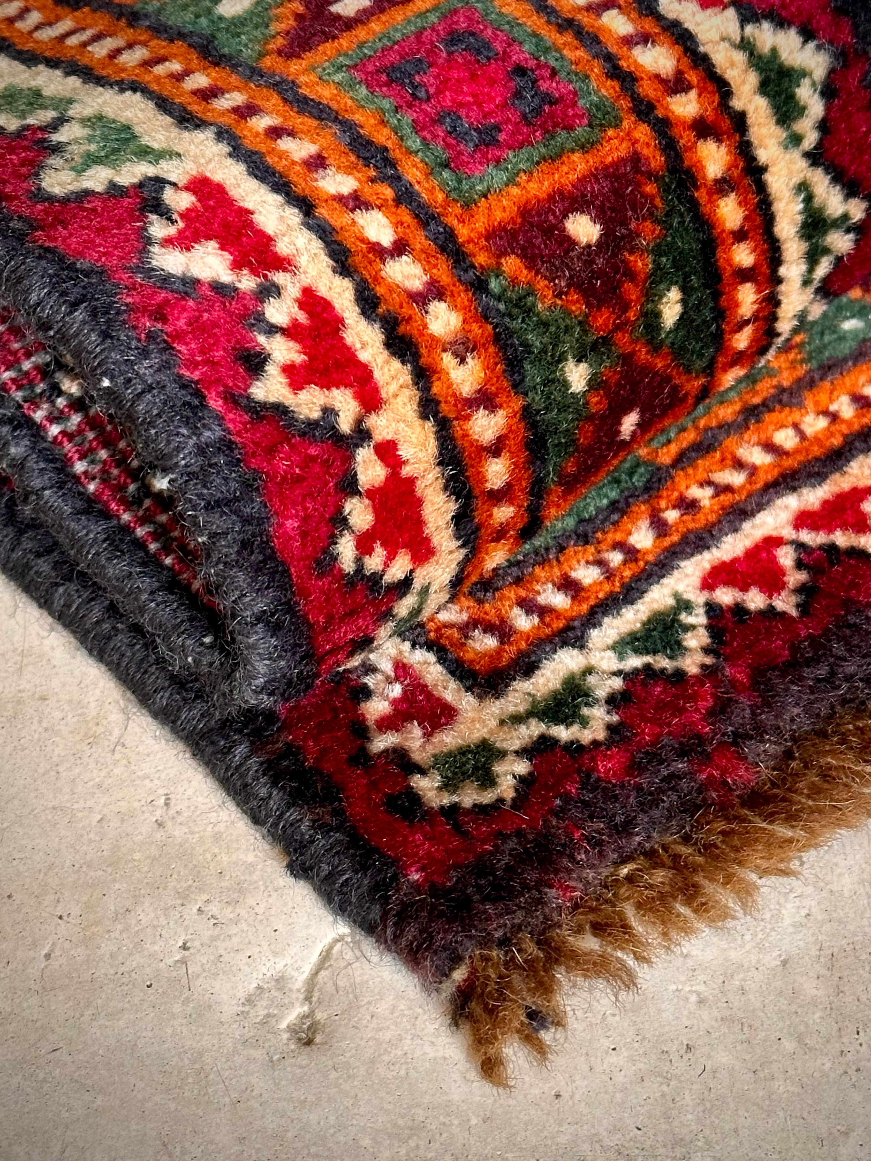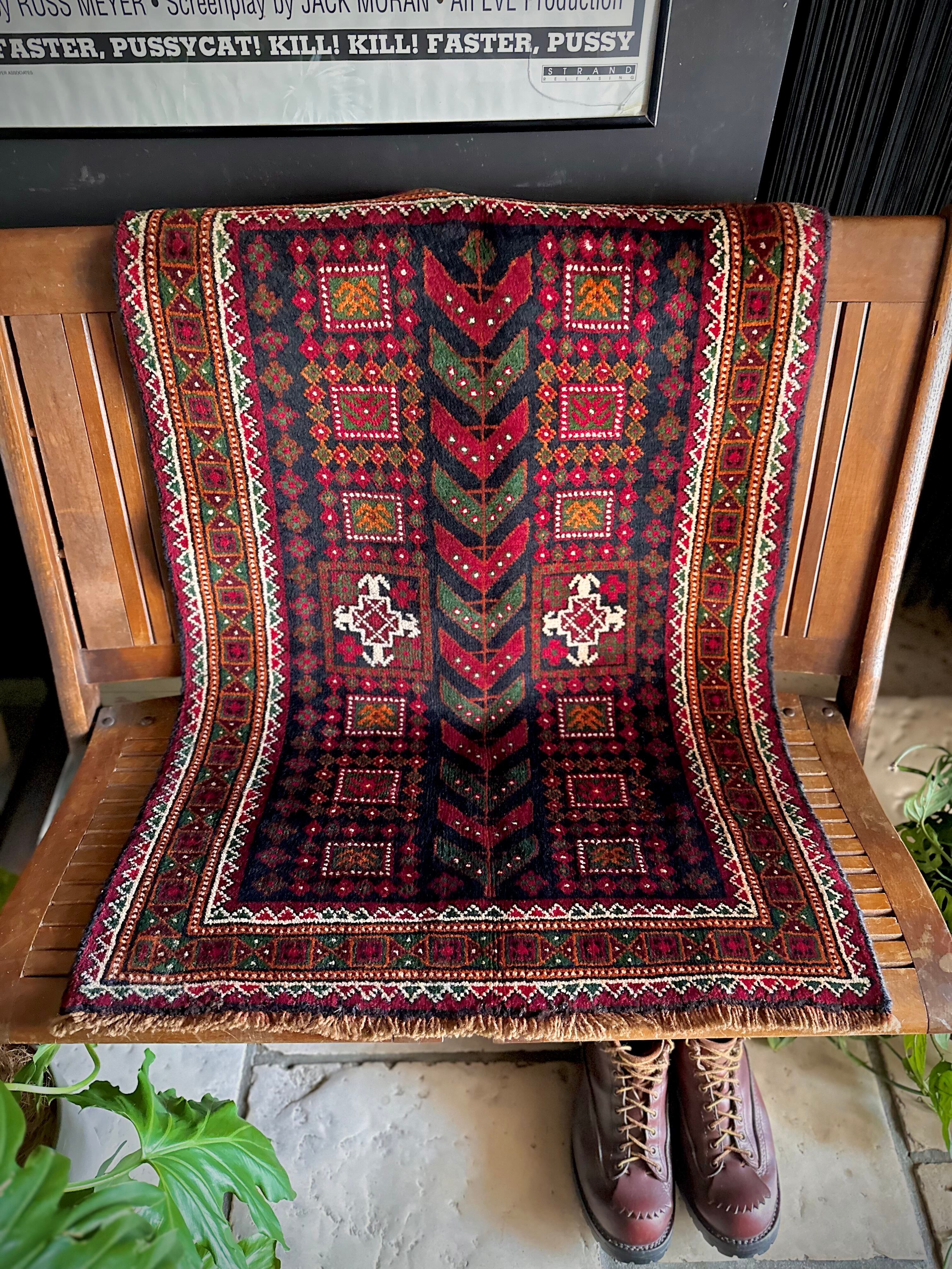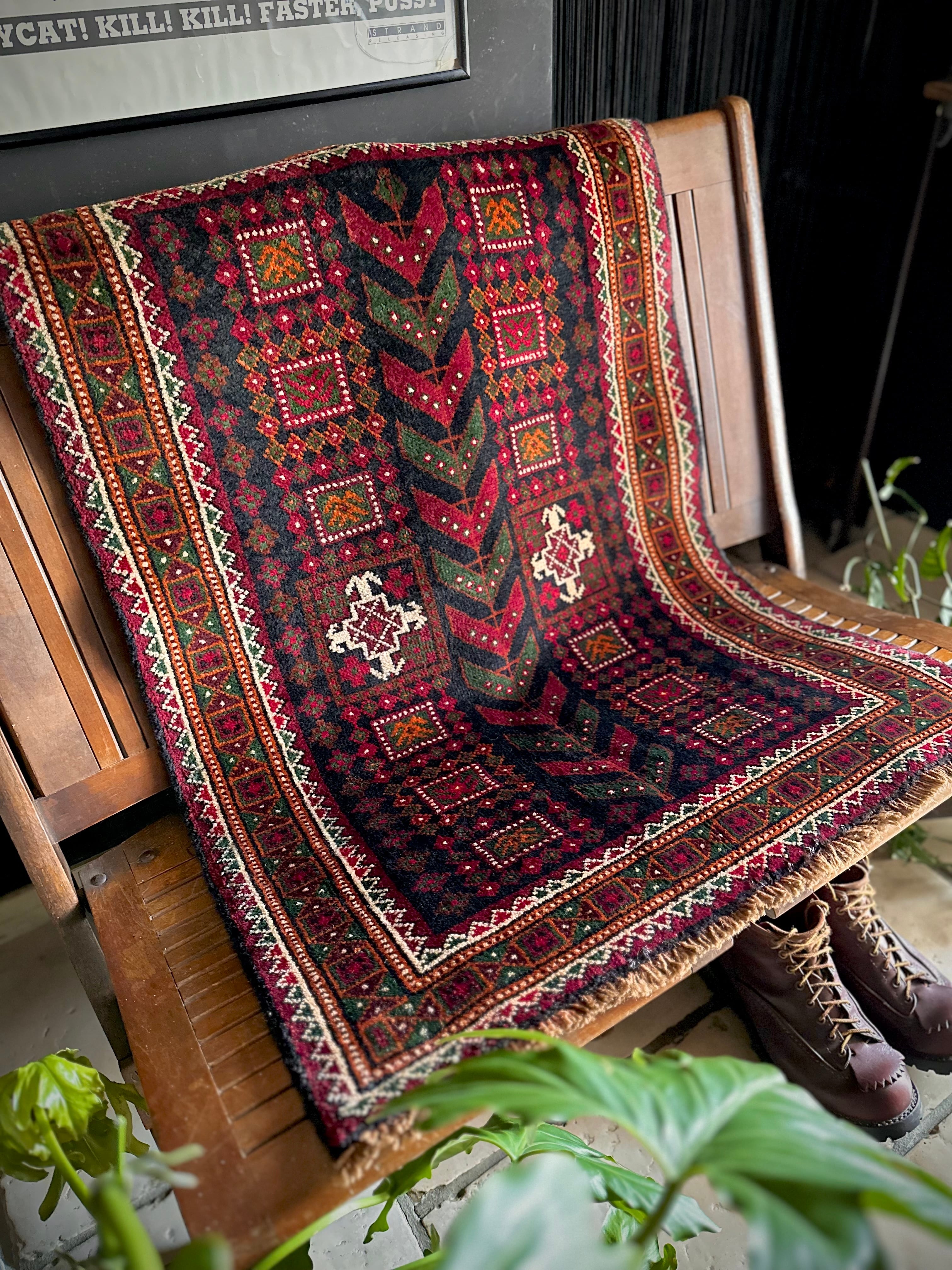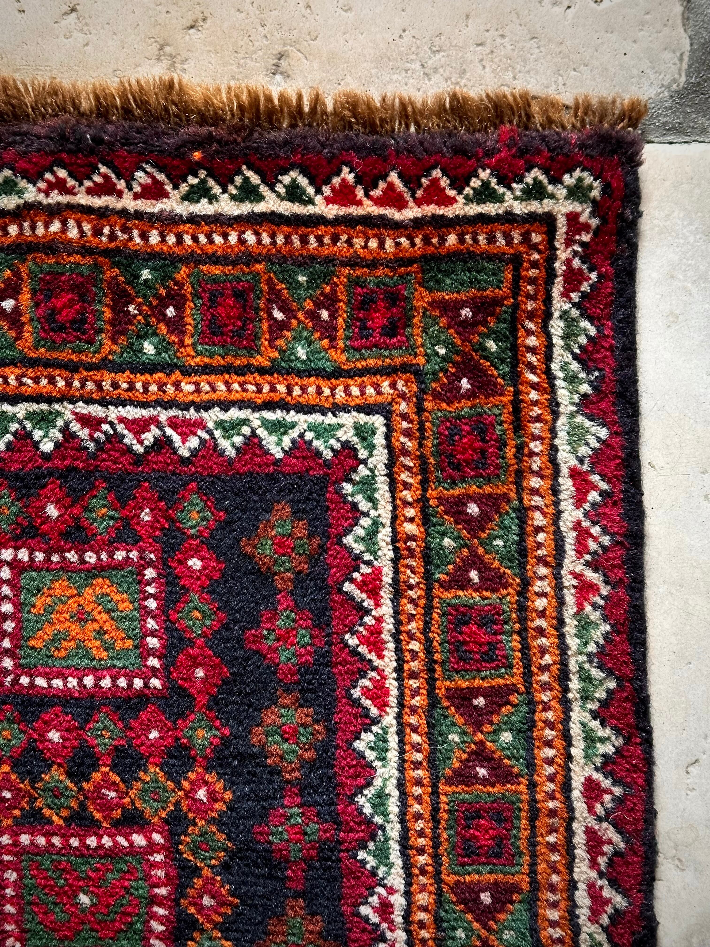 ネイビーのフィールドにレッドやグリーンにオレンジのボーダーなどが色鮮やかなこちらは、アフガニスタンはヘラート州に居住するバルーチ族のトライバルラグで、元は家財道具などを収納するバーリシトと呼ばれる袋状の表皮をラグに仕立て直したモノになります。