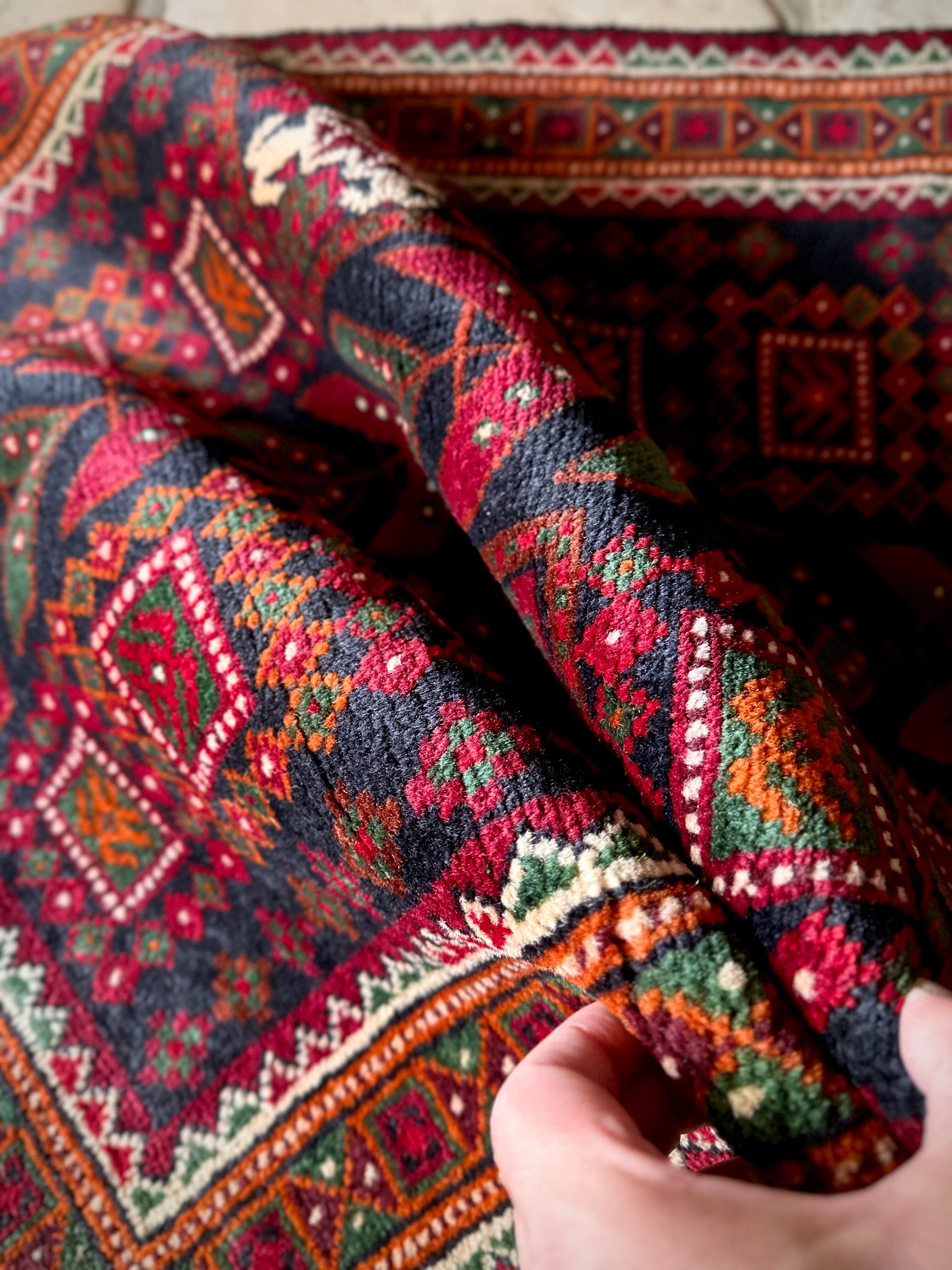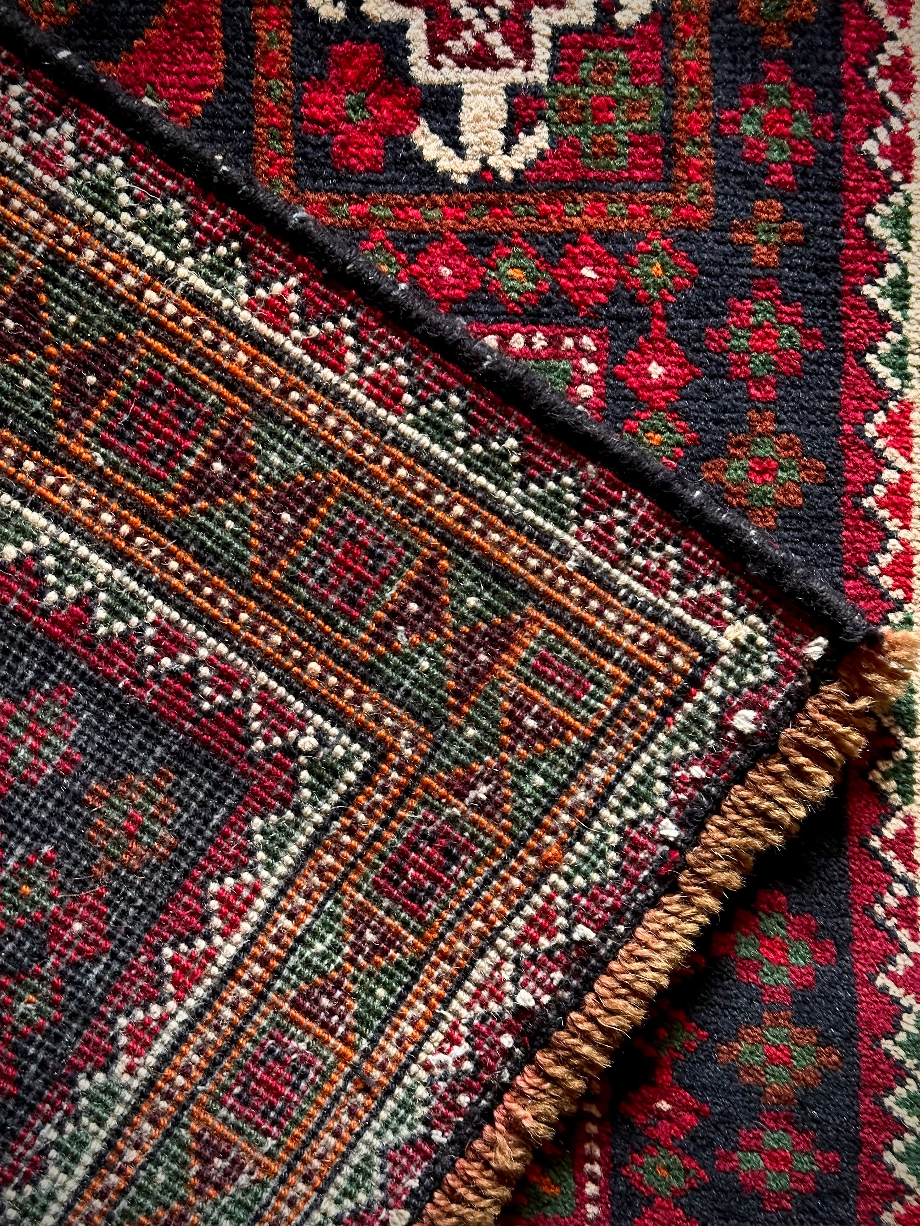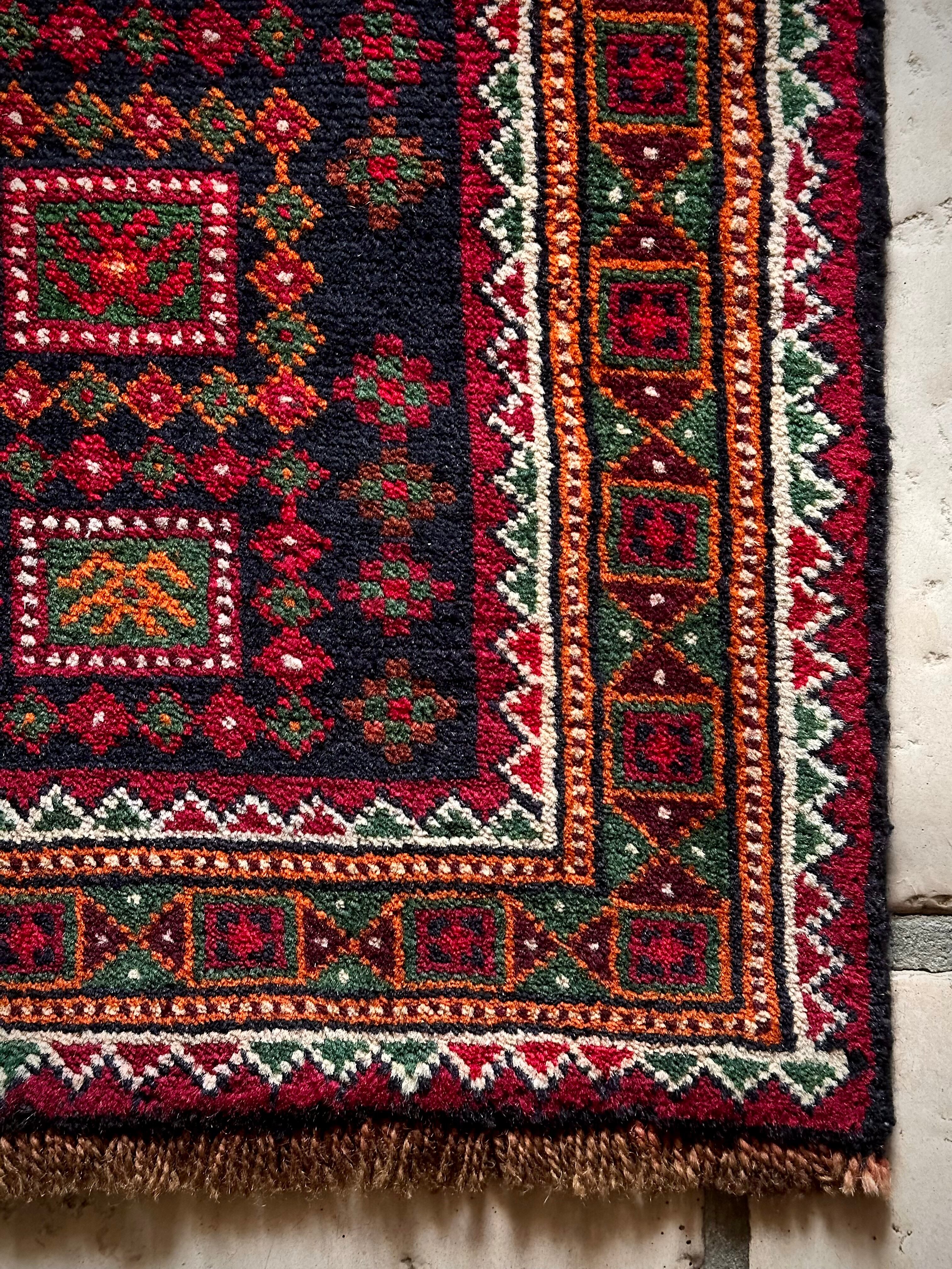 ネイビーのフィールドにレッドやグリーンにオレンジのボーダーなどが色鮮やかなこちらは、アフガニスタンはヘラート州に居住するバルーチ族のトライバルラグで、元は家財道具などを収納するバーリシトと呼ばれる袋状の表皮をラグに仕立て直したモノになります。