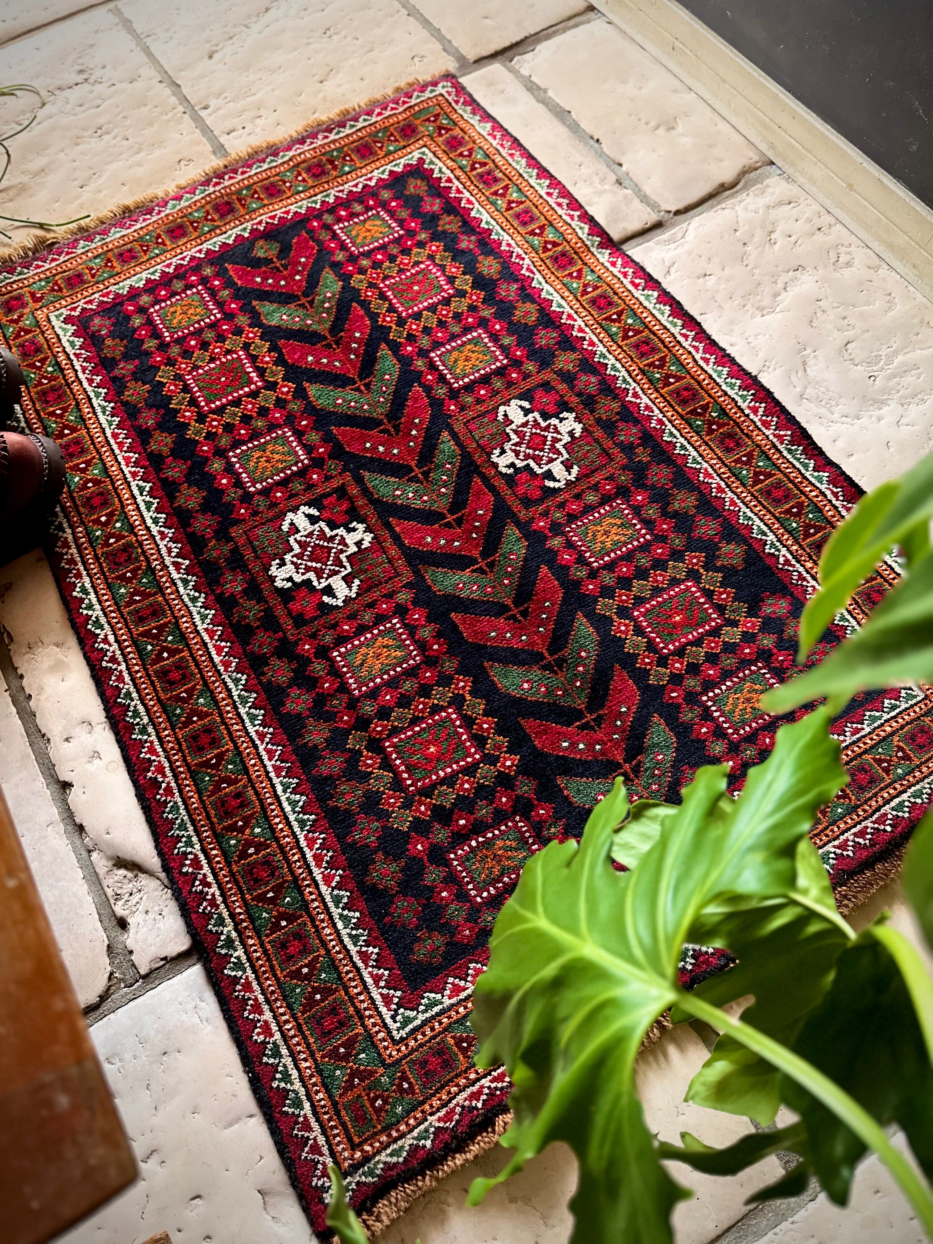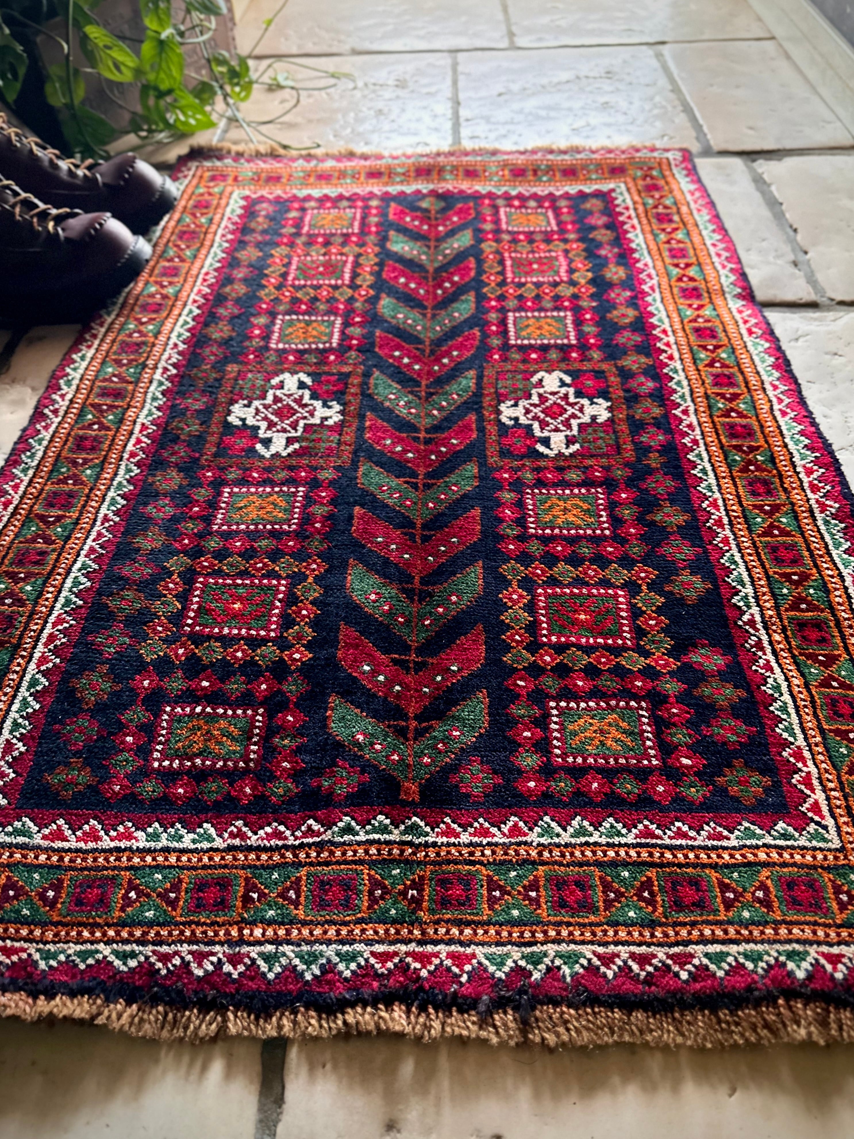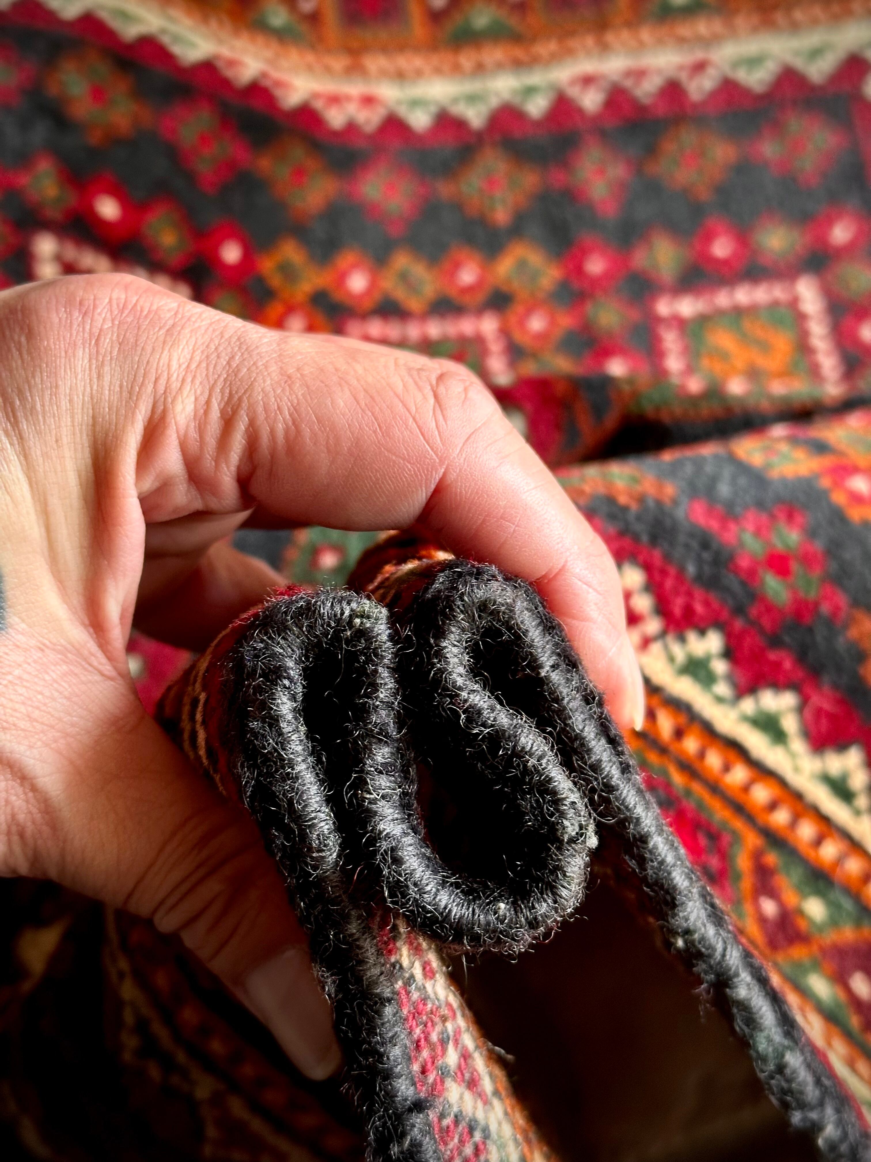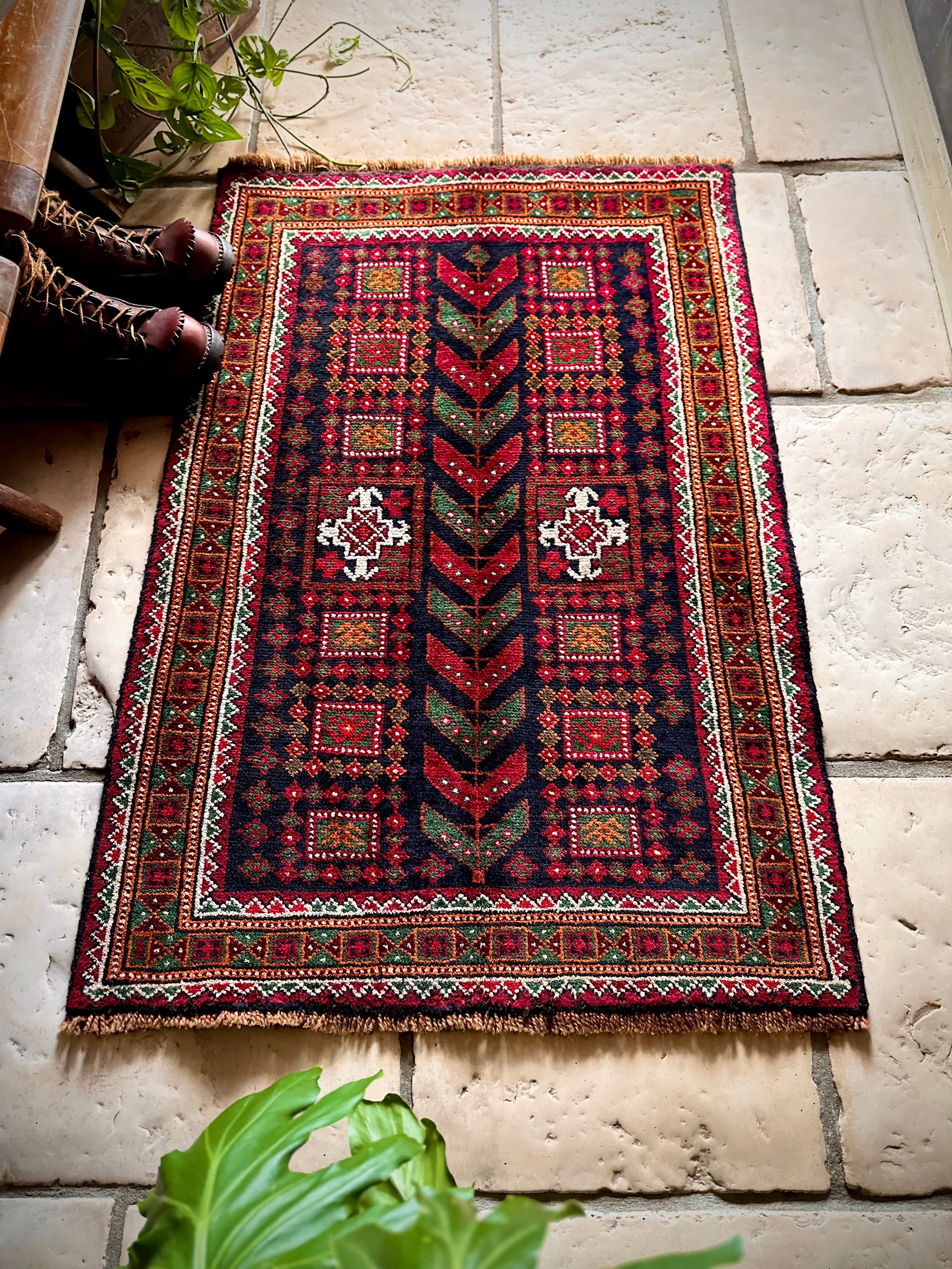 ネイビーのフィールドにレッドやグリーンにオレンジのボーダーなどが色鮮やかなこちらは、アフガニスタンはヘラート州に居住するバルーチ族のトライバルラグで、元は家財道具などを収納するバーリシトと呼ばれる袋状の表皮をラグに仕立て直したモノになります。