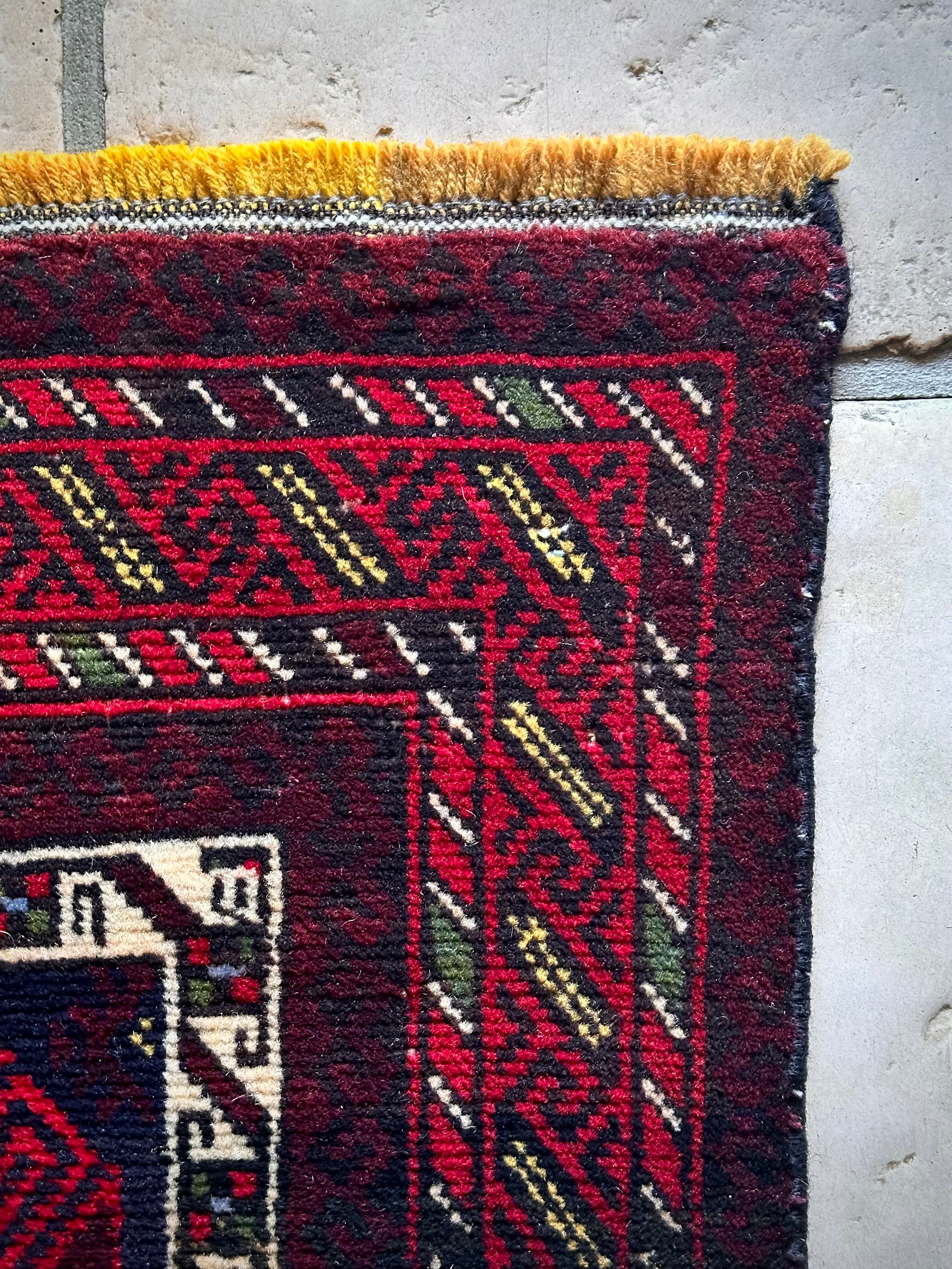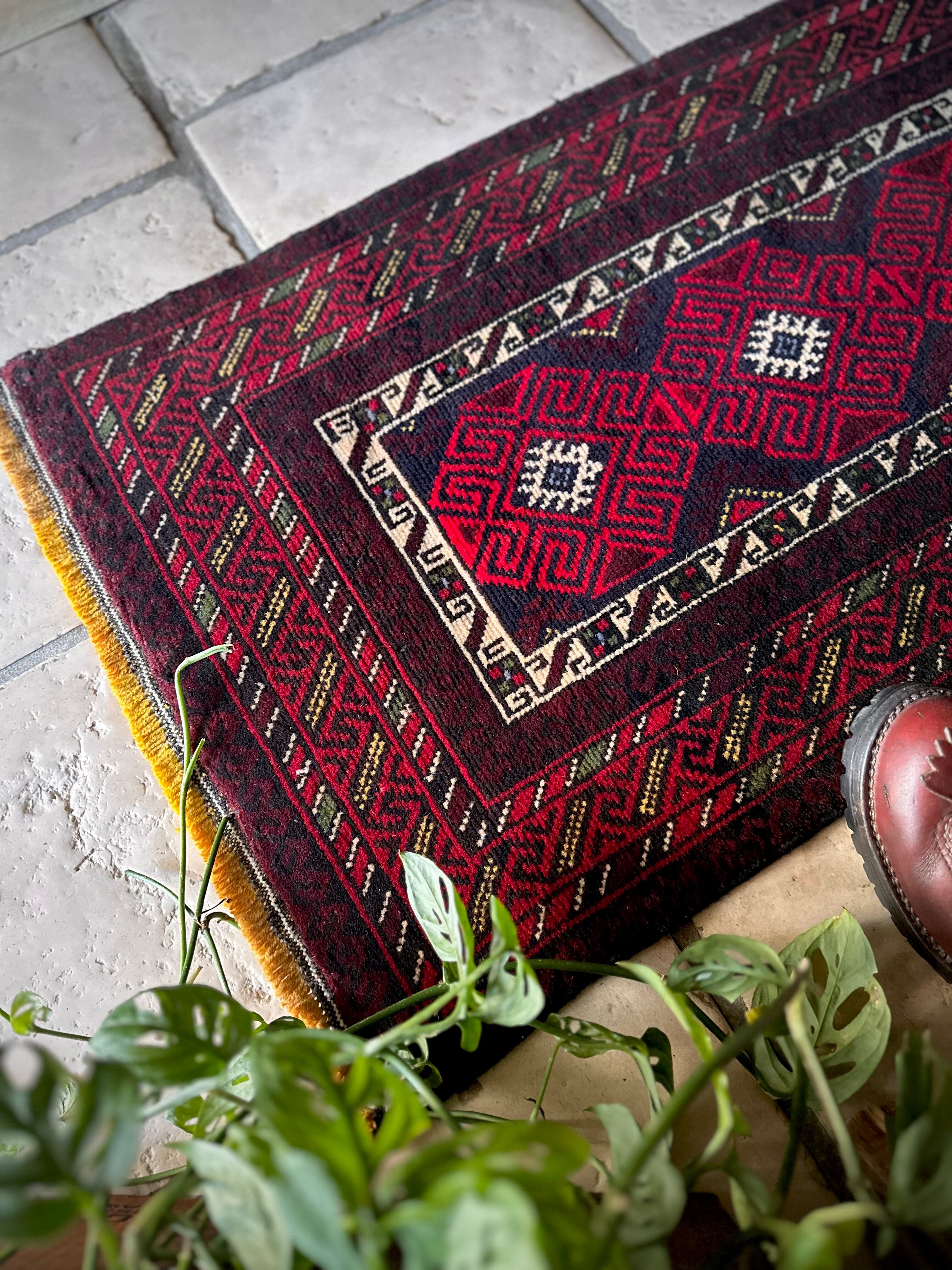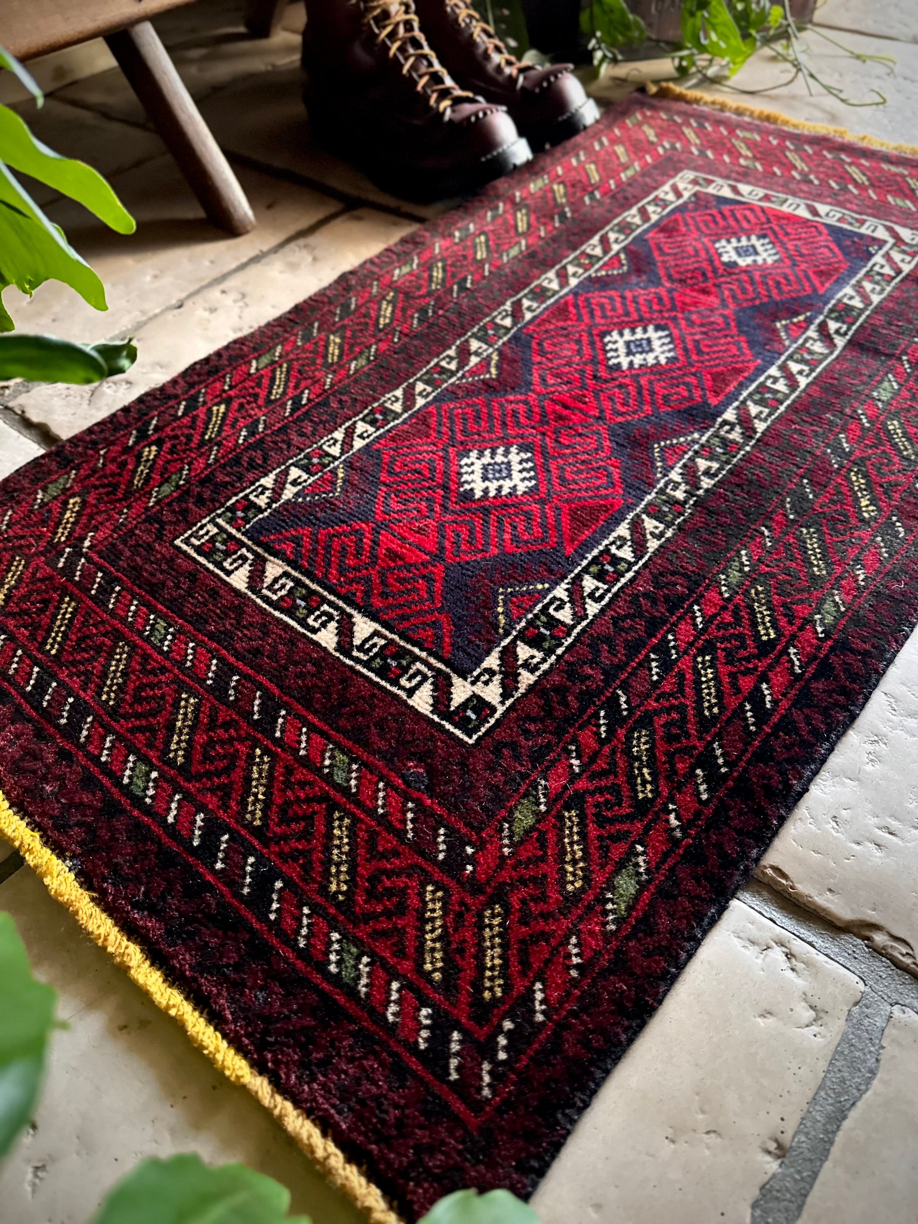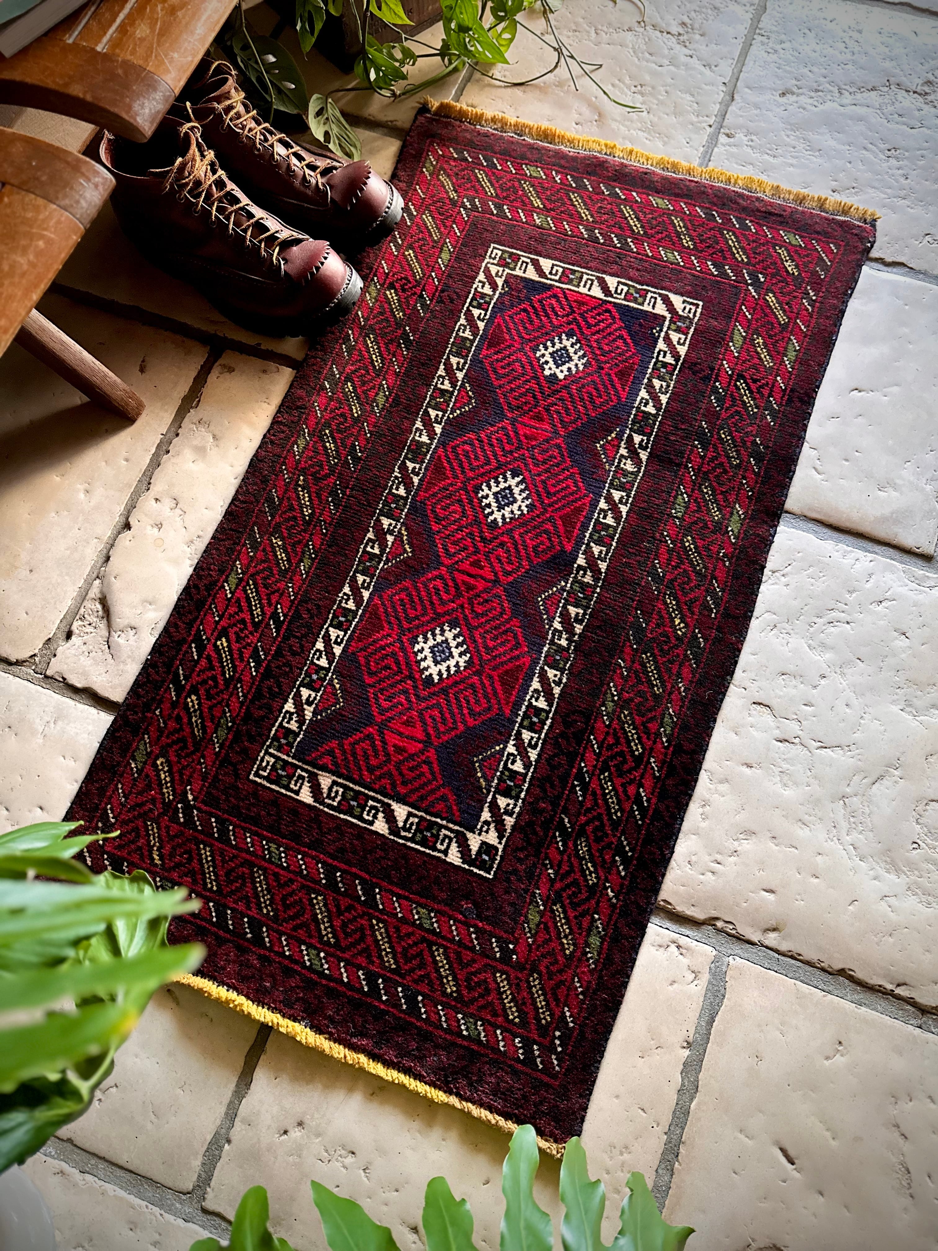 艶やかなボルドーとレッドで統一された3連メダリオンにイエローのフリンジが目を引くこちらは、アフガニスタンはヘラート州に居住するバルーチ族のトライバルラグで、元は家財道具などを収納するバーリシトと呼ばれる袋状の表皮をラグに仕立て直したモノになります。