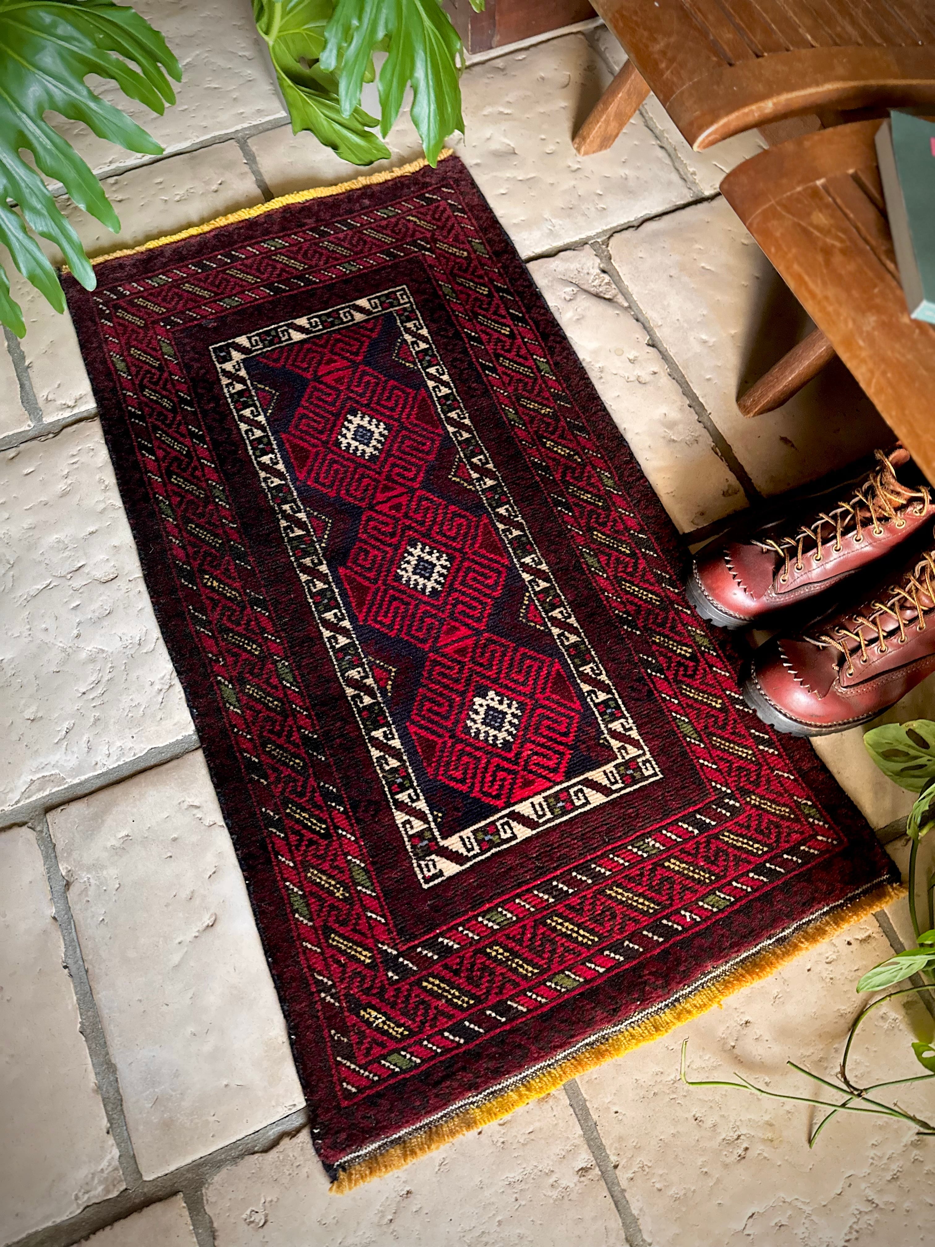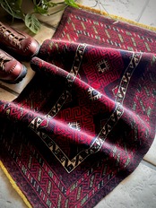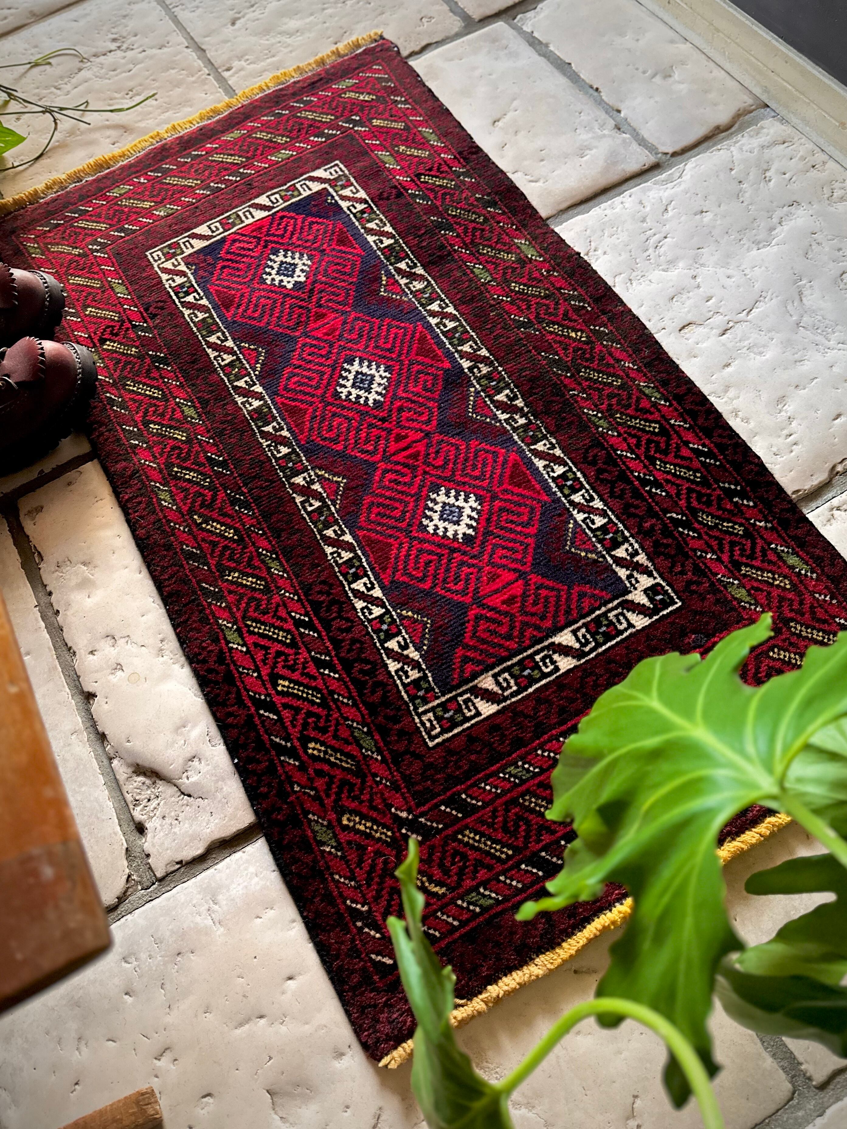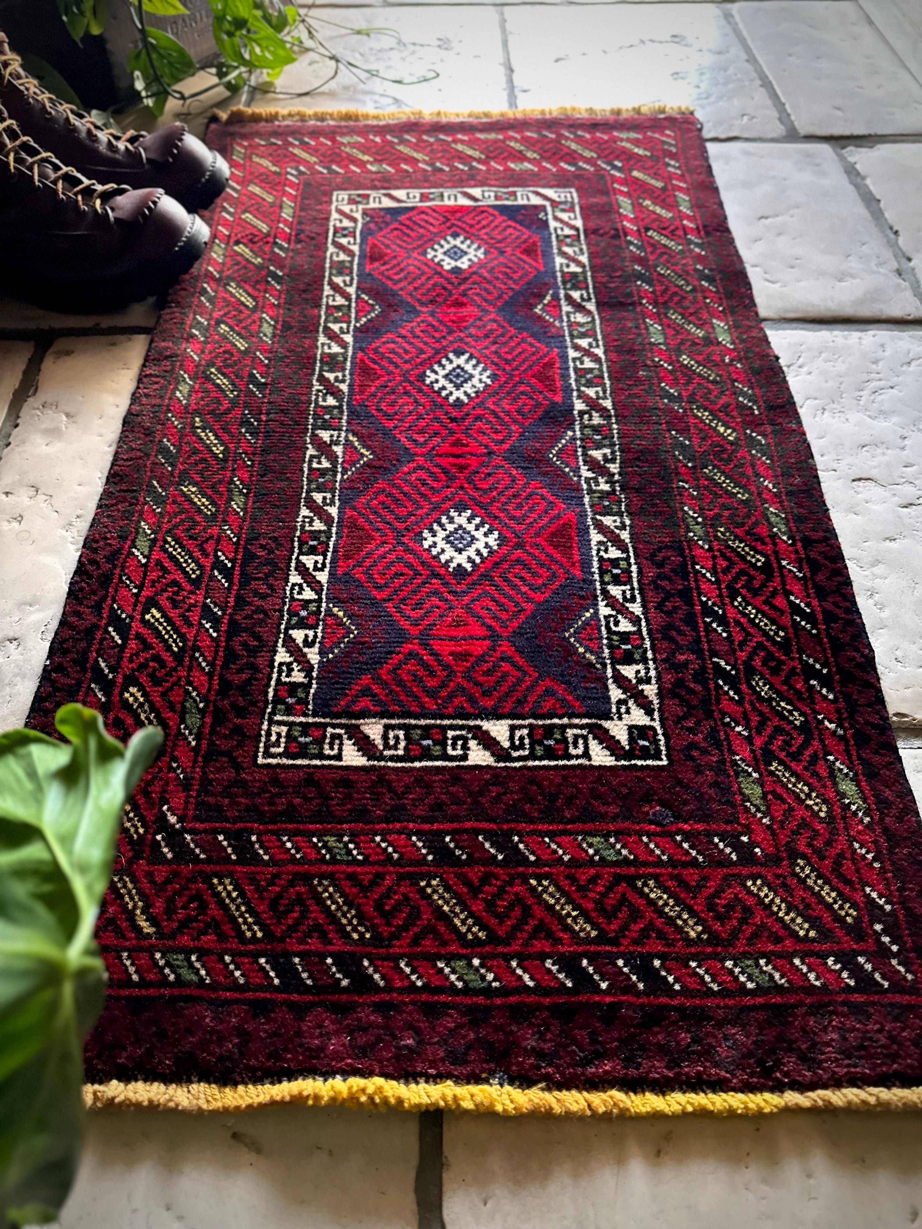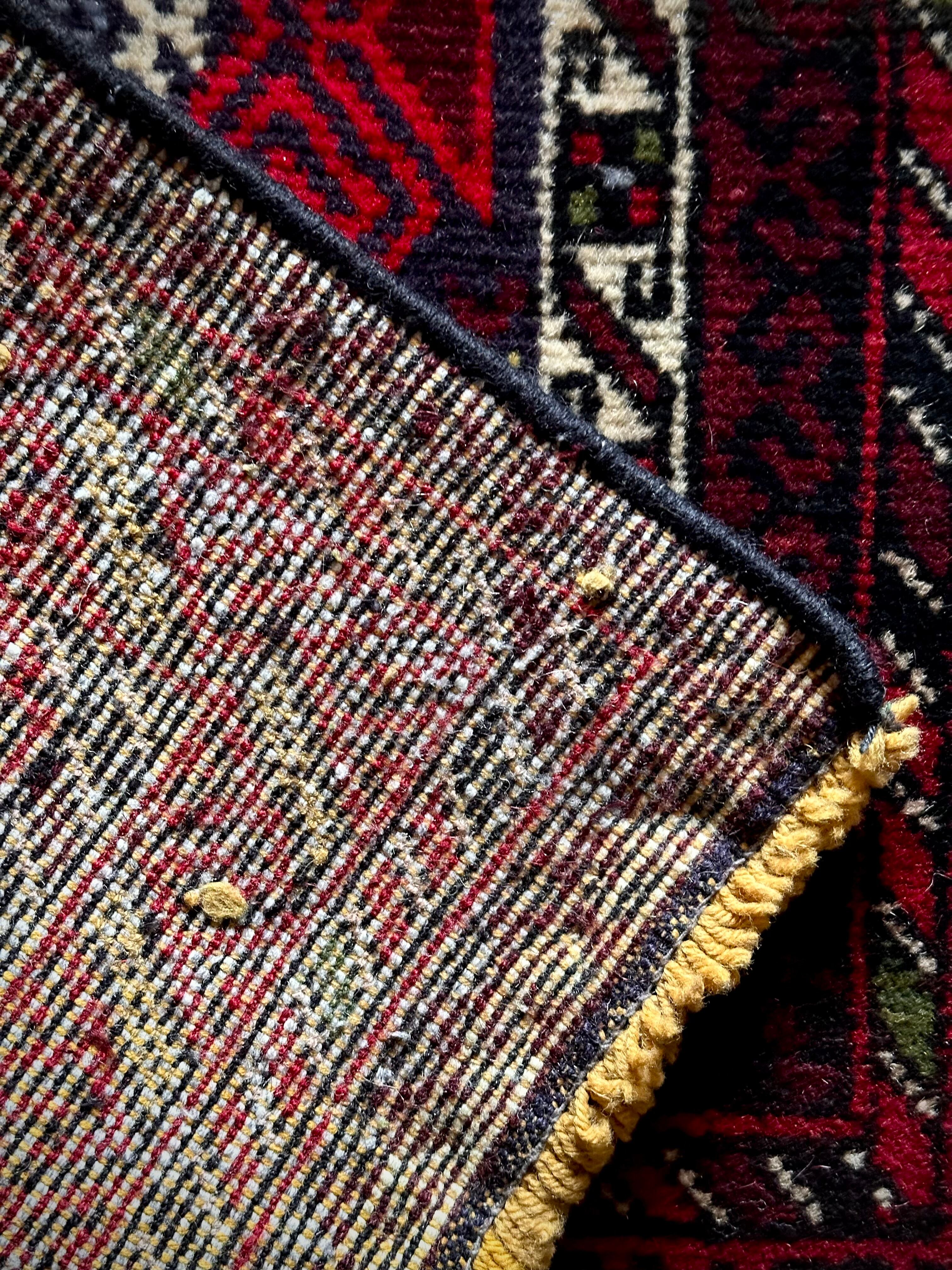 艶やかなボルドーとレッドで統一された3連メダリオンにイエローのフリンジが目を引くこちらは、アフガニスタンはヘラート州に居住するバルーチ族のトライバルラグで、元は家財道具などを収納するバーリシトと呼ばれる袋状の表皮をラグに仕立て直したモノになります。