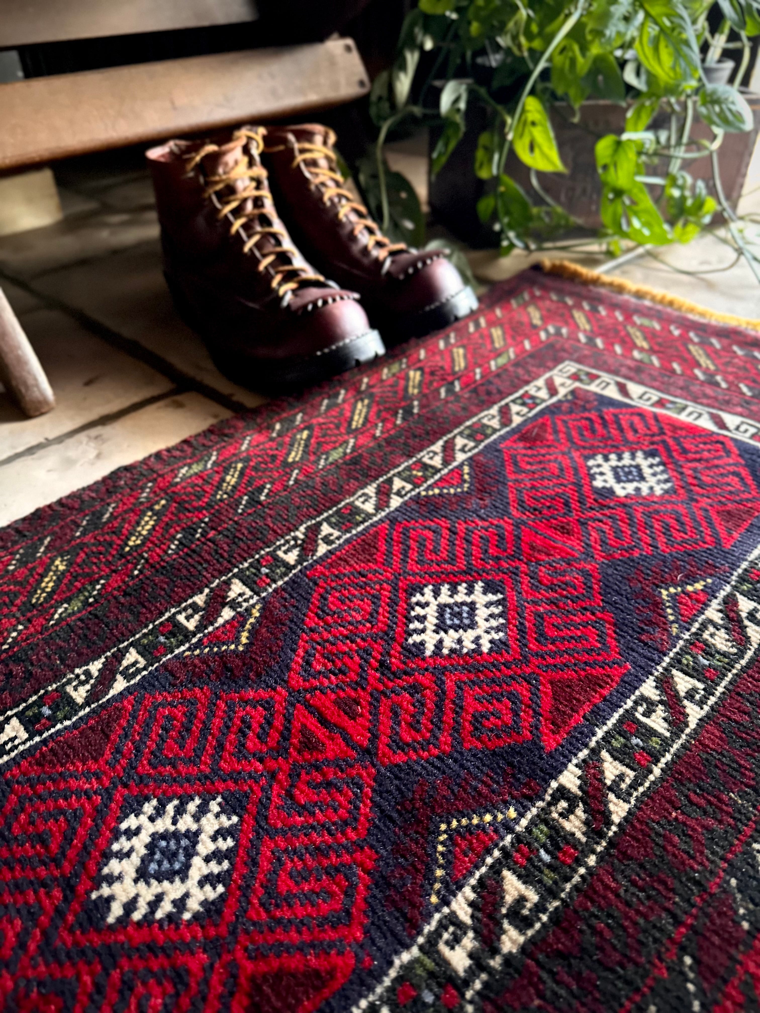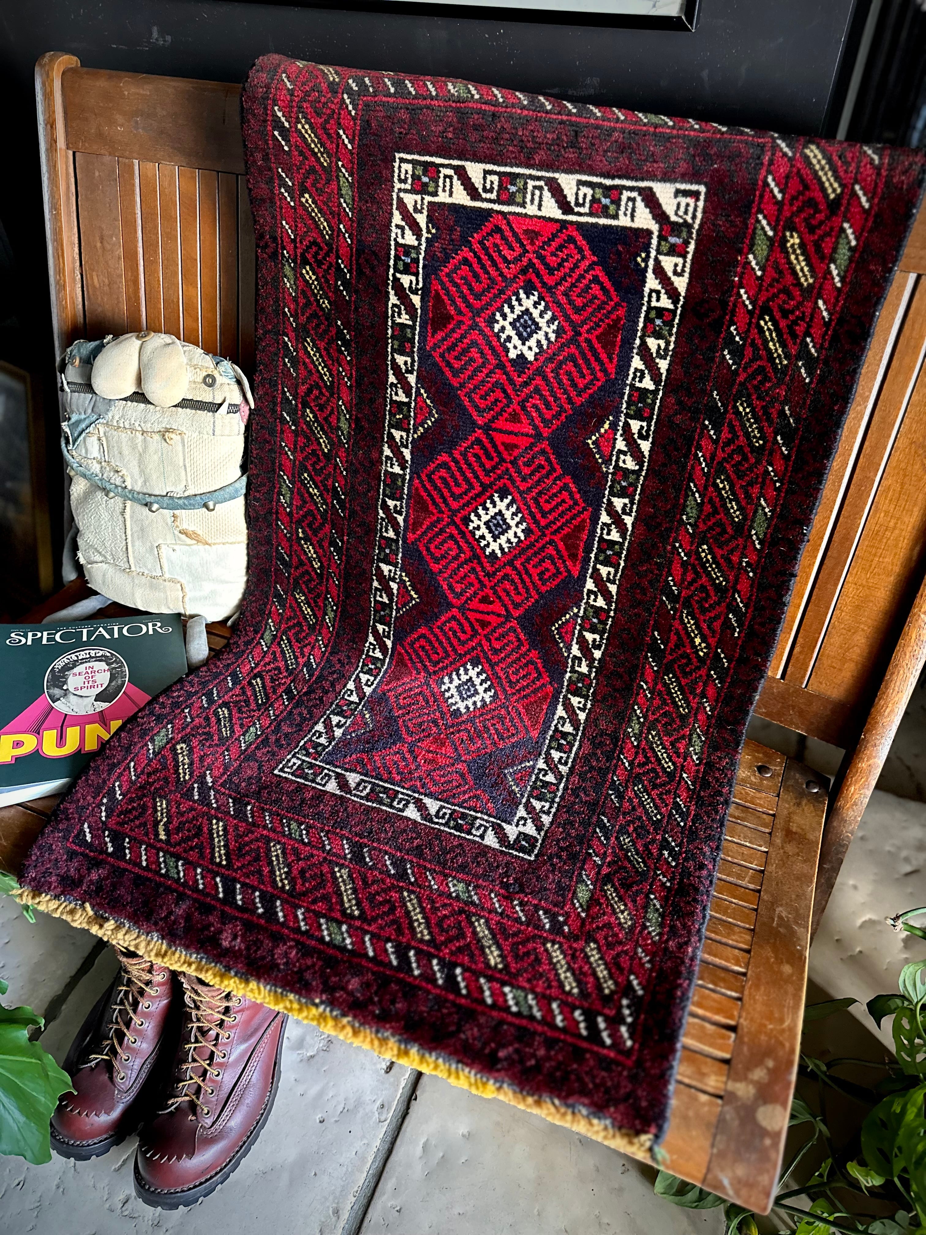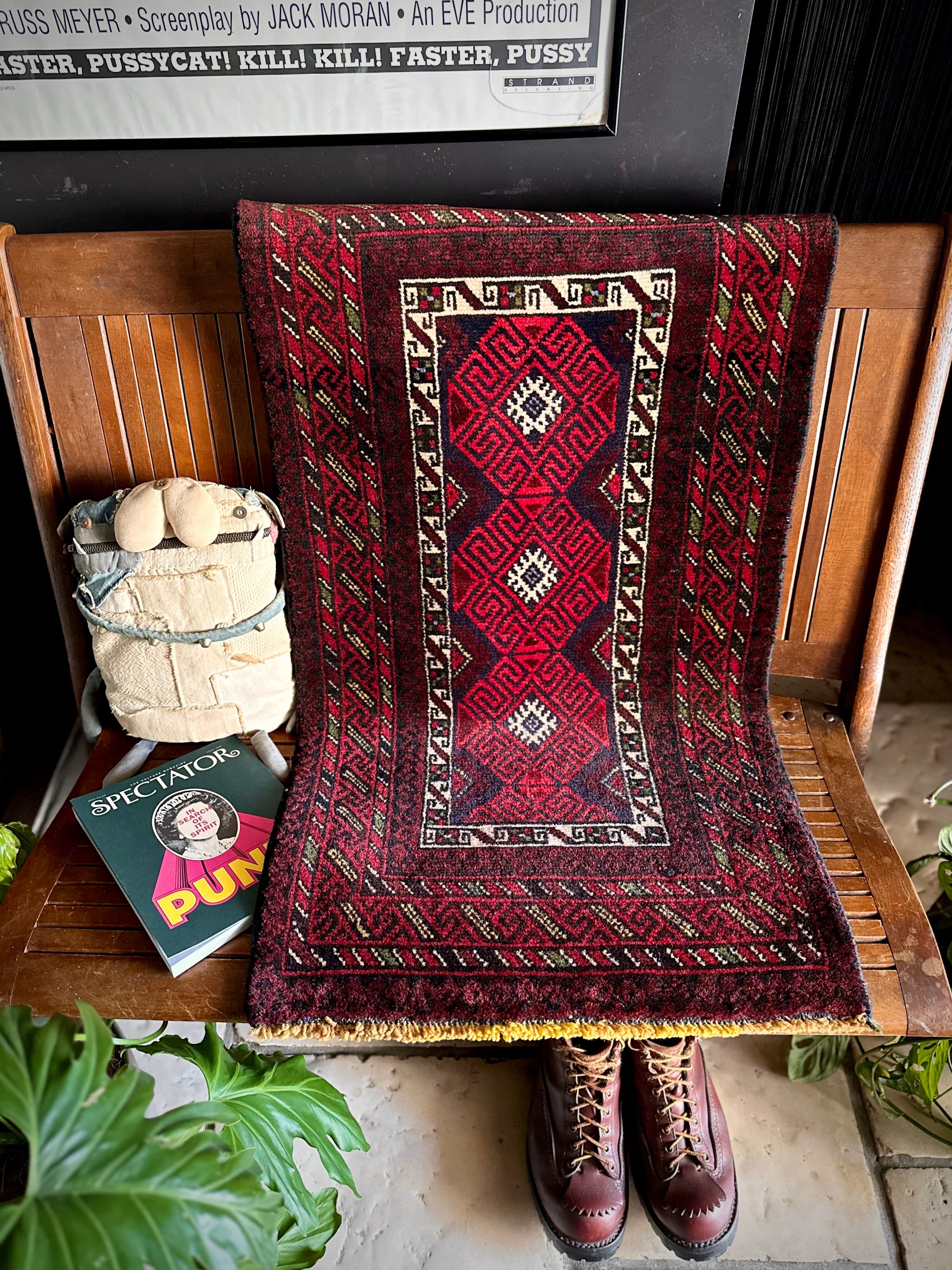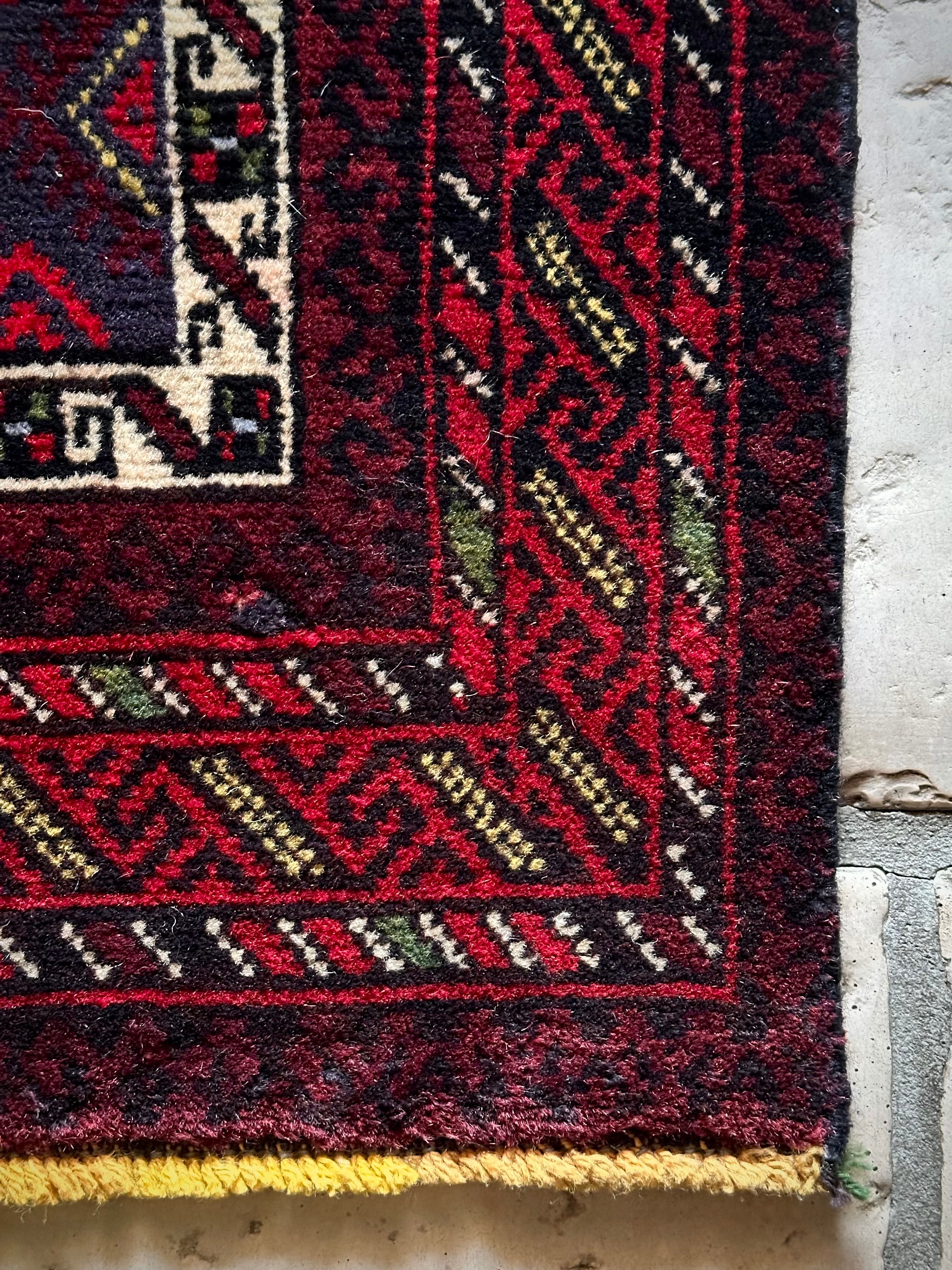 艶やかなボルドーとレッドで統一された3連メダリオンにイエローのフリンジが目を引くこちらは、アフガニスタンはヘラート州に居住するバルーチ族のトライバルラグで、元は家財道具などを収納するバーリシトと呼ばれる袋状の表皮をラグに仕立て直したモノになります。