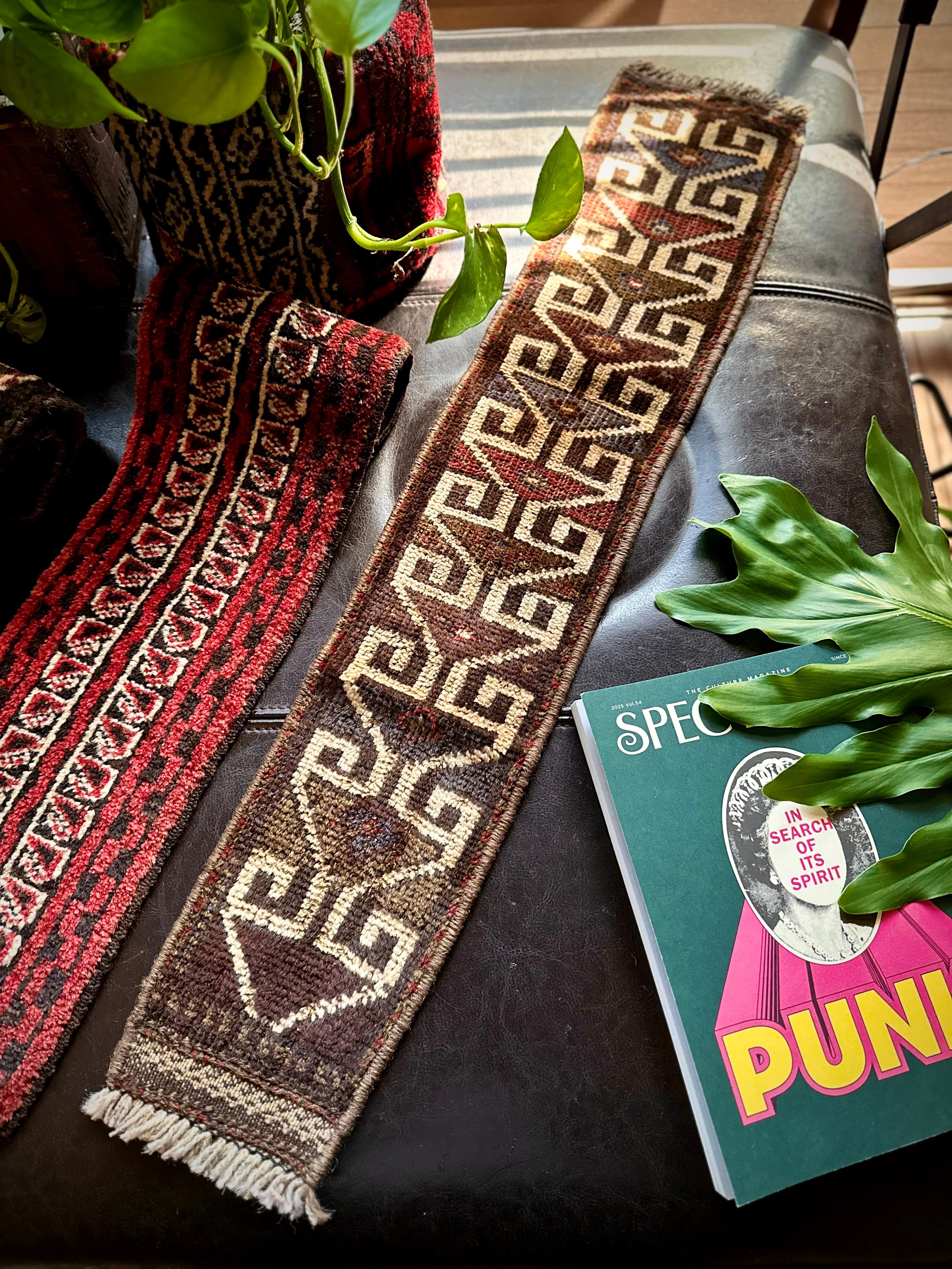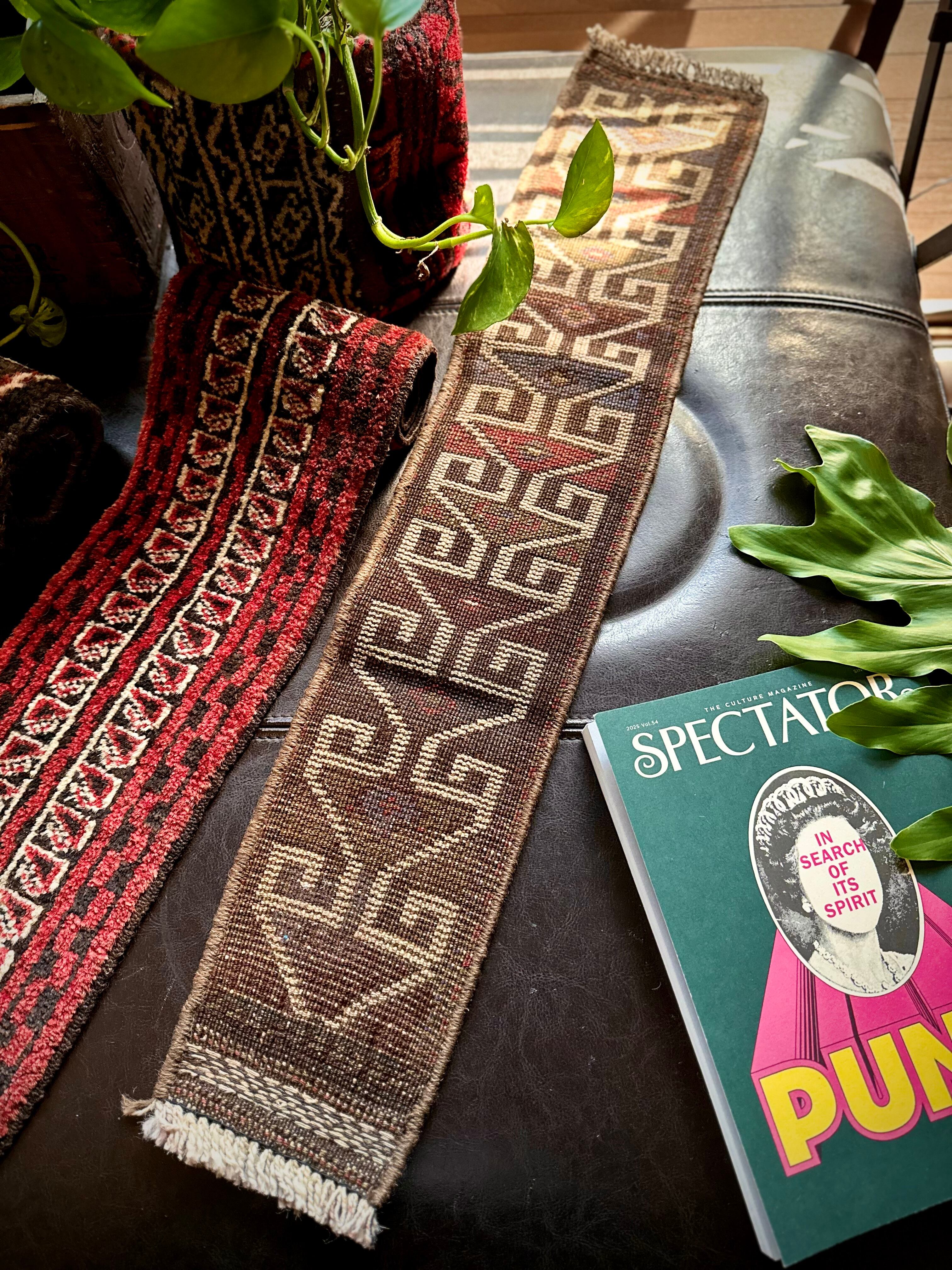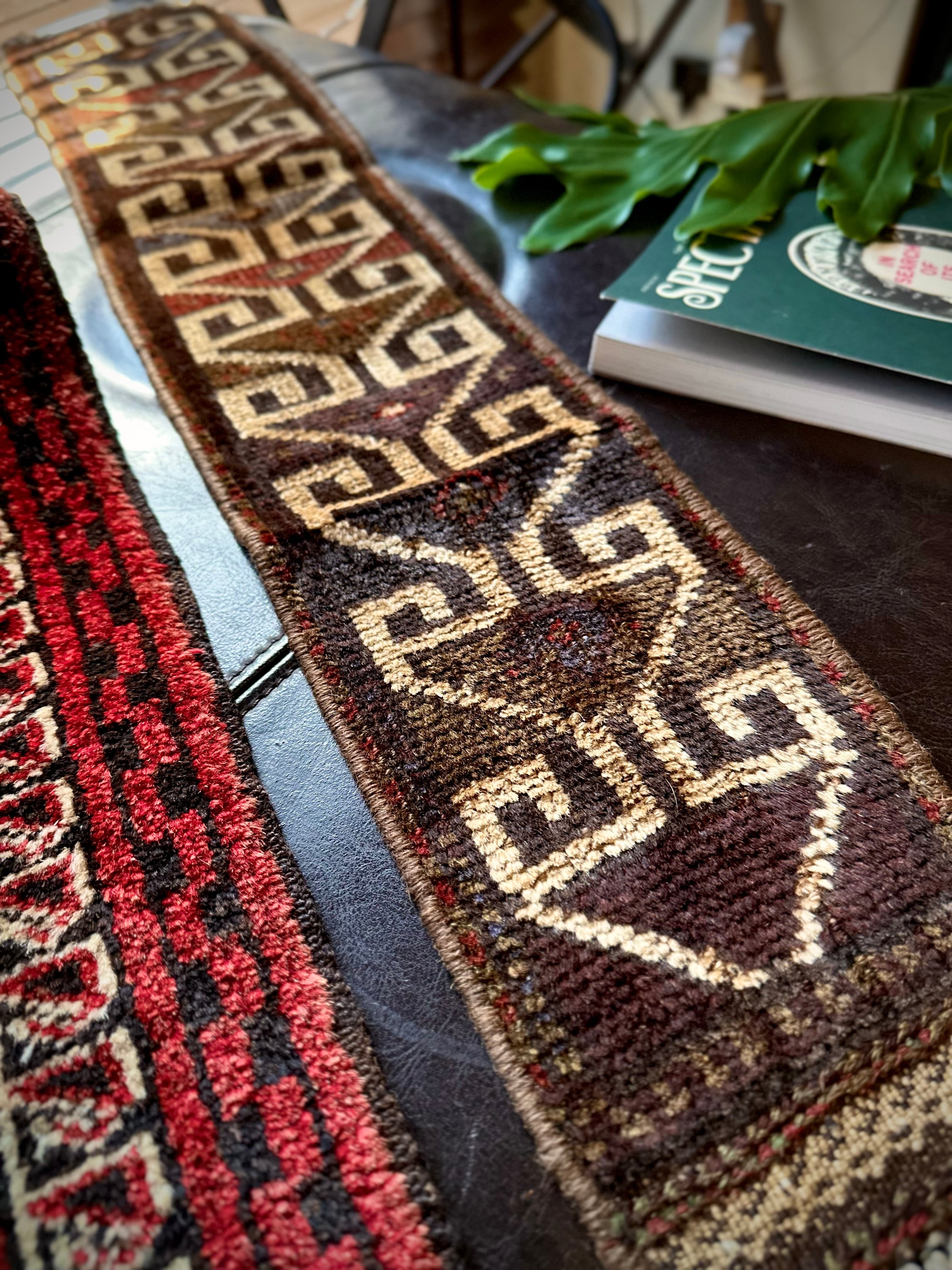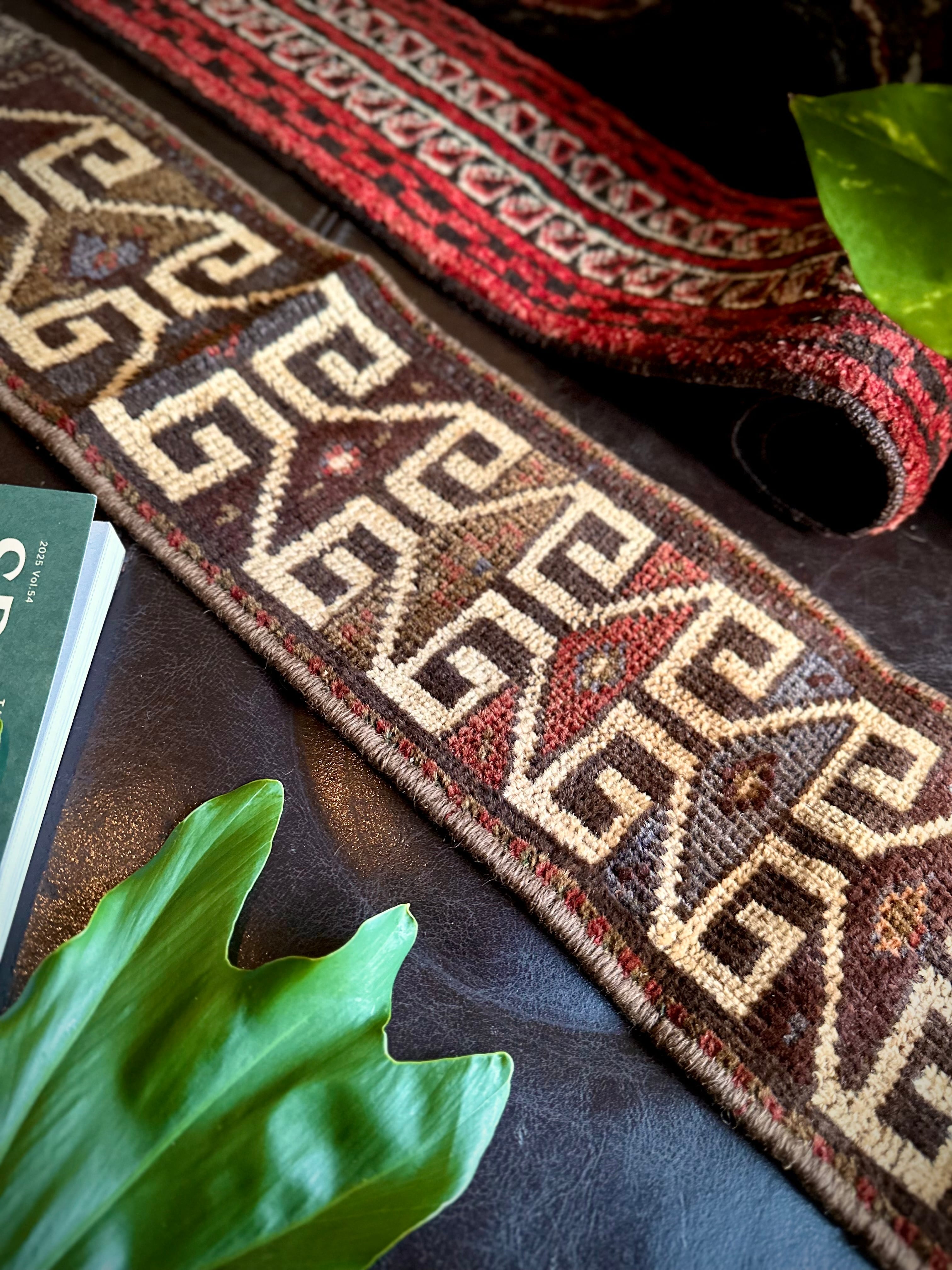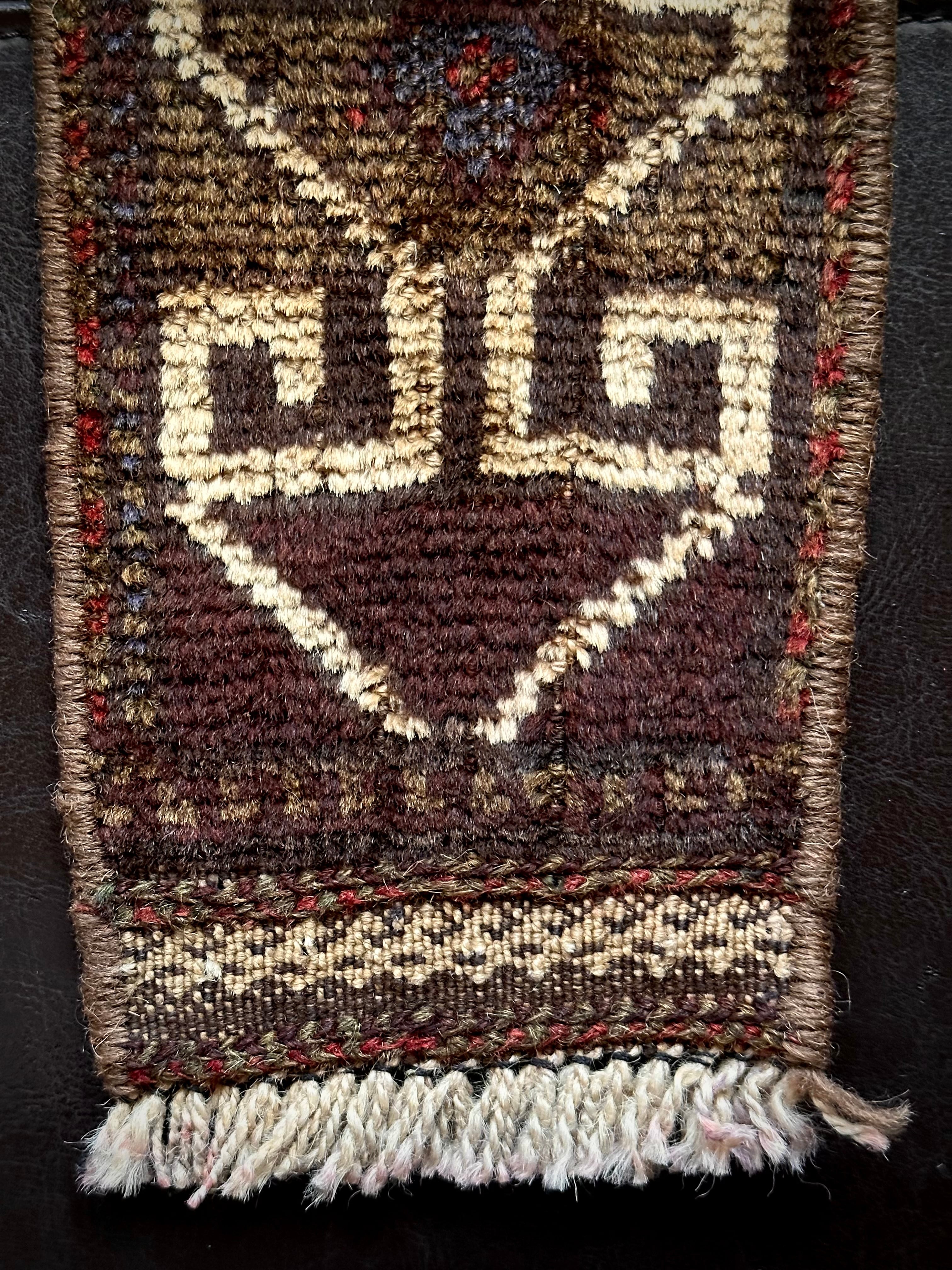 こちらの商品はアフガニスタンのヘラート州に居住するバルーチ族によって、ひとつひとつ手織りされたアニマル・トラッピングスと呼ばれる動物用の首飾りで、元はタッセルやビーズなどが付いていたのを取り除いてミニラグに仕立て直したモノになります。