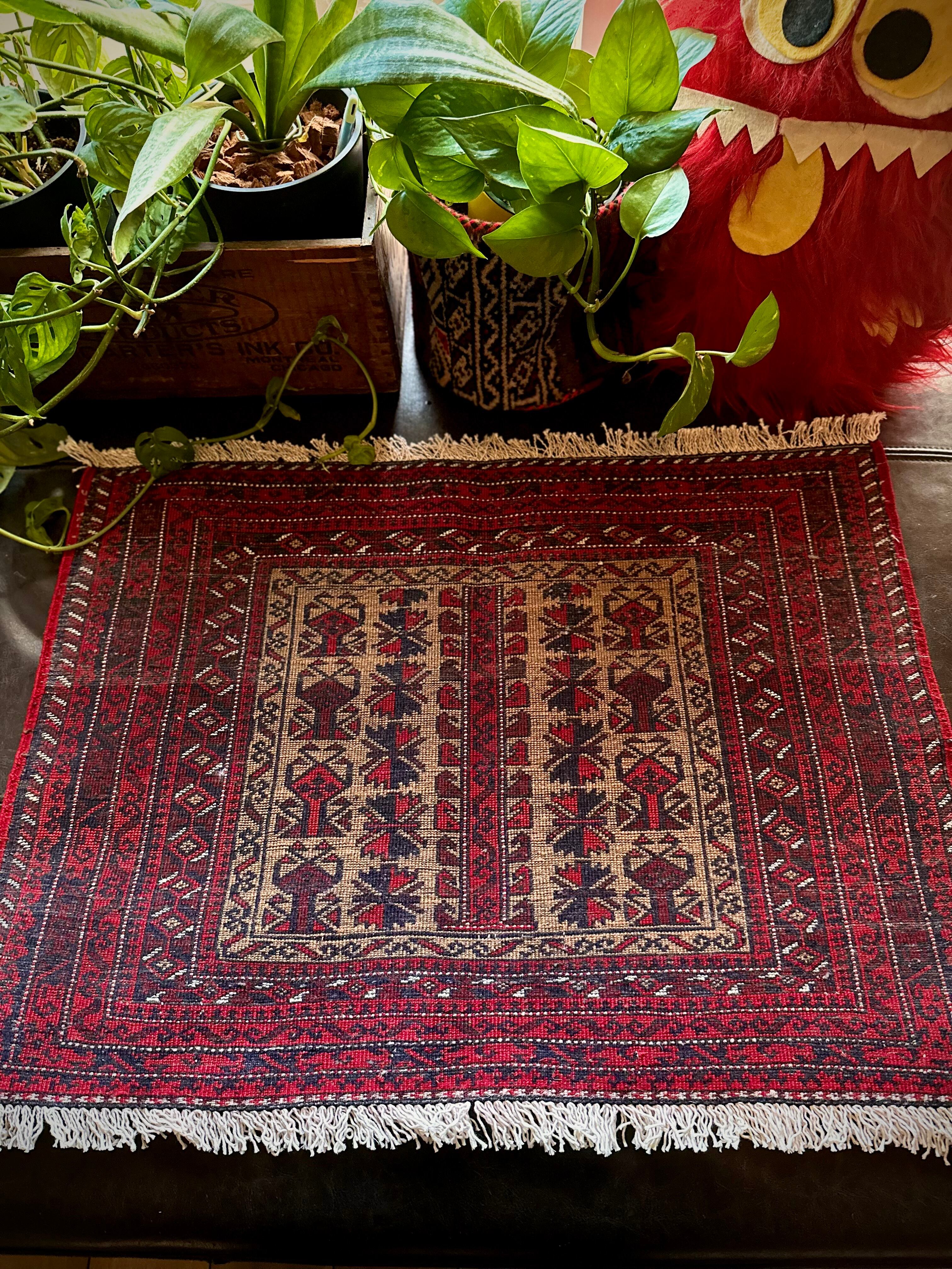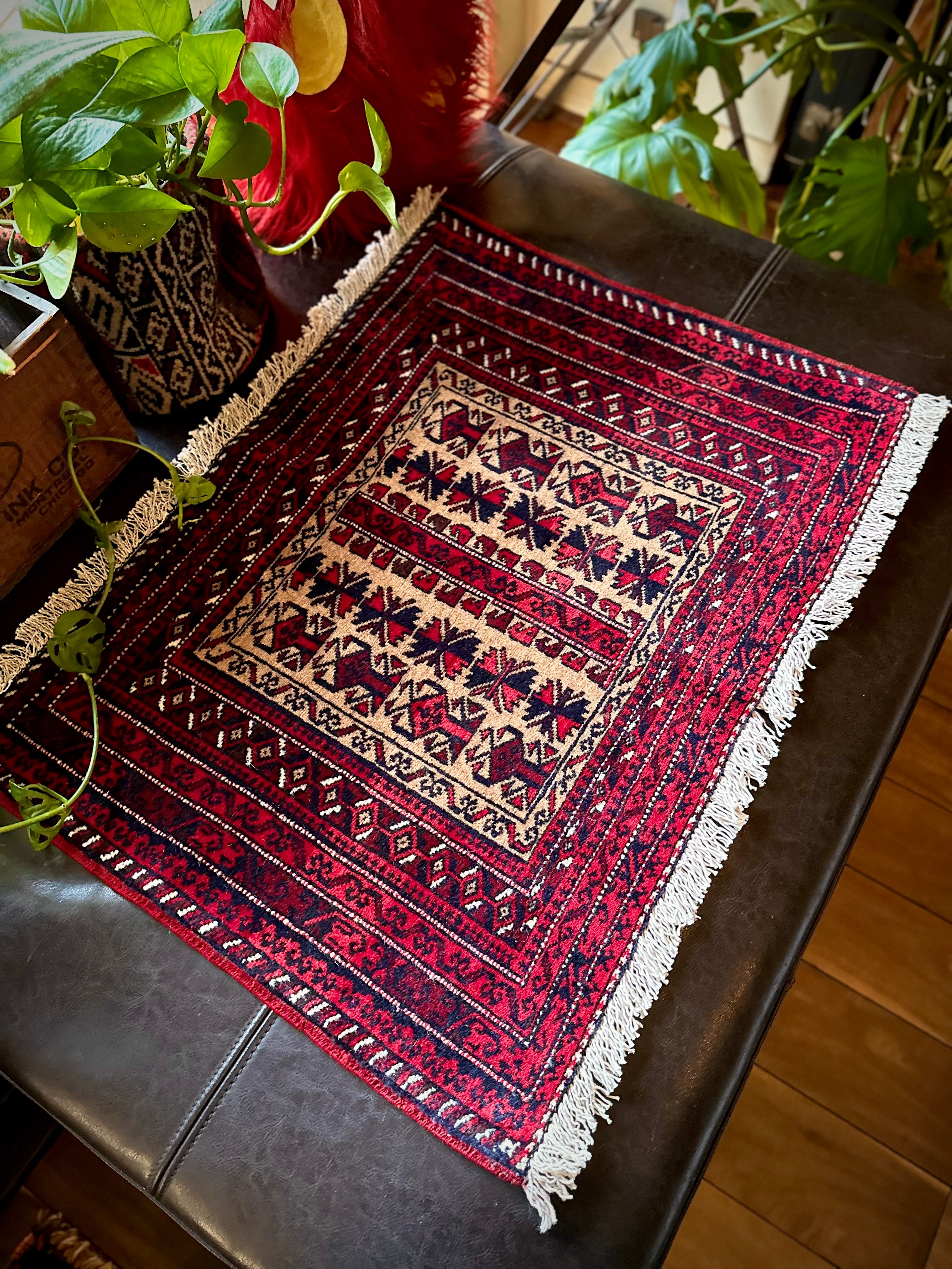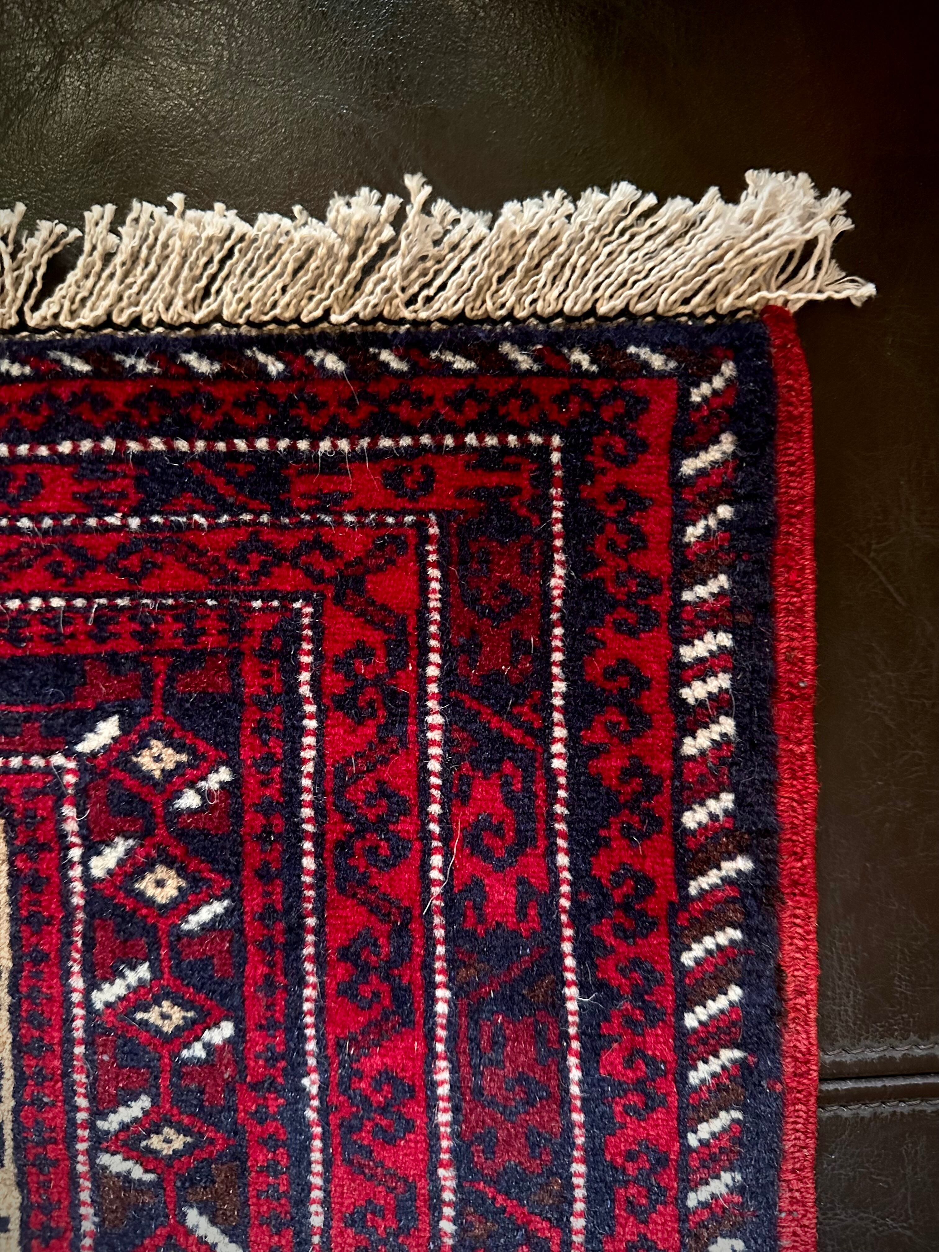こちらの支族によく見られる楓をモチーフにしたチナール柄に駒の紋様が特徴的でいてバルーチらしいでしょうか。パイル自体は短めのサラッとした肌触りで、パリッとした触り心地から恐らく未使用品かと思われますが、大きさとしてはテーブル敷きや小さなマットとしても敷いたり出来るサイズ感の万能ラグと言えます。