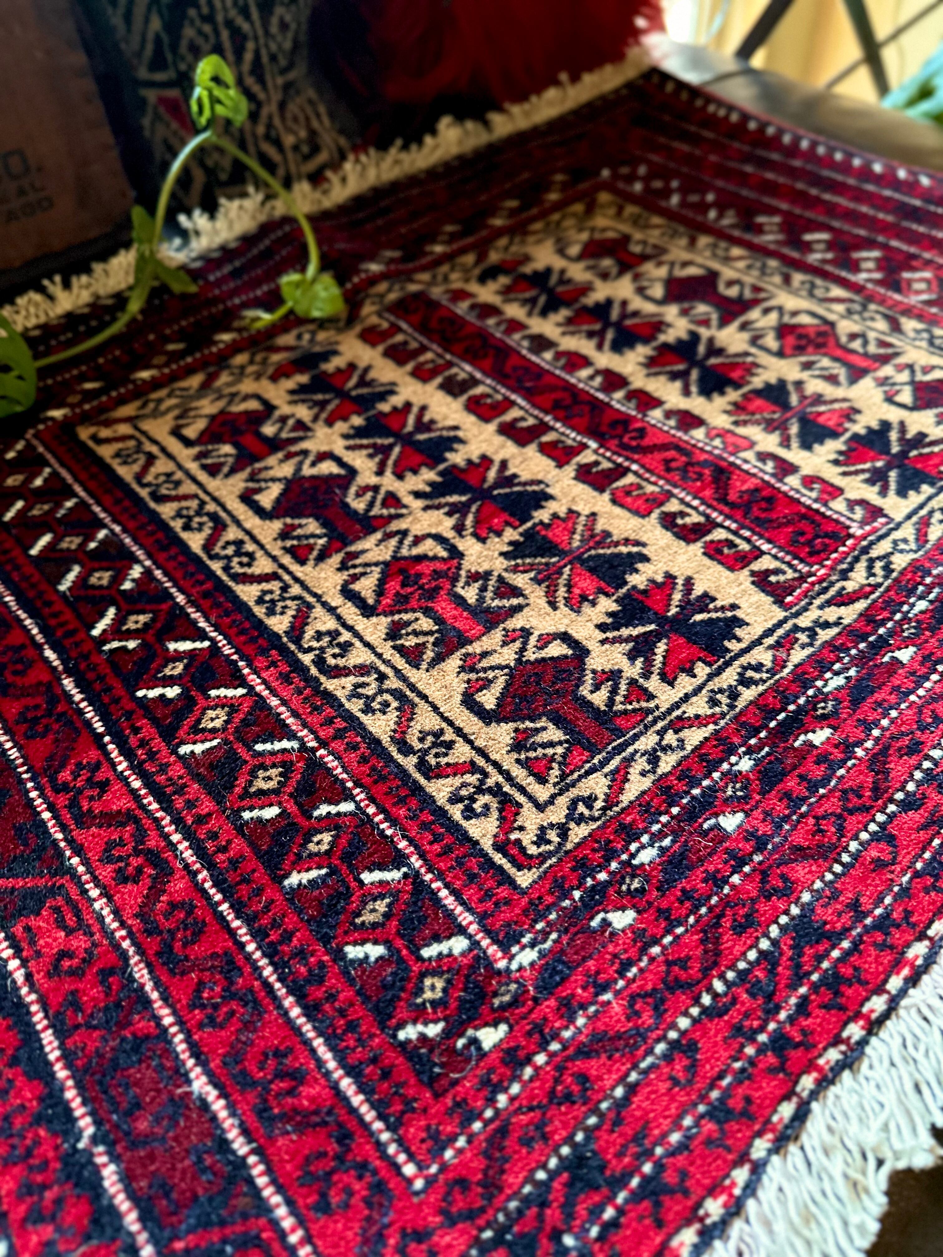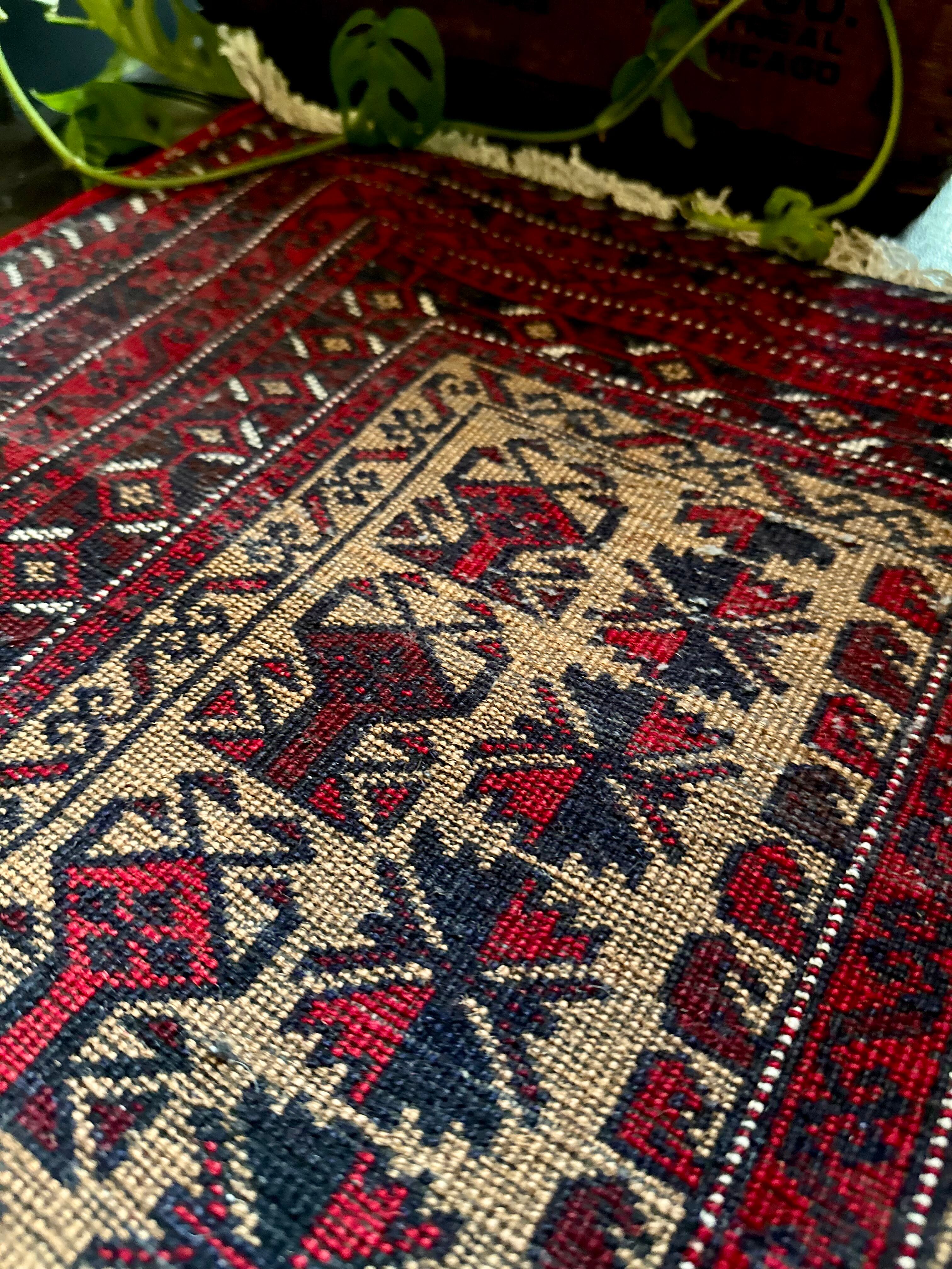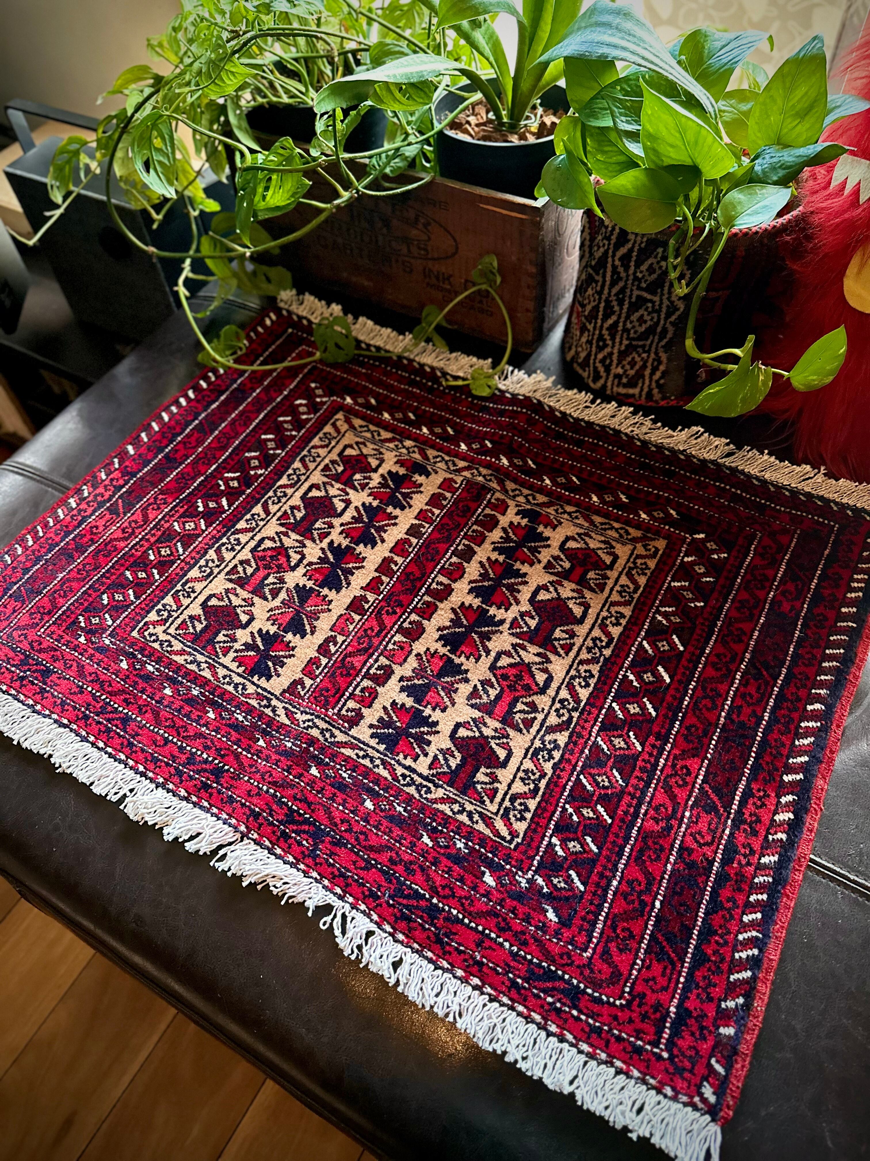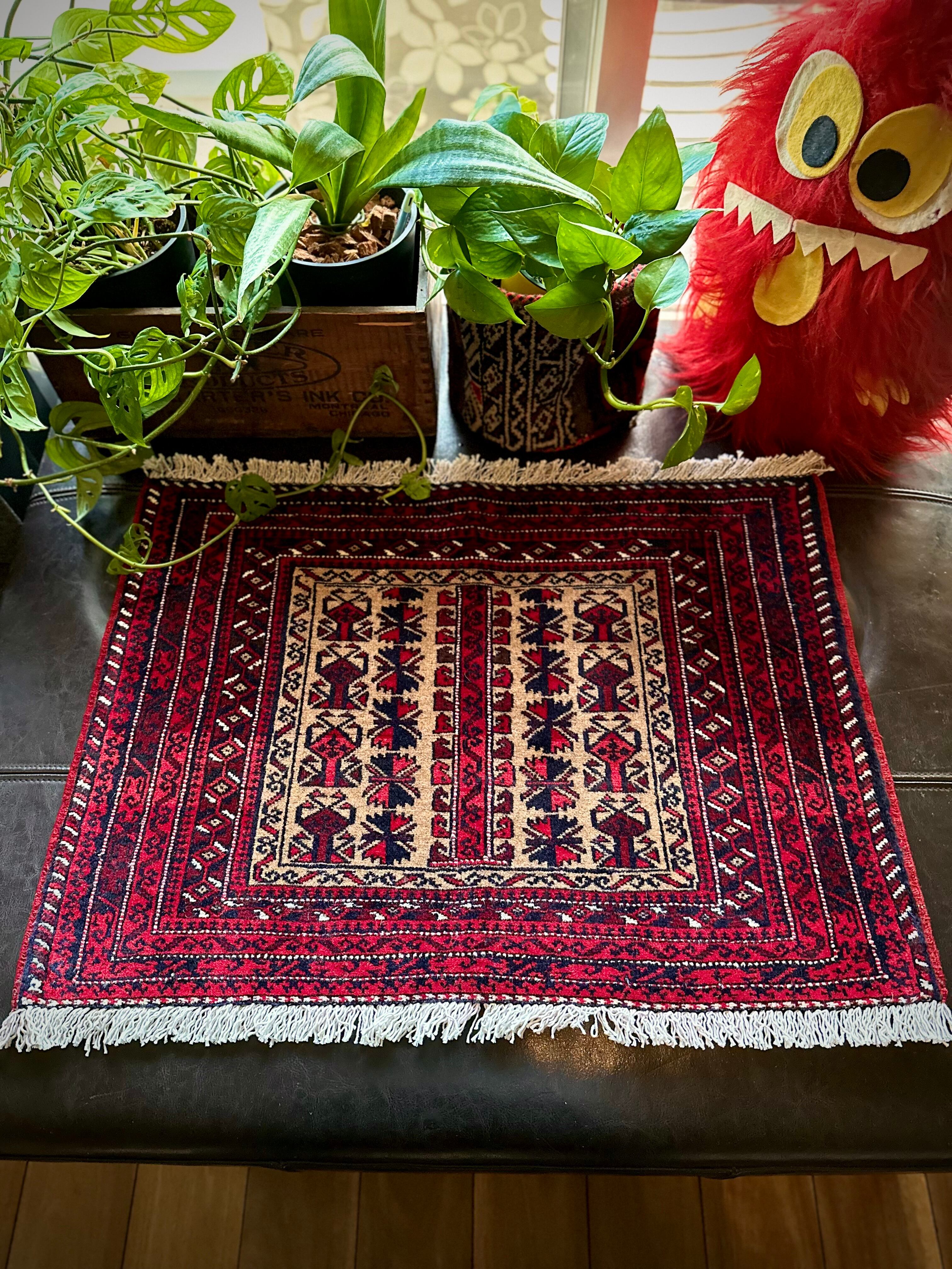 こちらの支族によく見られる楓をモチーフにしたチナール柄に駒の紋様が特徴的でいてバルーチらしいでしょうか。パイル自体は短めのサラッとした肌触りで、パリッとした触り心地から恐らく未使用品かと思われますが、大きさとしてはテーブル敷きや小さなマットとしても敷いたり出来るサイズ感の万能ラグと言えます。