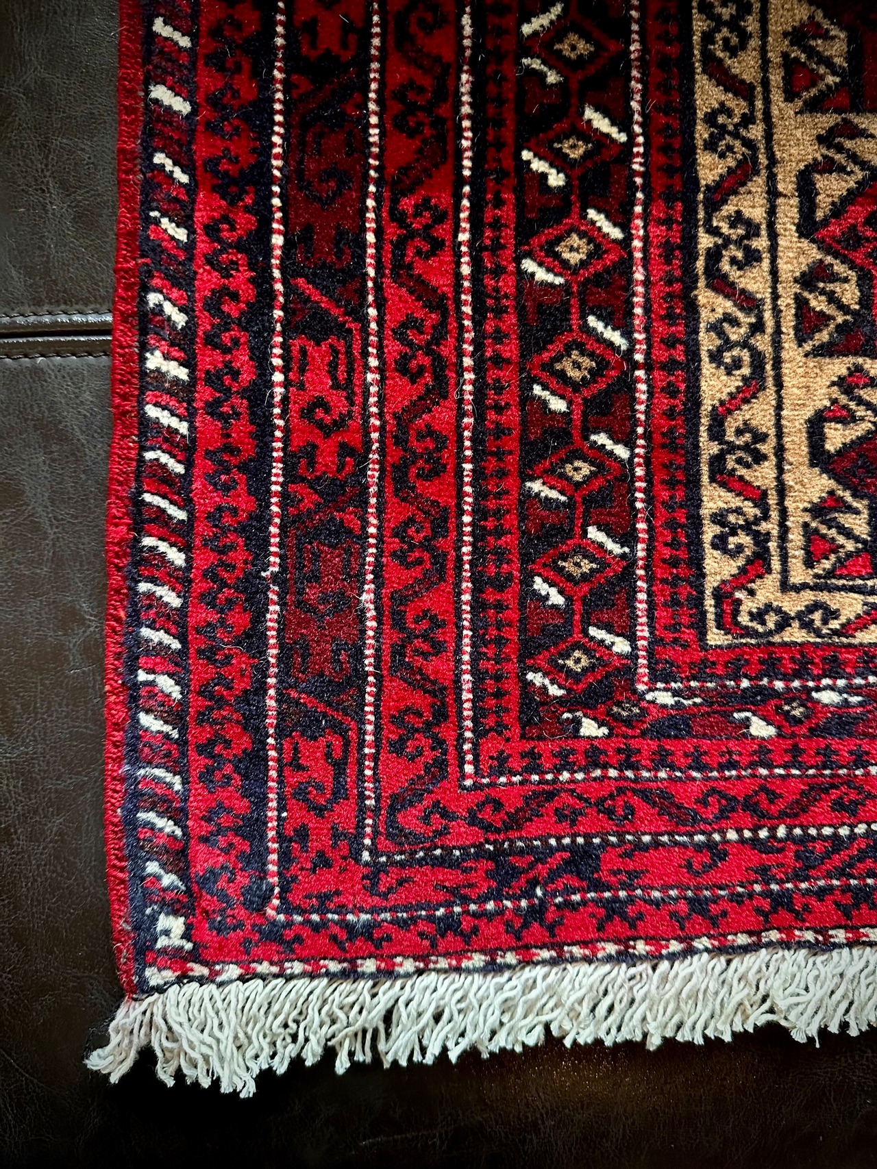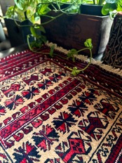 細かなミルフィーユ状の真っ赤なボーダーに対比したベージュの色合いが落ち着いた雰囲気のこちらは、アフガニスタンはカブールに居住するバルーチ族の支族で、元はホルジンと呼ばれる振り分け用サドルバッグの表皮をラグに仕立て直したモノになります。