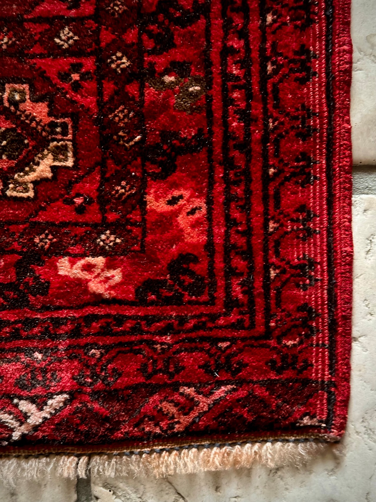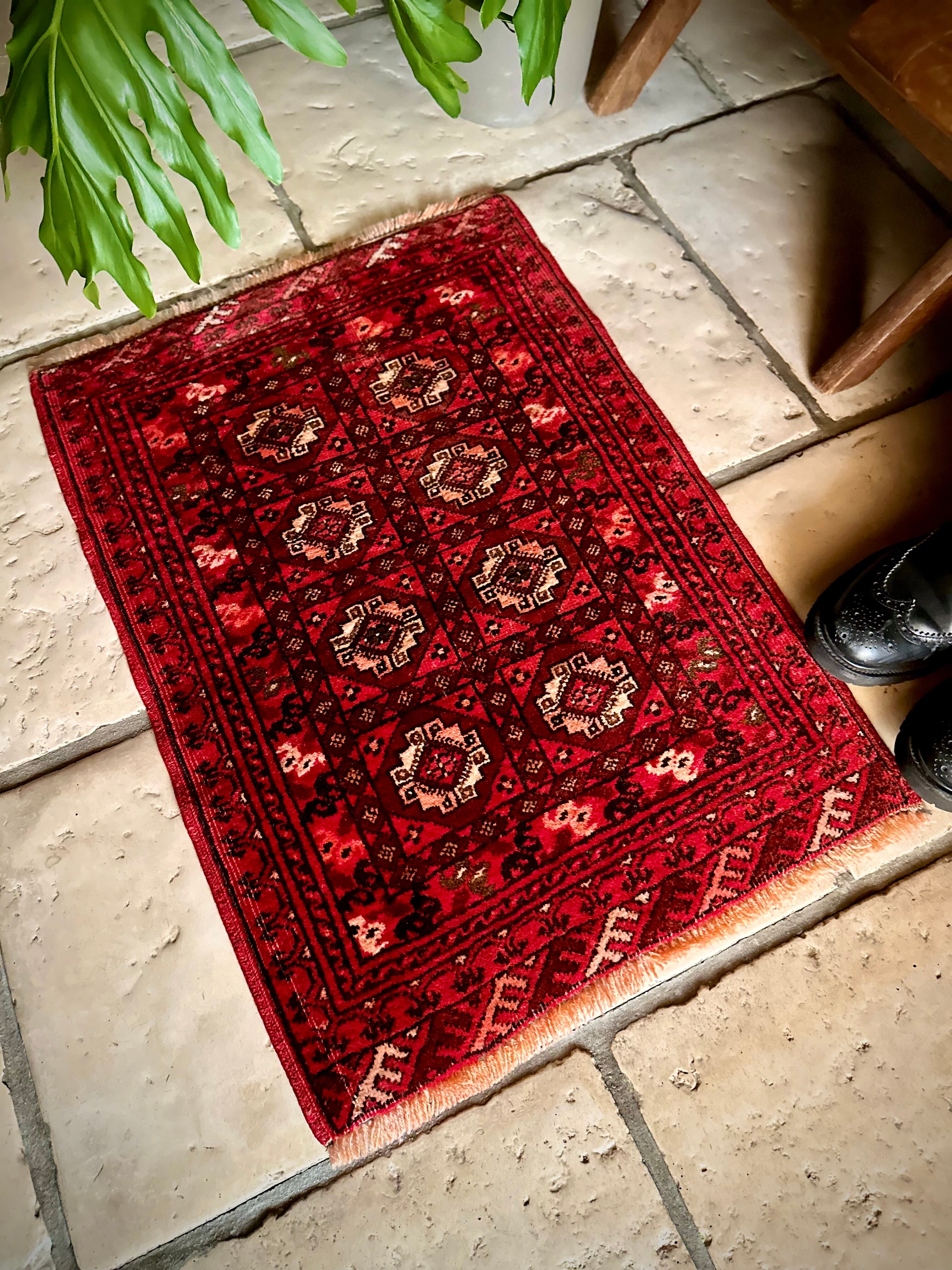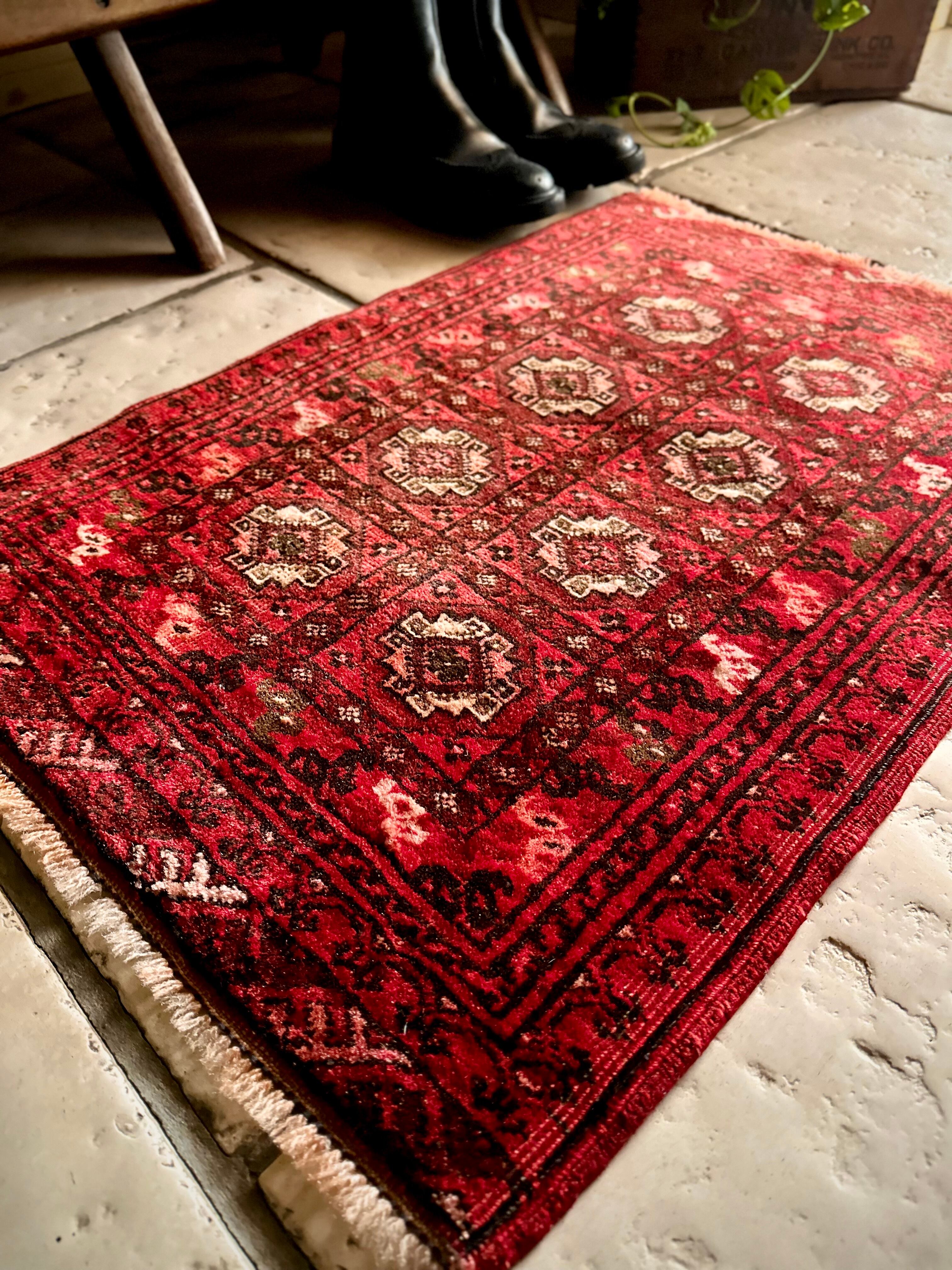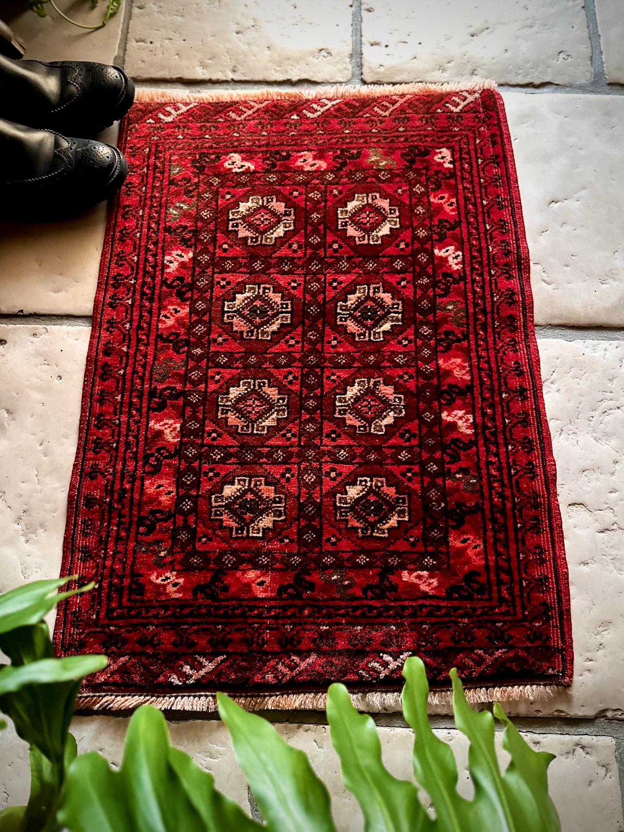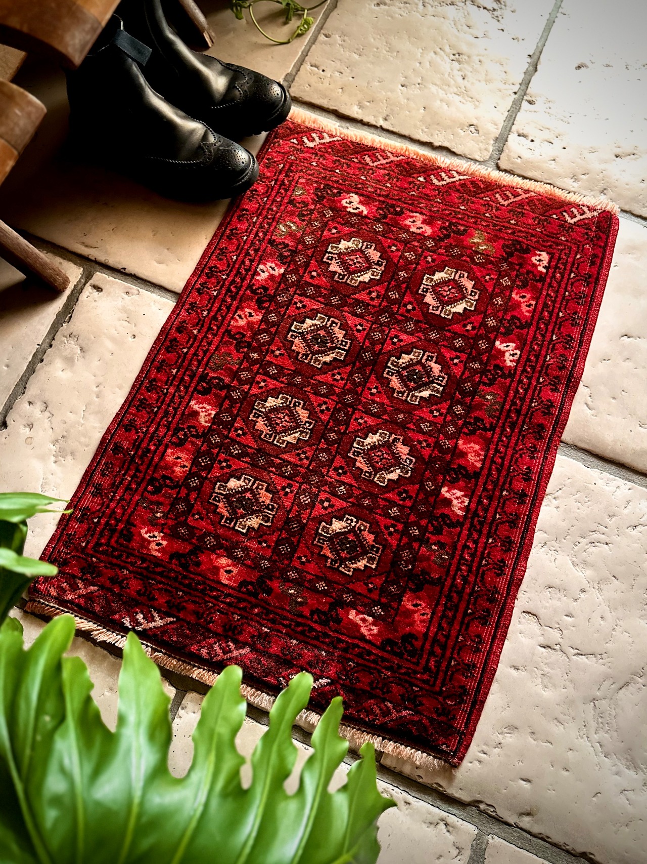 真紅のフィールドにギュルの連続紋様とお馴染みの細かなミルフィーユ状のボーダーが安心感を与えるこちらは、アフガニスタン北部に居住するトルクメン族が手織りする、小さいながらも貫禄溢れるトライバルラグになります。