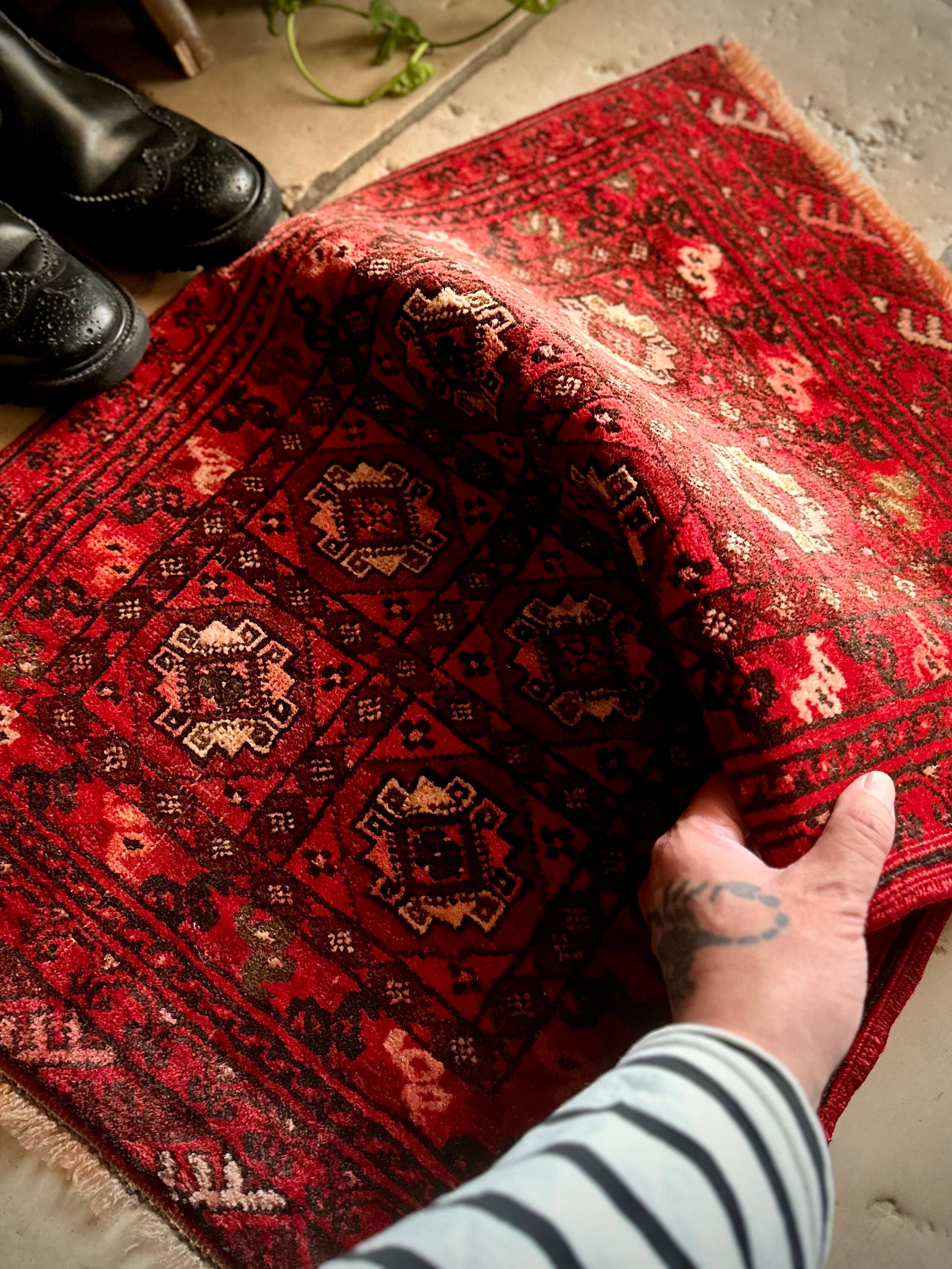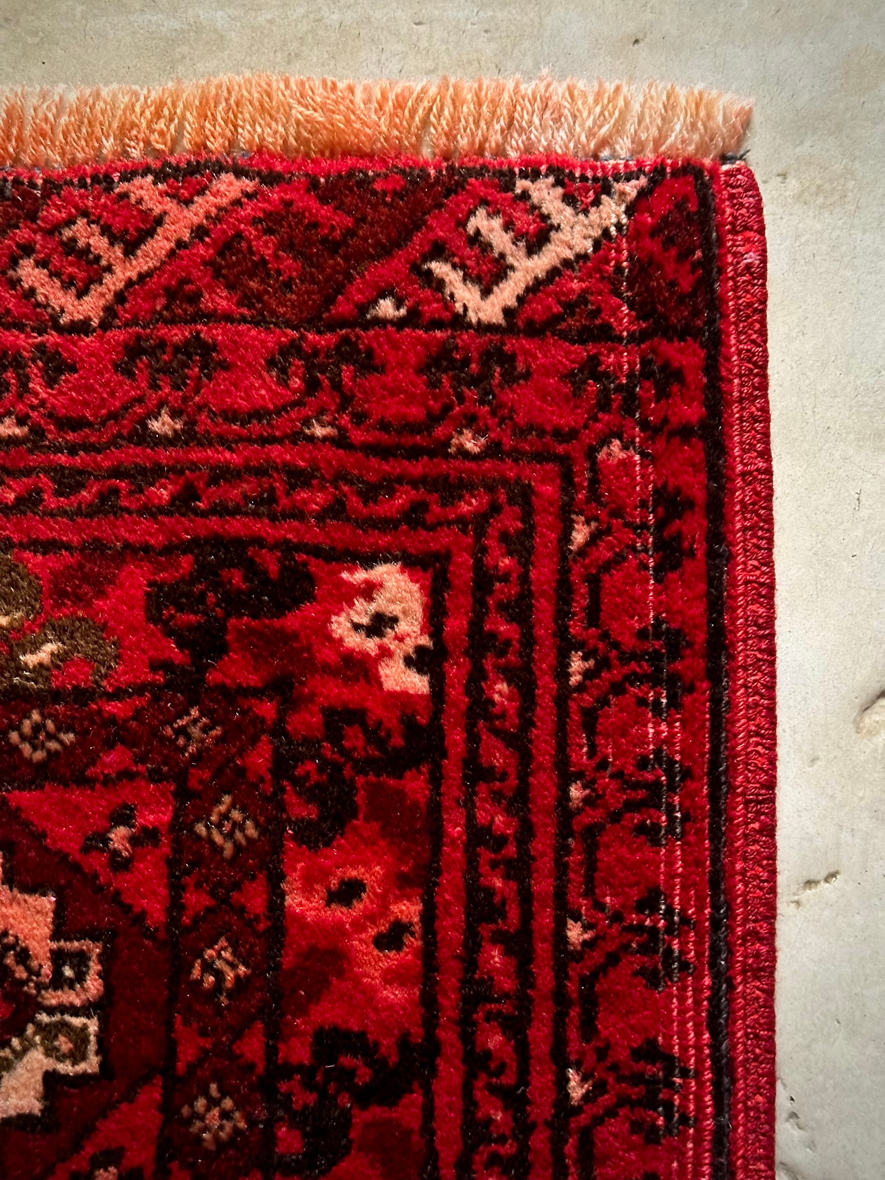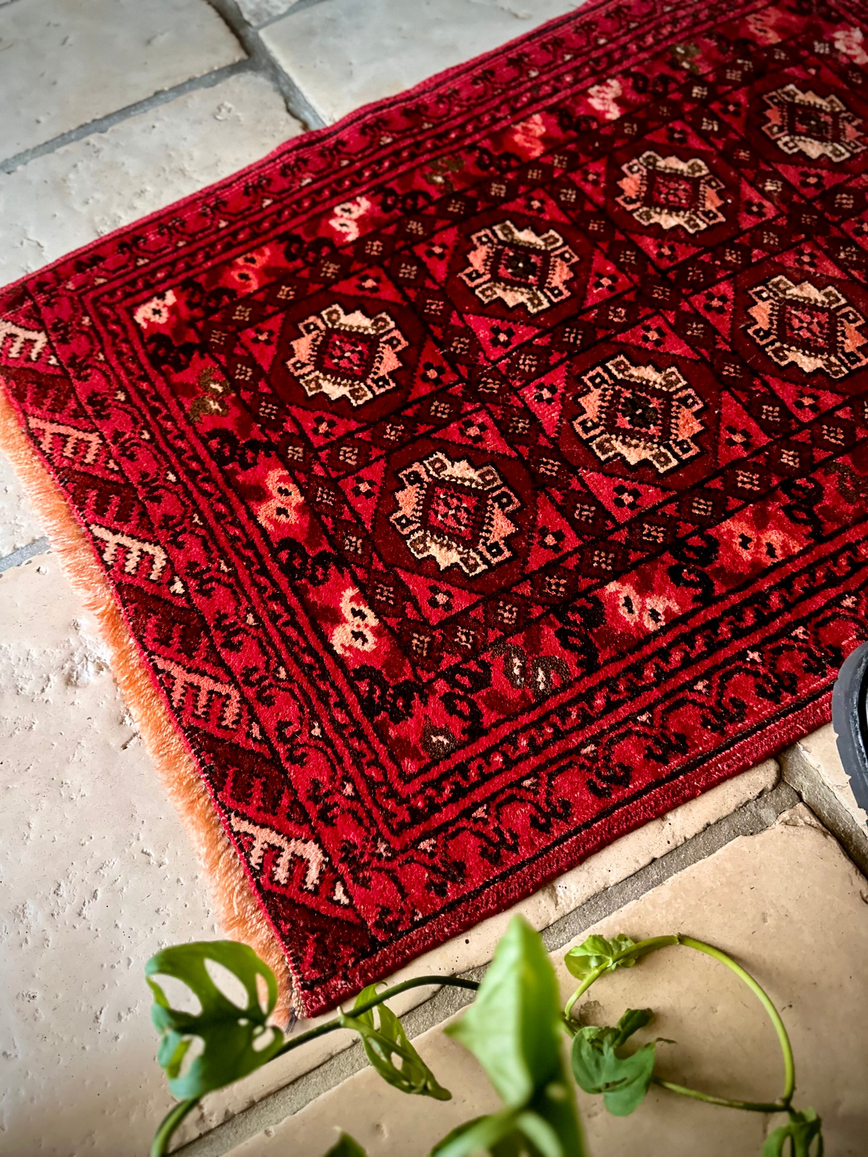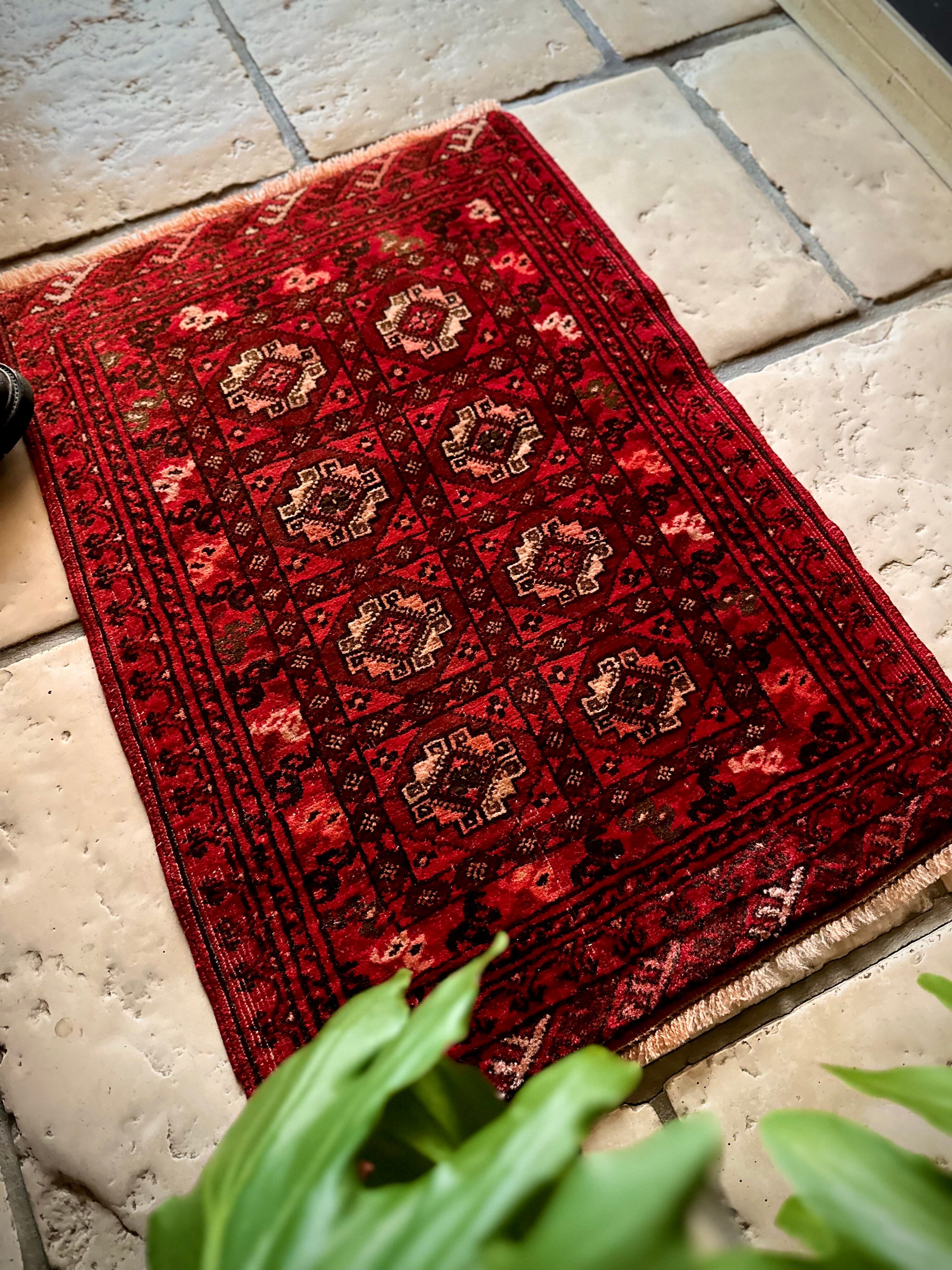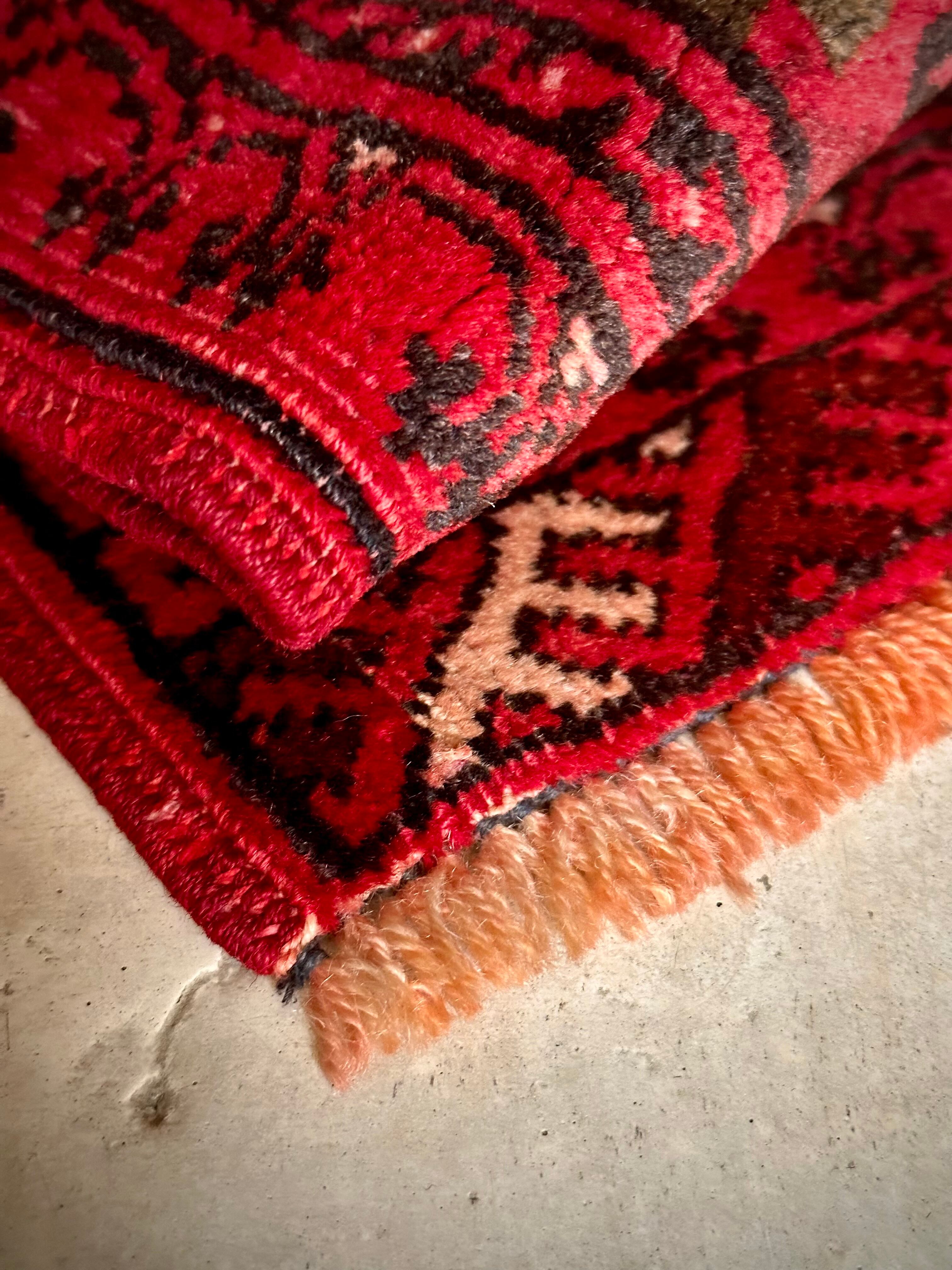 真紅のフィールドにギュルの連続紋様とお馴染みの細かなミルフィーユ状のボーダーが安心感を与えるこちらは、アフガニスタン北部に居住するトルクメン族が手織りする、小さいながらも貫禄溢れるトライバルラグになります。