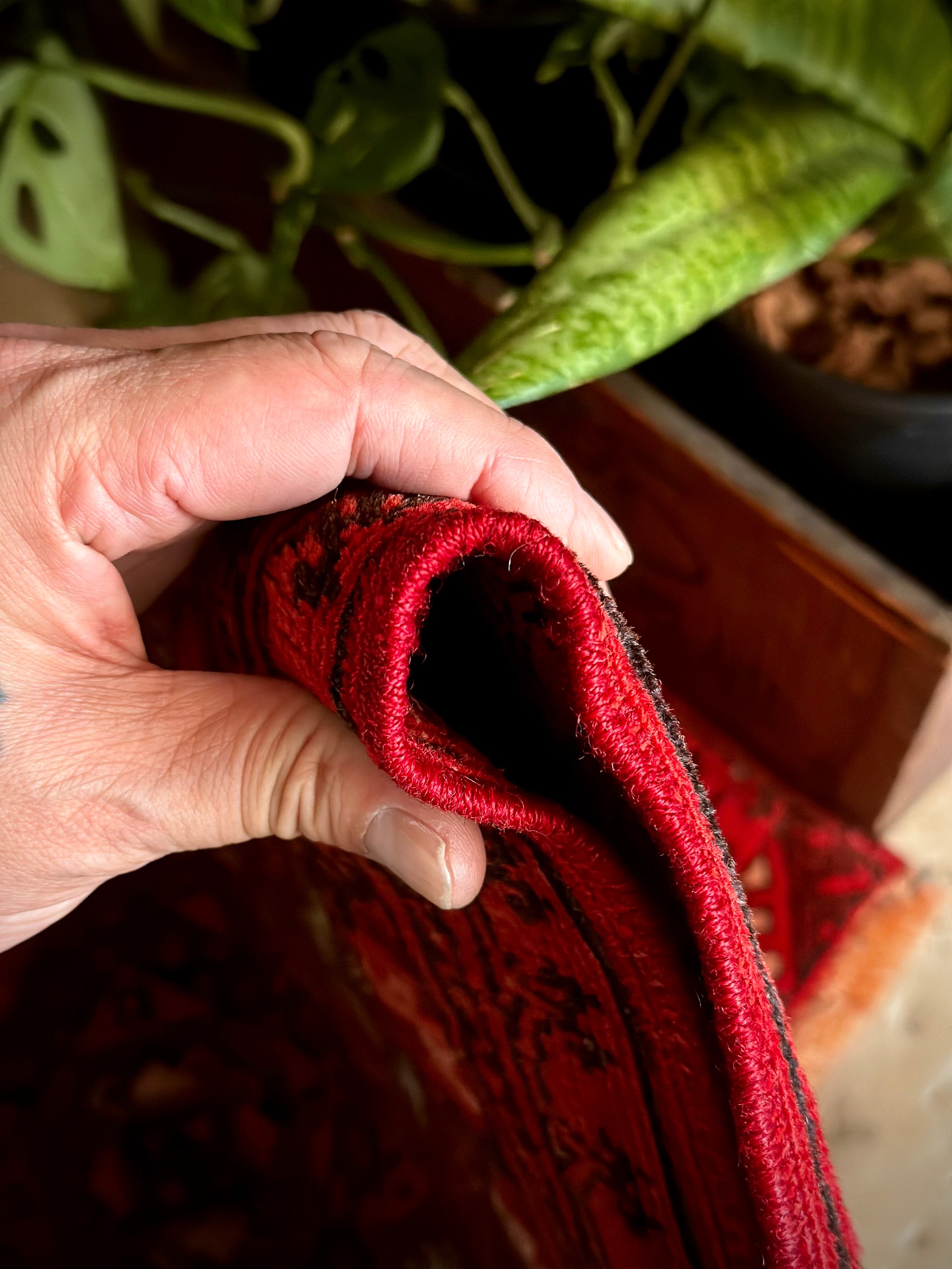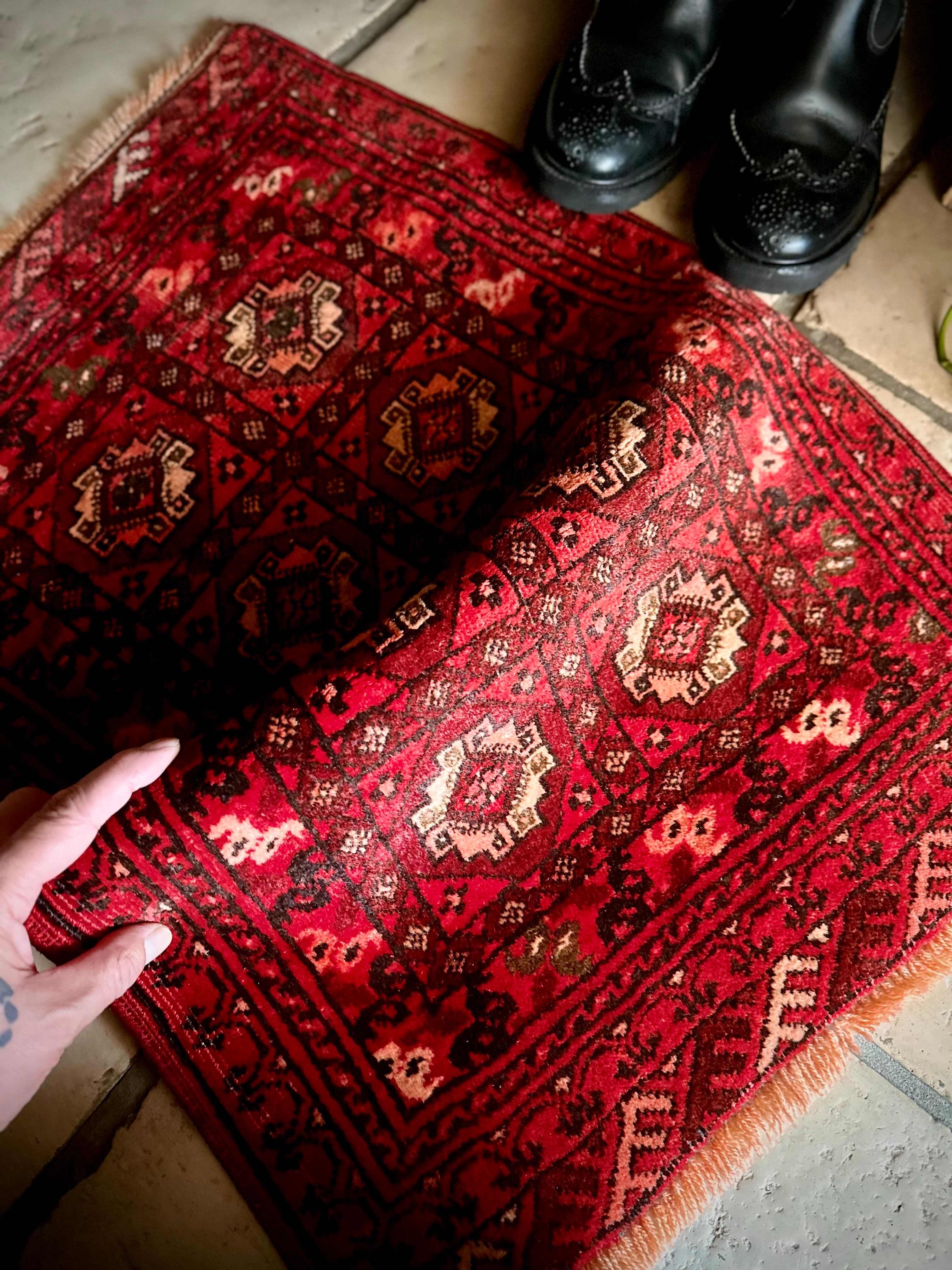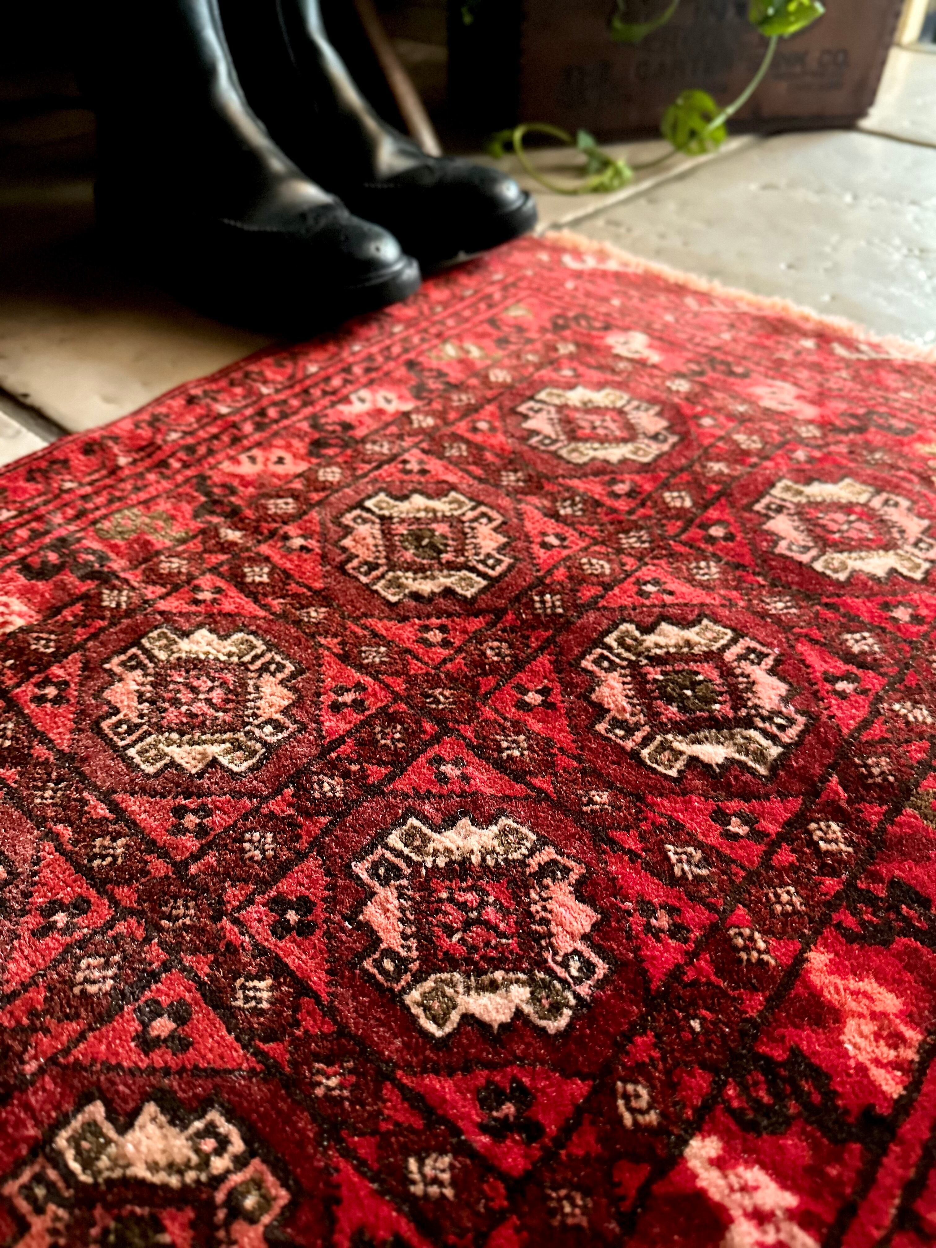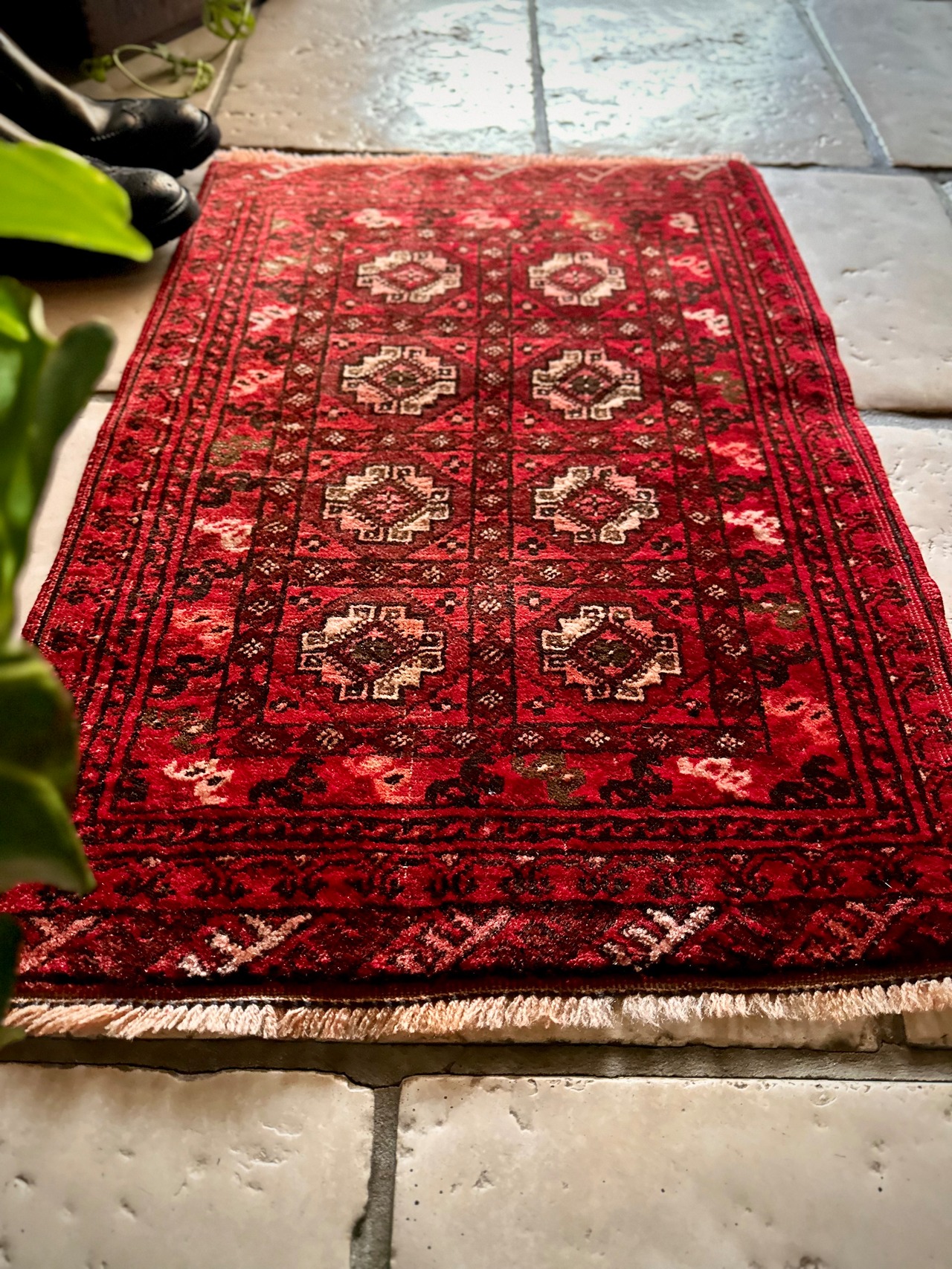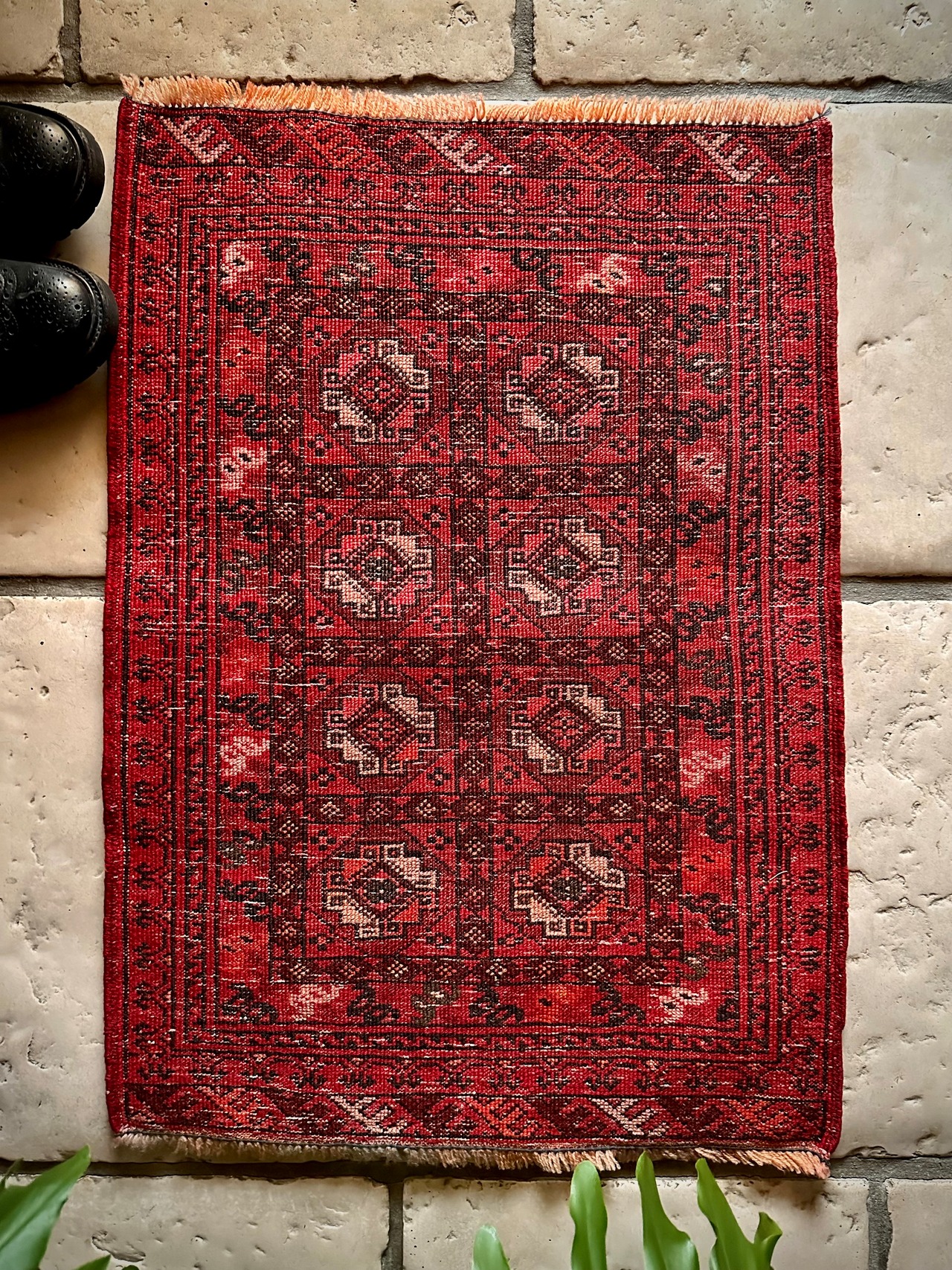 真紅のフィールドにギュルの連続紋様とお馴染みの細かなミルフィーユ状のボーダーが安心感を与えるこちらは、アフガニスタン北部に居住するトルクメン族が手織りする、小さいながらも貫禄溢れるトライバルラグになります。