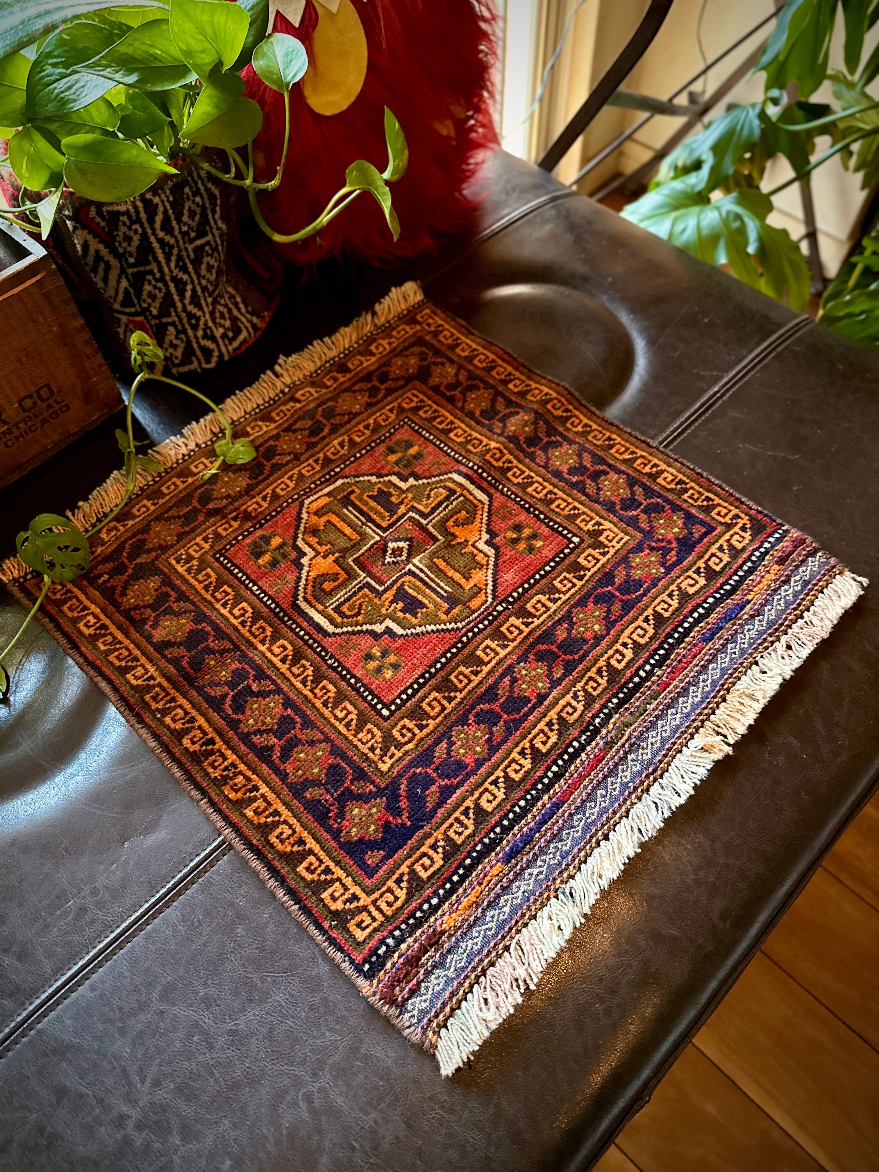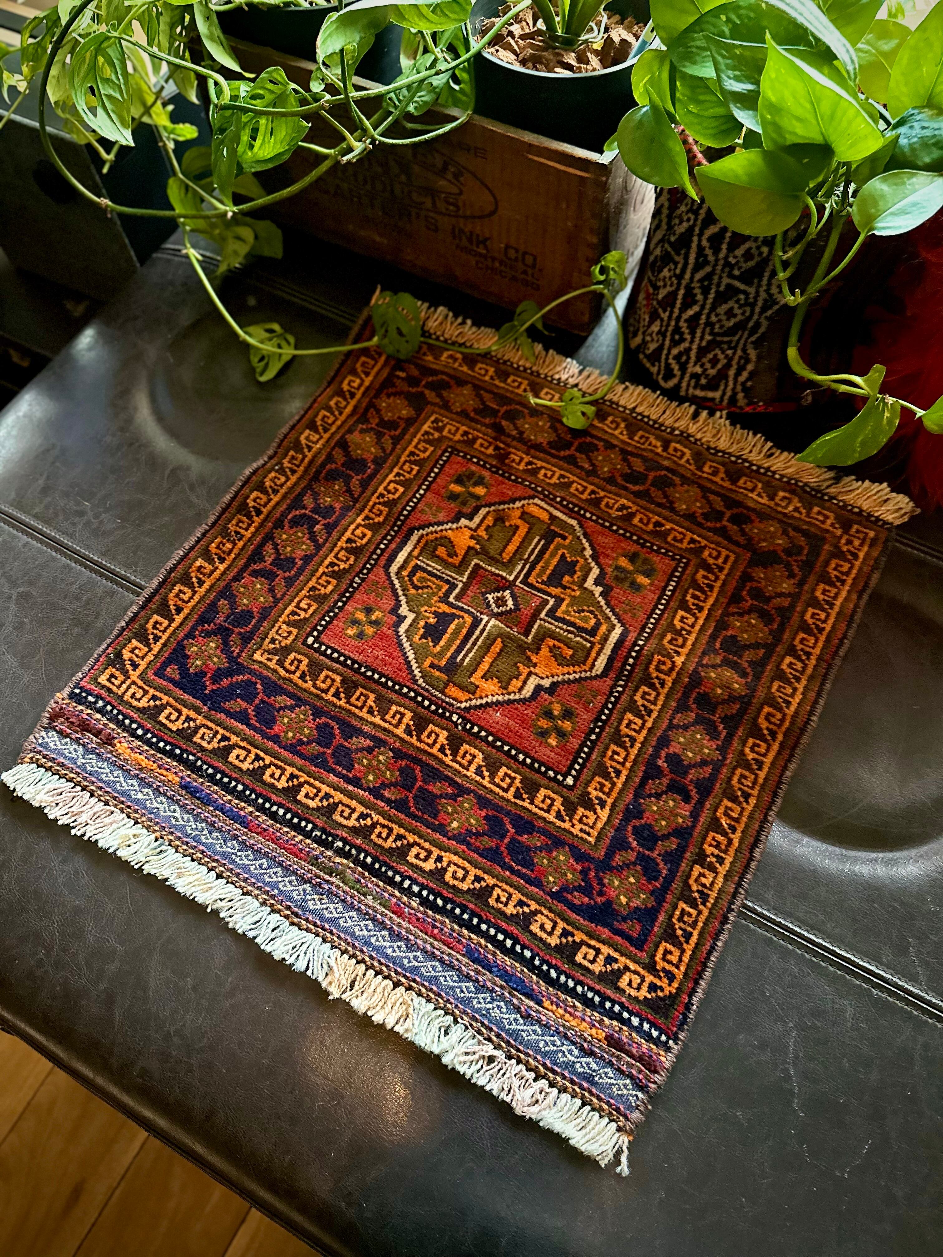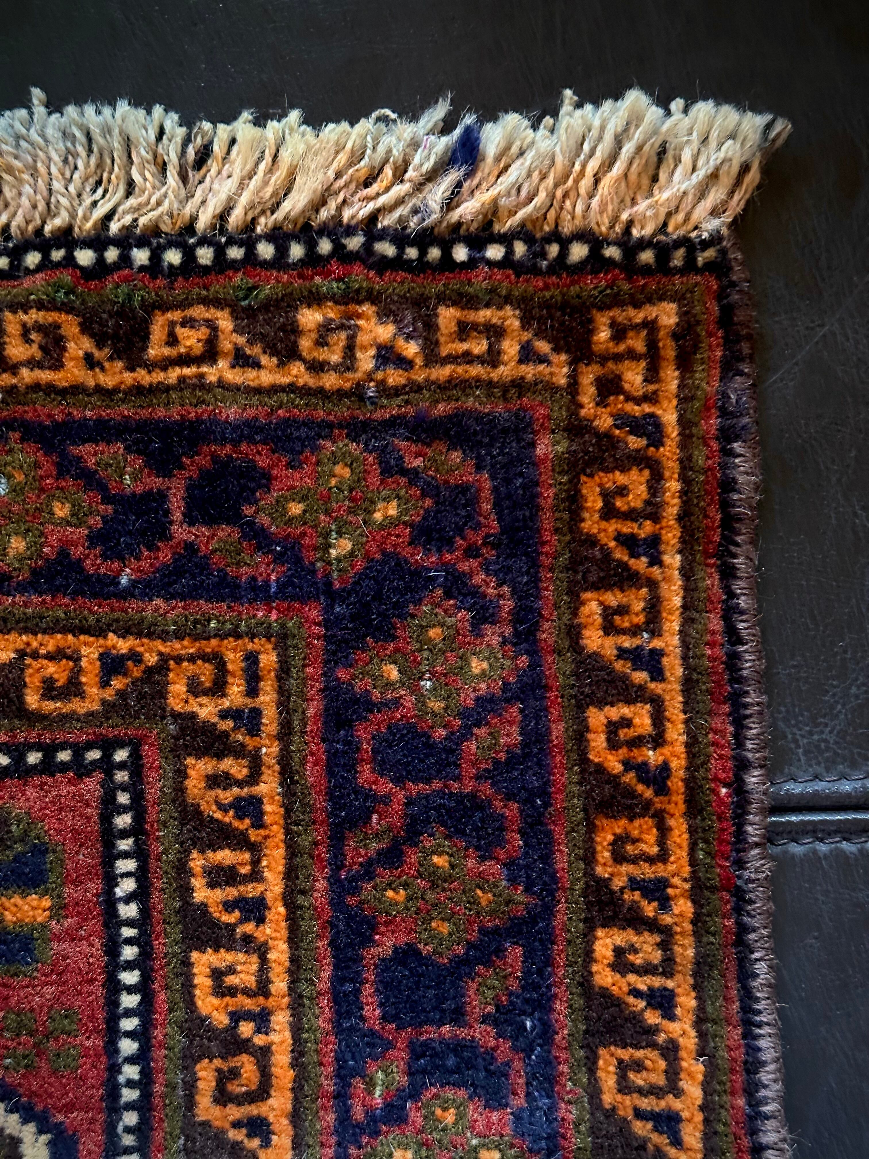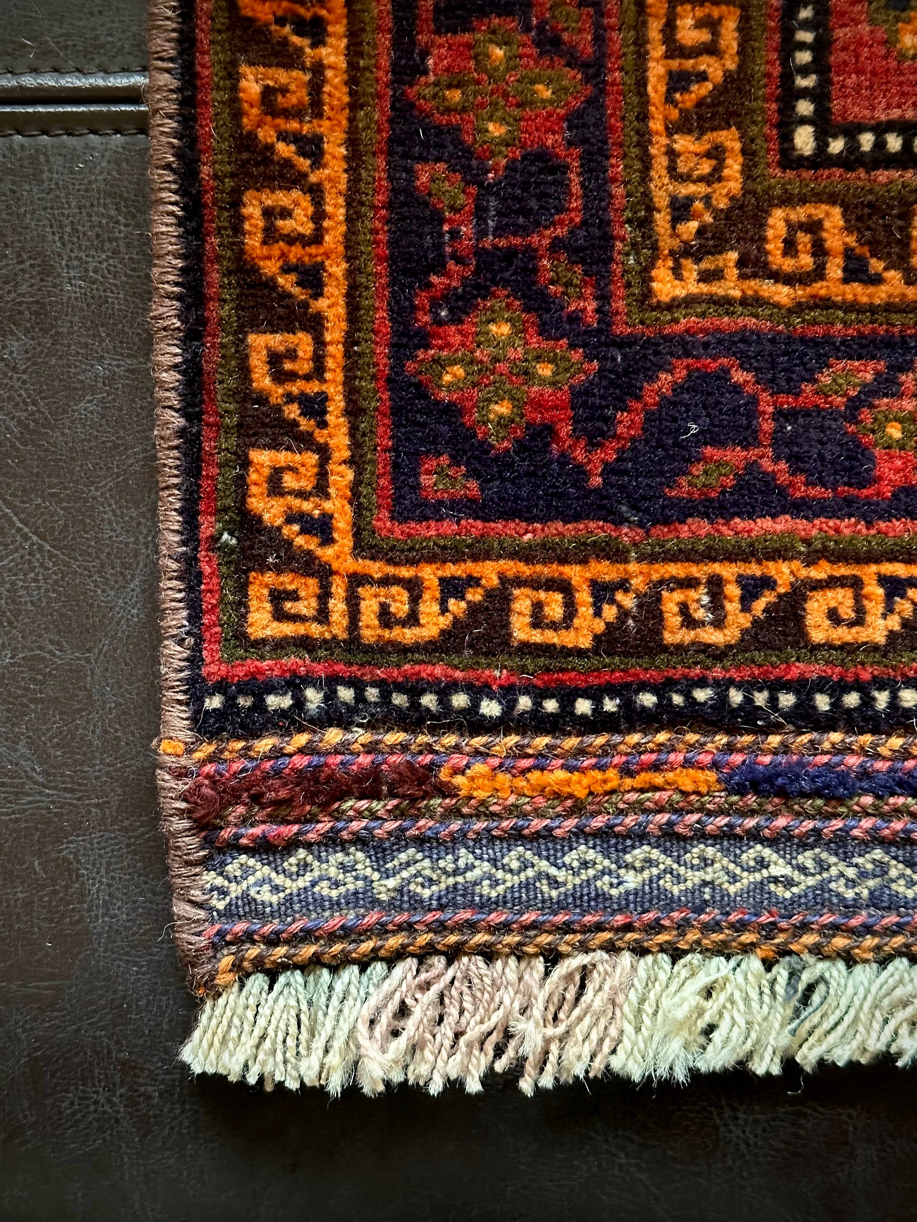 きれいなテラコッタカラーにブラウンやネイビーの色合いではっきりとしたまとまりが見事なこちらは、アフガニスタンはヘラート州にて半遊牧生活を送るマルダリ・バルーチ族のトライバルラグで、元はラクダなどに担がせるホルジンと呼ばれる振り分け用サドルバッグの表皮をラグに仕立て直したモノになります。