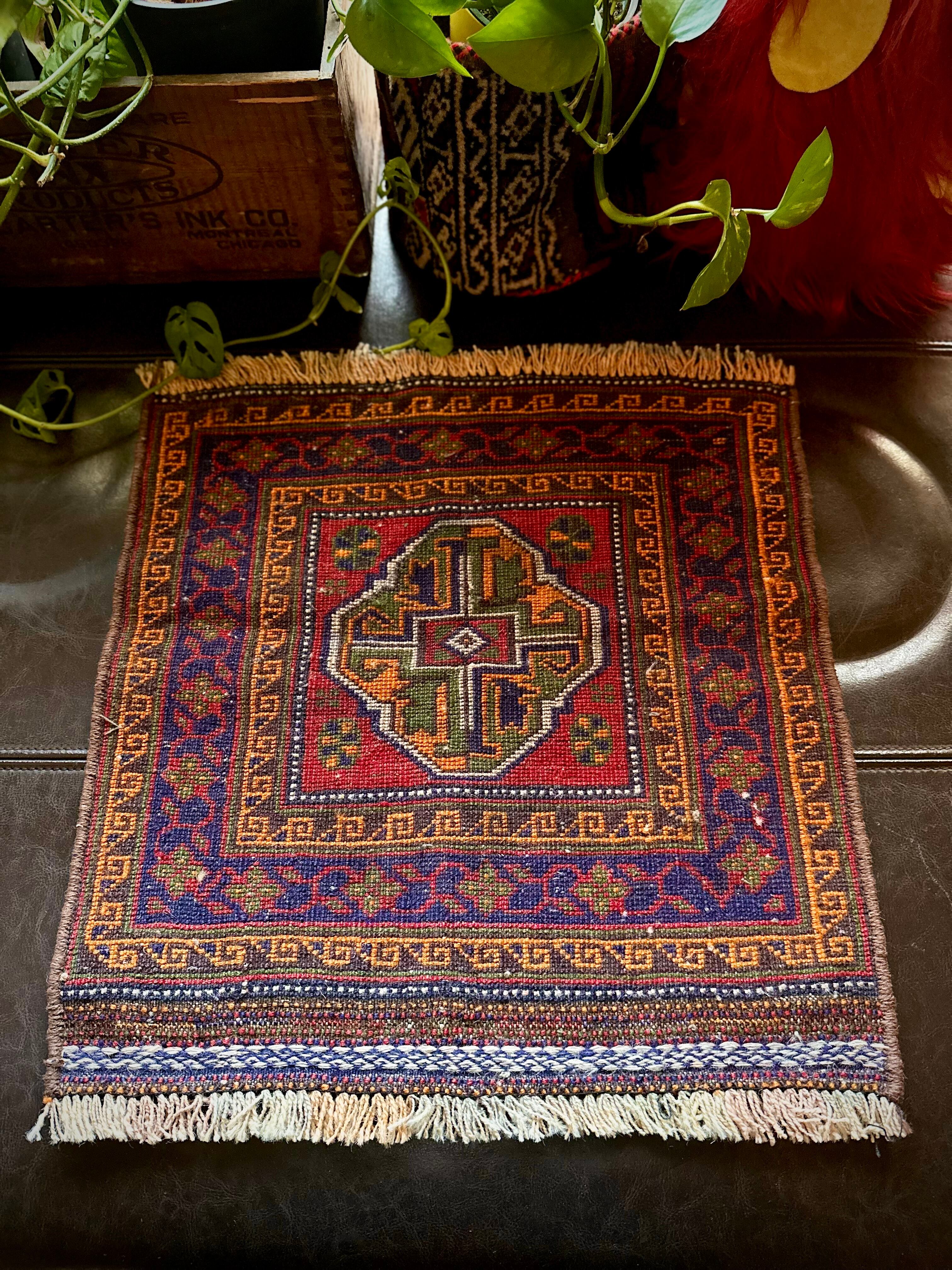 中央にあしらわれたギュル紋様がトライバルらしくてかっこよく、片側のキリムエンドの刺繍も堪りませんわと。パイル自体は短めののサラッとした柔らかな質感の1枚になり、大きさ的にはテーブルに敷いたり鉢置きにぴったりなサイズのミニラグになります。