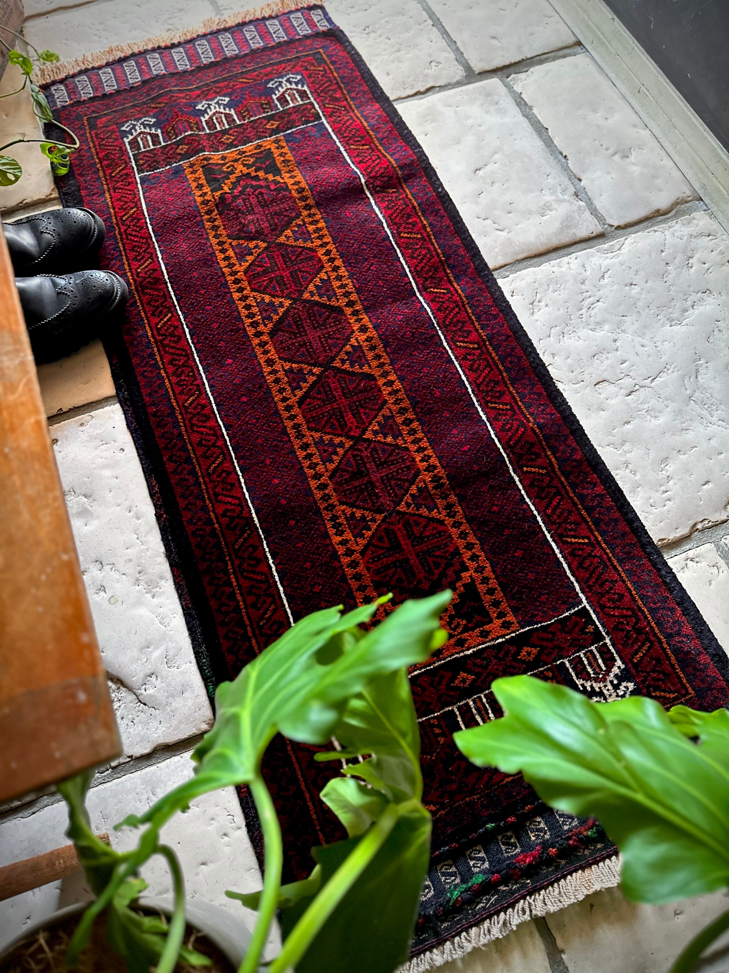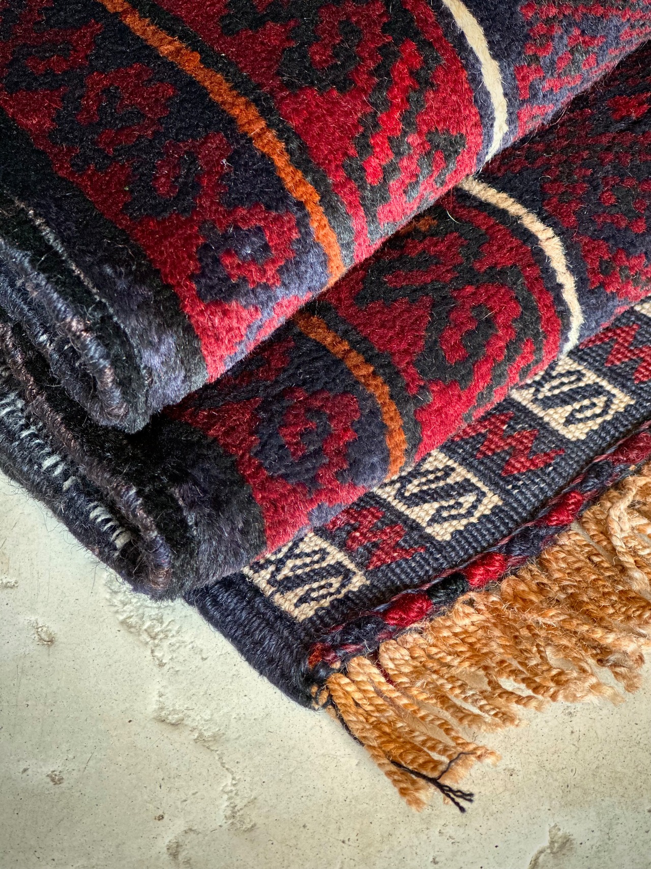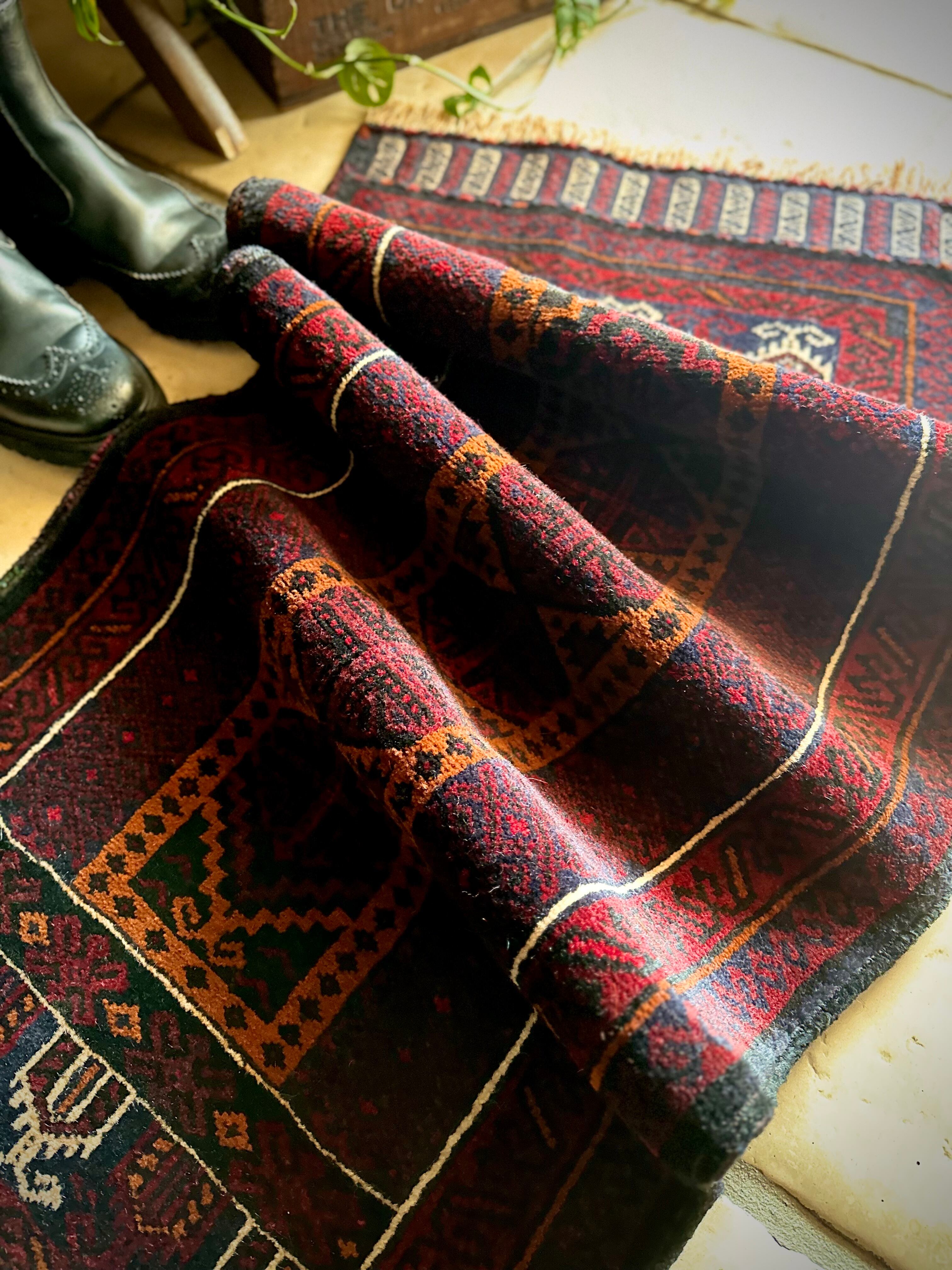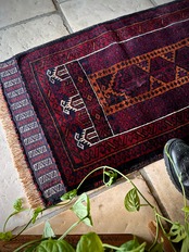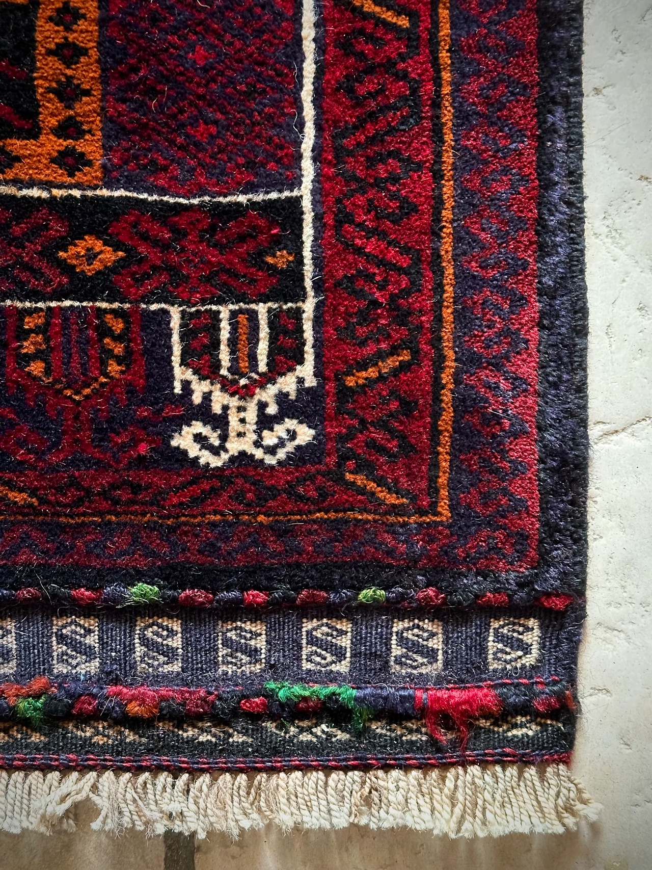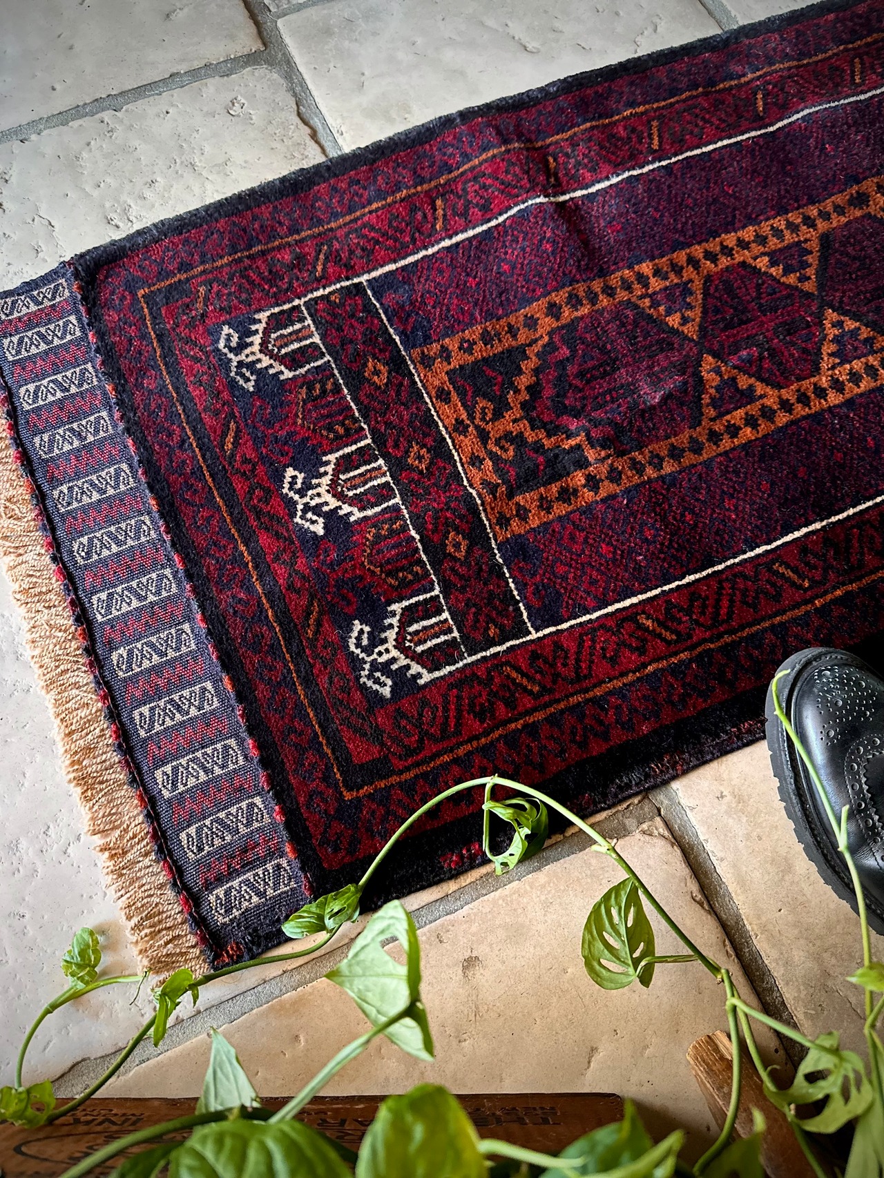 なんとも整った面構えにアダルト感満載なバーガンディとテラコッタの色合いがかっこいいこちらは、アフガニスタンはヘラート州に居住するバルーチ族のトライバルラグで、元は家財道具などを収納するバーリシトと呼ばれる袋状の表皮のみをラグに仕立て直したモノになります。