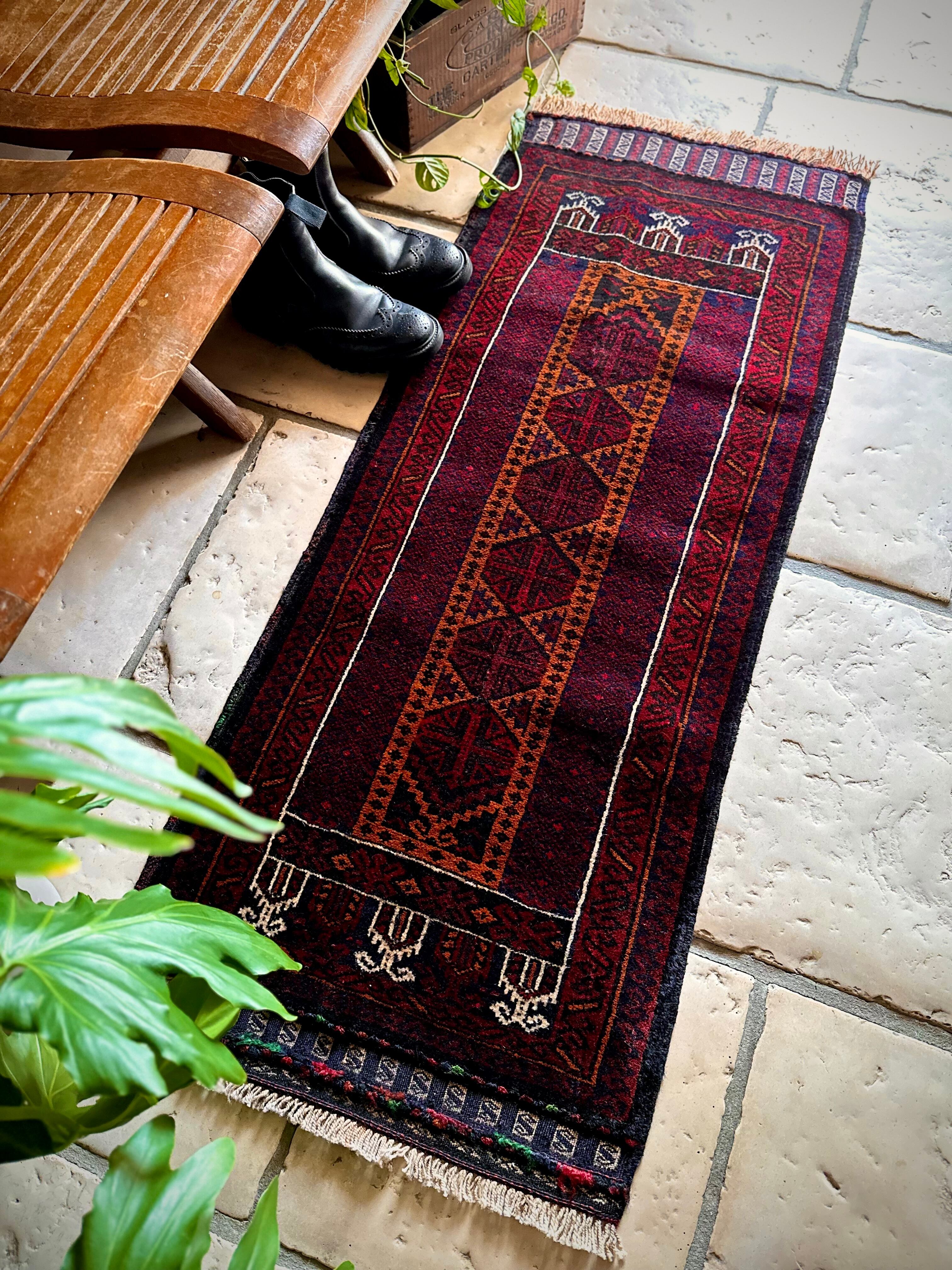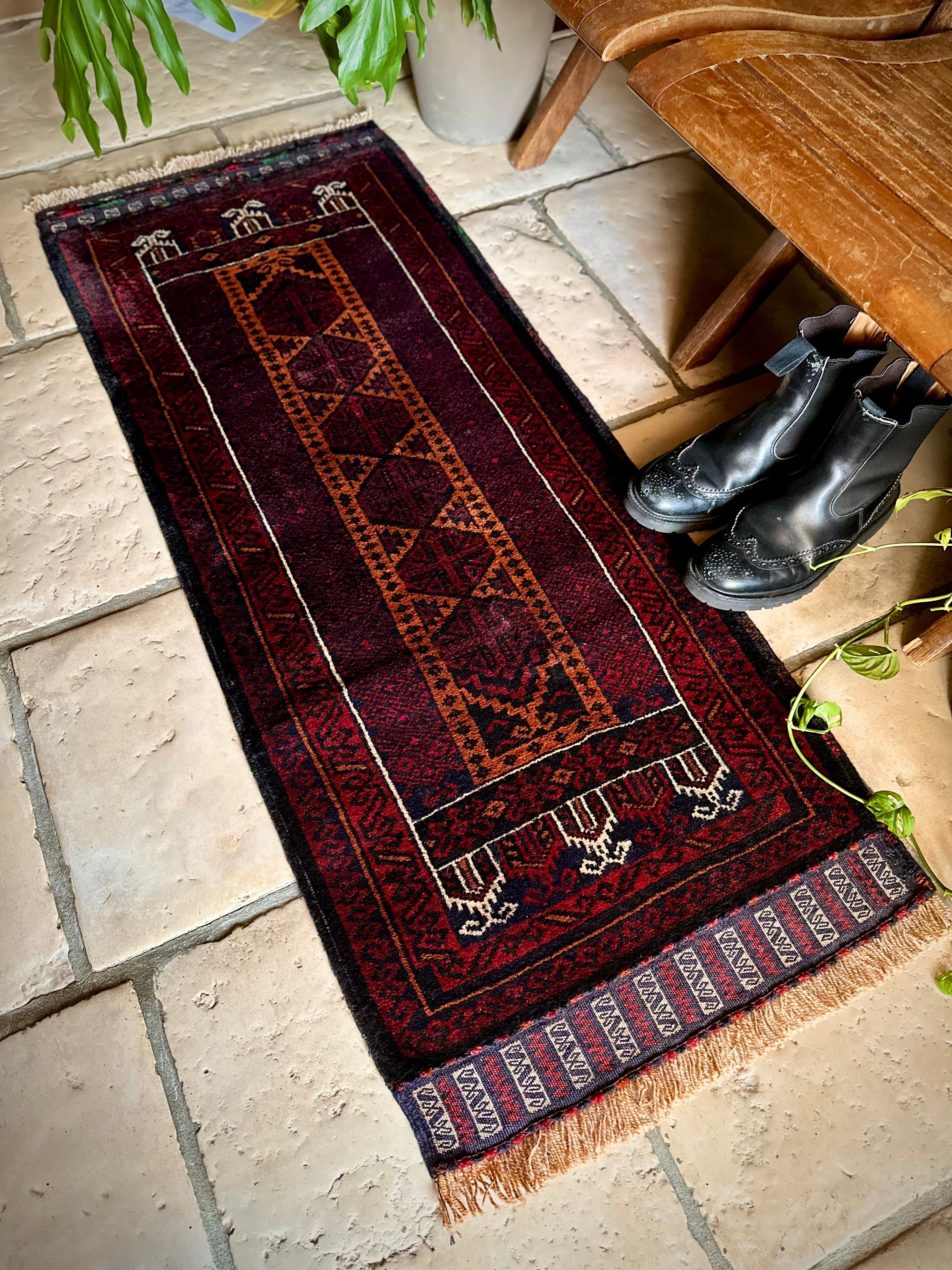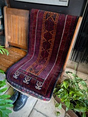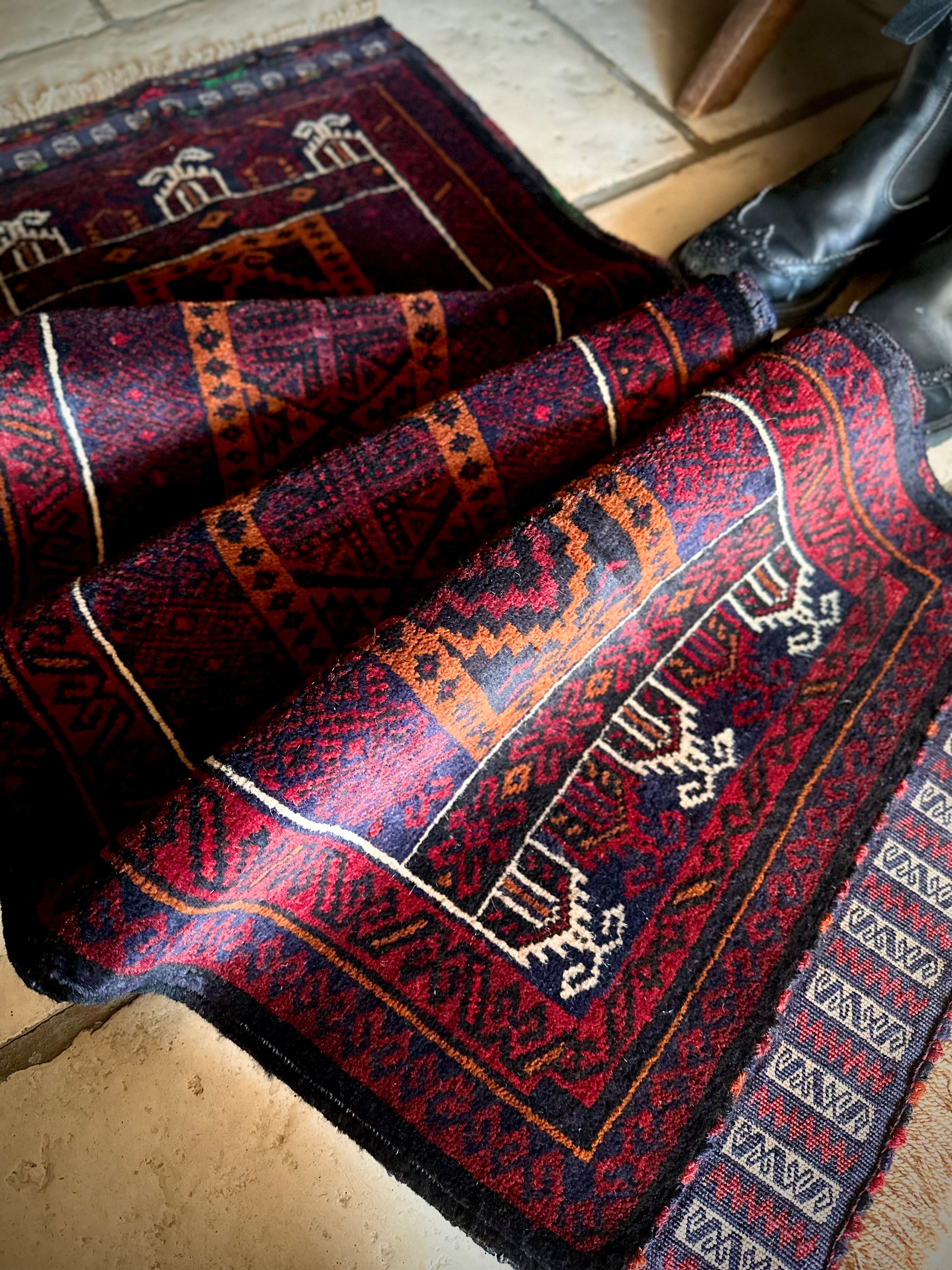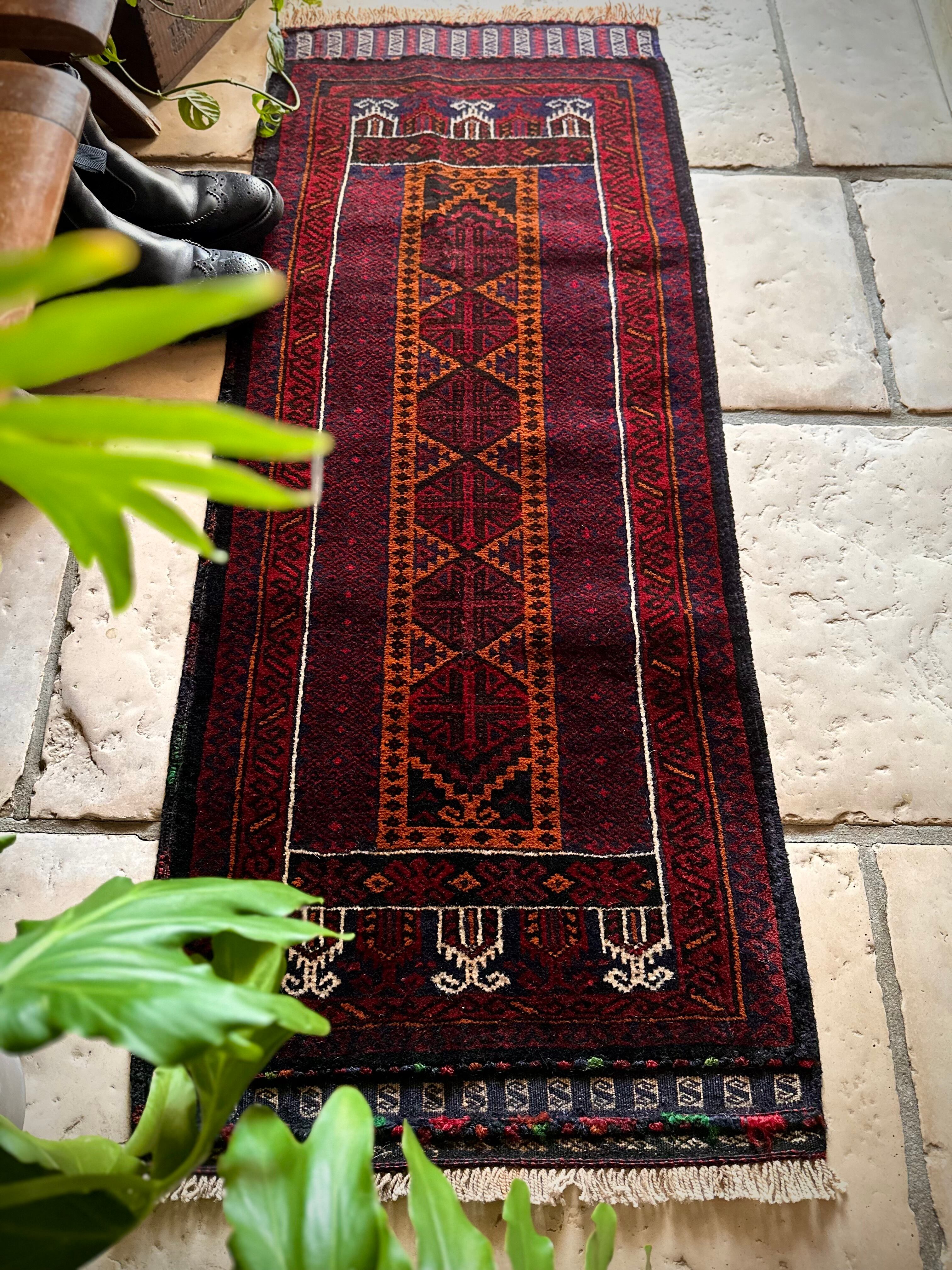 なんとも整った面構えにアダルト感満載なバーガンディとテラコッタの色合いがかっこいいこちらは、アフガニスタンはヘラート州に居住するバルーチ族のトライバルラグで、元は家財道具などを収納するバーリシトと呼ばれる袋状の表皮のみをラグに仕立て直したモノになります。