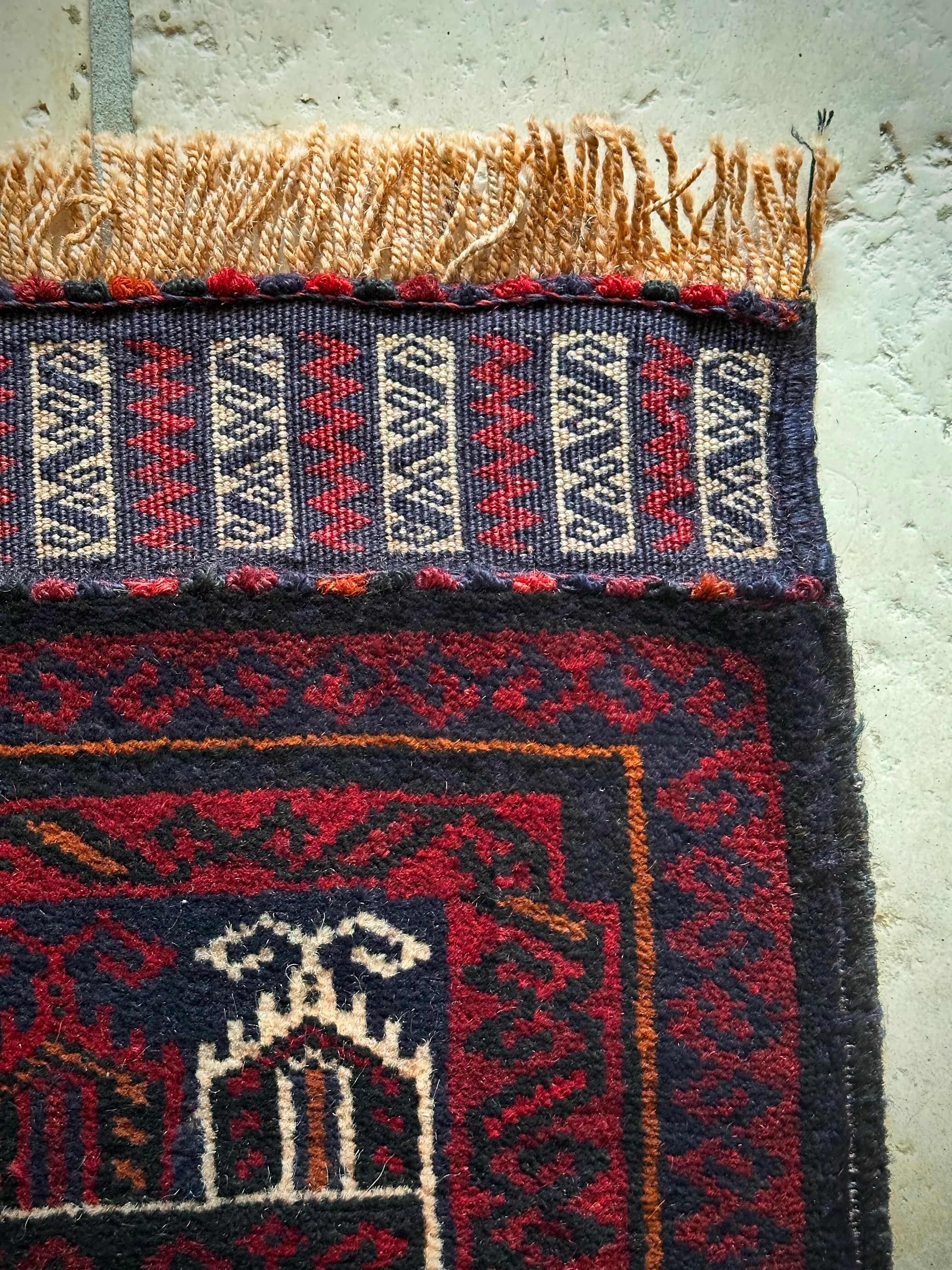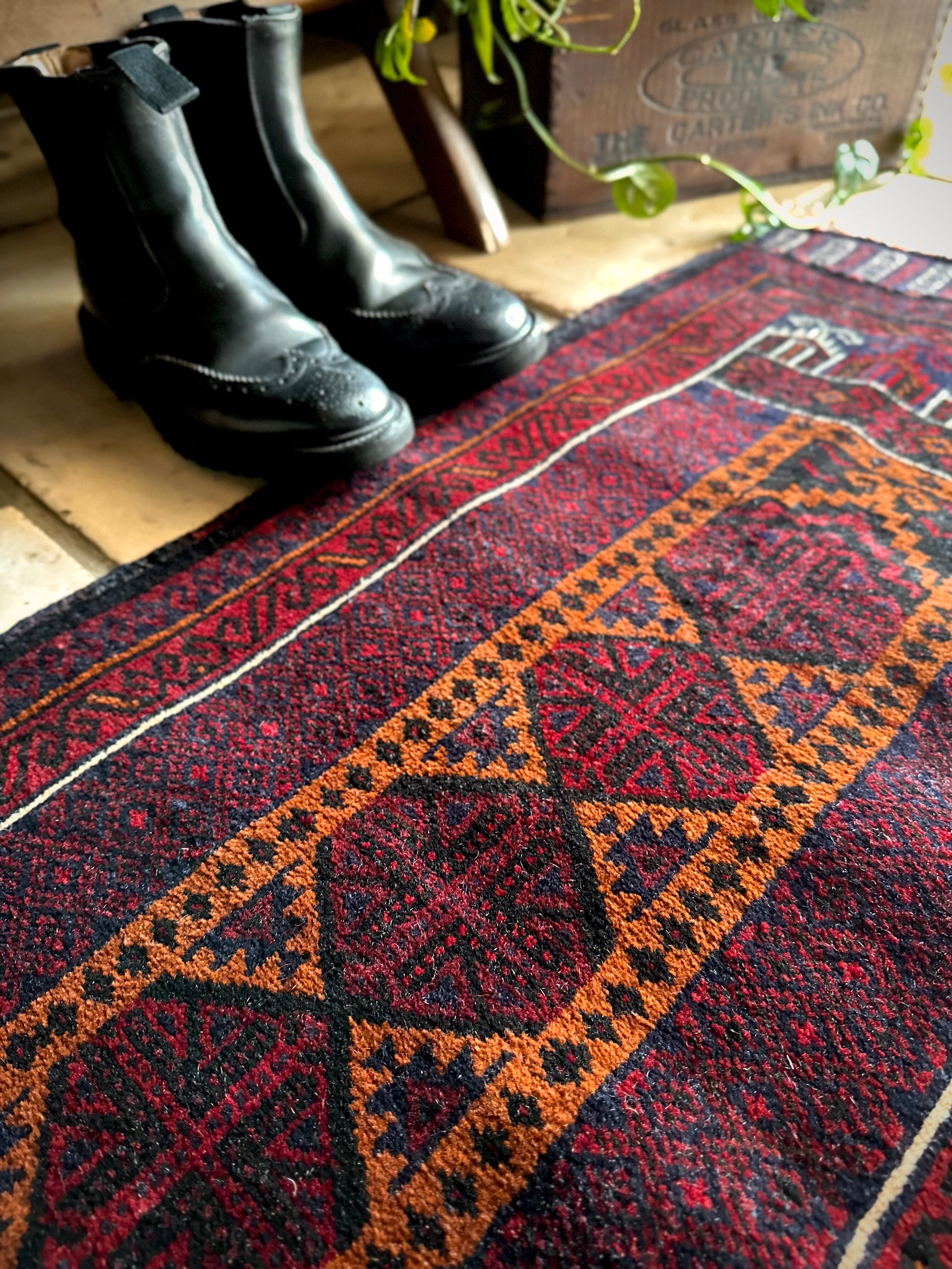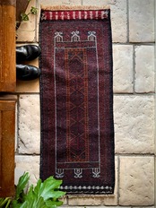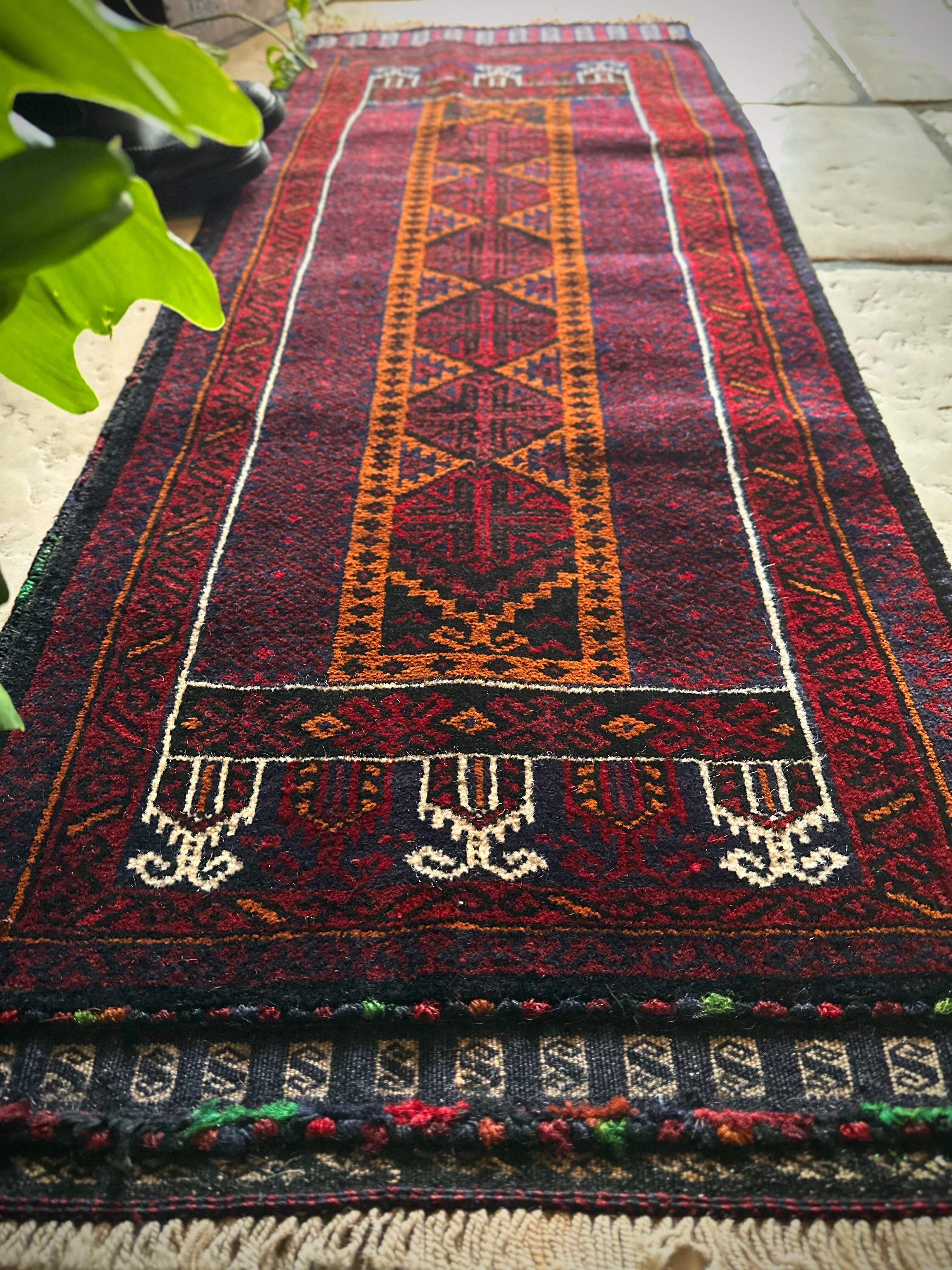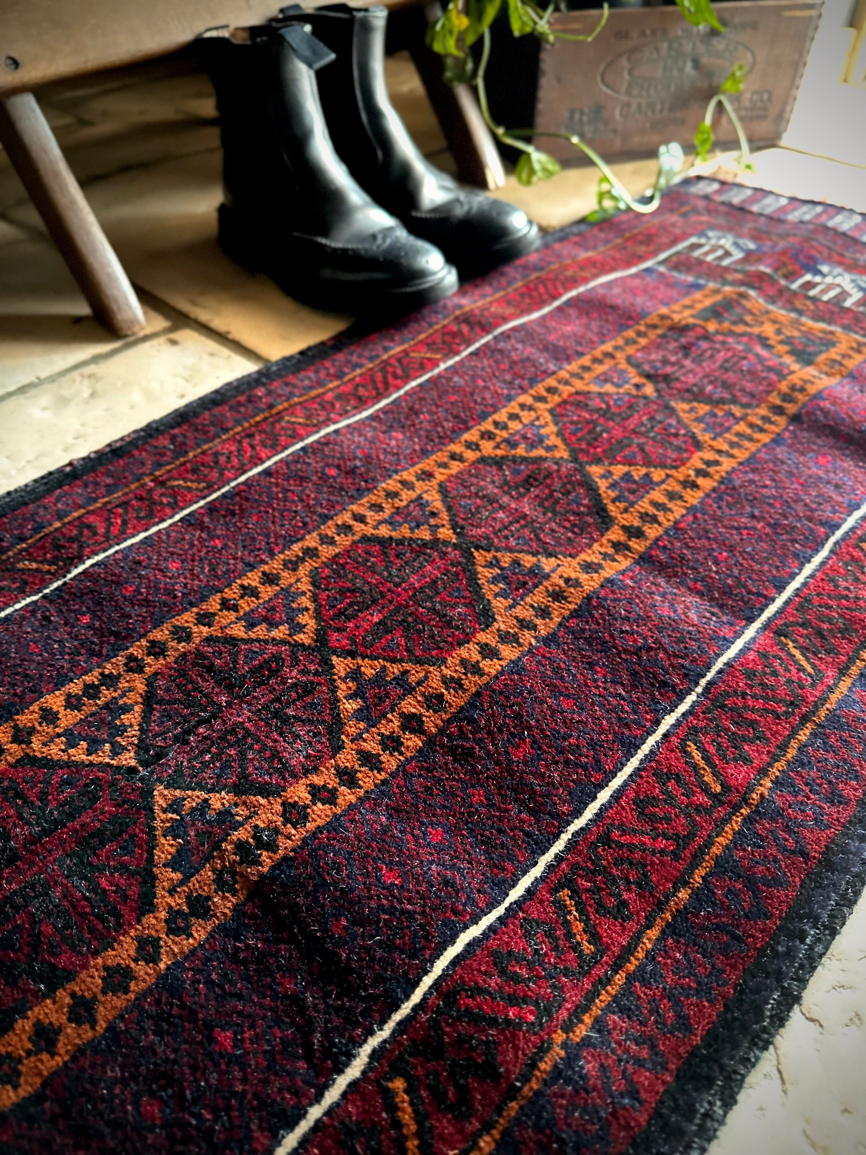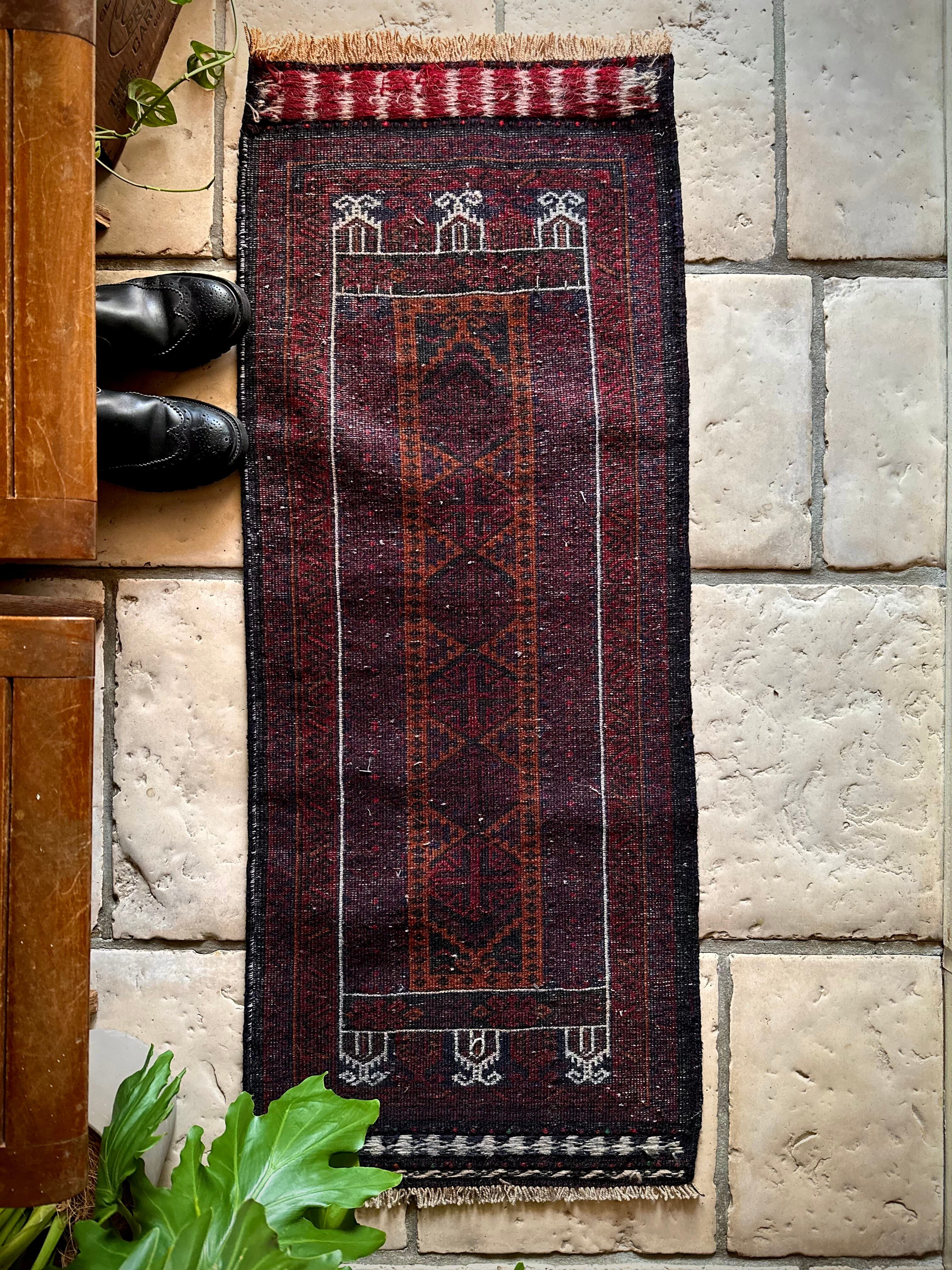 なんとも整った面構えにアダルト感満載なバーガンディとテラコッタの色合いがかっこいいこちらは、アフガニスタンはヘラート州に居住するバルーチ族のトライバルラグで、元は家財道具などを収納するバーリシトと呼ばれる袋状の表皮のみをラグに仕立て直したモノになります。