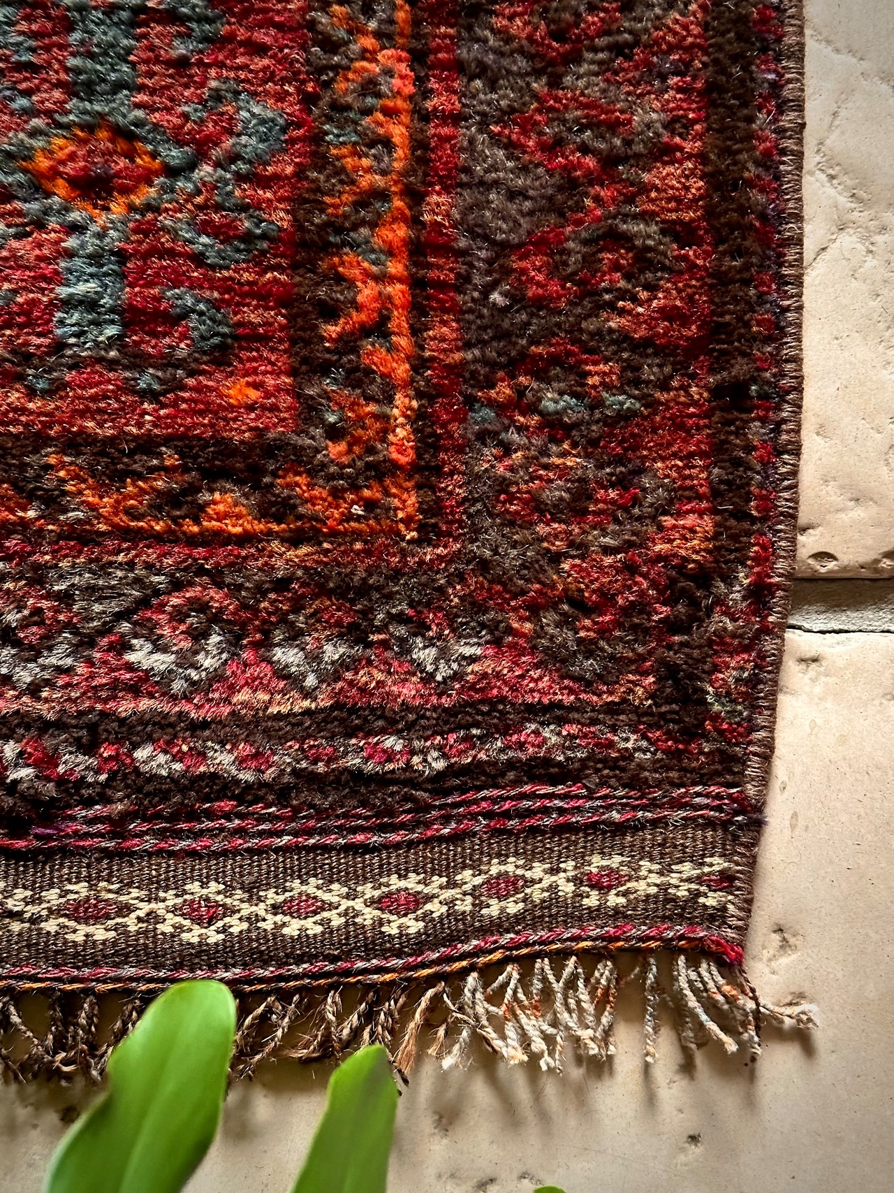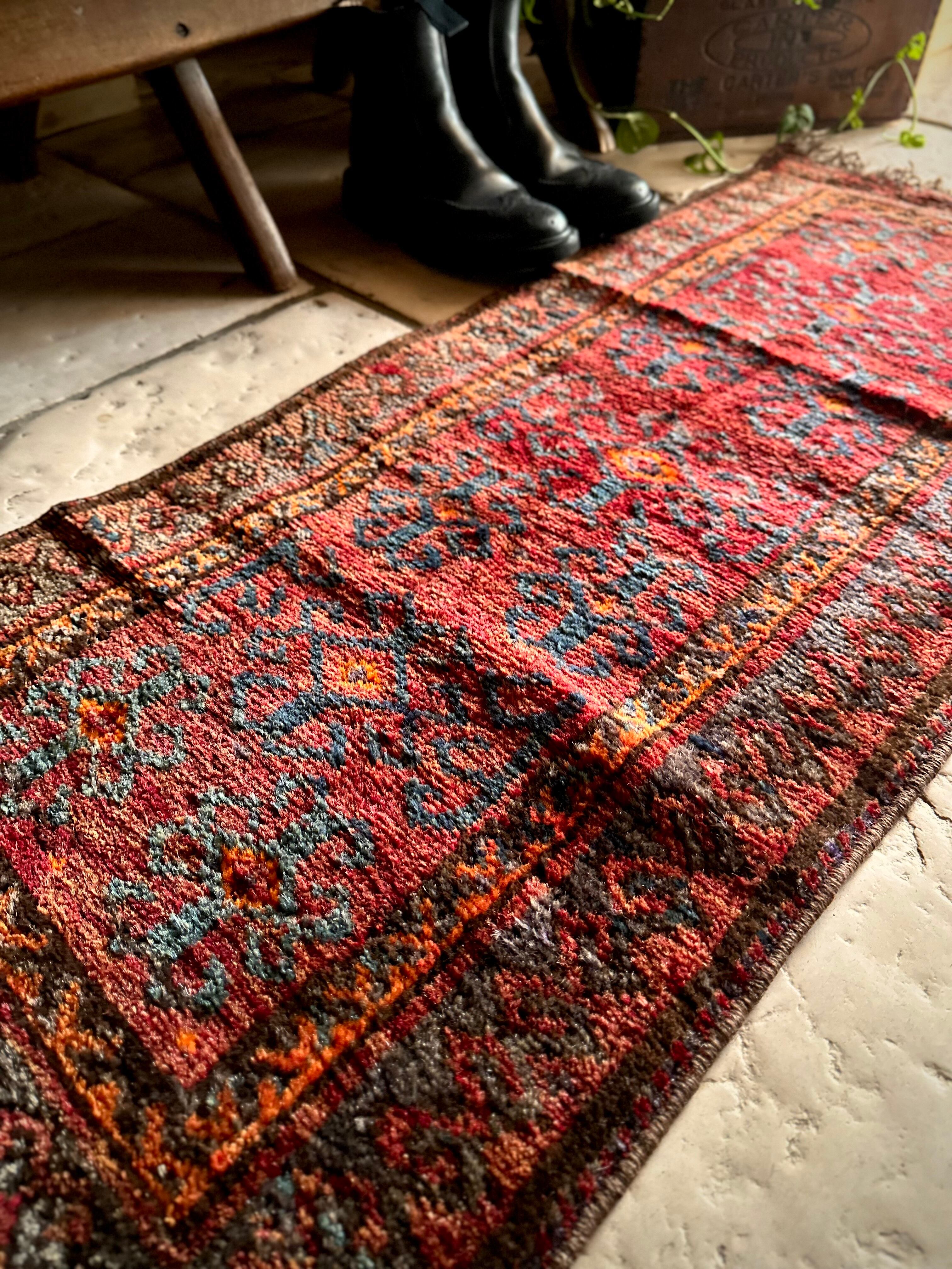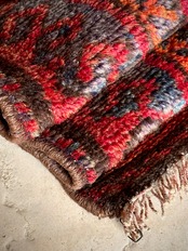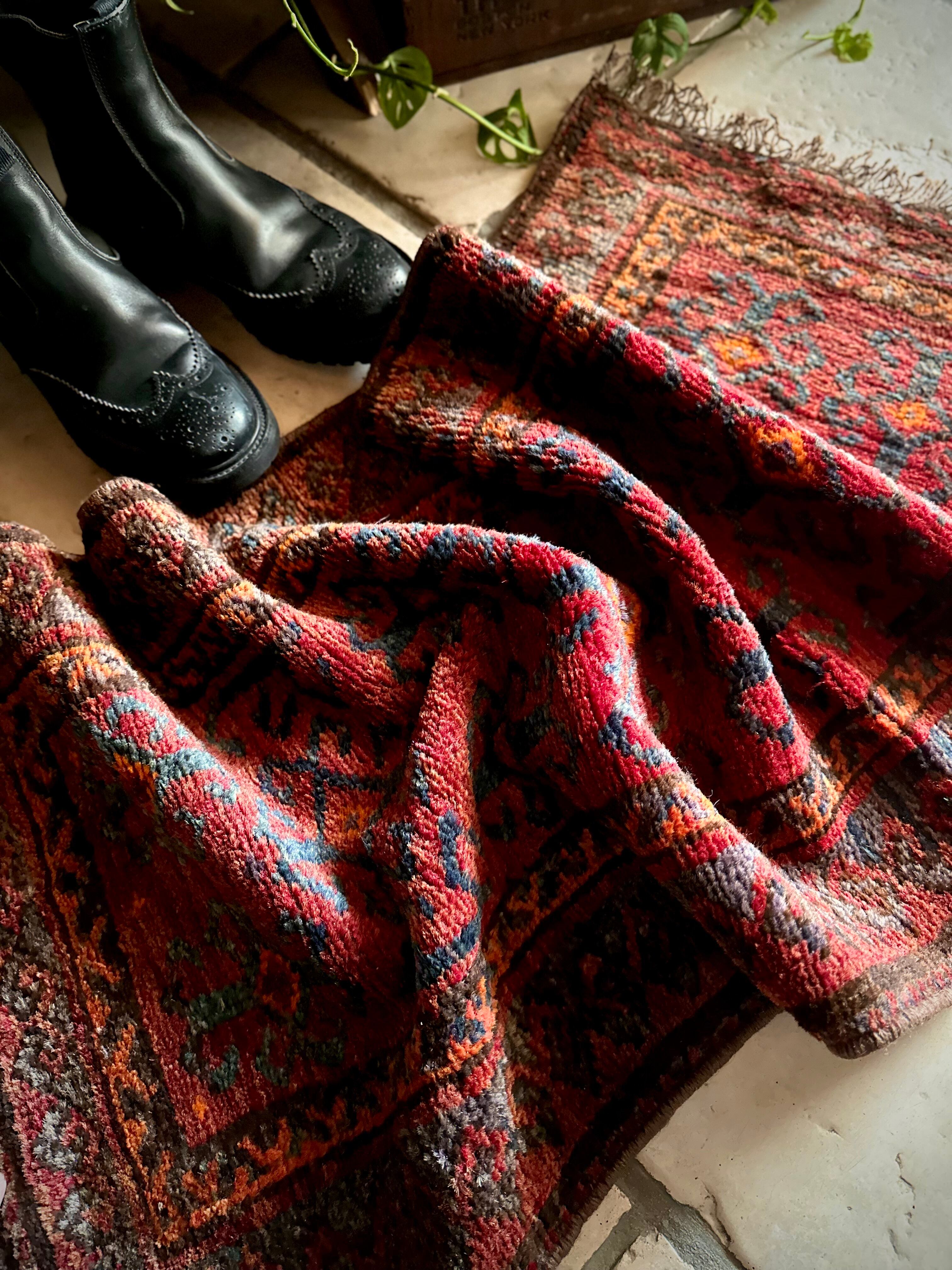 最後にラグそのものに関しては羊毛特有の匂いがあり、採寸は中央付近で計測していますが、手織りならではの歪みによる誤差や水洗いクリーニングによる縮み、また草木染めによる経年劣化の色ムラなどがありますが、それもまたヴィンテージラグの魅力かとご理解ください。