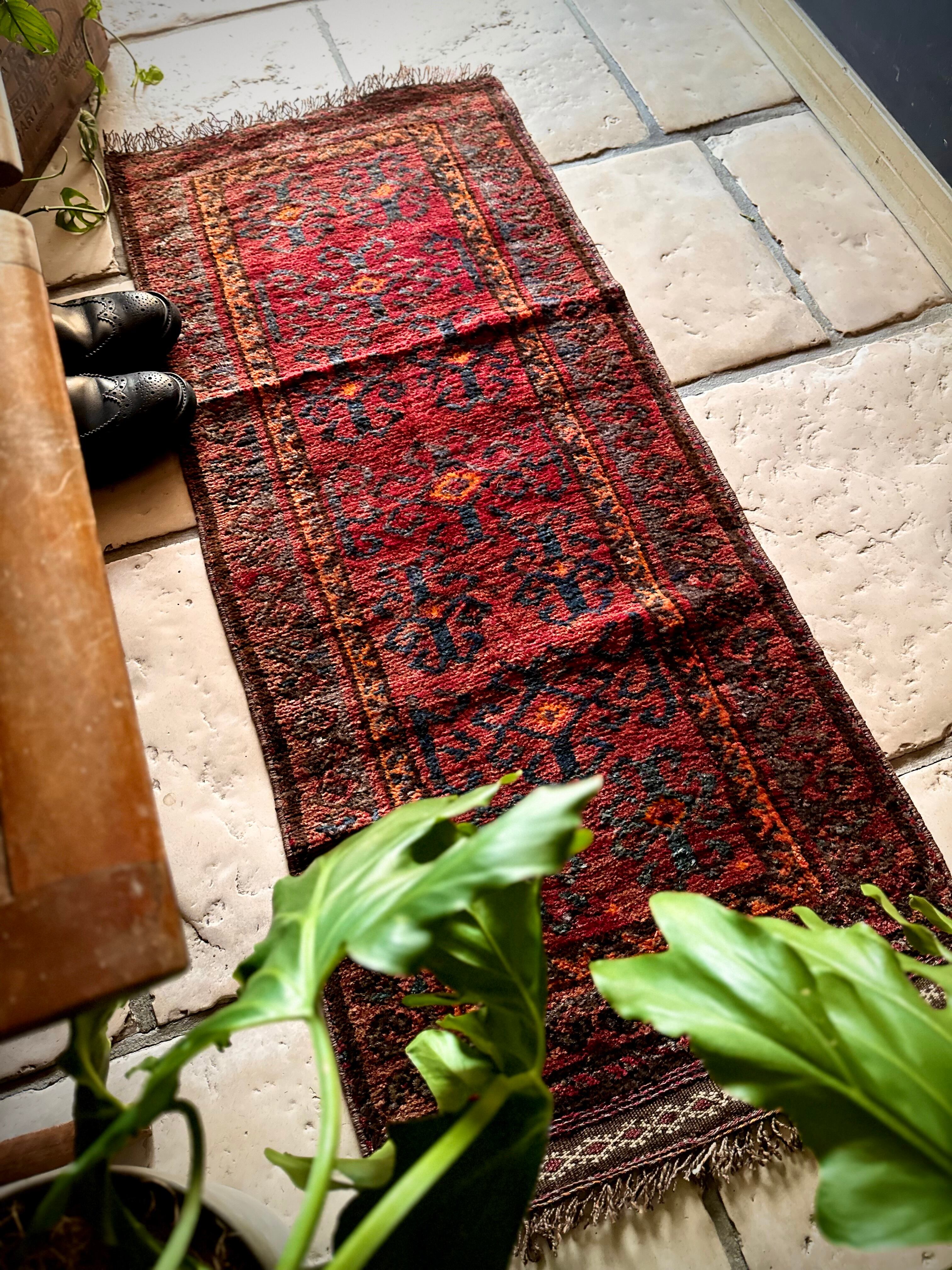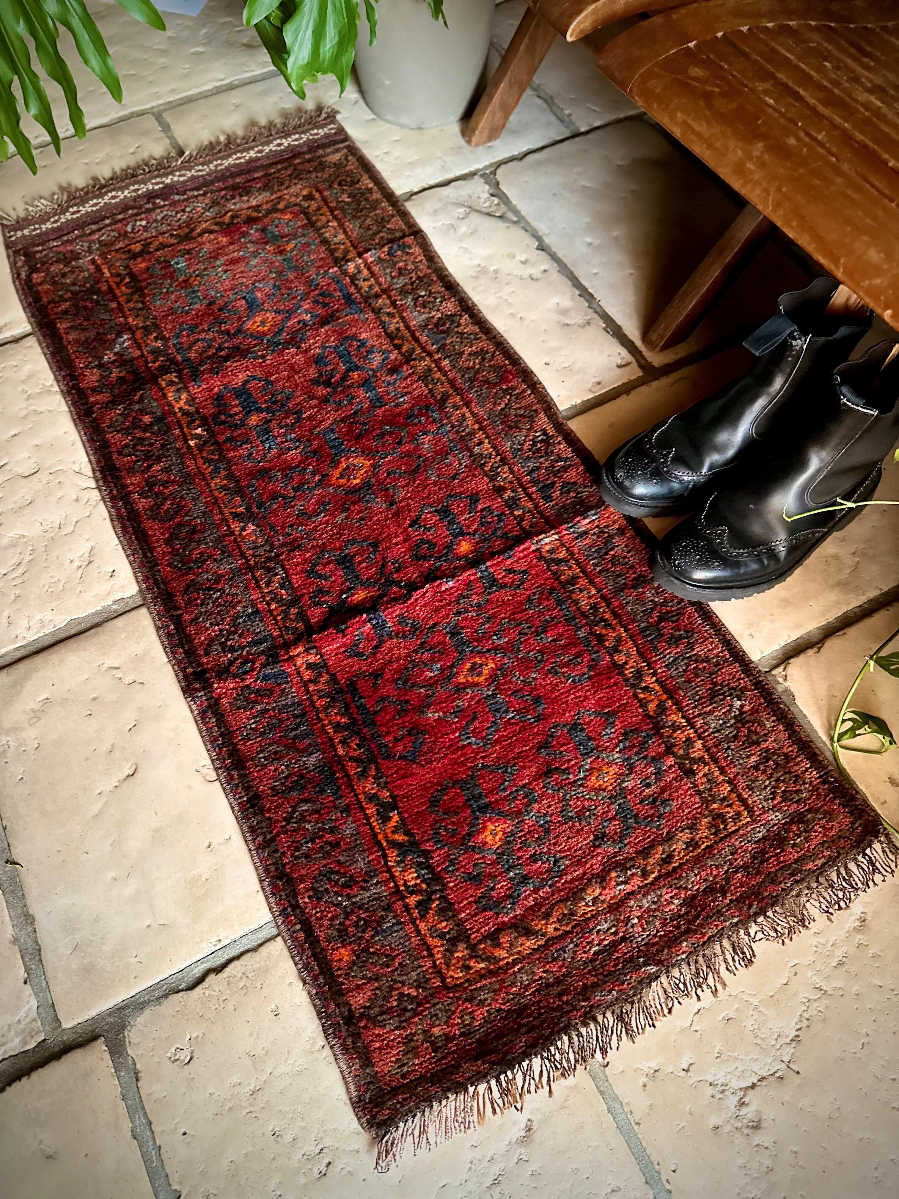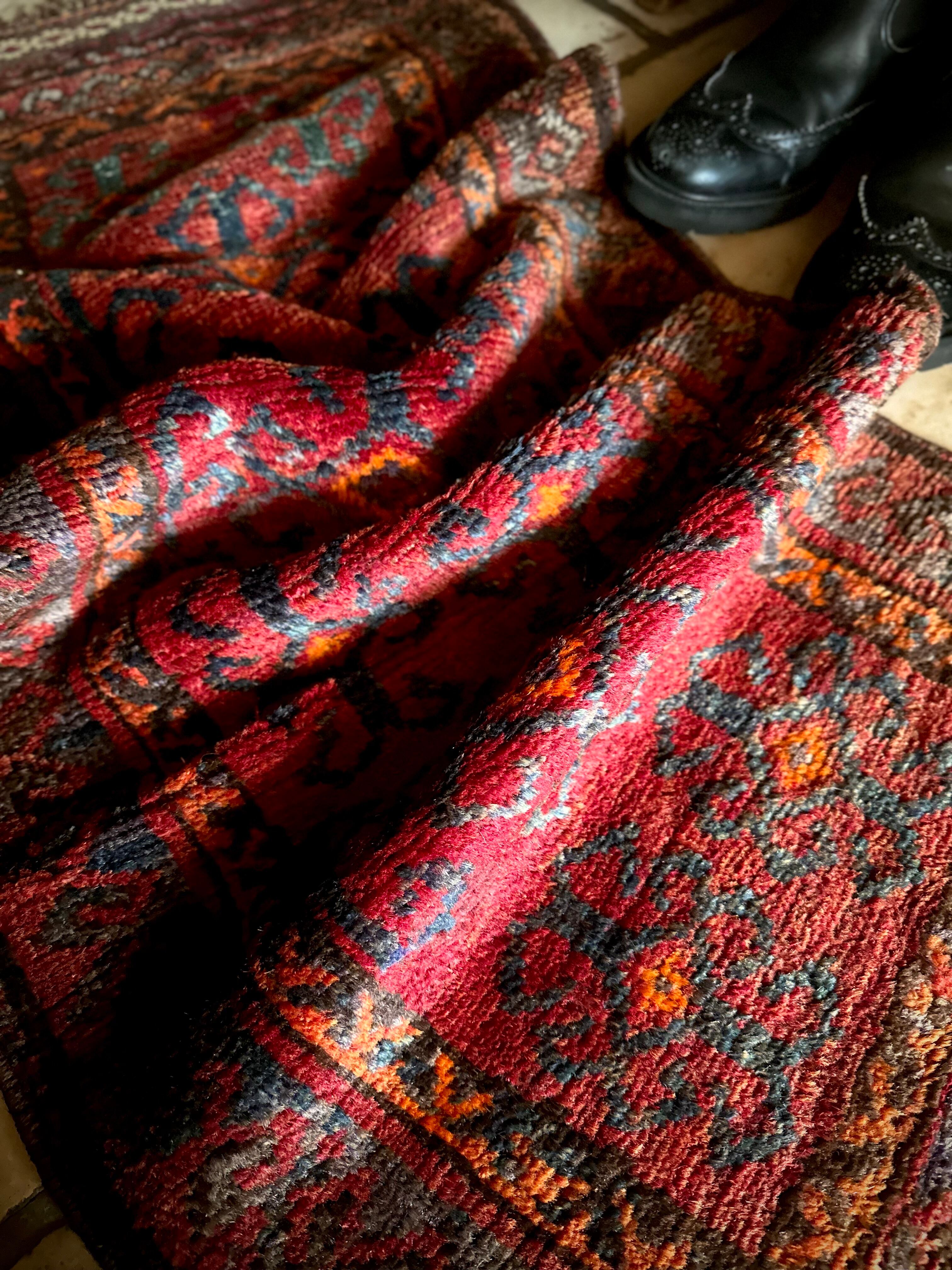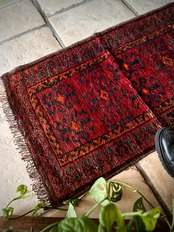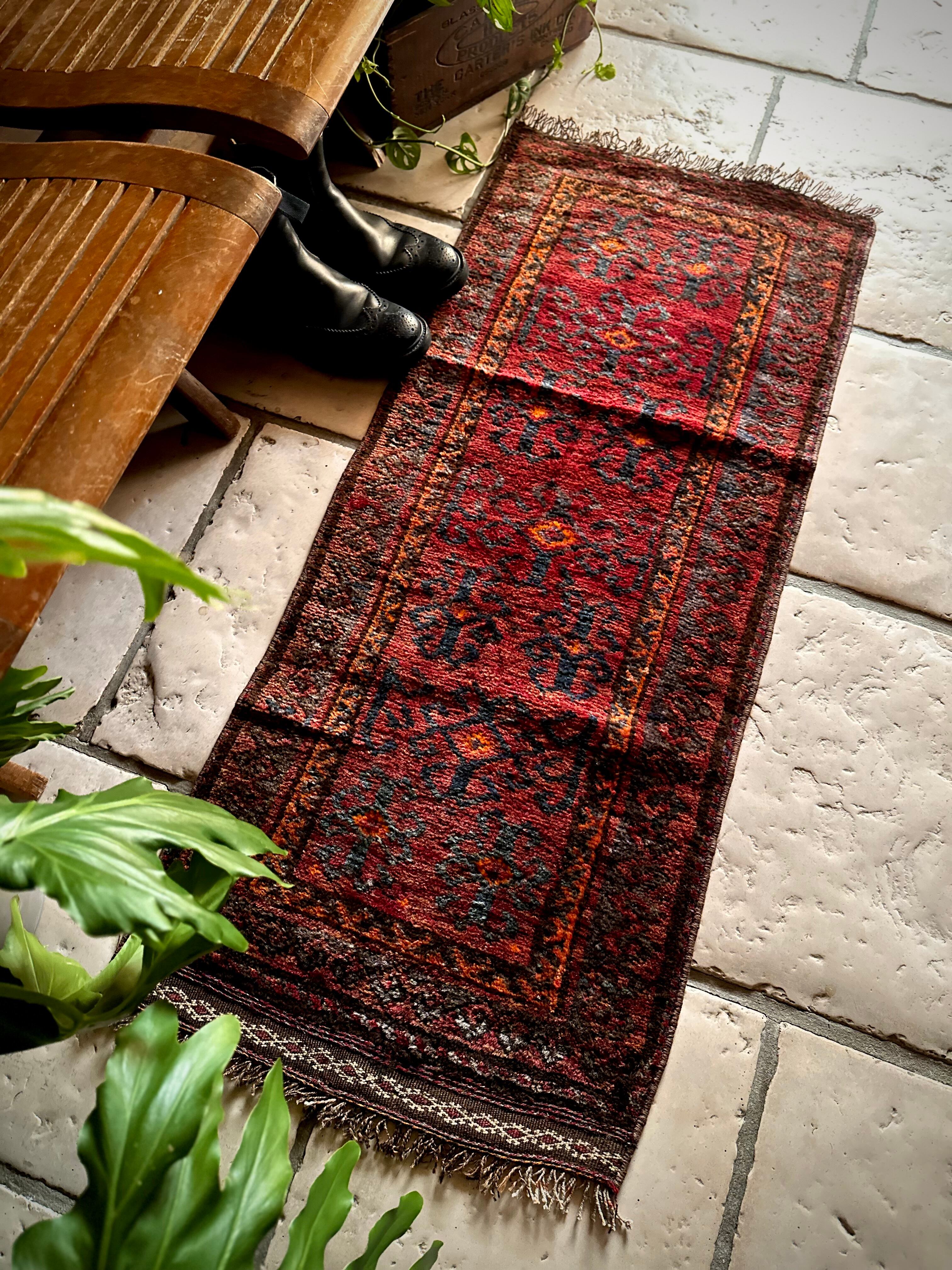 その細長い形状から元は家財道具の収納やクッションとして使われるバーリシトと呼ばれる袋状の表皮をラグに仕立て直したモノになりますが、ソファの座面に敷いたり壁に飾ったり、もちろん床敷きとしても充分な厚みがあるアクセントラグになります。