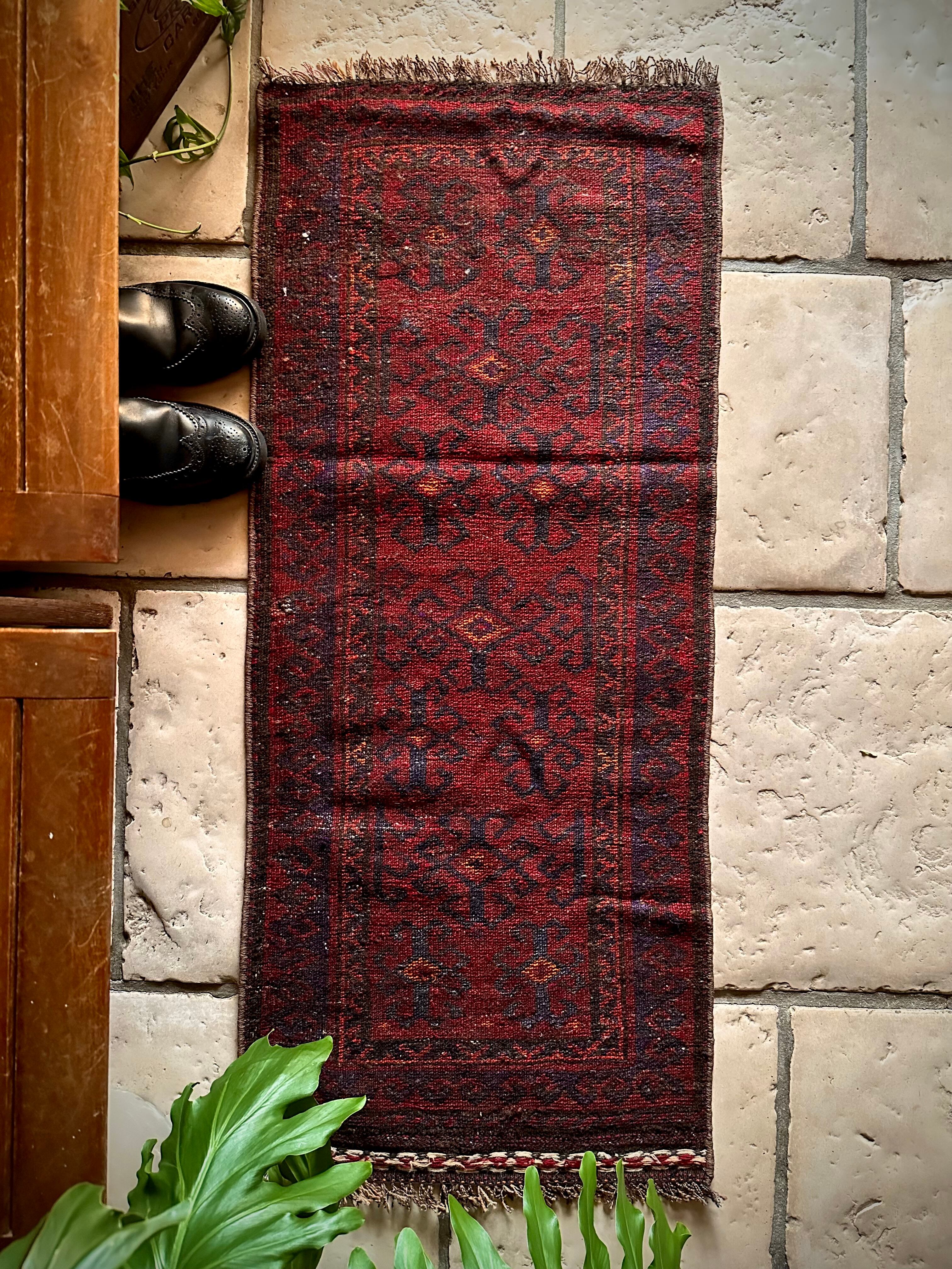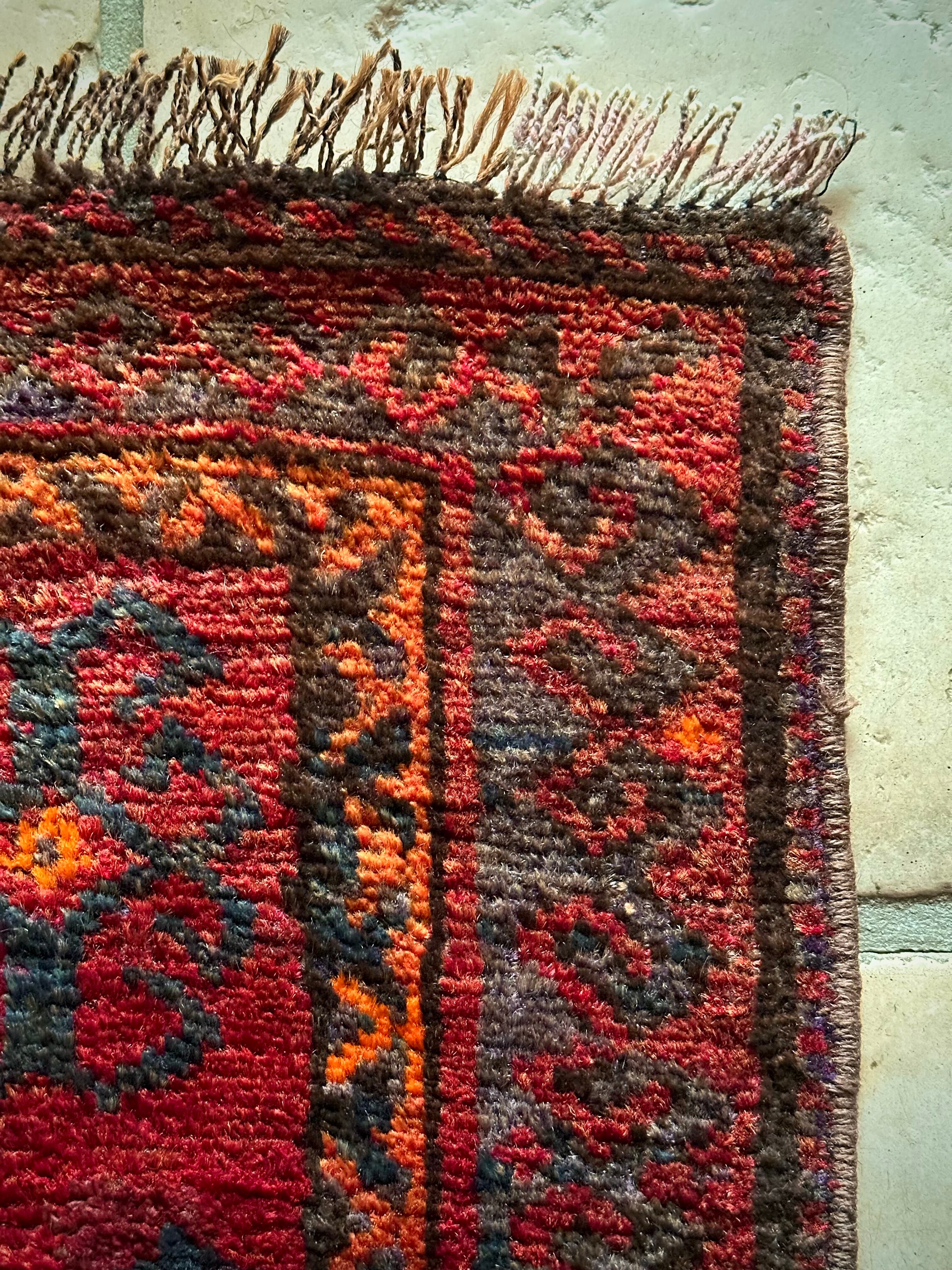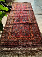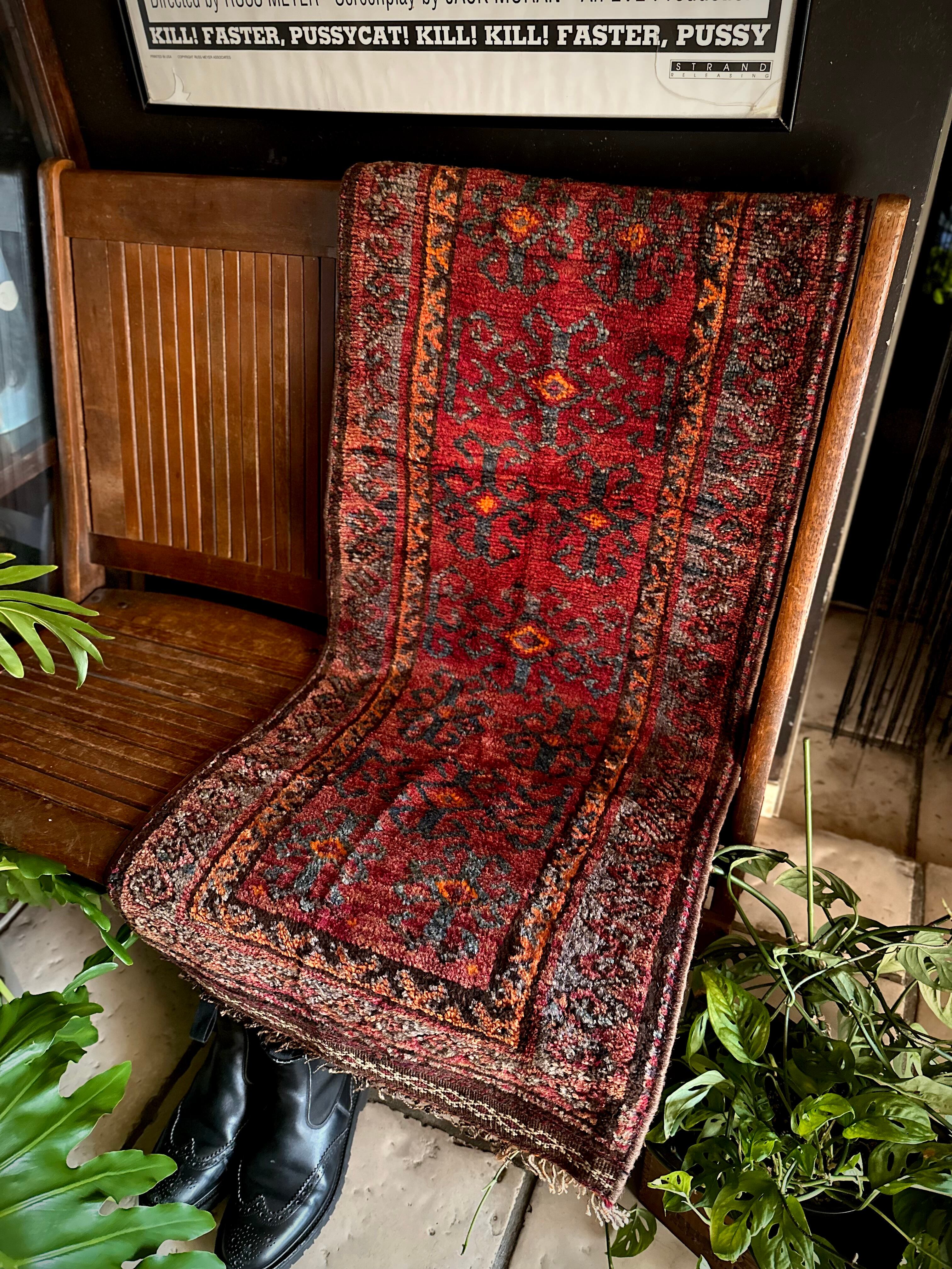 色褪せた深みのあるボルドーにグレーがかったブラックの紋様、そしてボーダーのテラコッタが全体的にプリミティブな雰囲気を漂わせているこちらは、アフガニスタンはヘラート州に居住するバルーチ族のトライバルラグになります。