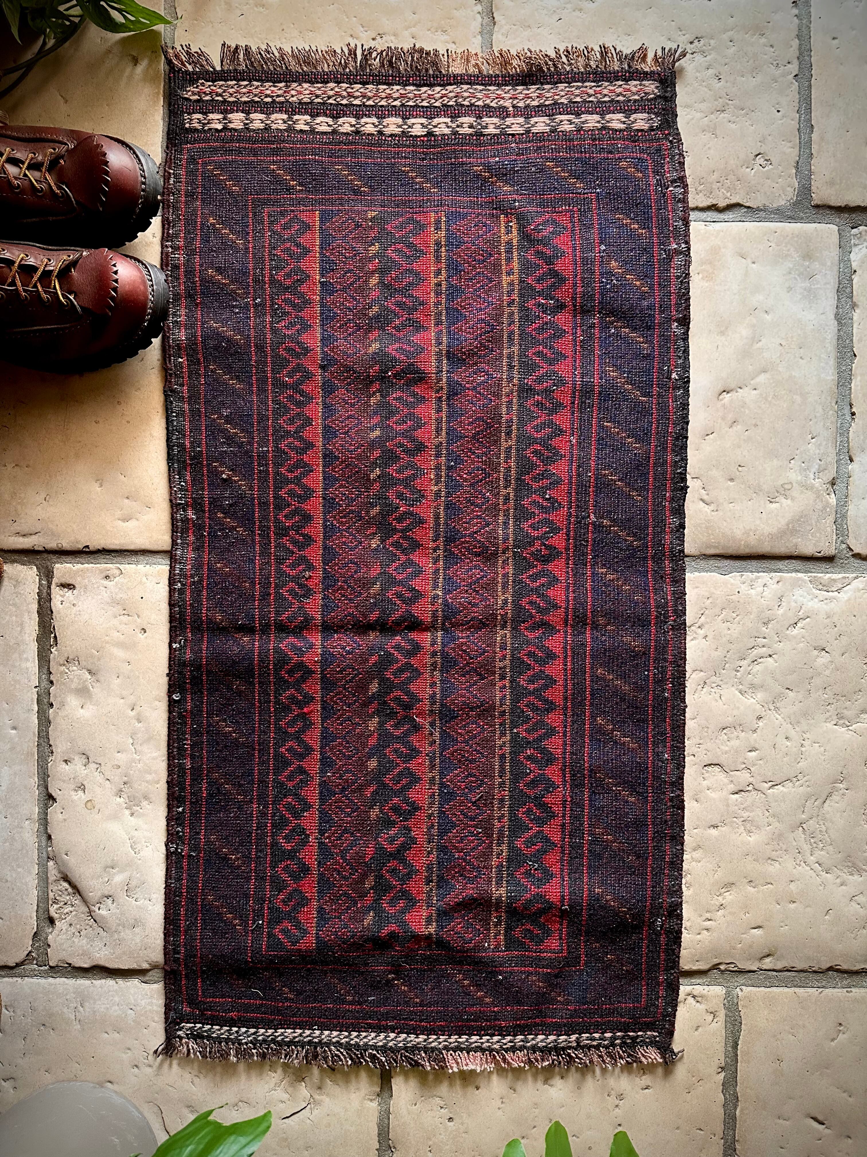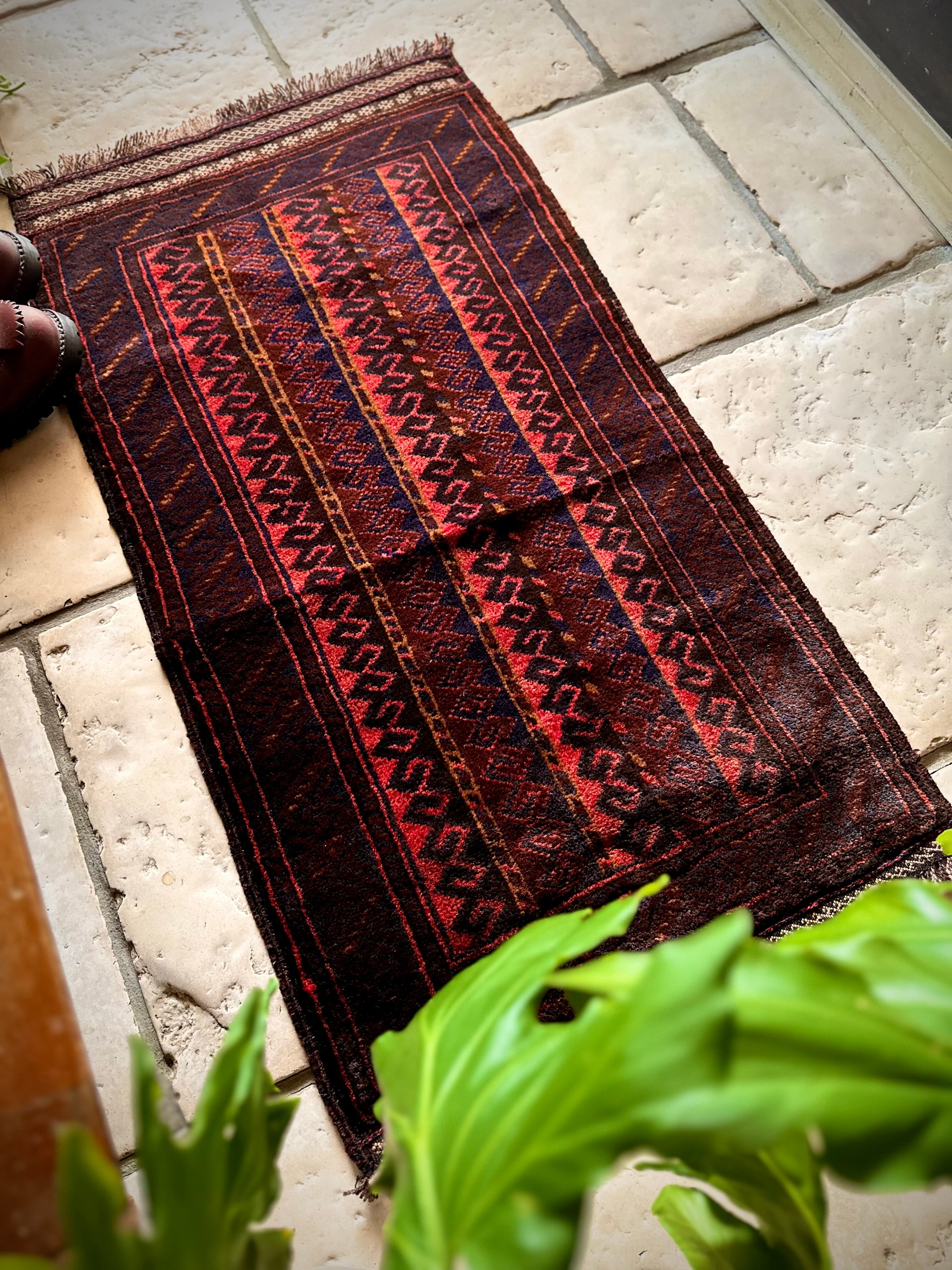 赤を際立たせる為にブラックとネイビー、またバーガンディにブラウンとあえてダークなトーンで配色されたこちらは、アフガニスタンはヘラート州に居住するバルーチ族のトライバルラグで、元は家財道具などを収納するバーリシトと呼ばれる袋状の表皮をラグに仕立て直したモノになります。