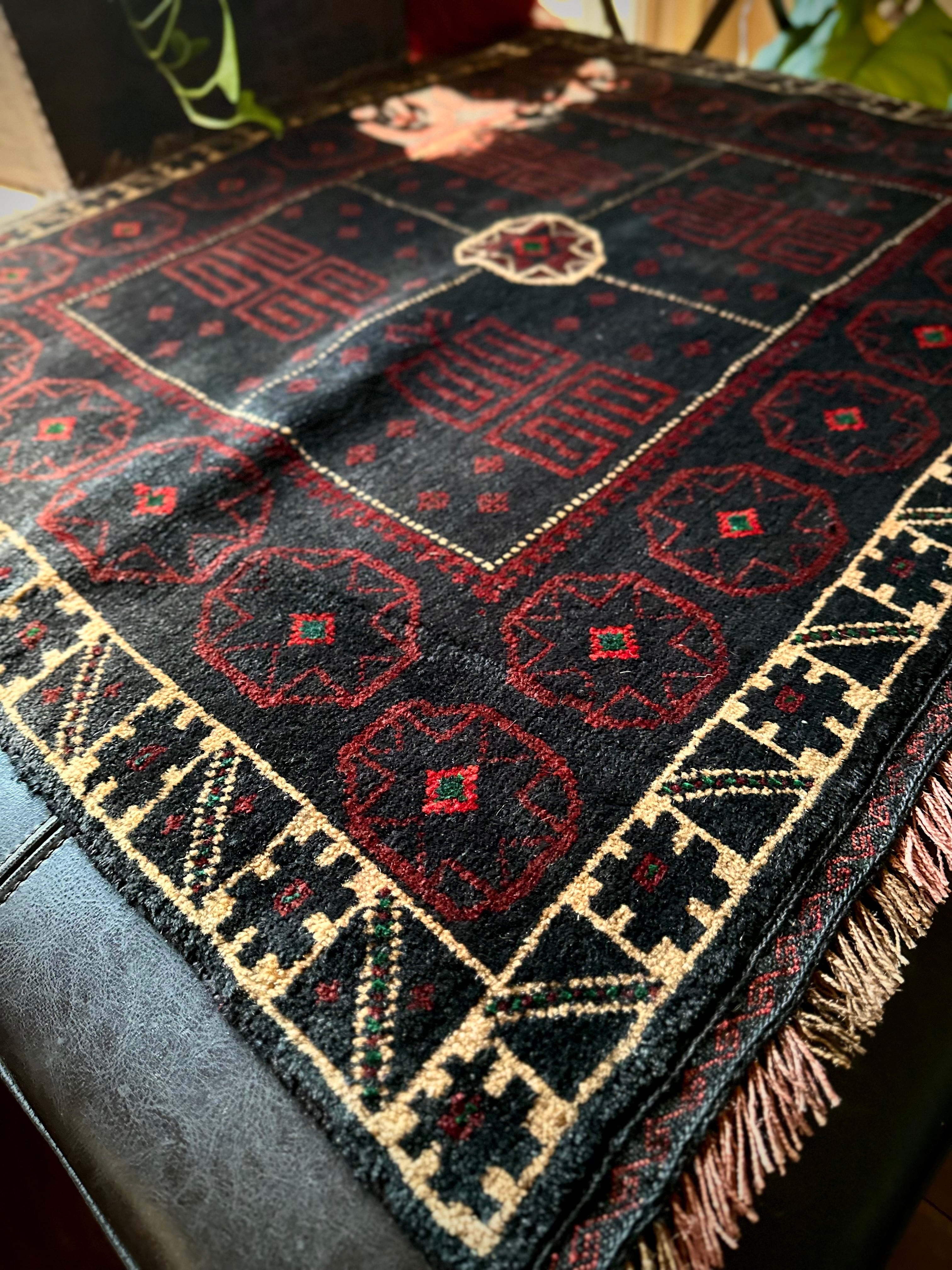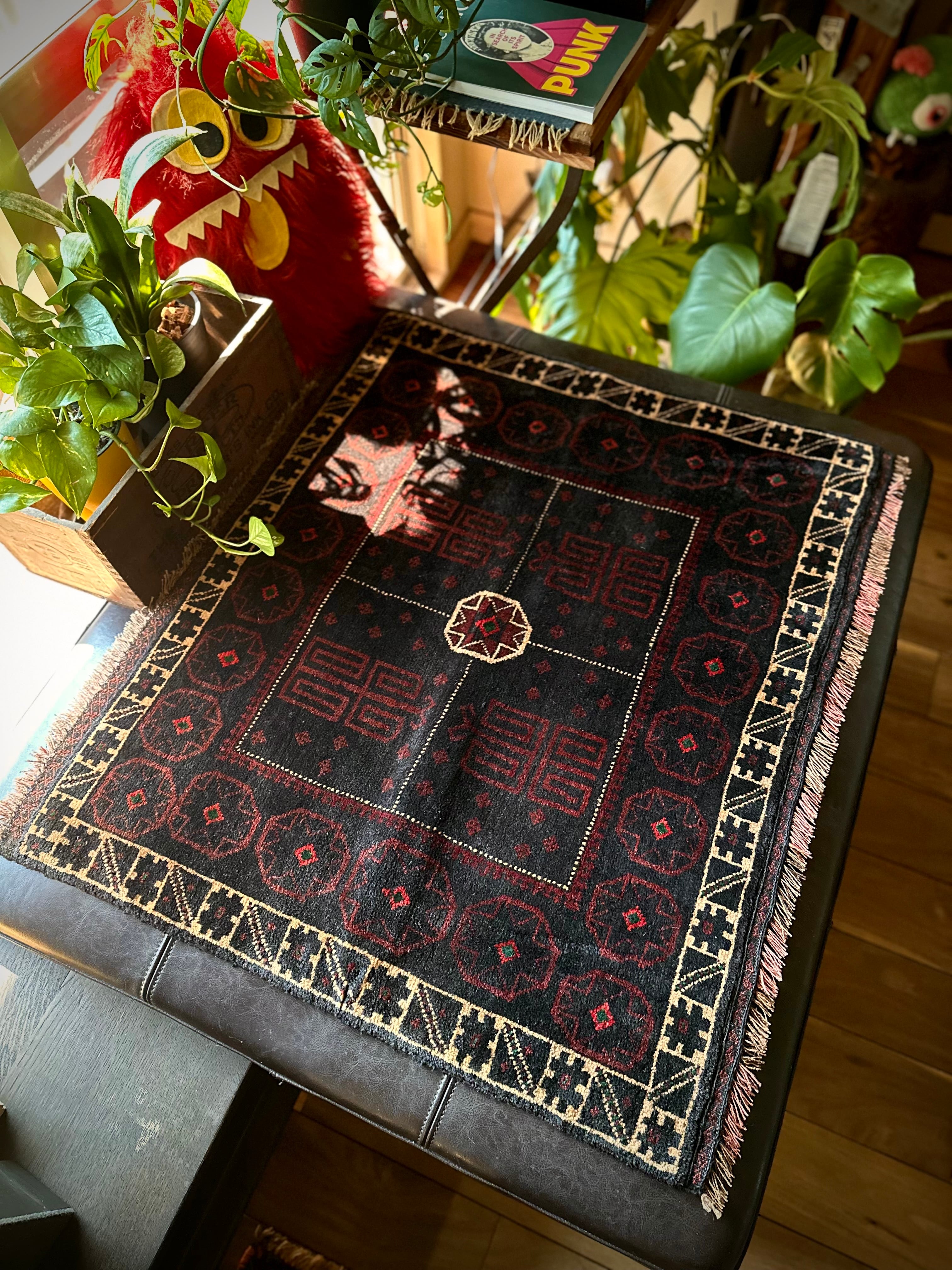 漆黒のブラックベースにダークトーンなバーガンディで描かれたギュル紋様、そこに浮かび上がるホワイトラインが暗闇に光るダイヤモンドという呼び名で表現されるこちらは、アフガニスタンはヘラート州に居住するバルーチ族のトライバルラグになります。