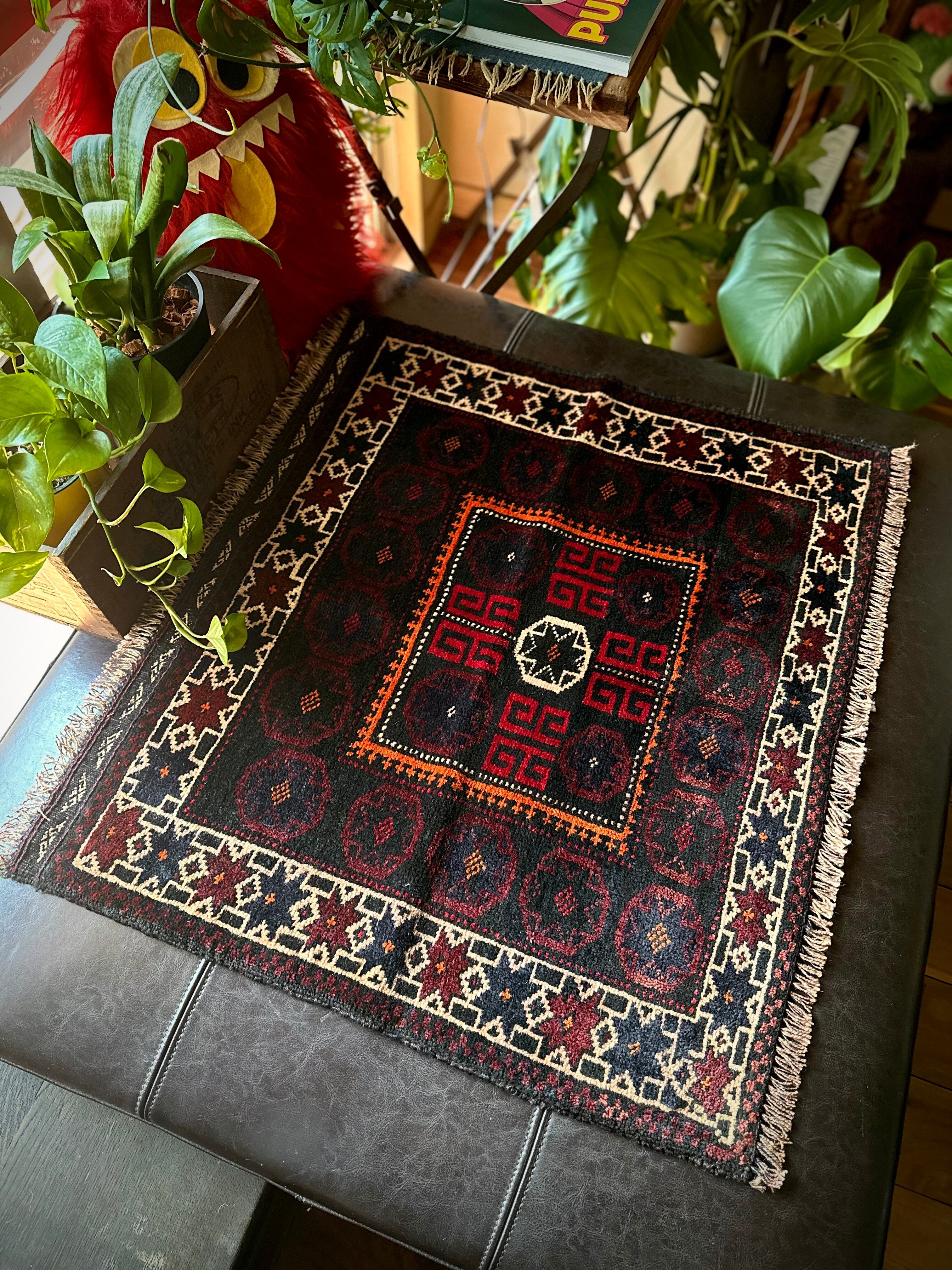 その中振りな正方形の形状から元はラクダなどに担がせる振り分け用サドルバッグの表皮をラグに仕立て直したモノになり、バルーチらしい幸運を司る八芒星のボーダーが雰囲気よく、大きさ的にも姿見前などに良さげなサイズ感の1枚になります。