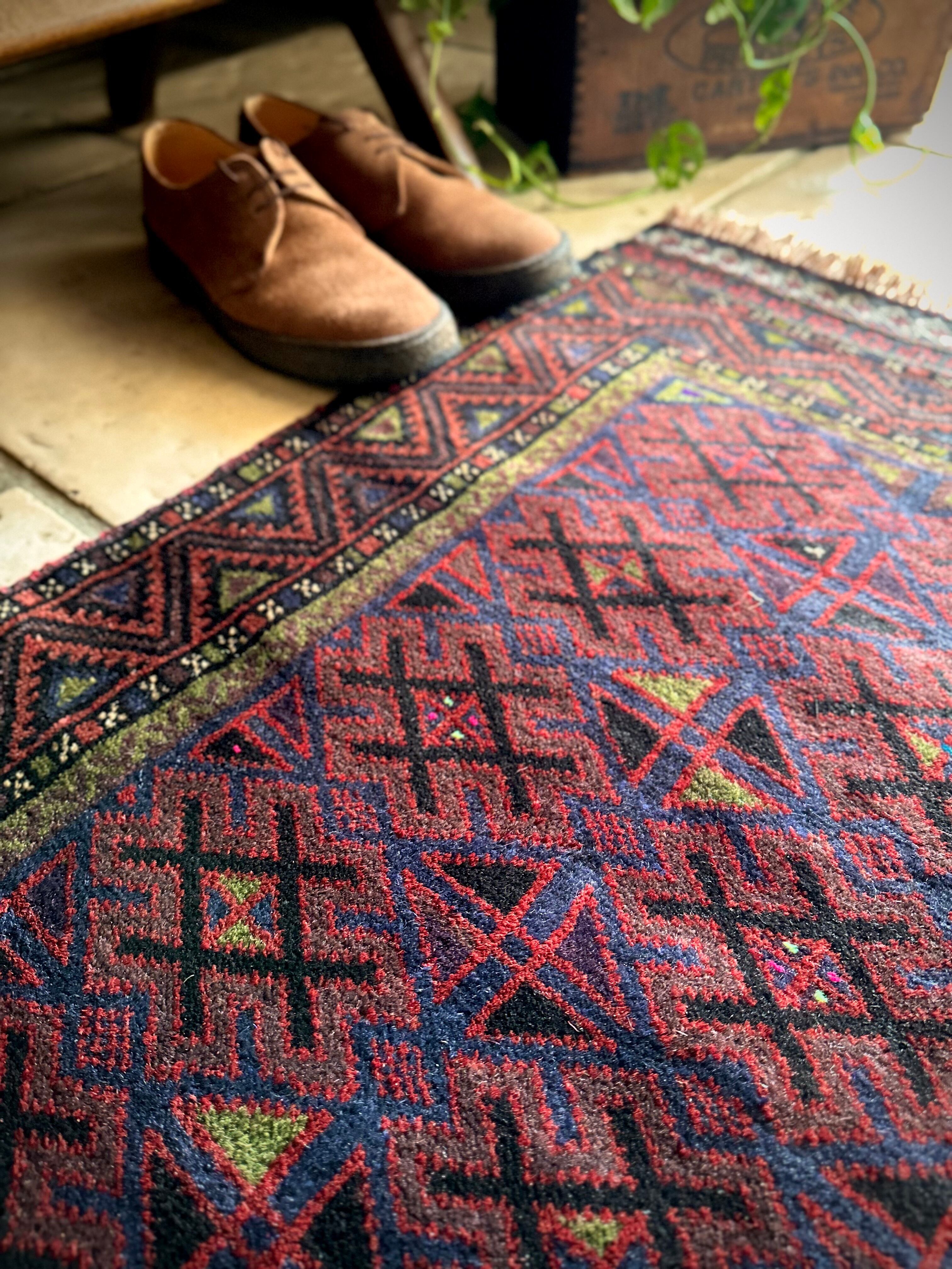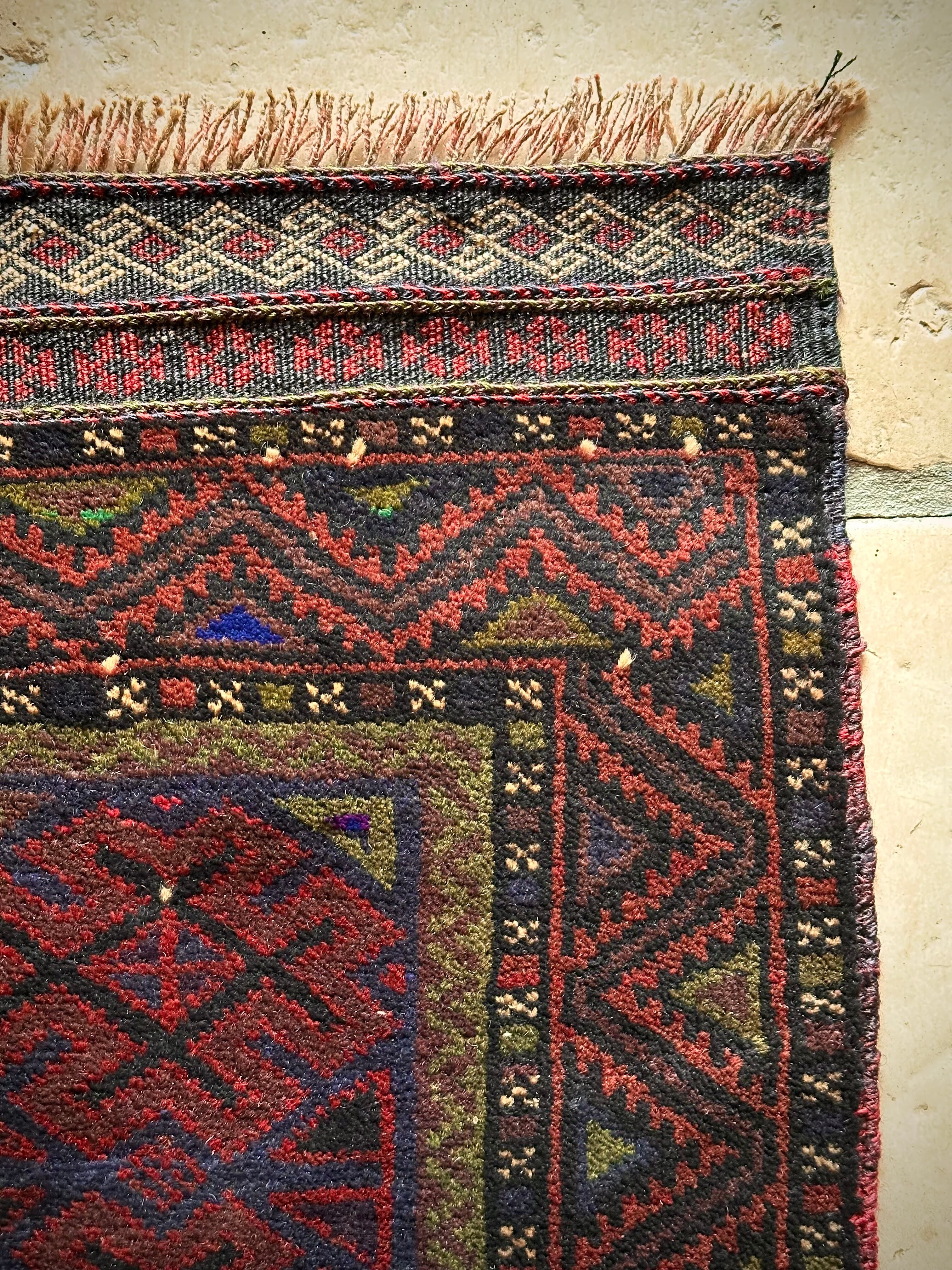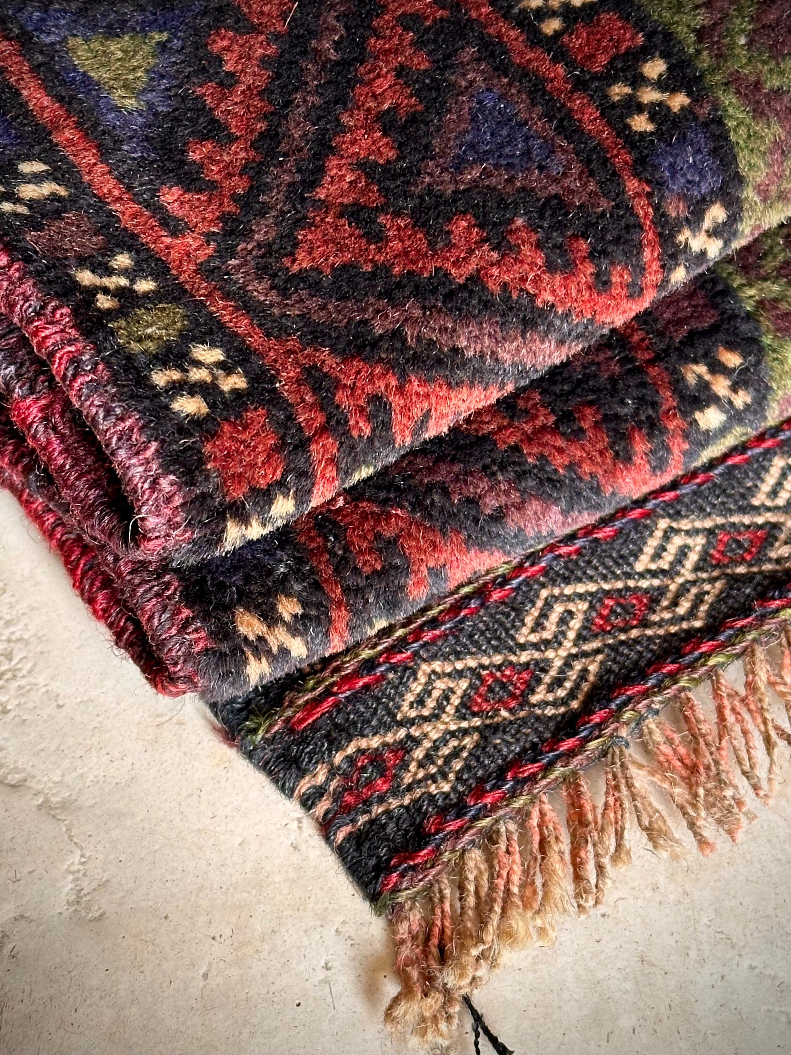 全体的に深みのあるバーガンディにネイビーのラインで縁取られた紋様が浮かび上がって見えるこちらは、アフガニスタンはヘラート州に居住するバルーチ族のトライバルラグで、元は家財道具などを収納するバーリシトと呼ばれる袋状の表皮をラグに仕立て直したモノになります。