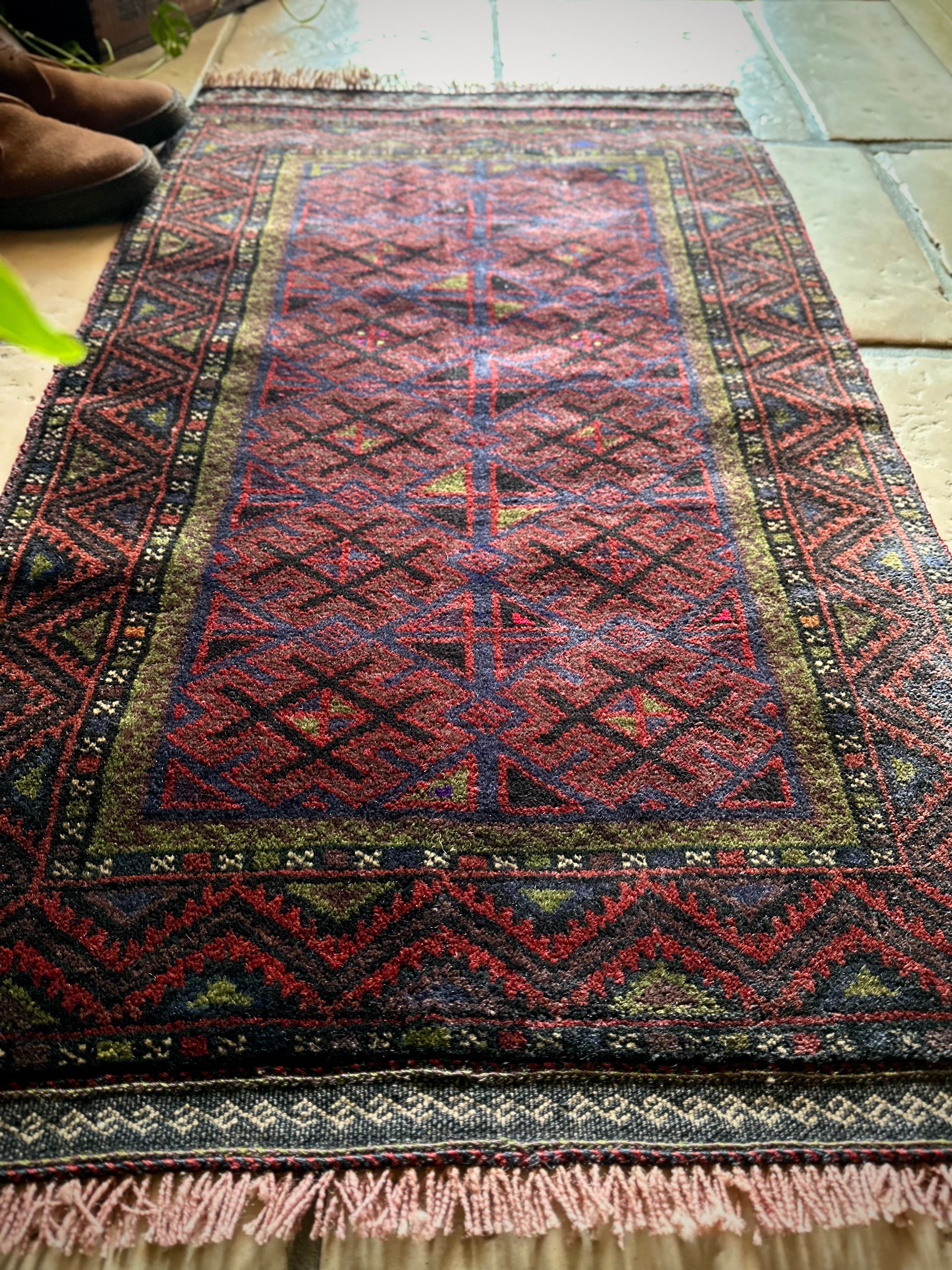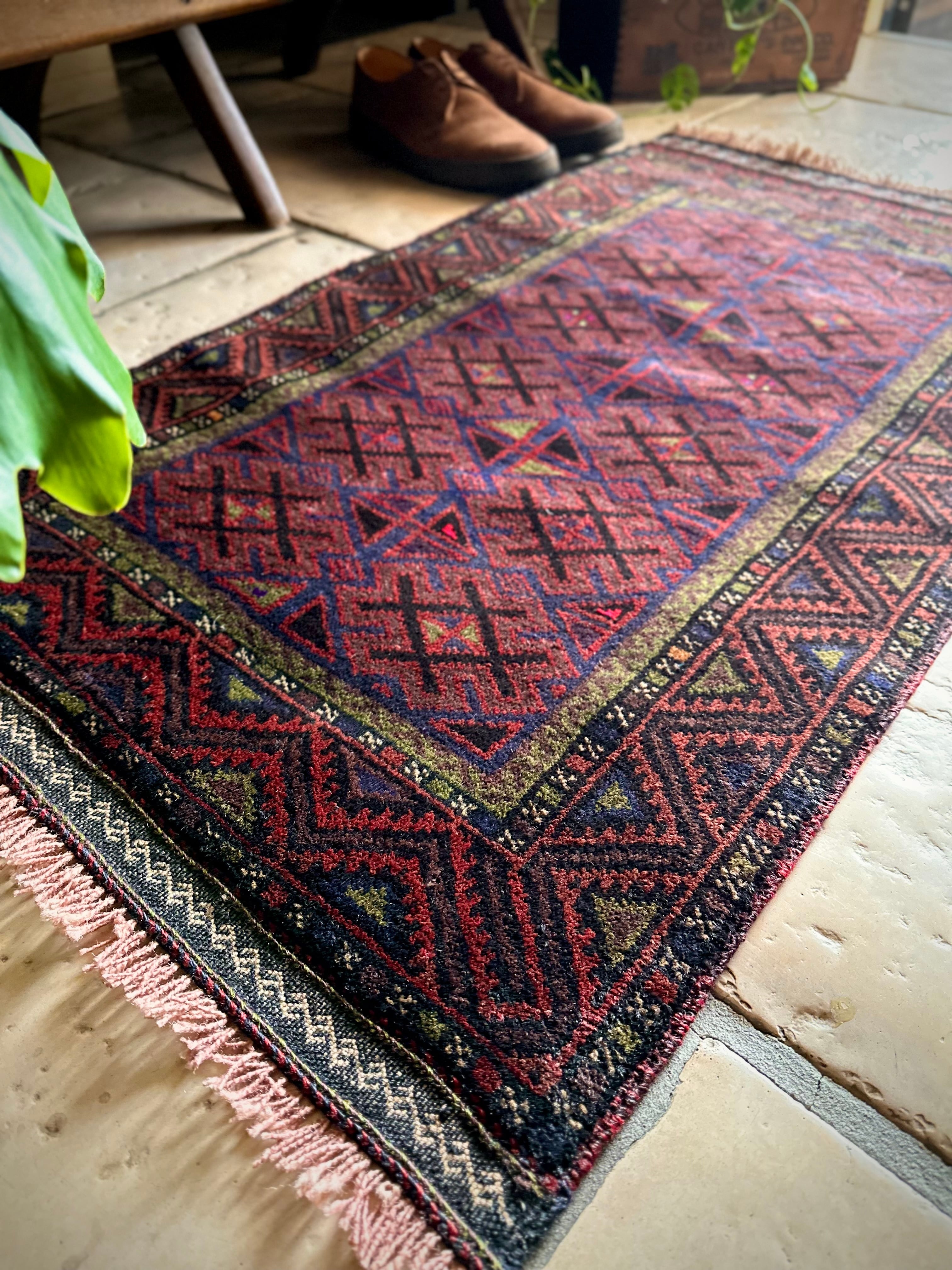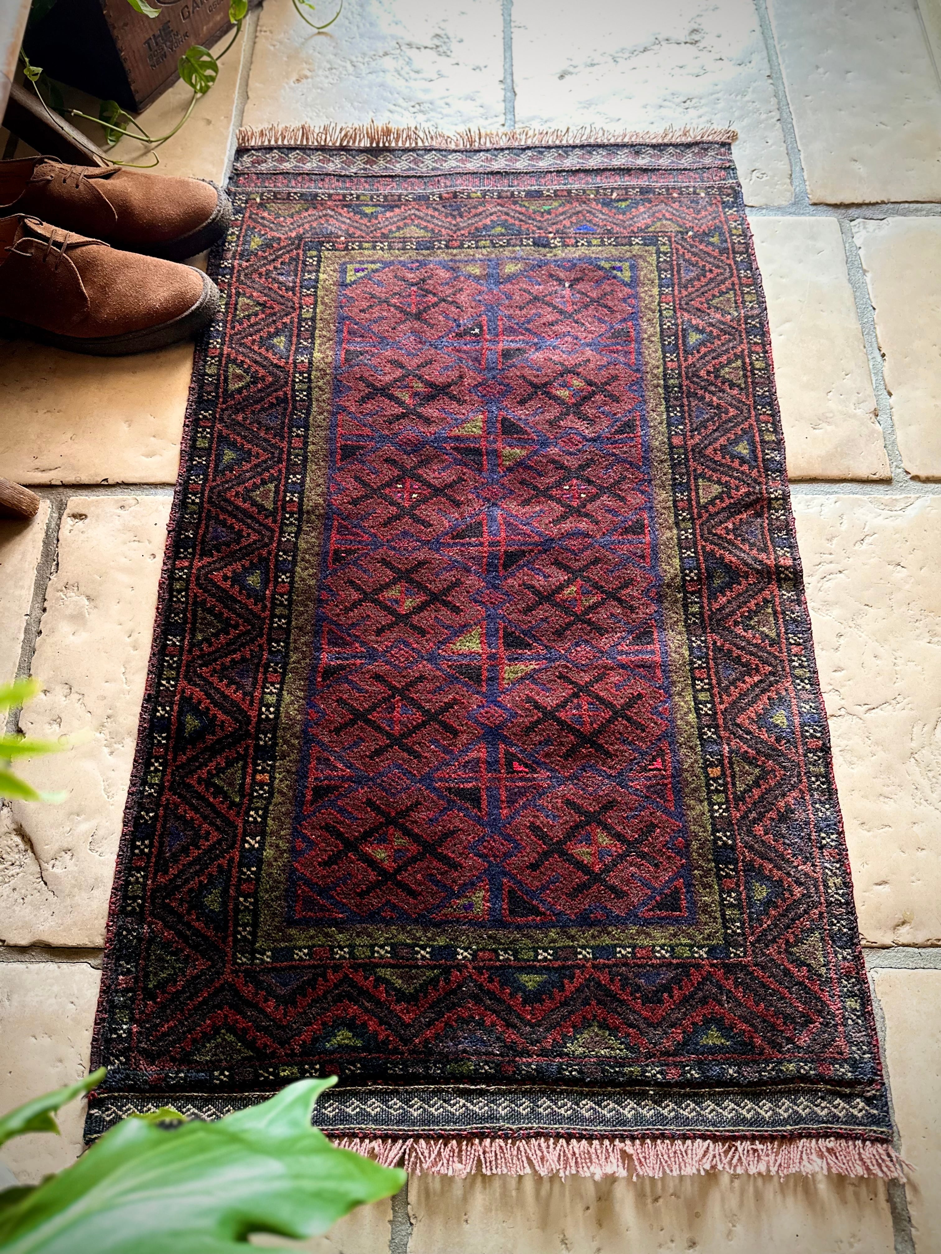全体的に深みのあるバーガンディにネイビーのラインで縁取られた紋様が浮かび上がって見えるこちらは、アフガニスタンはヘラート州に居住するバルーチ族のトライバルラグで、元は家財道具などを収納するバーリシトと呼ばれる袋状の表皮をラグに仕立て直したモノになります。