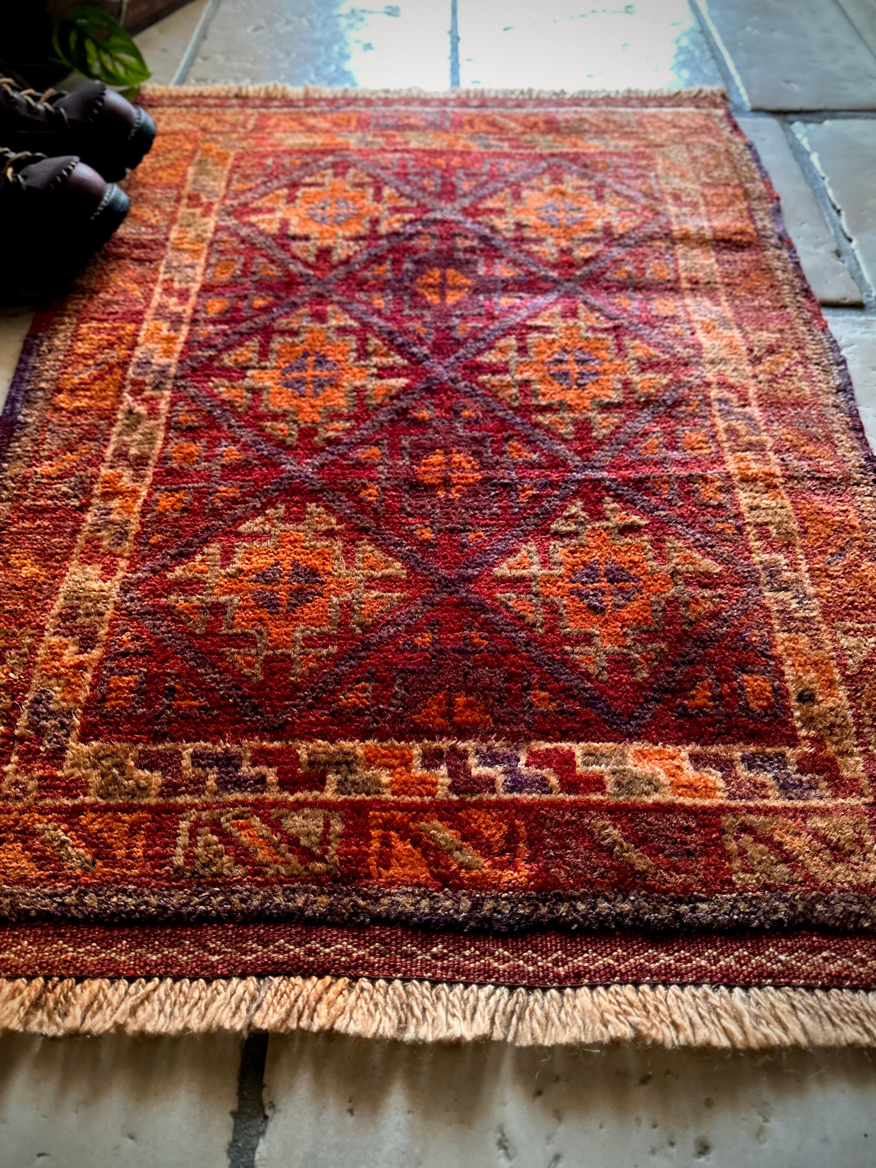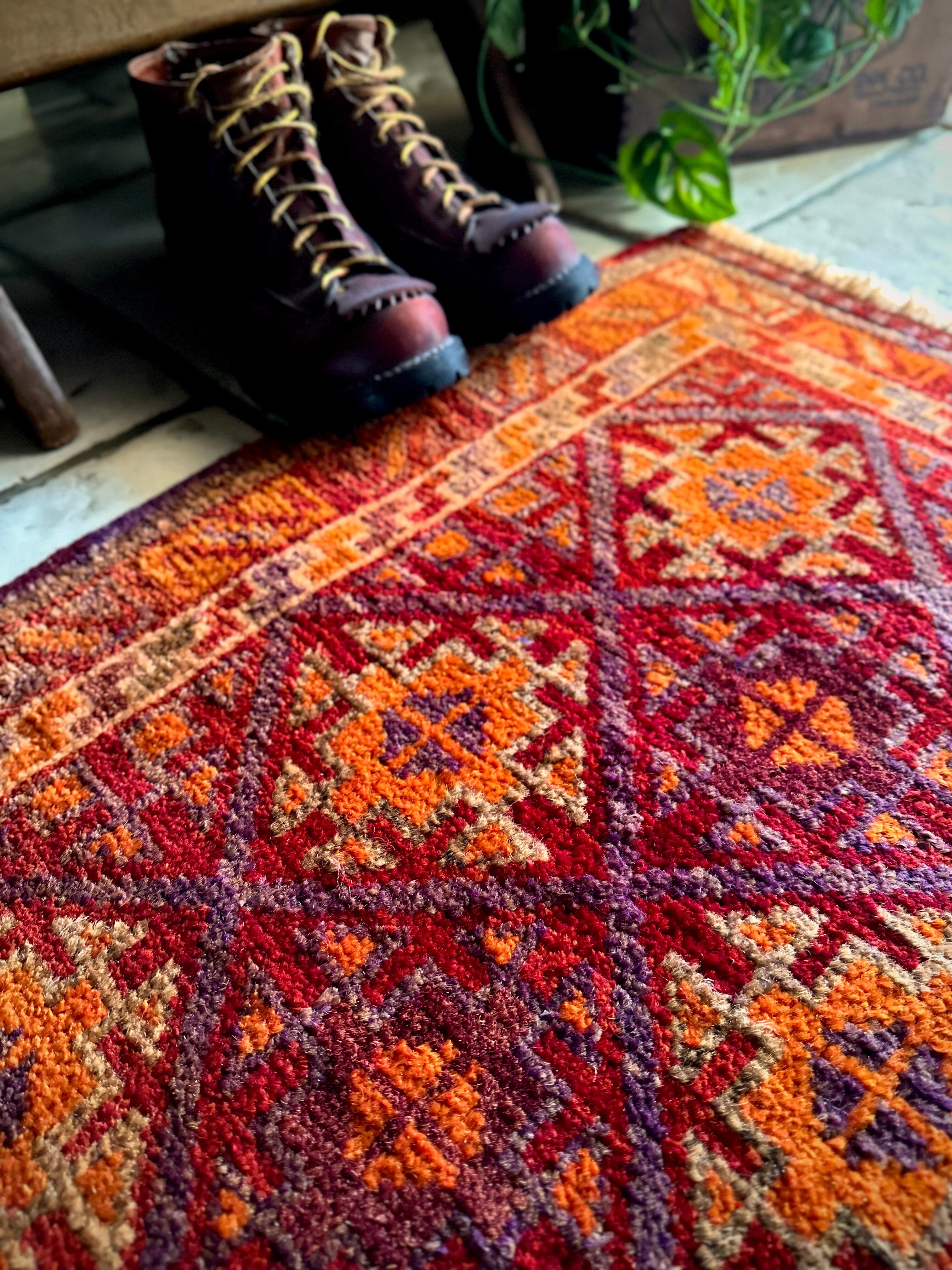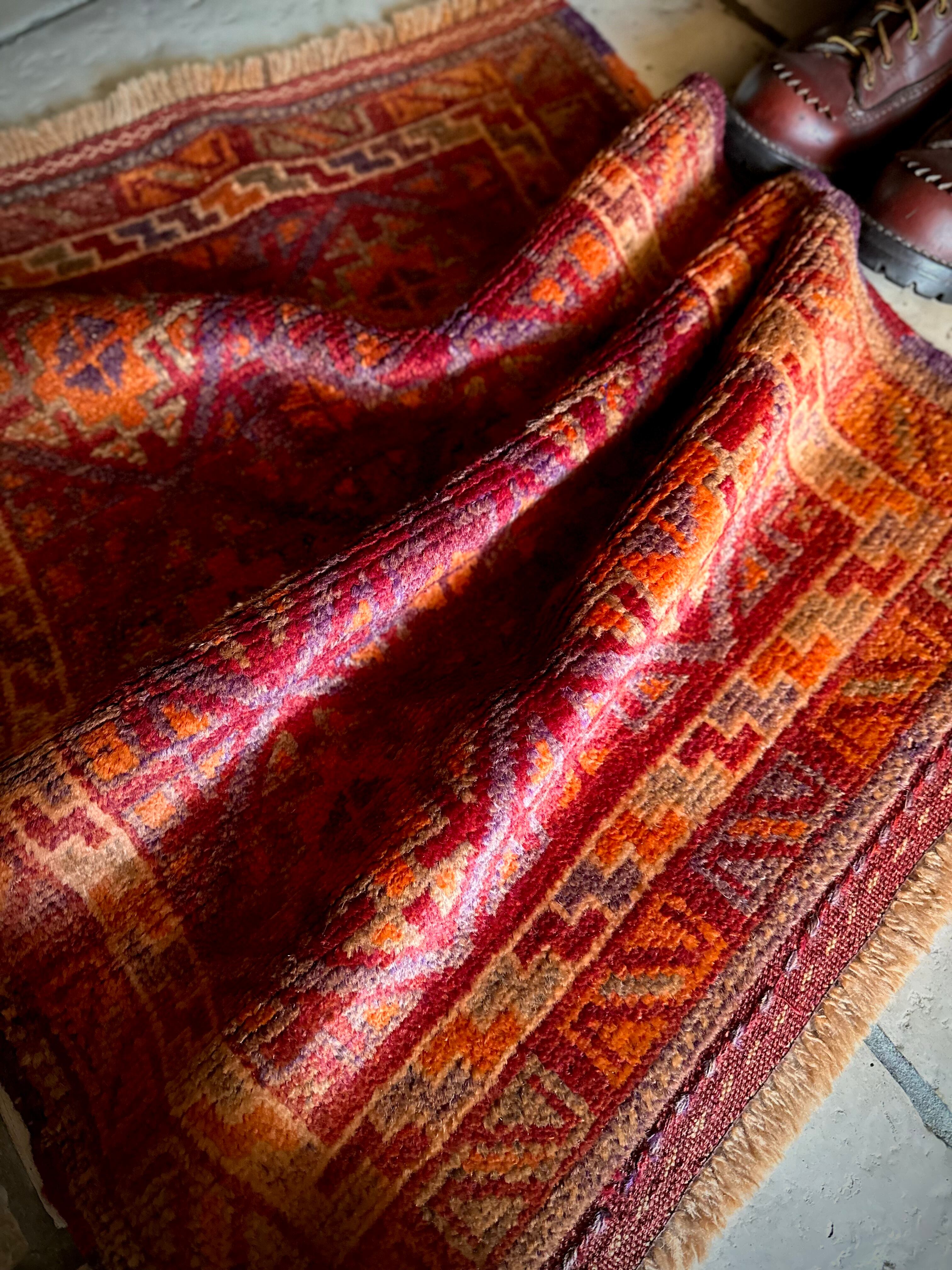 鈍く輝くワインレッドのなかにオレンジに淡いパープルが織り混ざった眩しげなこちらは、アフガニスタンはヘラート州に居住するタイマニ族のトライバルラグで、元は家財道具などを収納するバーリシトと呼ばれる袋状の表皮をラグに仕立て直したモノになります。
