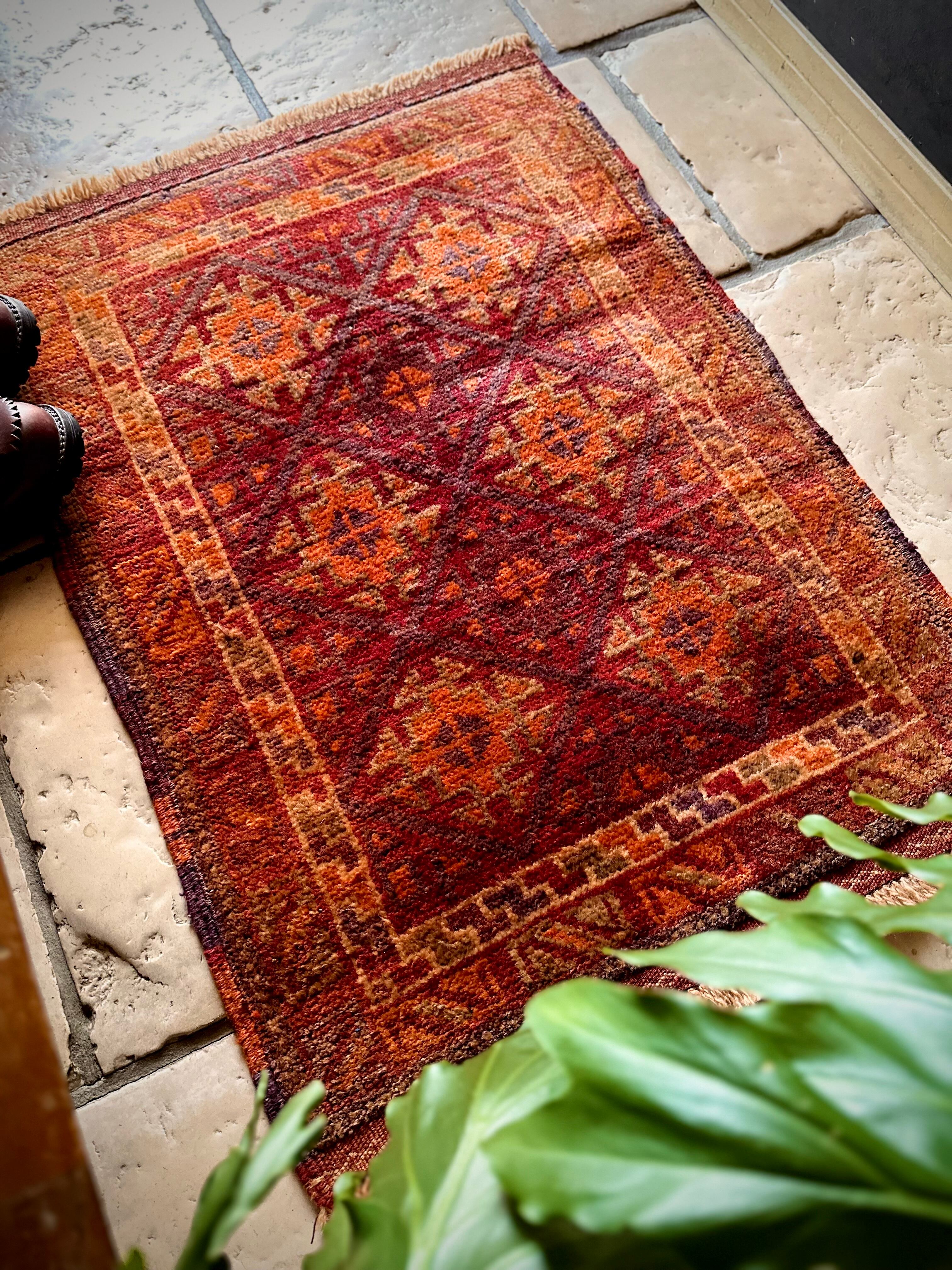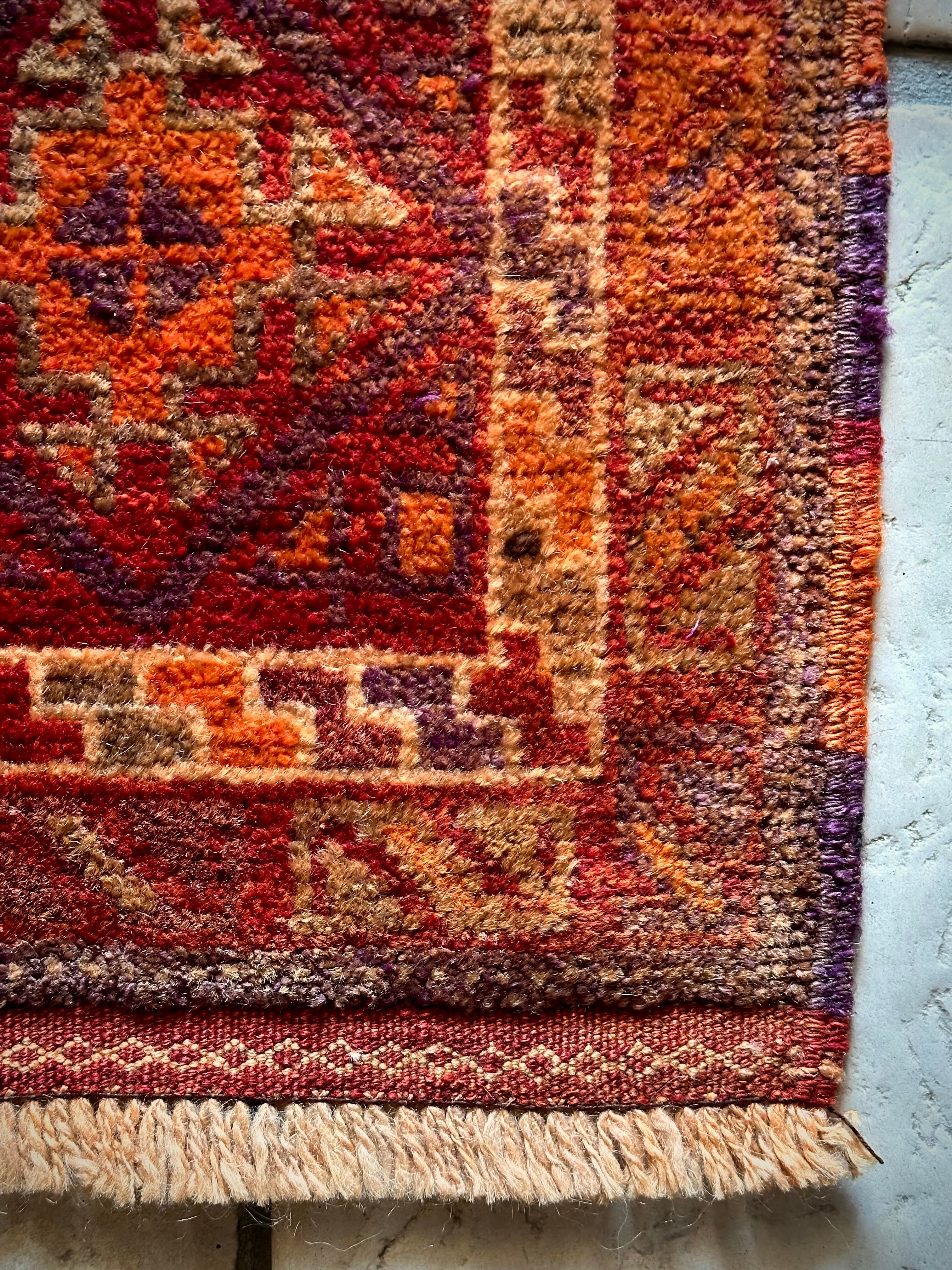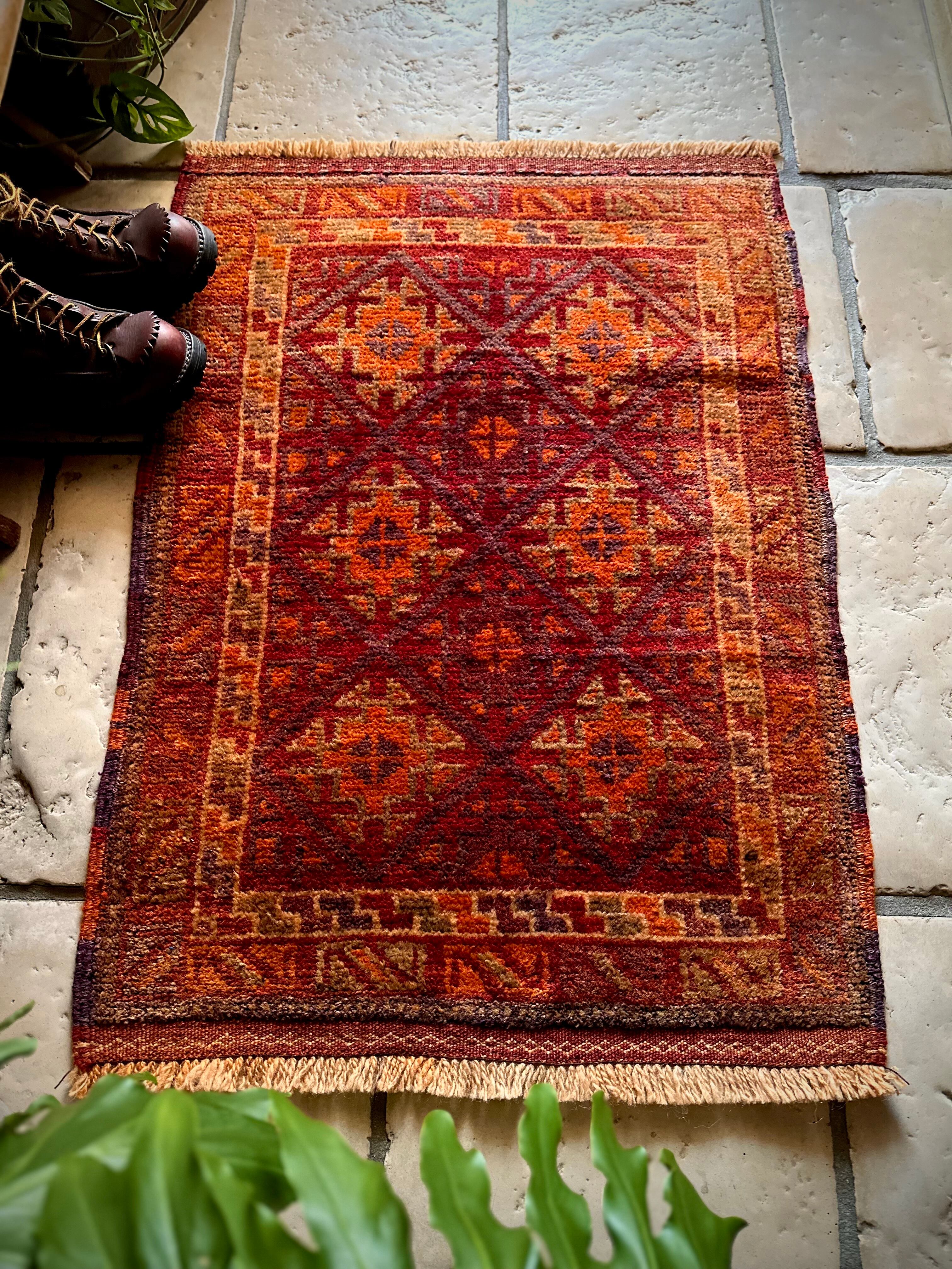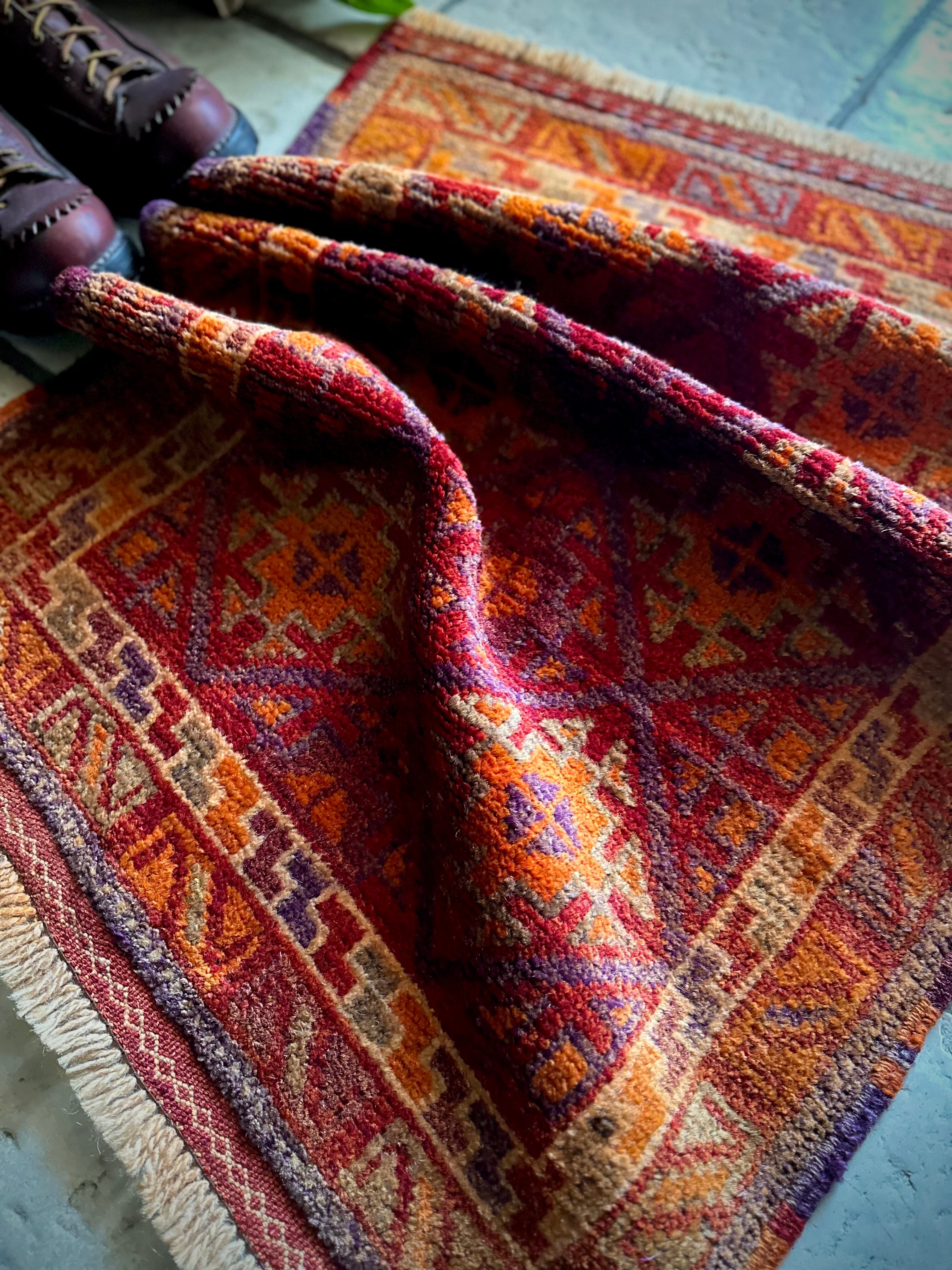 鈍く輝くワインレッドのなかにオレンジに淡いパープルが織り混ざった眩しげなこちらは、アフガニスタンはヘラート州に居住するタイマニ族のトライバルラグで、元は家財道具などを収納するバーリシトと呼ばれる袋状の表皮をラグに仕立て直したモノになります。