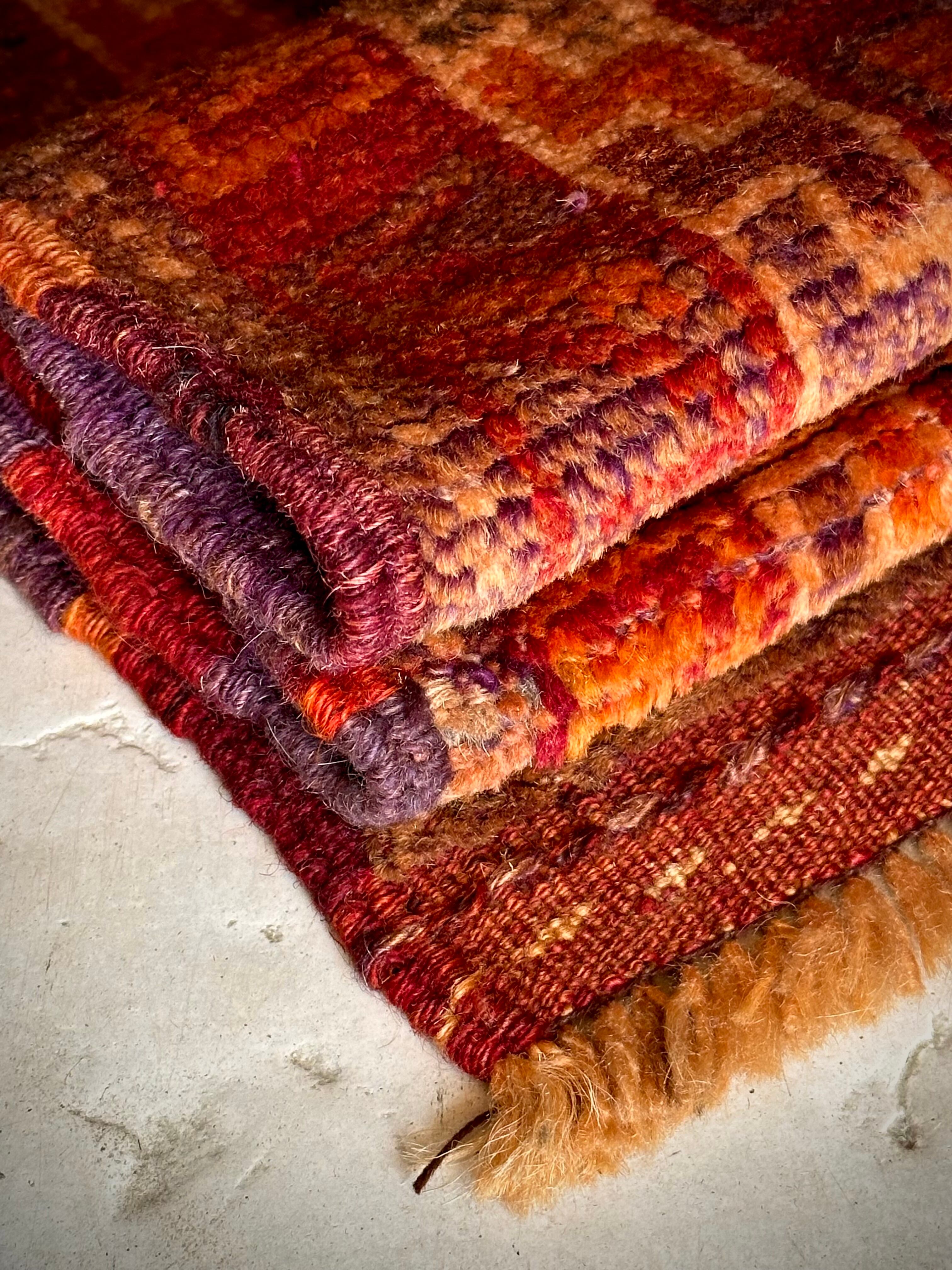 最後にラグそのものに関しては羊毛特有の匂いがあり、採寸は中央付近で計測していますが、手織りならではの歪みによる誤差や水洗いクリーニングによる縮み、また草木染めによる経年劣化の色ムラなどがありますが、それもまたヴィンテージラグの魅力かとご理解ください。