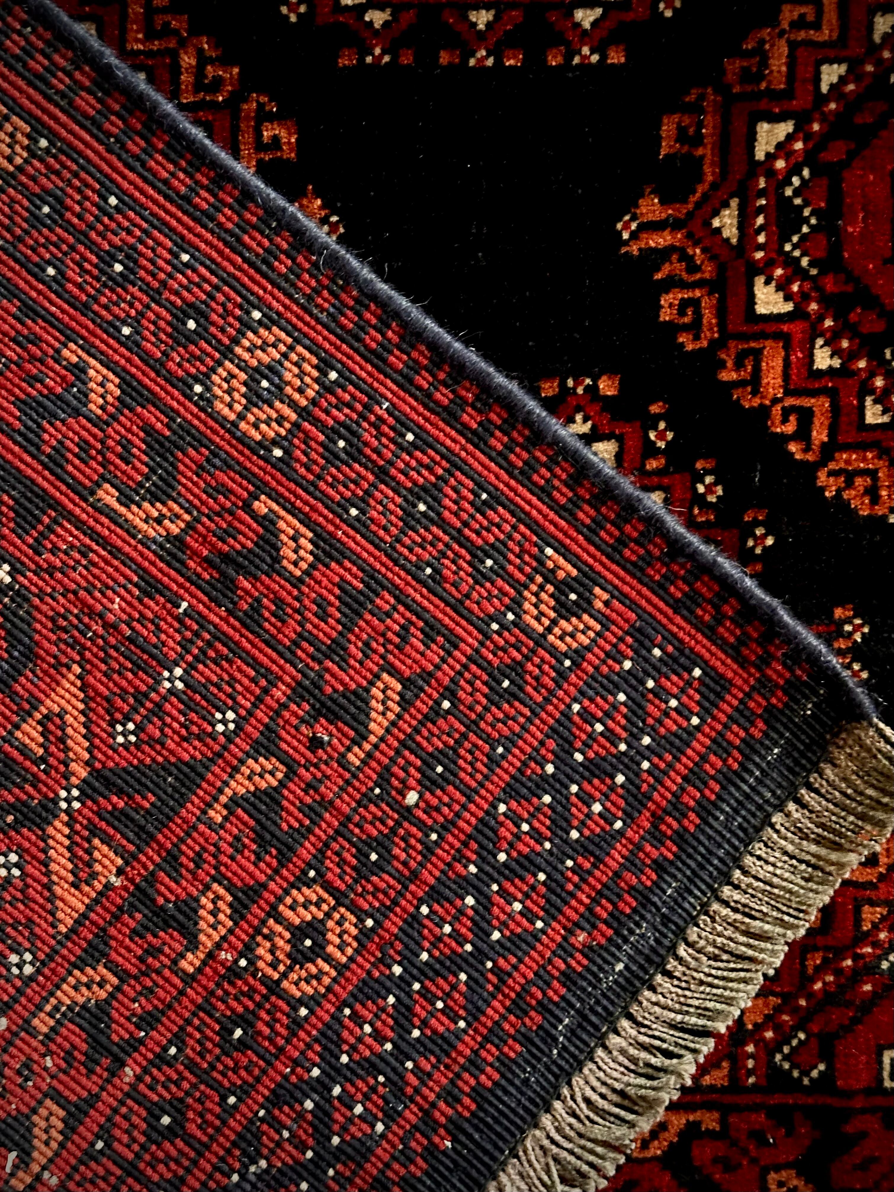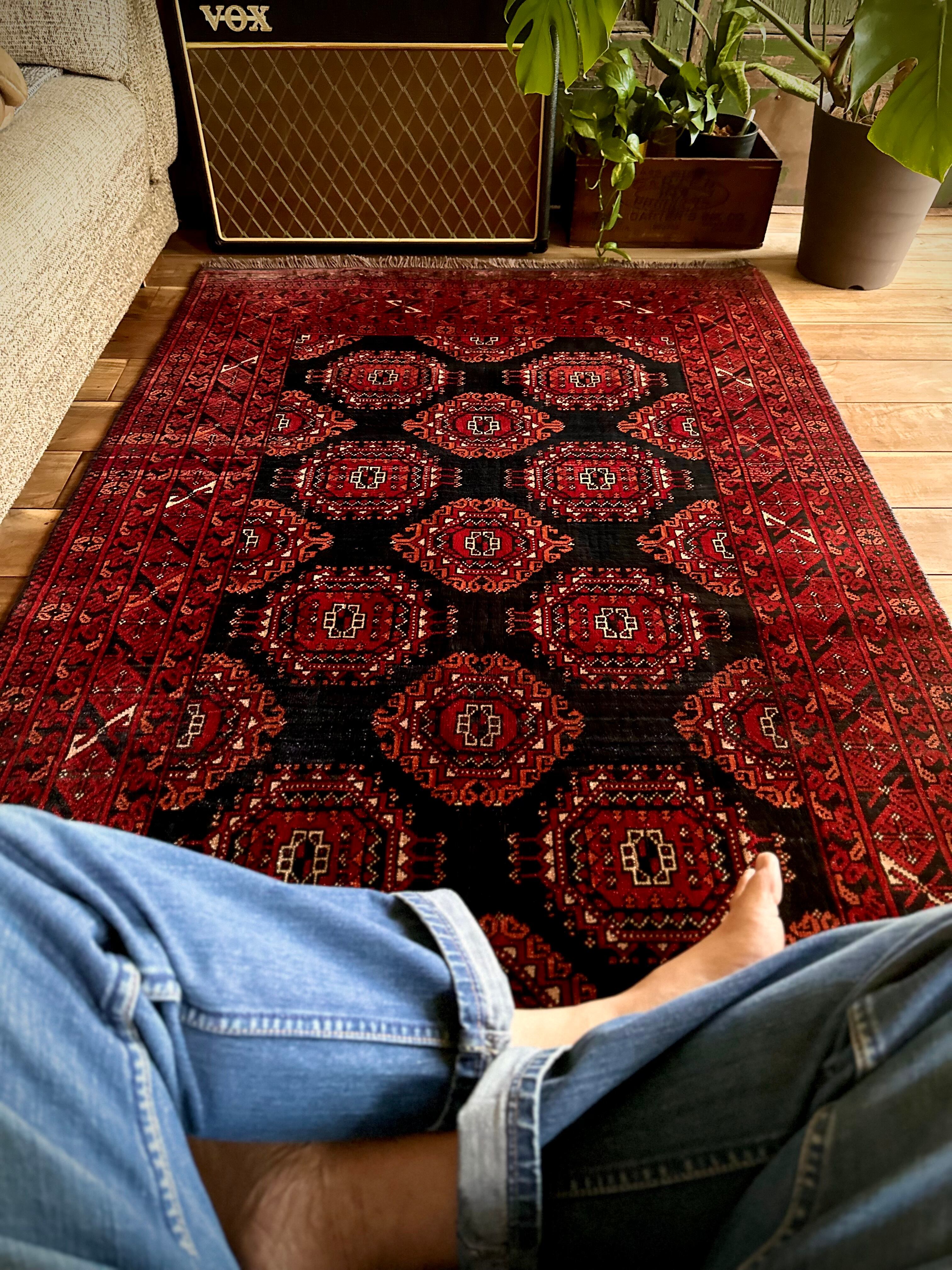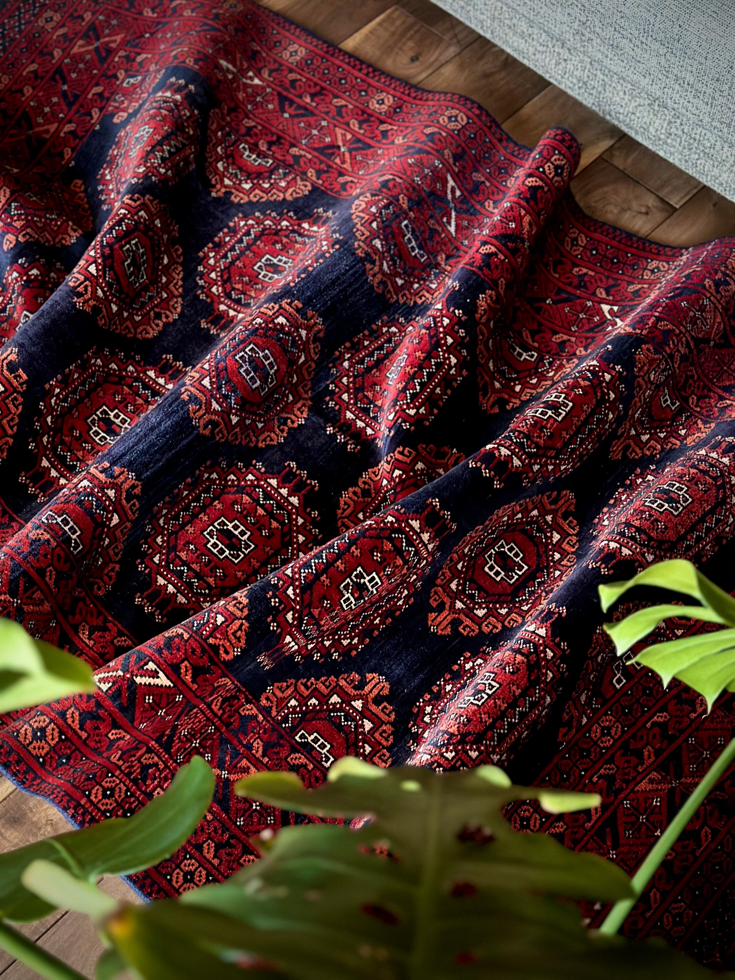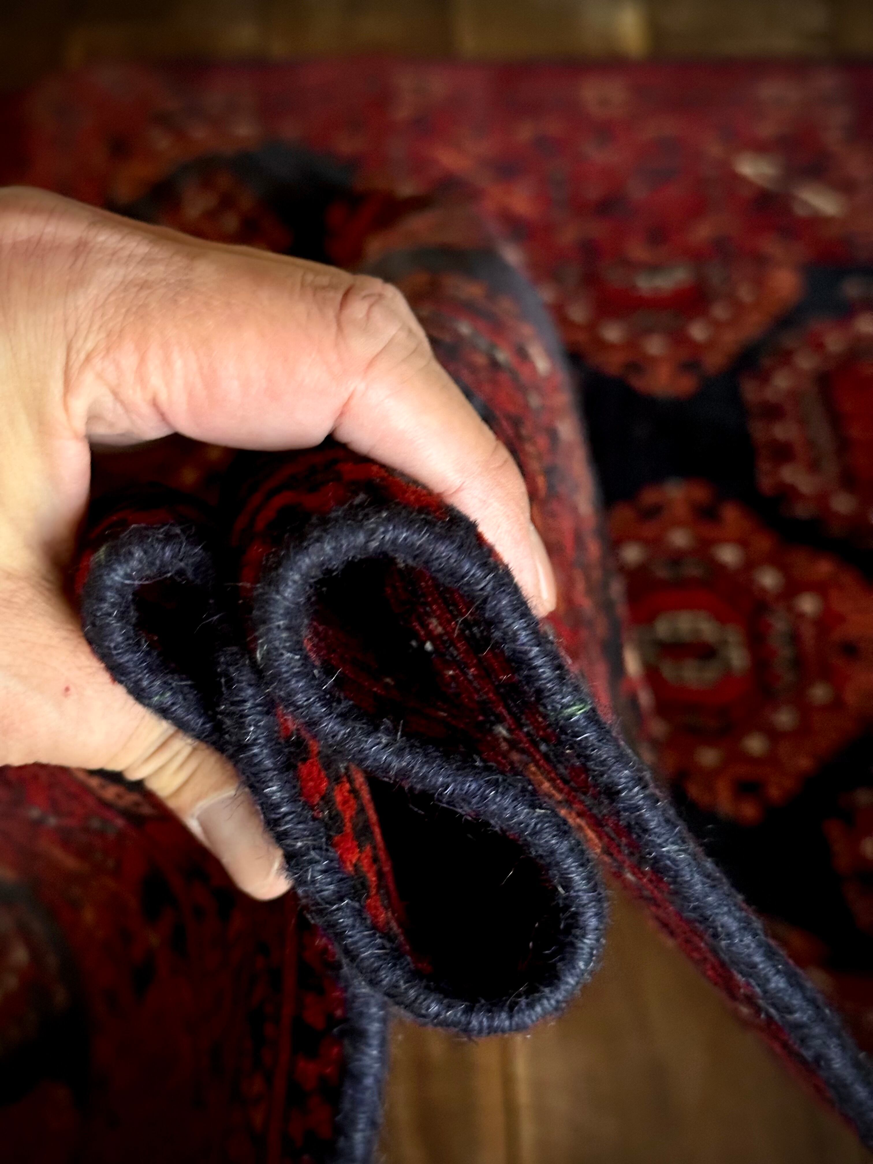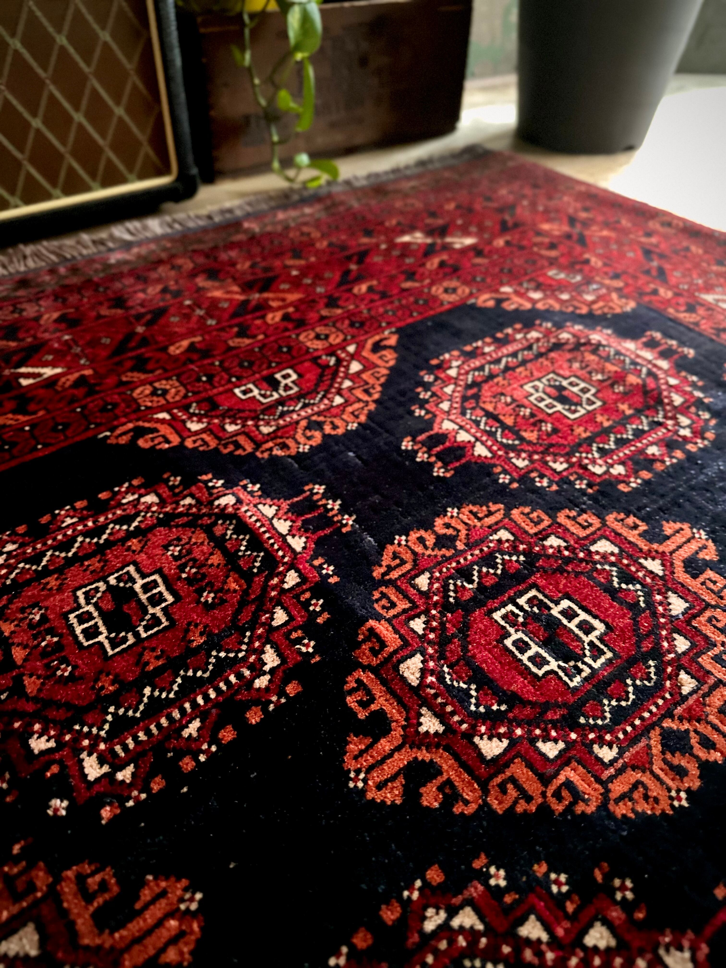 深紅のバーガンディレッドに炎のようなオレンジが混ざるボーダーと、限りなくブラックに近いネイビーのフィールドとの対称がかっこいいこちらは、アフガニスタン北部に暮らすトルクメン族のトライバルラグで、ガシッと密に織られた大判サイズのメインラグになります。
