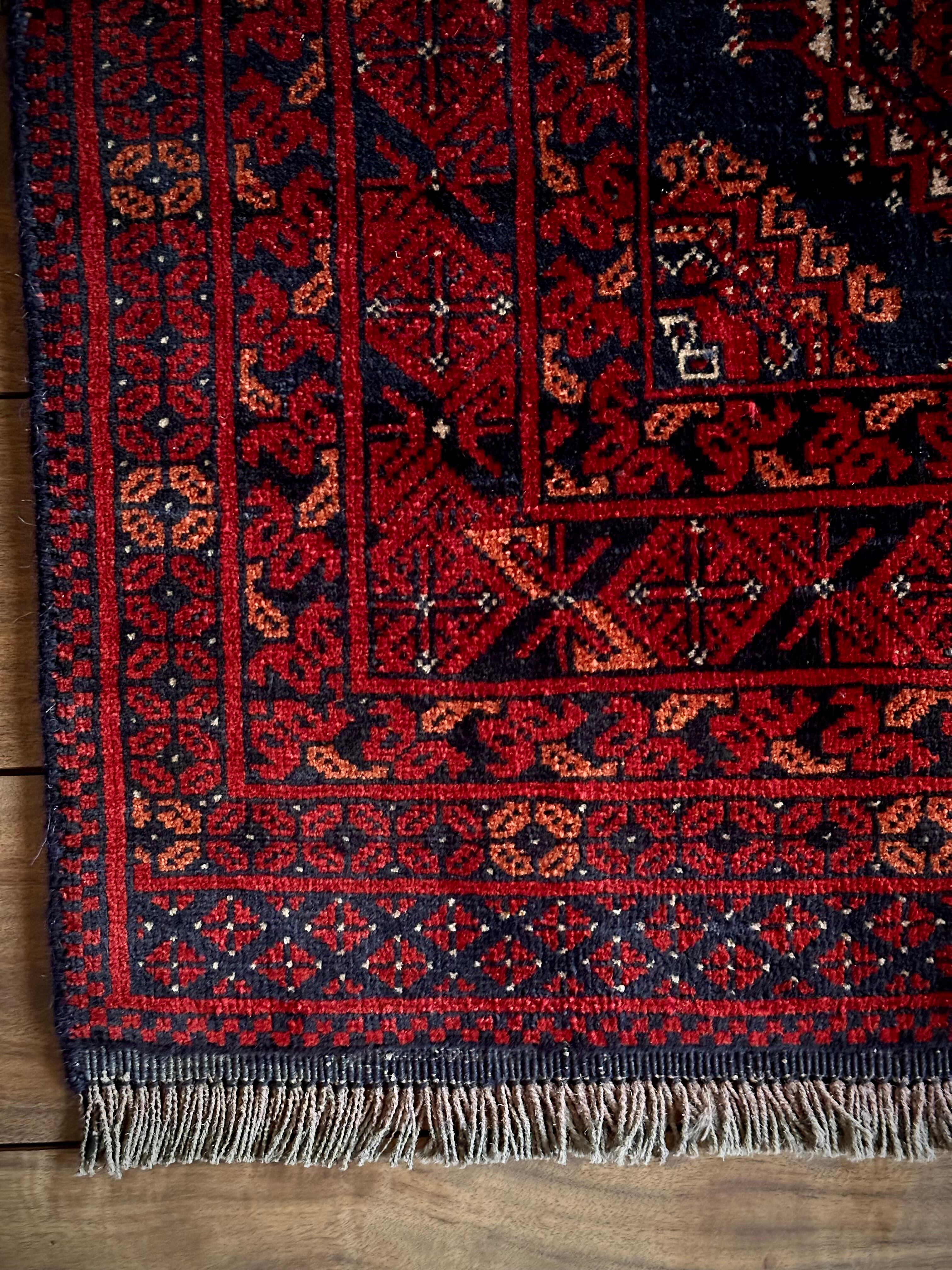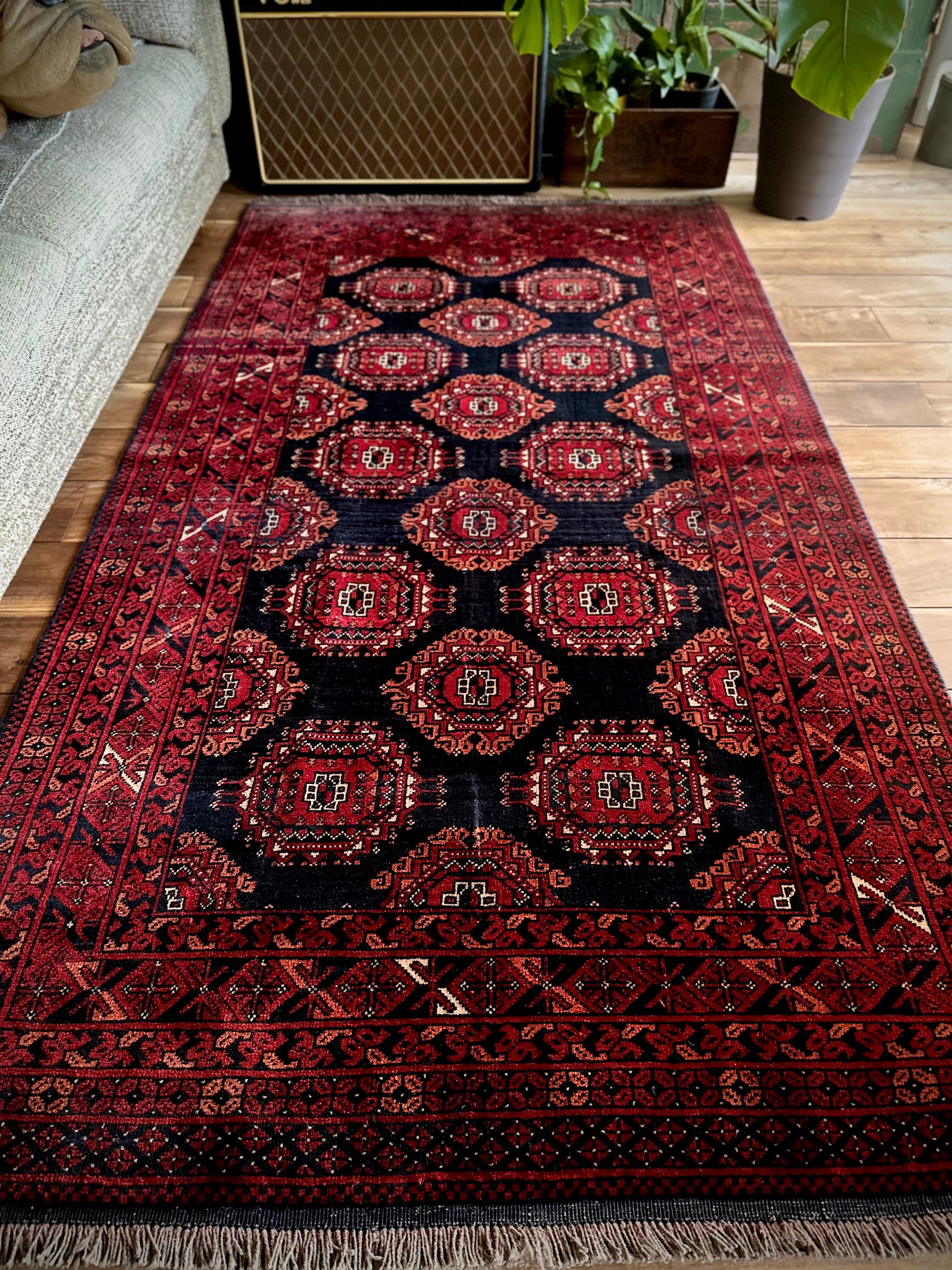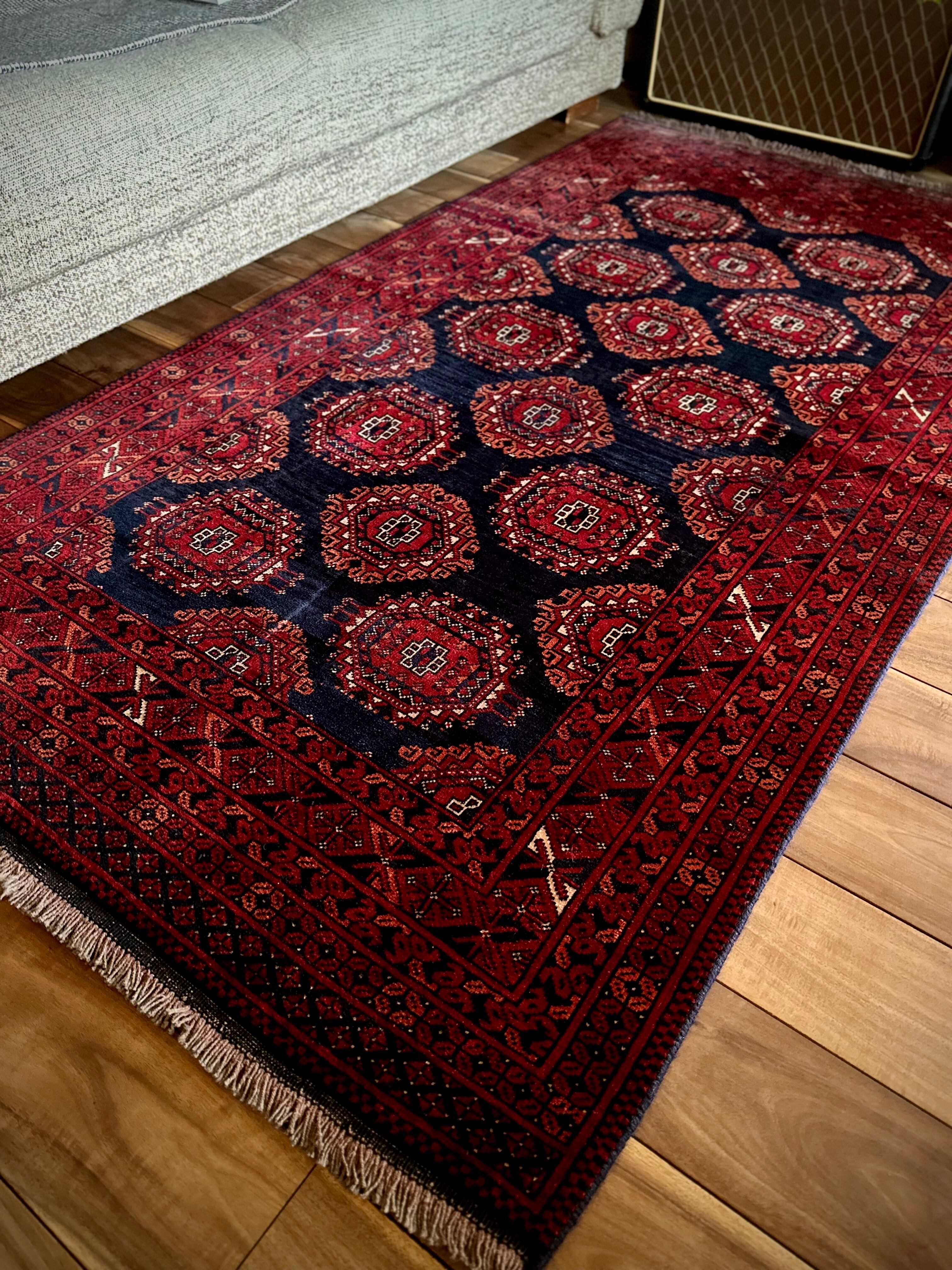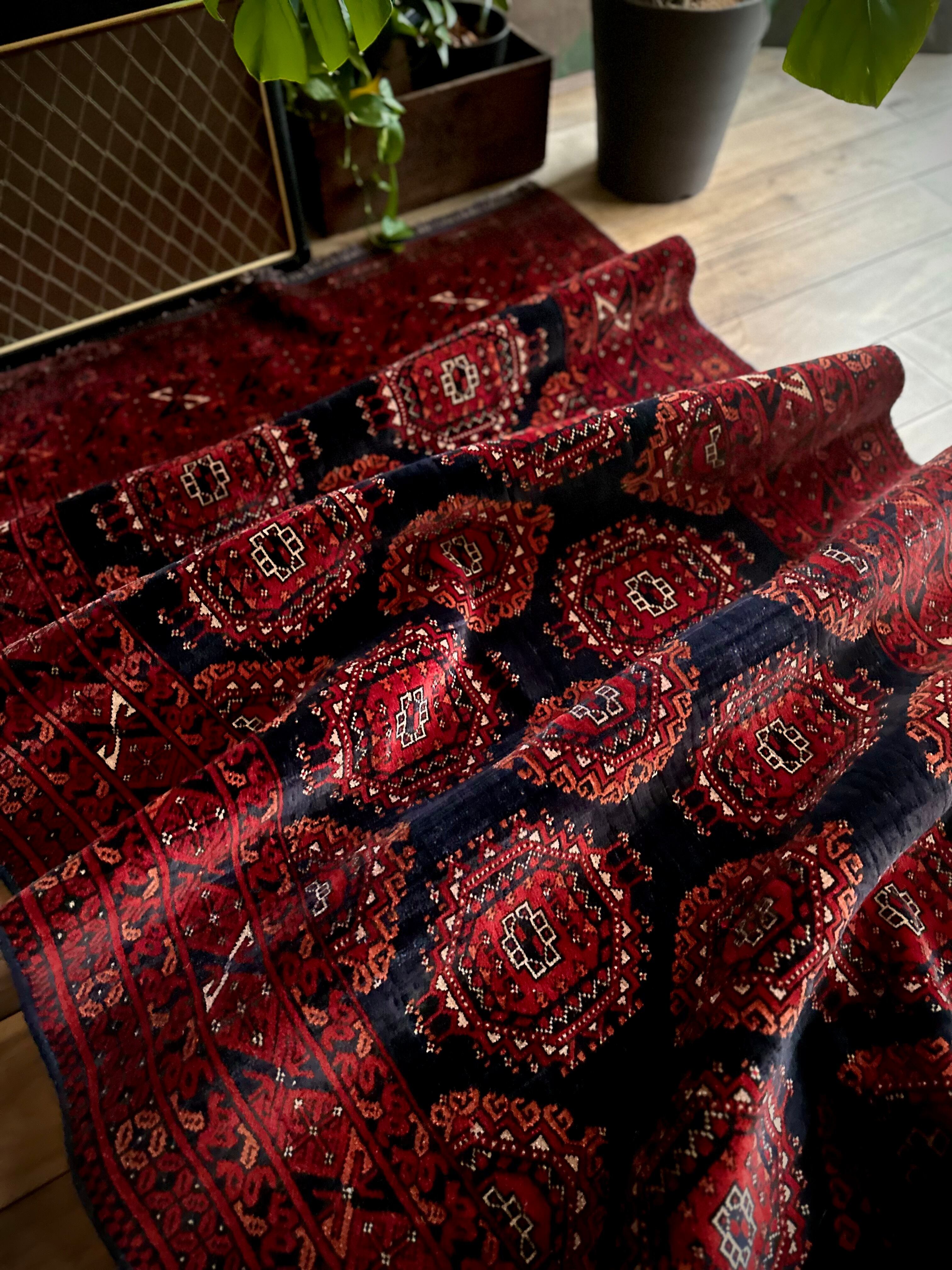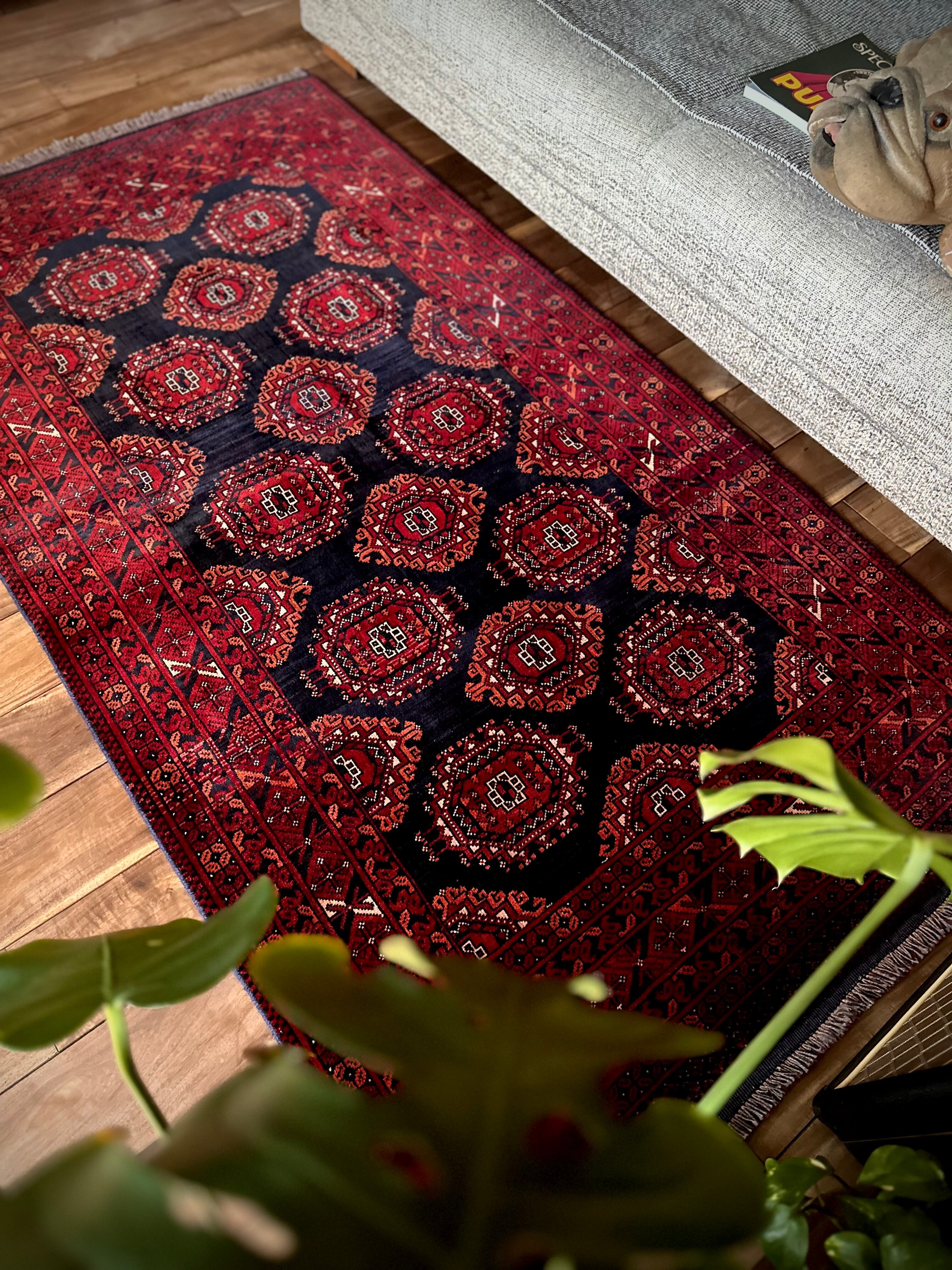 深紅のバーガンディレッドに炎のようなオレンジが混ざるボーダーと、限りなくブラックに近いネイビーのフィールドとの対称がかっこいいこちらは、アフガニスタン北部に暮らすトルクメン族のトライバルラグで、ガシッと密に織られた大判サイズのメインラグになります。