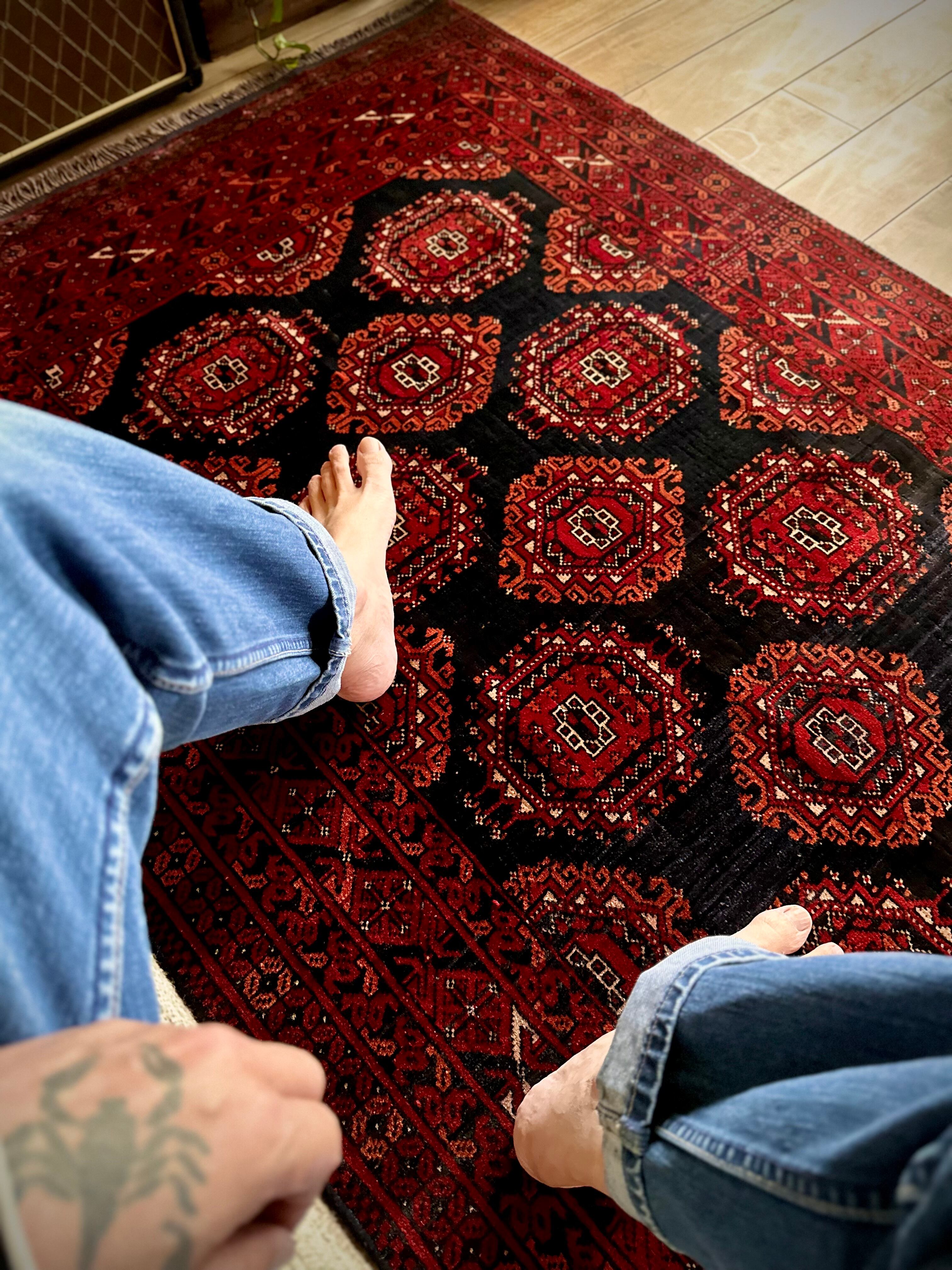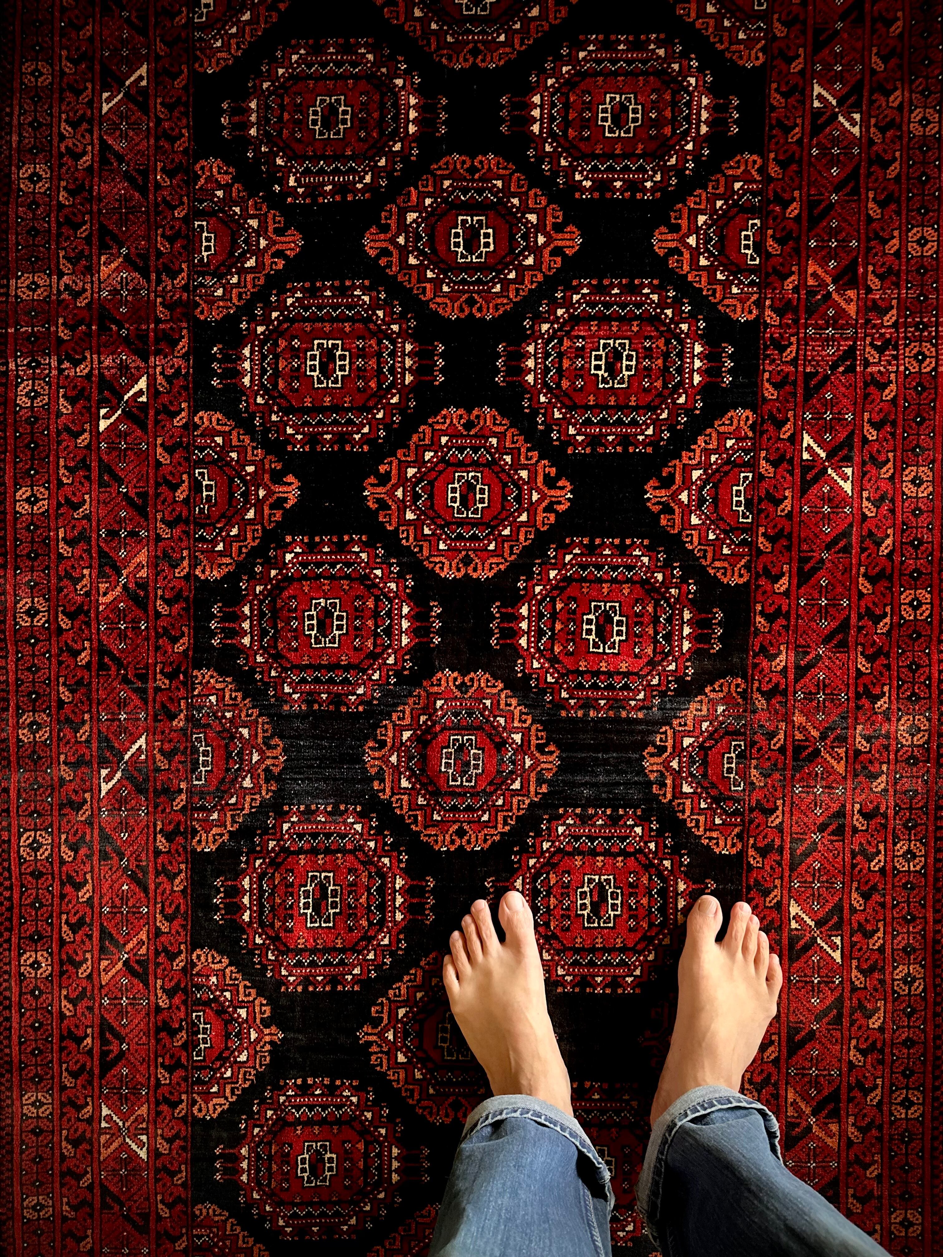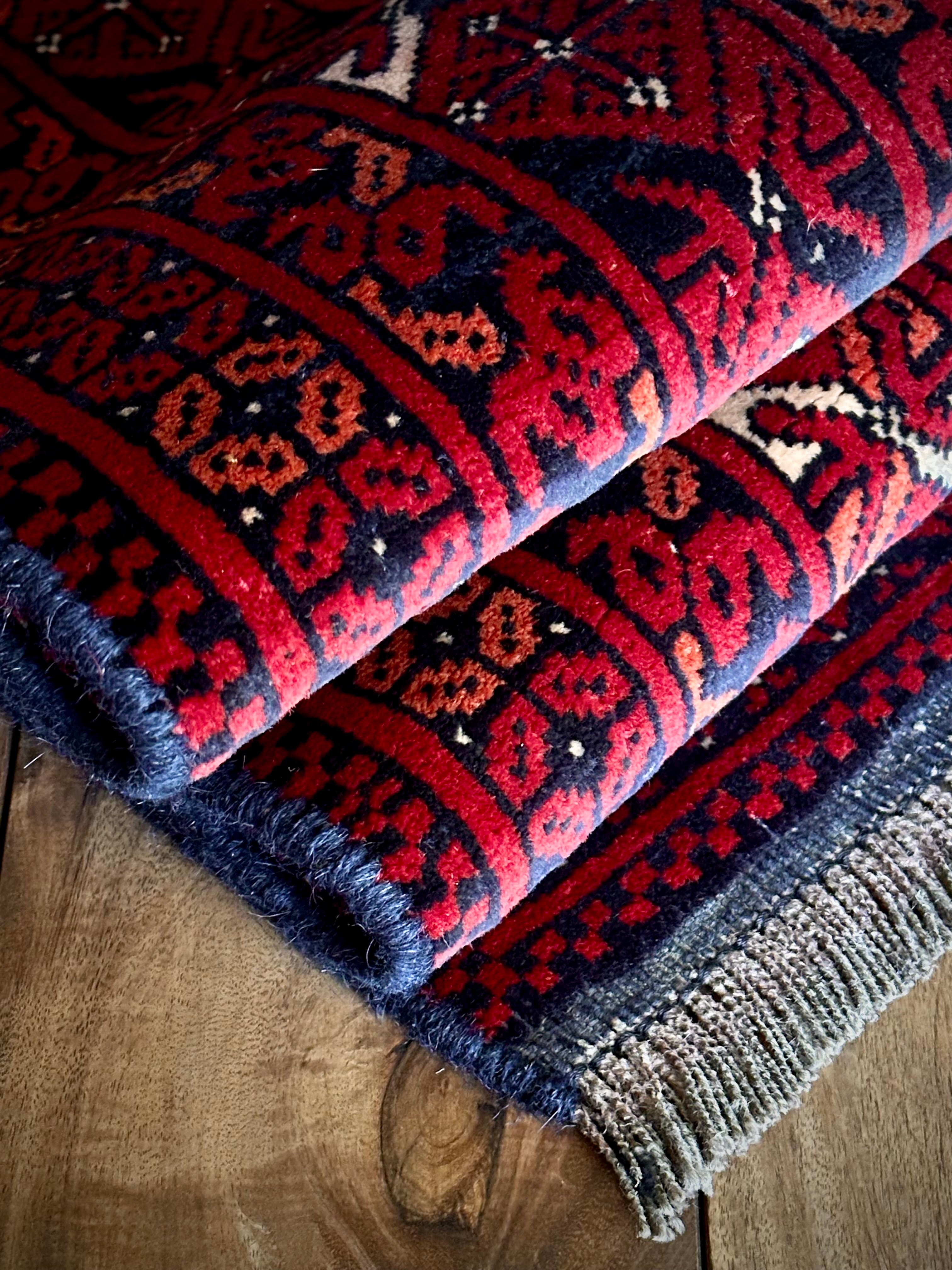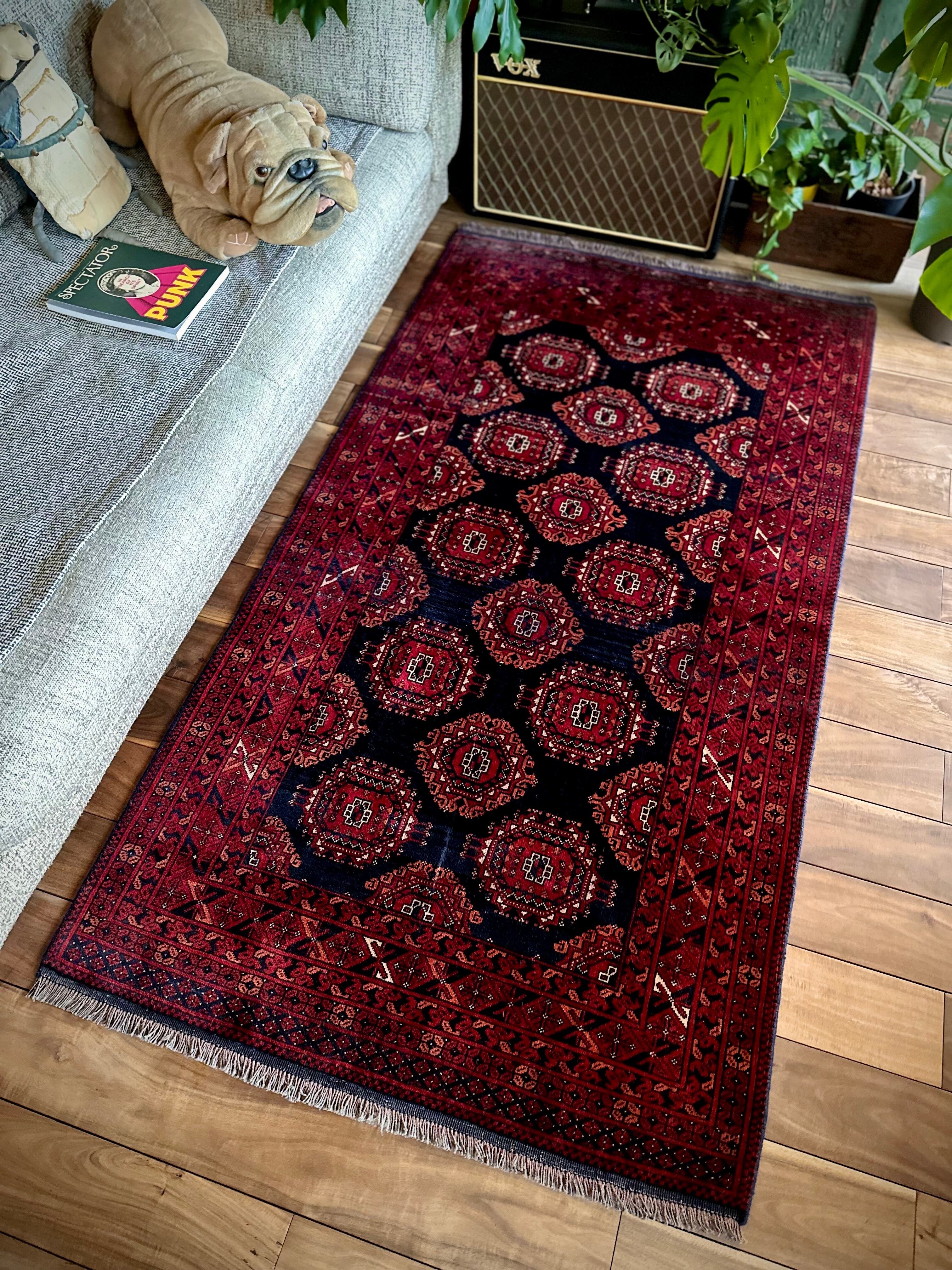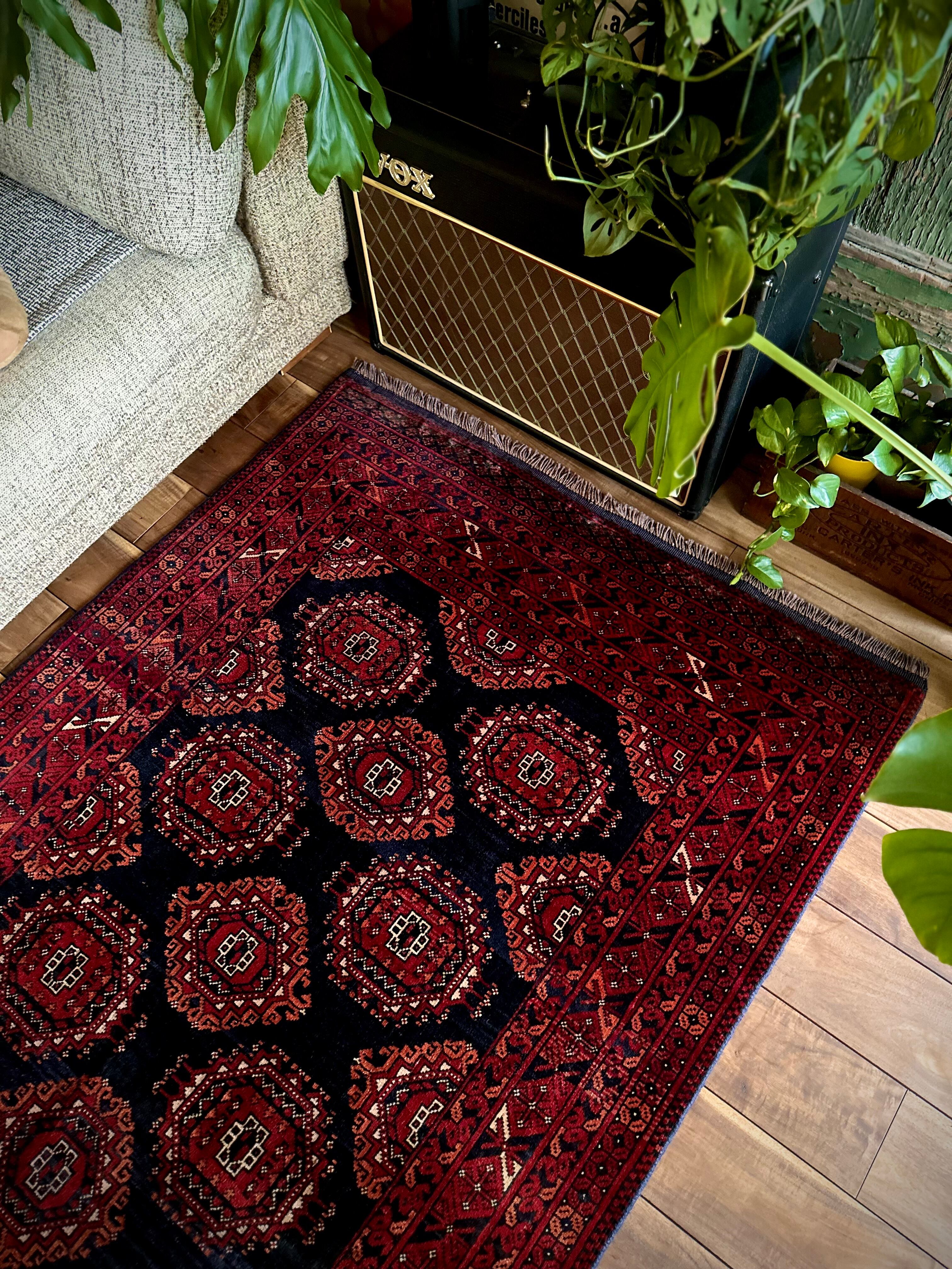 深紅のバーガンディレッドに炎のようなオレンジが混ざるボーダーと、限りなくブラックに近いネイビーのフィールドとの対称がかっこいいこちらは、アフガニスタン北部に暮らすトルクメン族のトライバルラグで、ガシッと密に織られた大判サイズのメインラグになります。