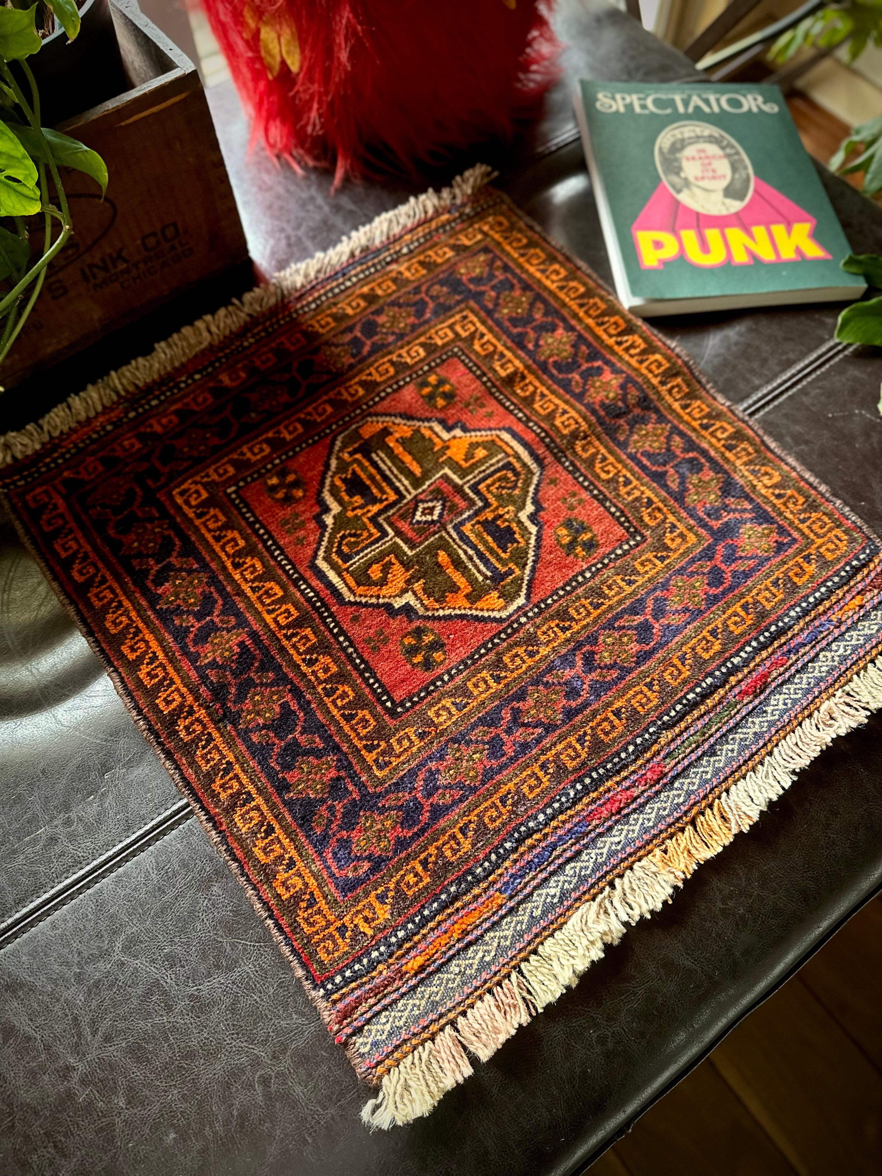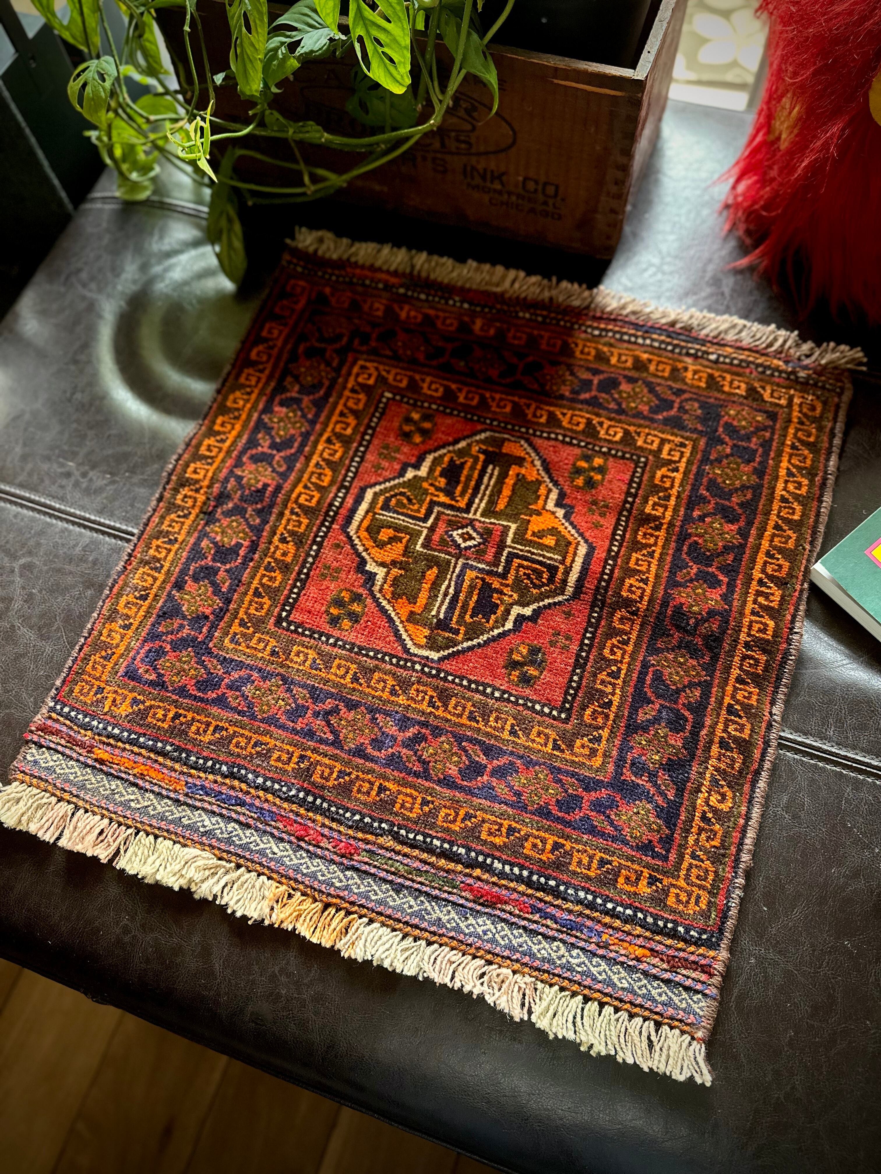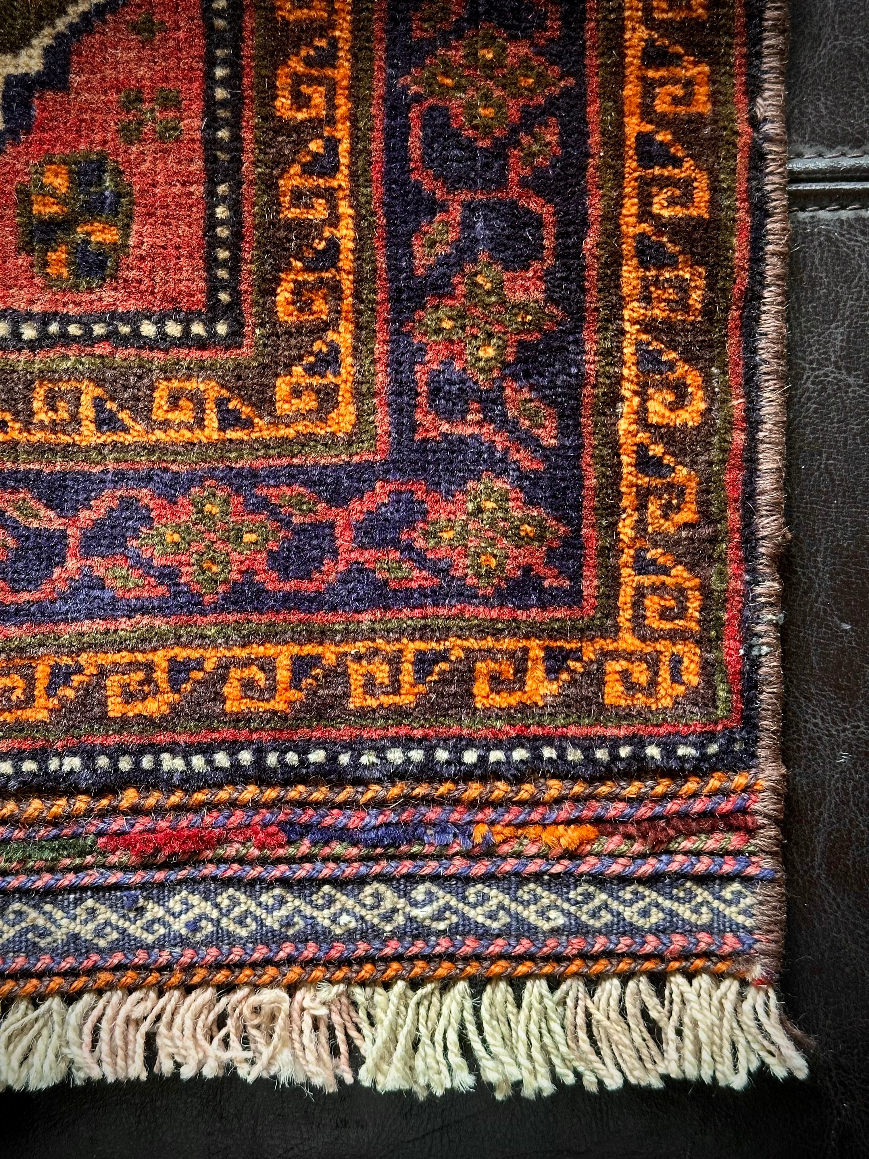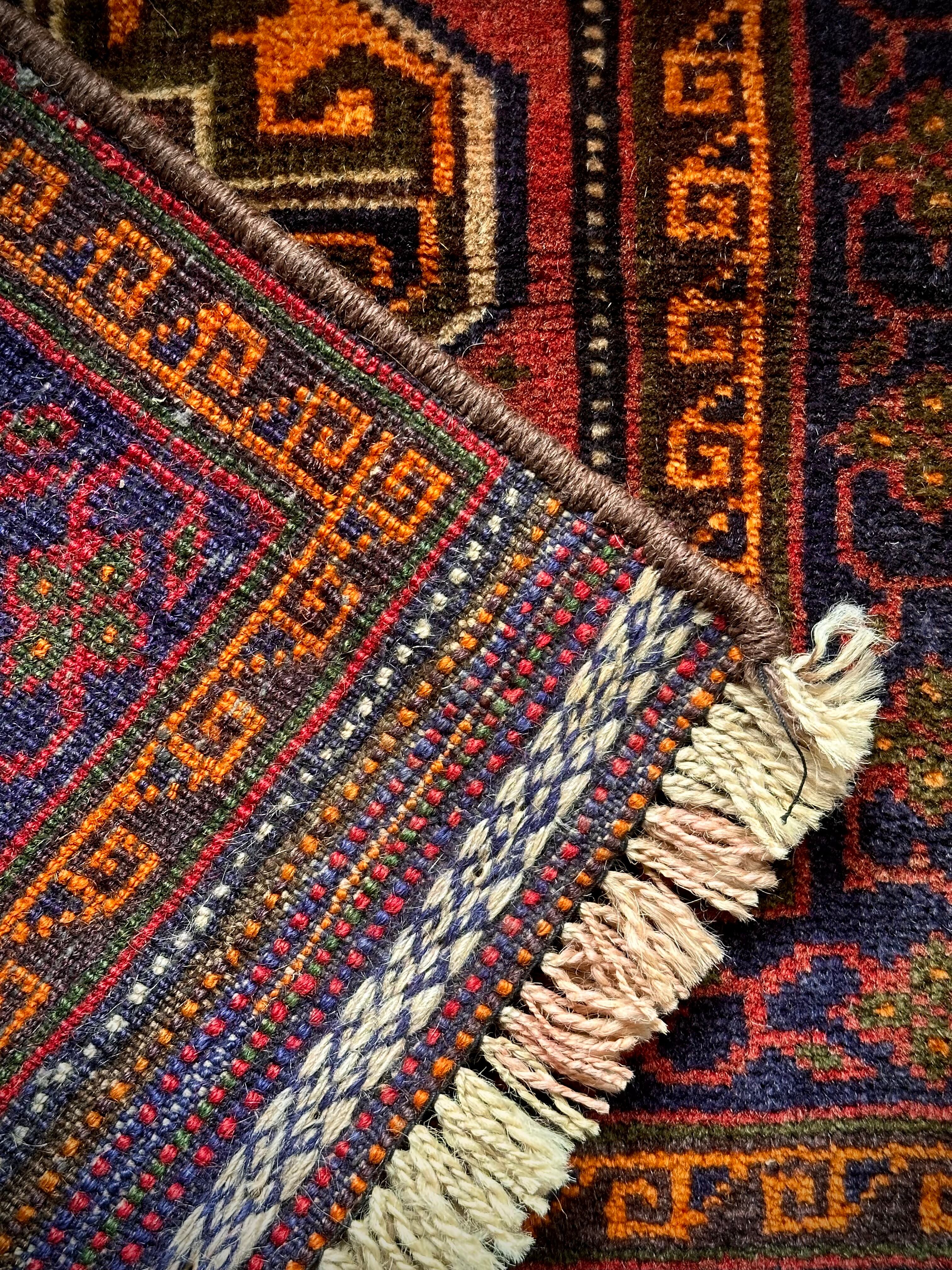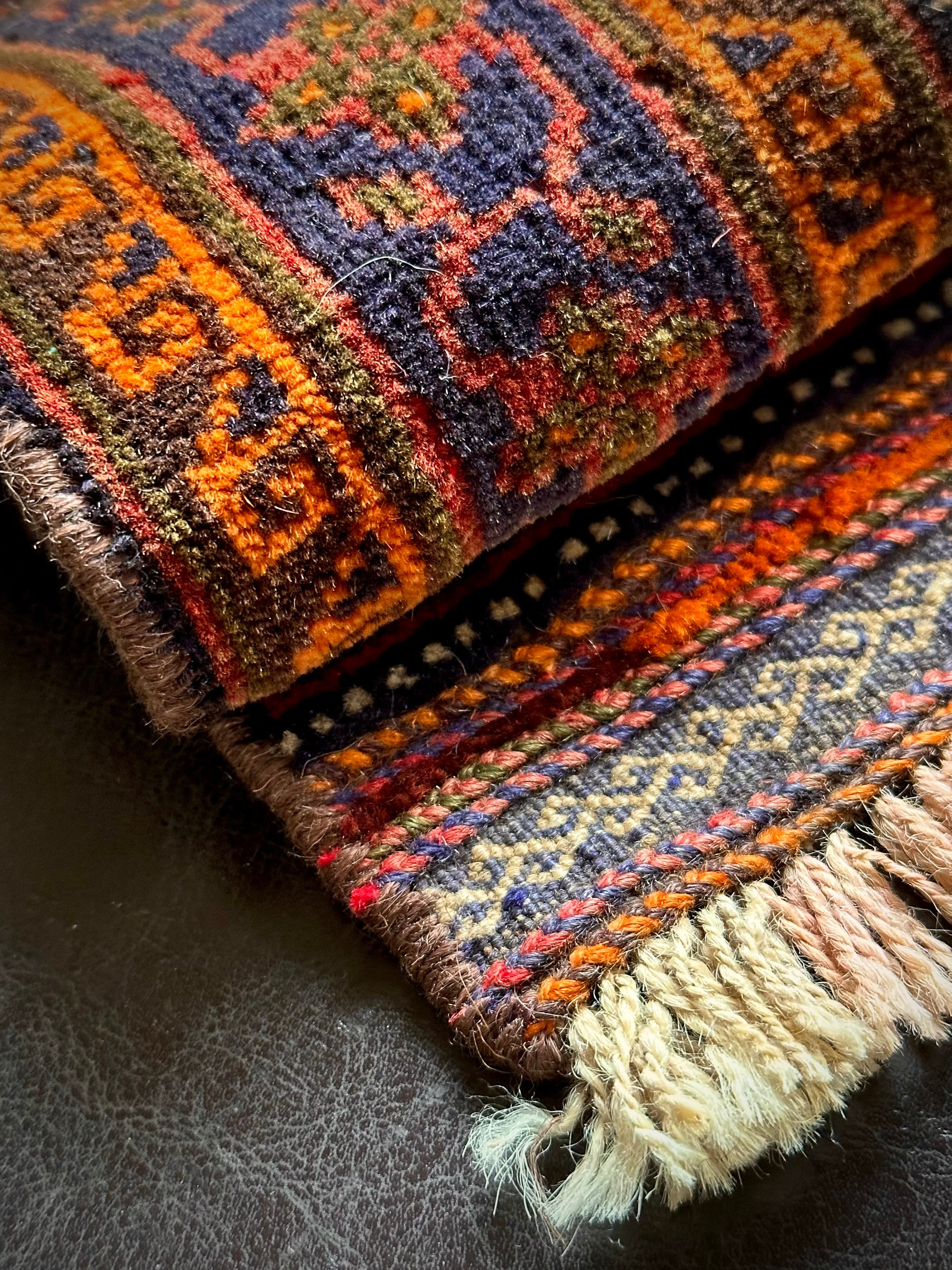 きれいなテラコッタカラーにブラウンやネイビーの色合いではっきりとしたまとまりが見事なこちらは、アフガニスタンはヘラート州にて半遊牧生活を送るマルダリ・バルーチ族のトライバルラグで、元はラクダなどに担がせるホルジンと呼ばれる振り分け用サドルバッグの表皮をラグに仕立て直したモノになります。