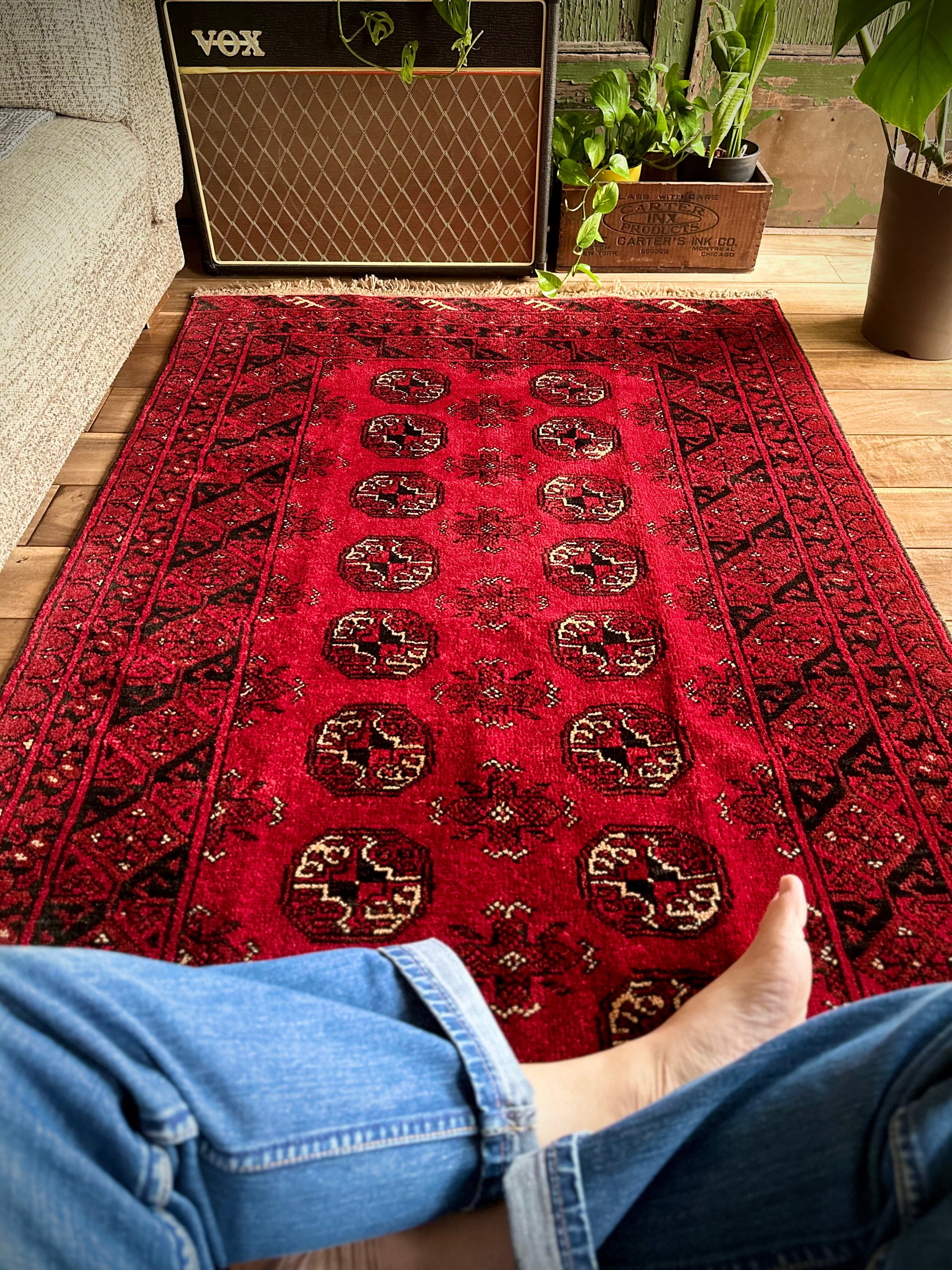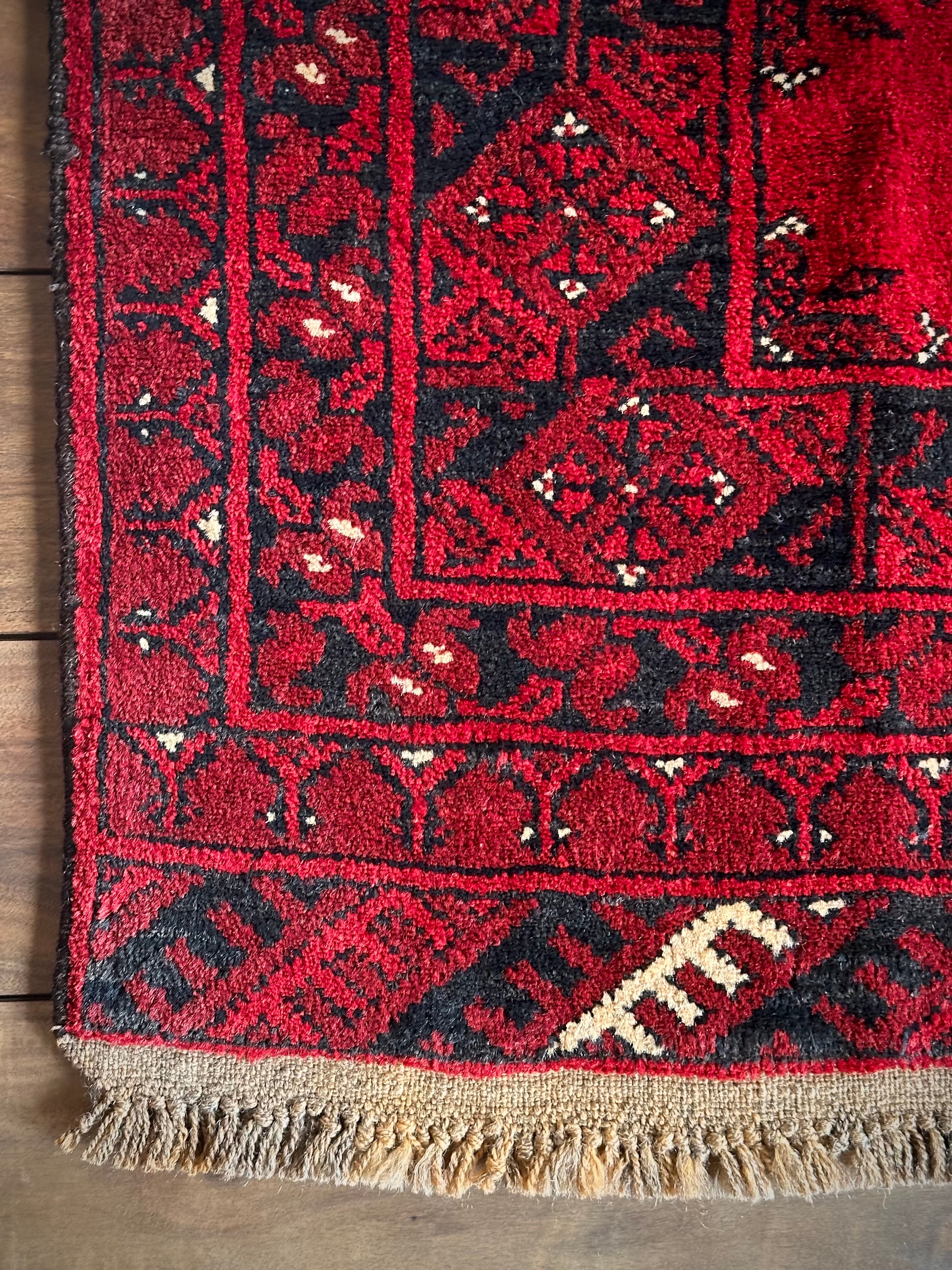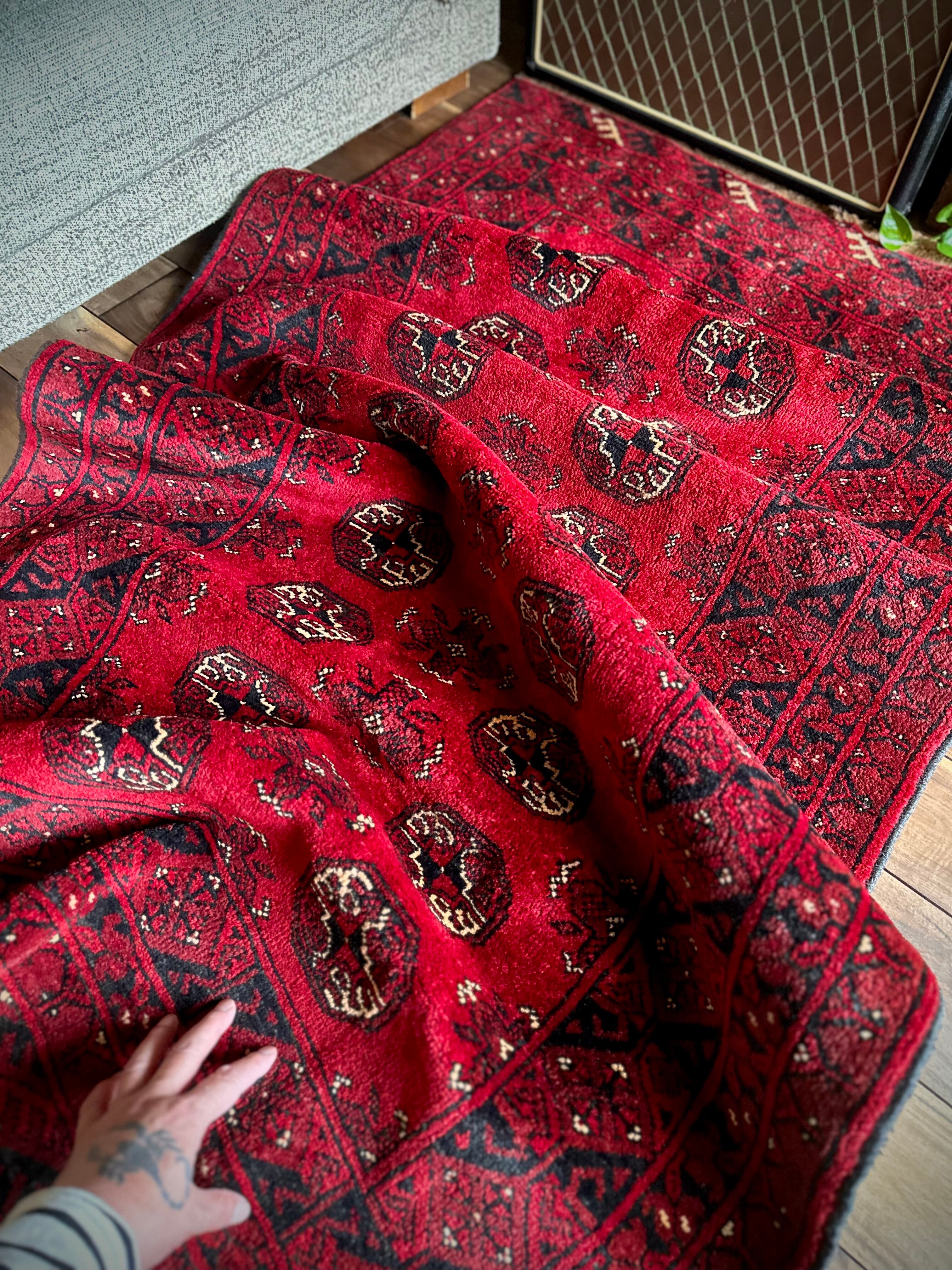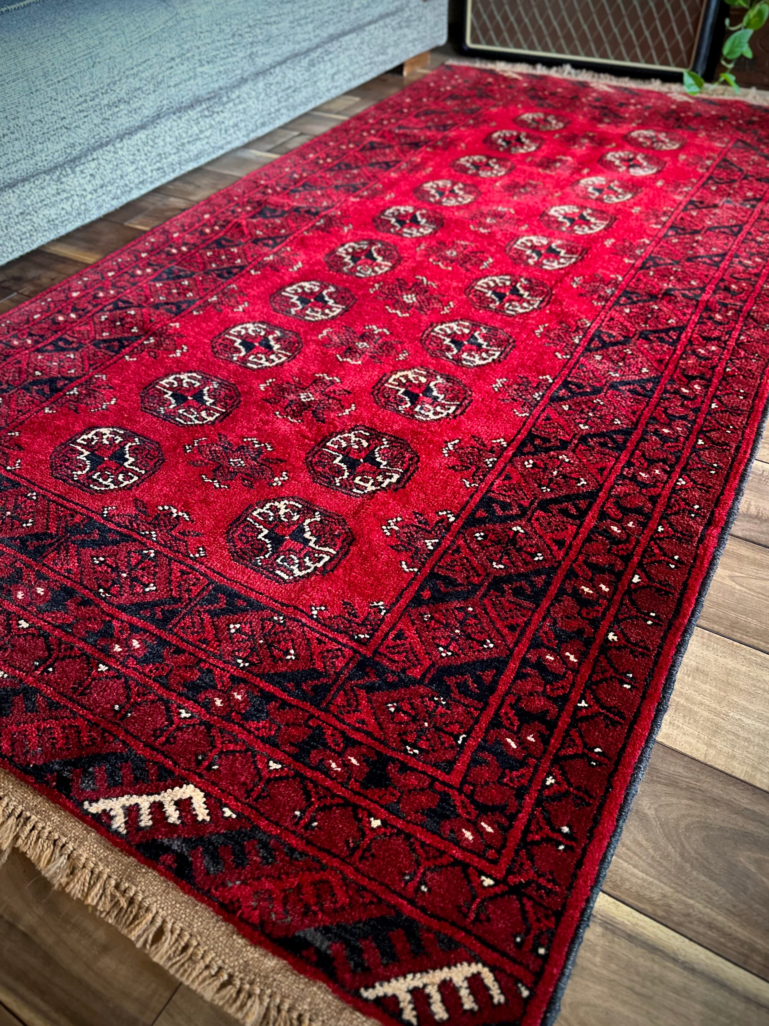 眩しいほどの鮮やかな赤色をベースに、テッケギュルの連続紋様と細やかなミルフィーユ状のボーダーが威厳を感じさせるこちらは、アフガニスタン北部に暮らすトルクメン族のトライバルラグで、基本的なシングルサイズの丈夫なメインラグになります。