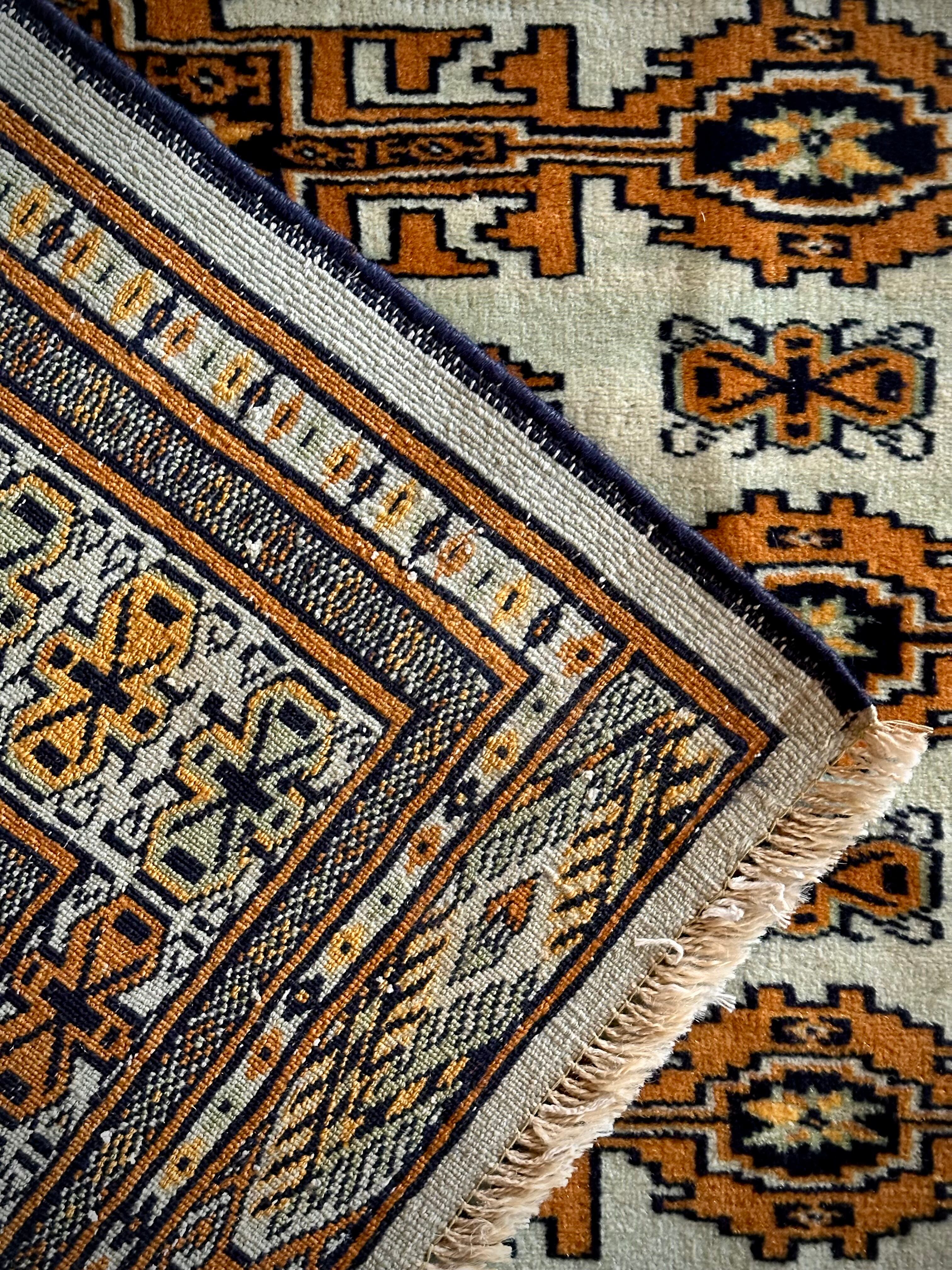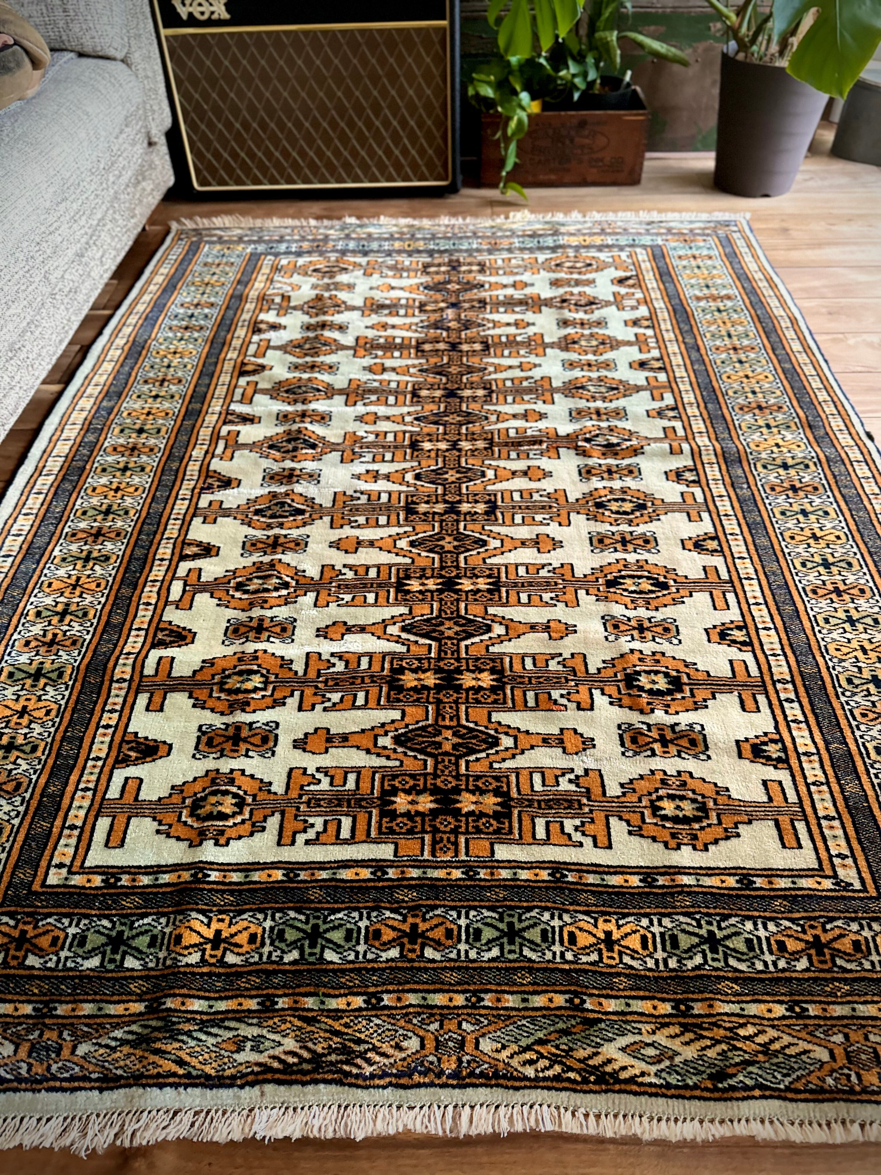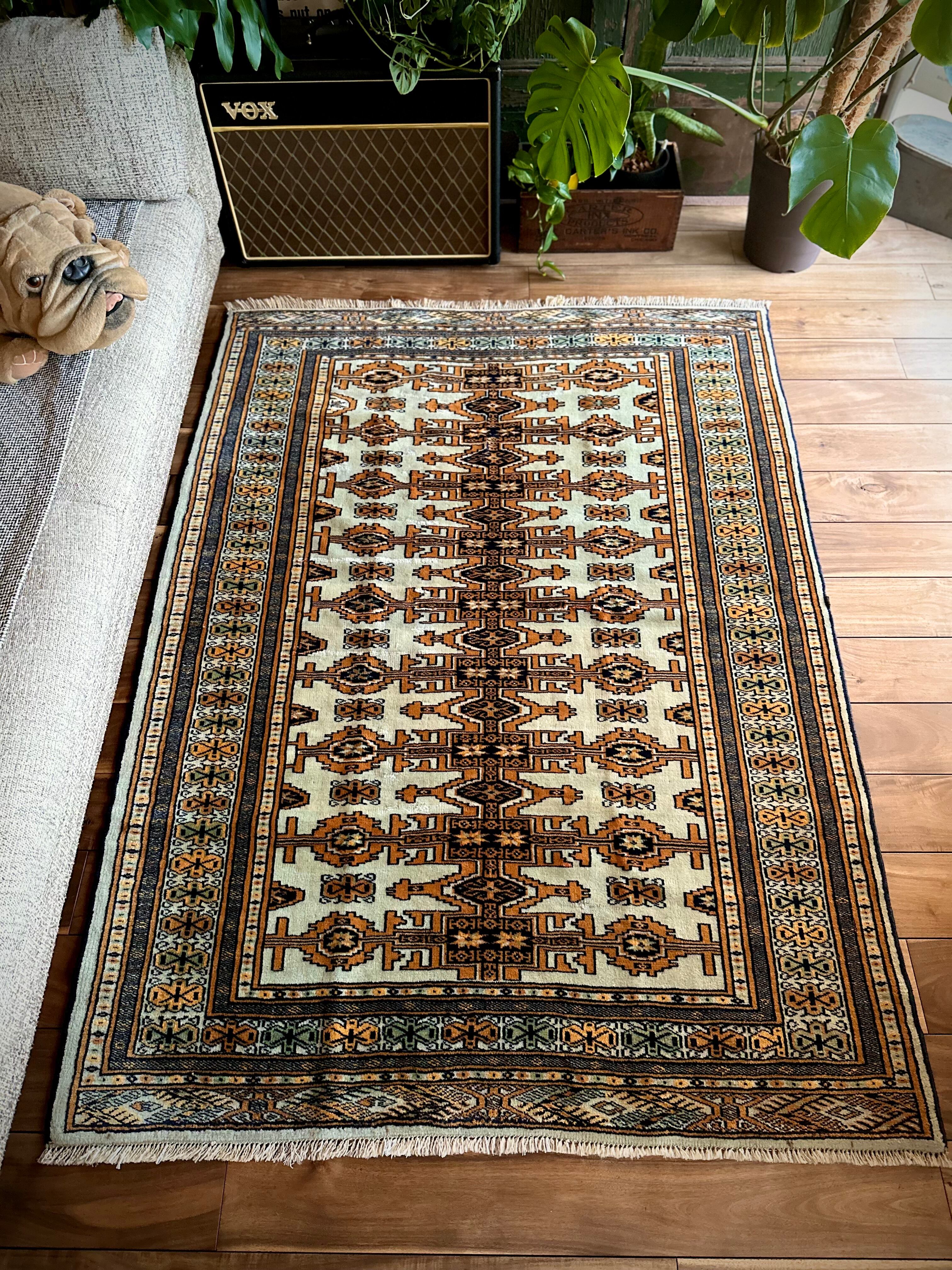 経年としては50年のヴィンテージラグらしくそれなりの使用感があり、特に目立つ汚れやダメージにリペア箇所はありませんが、元からだと思われるパイルがモサモサとした部分が数カ所ありますのでご確認ください。またパイル自体は短めながらもしっとりとした肌触りで、色合い的にも床色を選ばない落ち着きのある1枚になります。