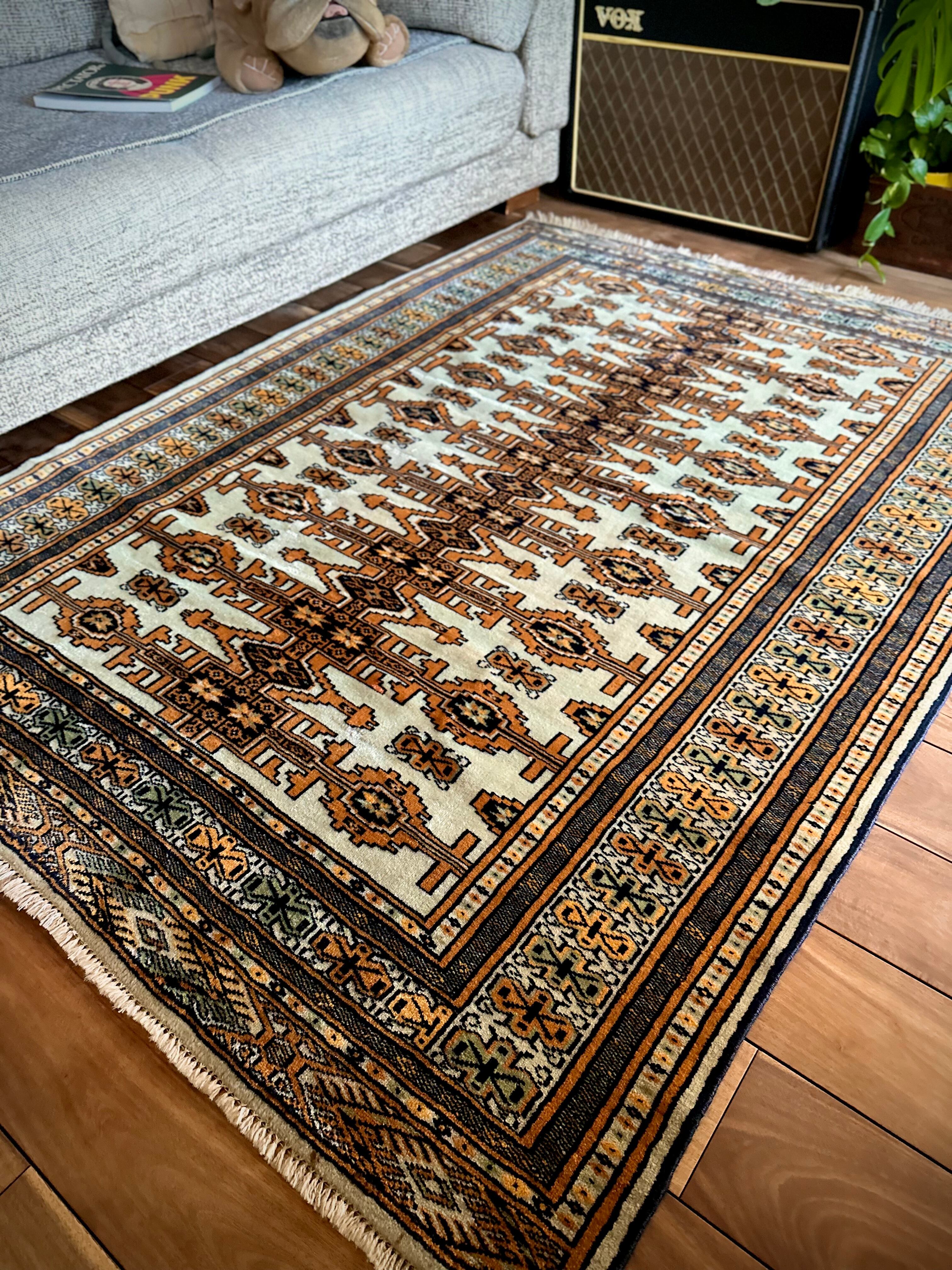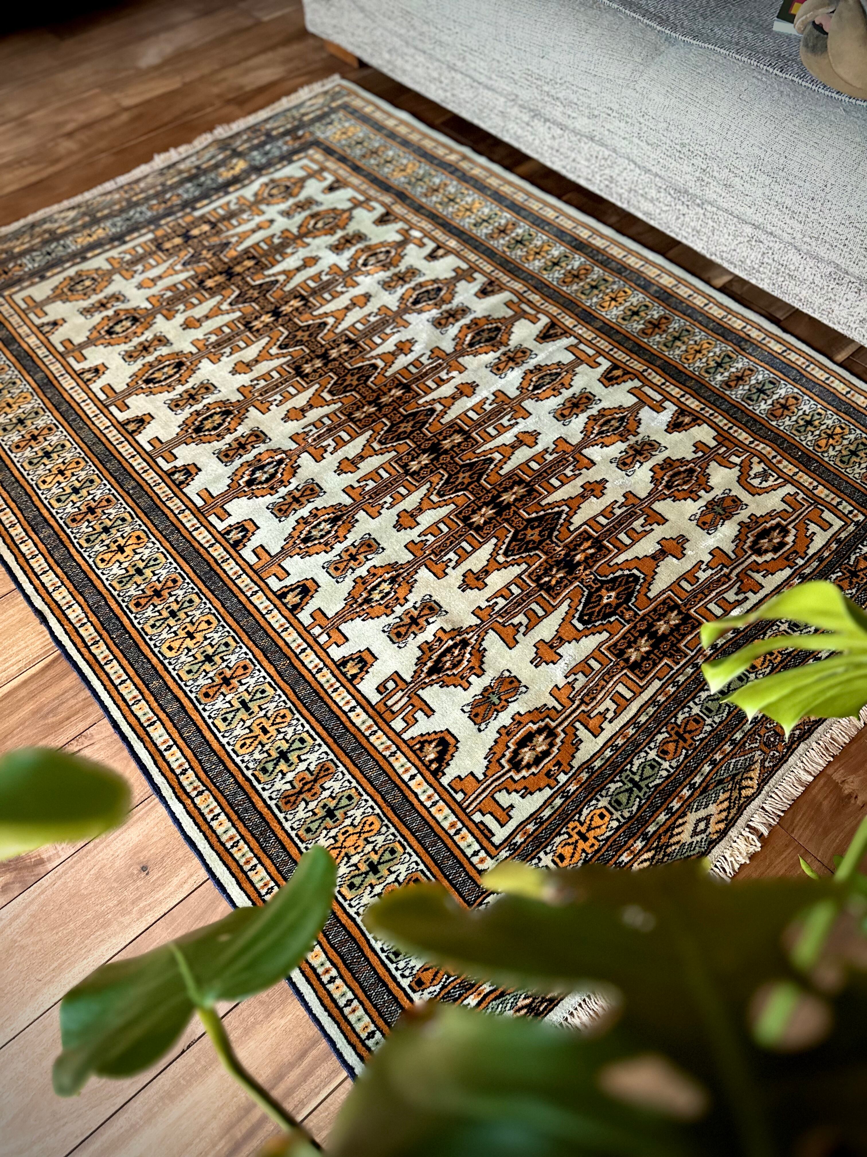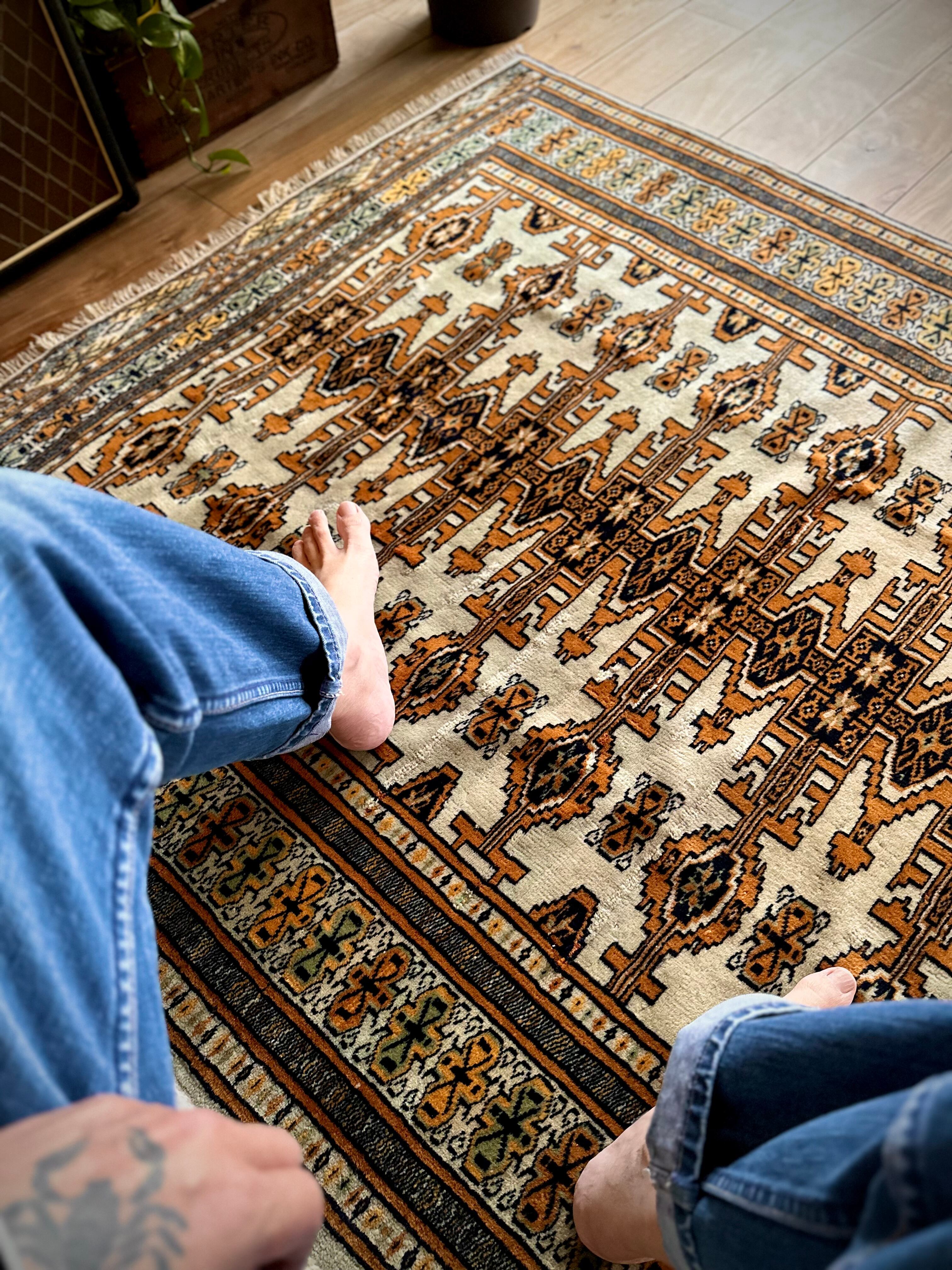 経年としては50年のヴィンテージラグらしくそれなりの使用感があり、特に目立つ汚れやダメージにリペア箇所はありませんが、元からだと思われるパイルがモサモサとした部分が数カ所ありますのでご確認ください。またパイル自体は短めながらもしっとりとした肌触りで、色合い的にも床色を選ばない落ち着きのある1枚になります。