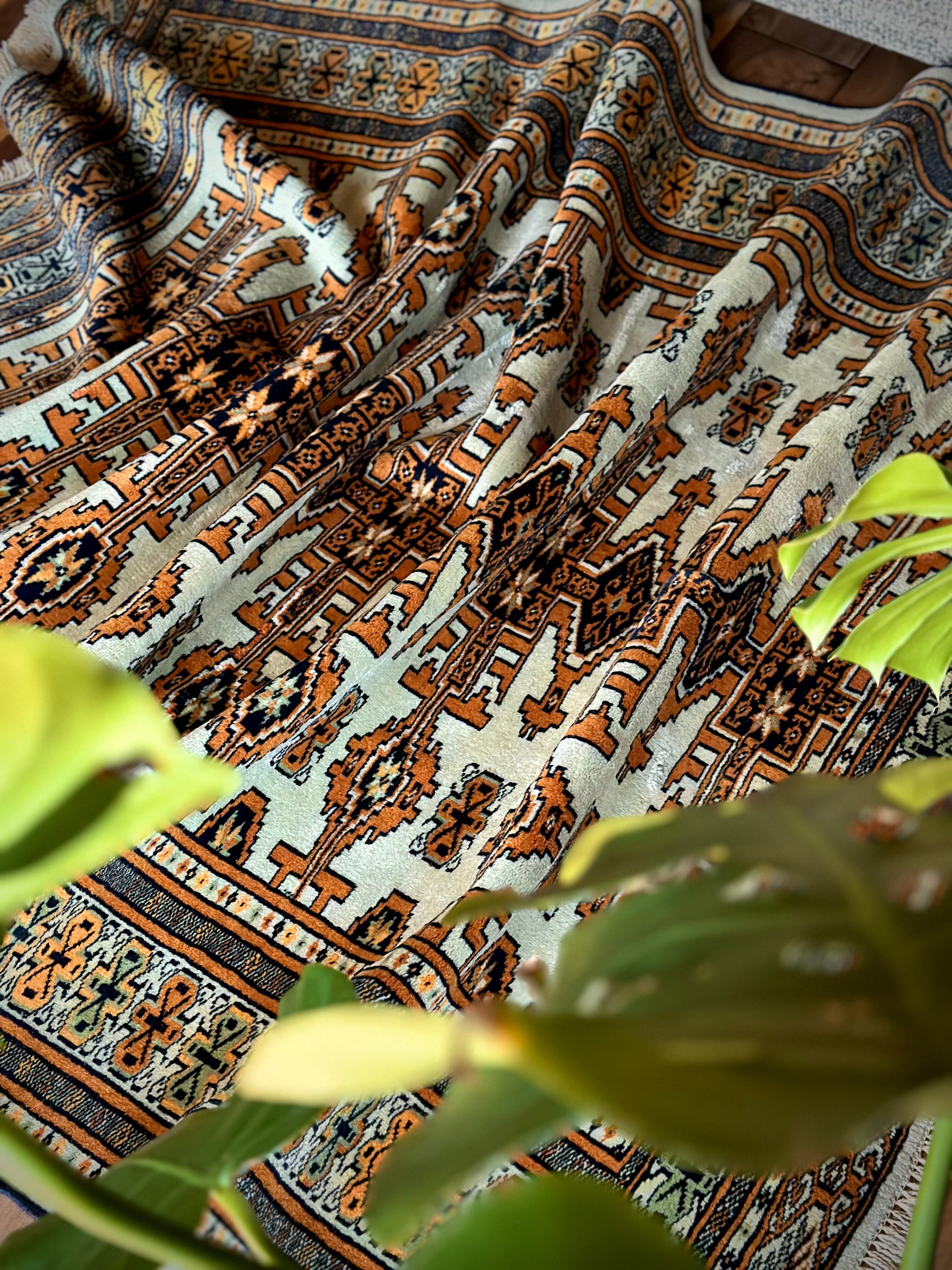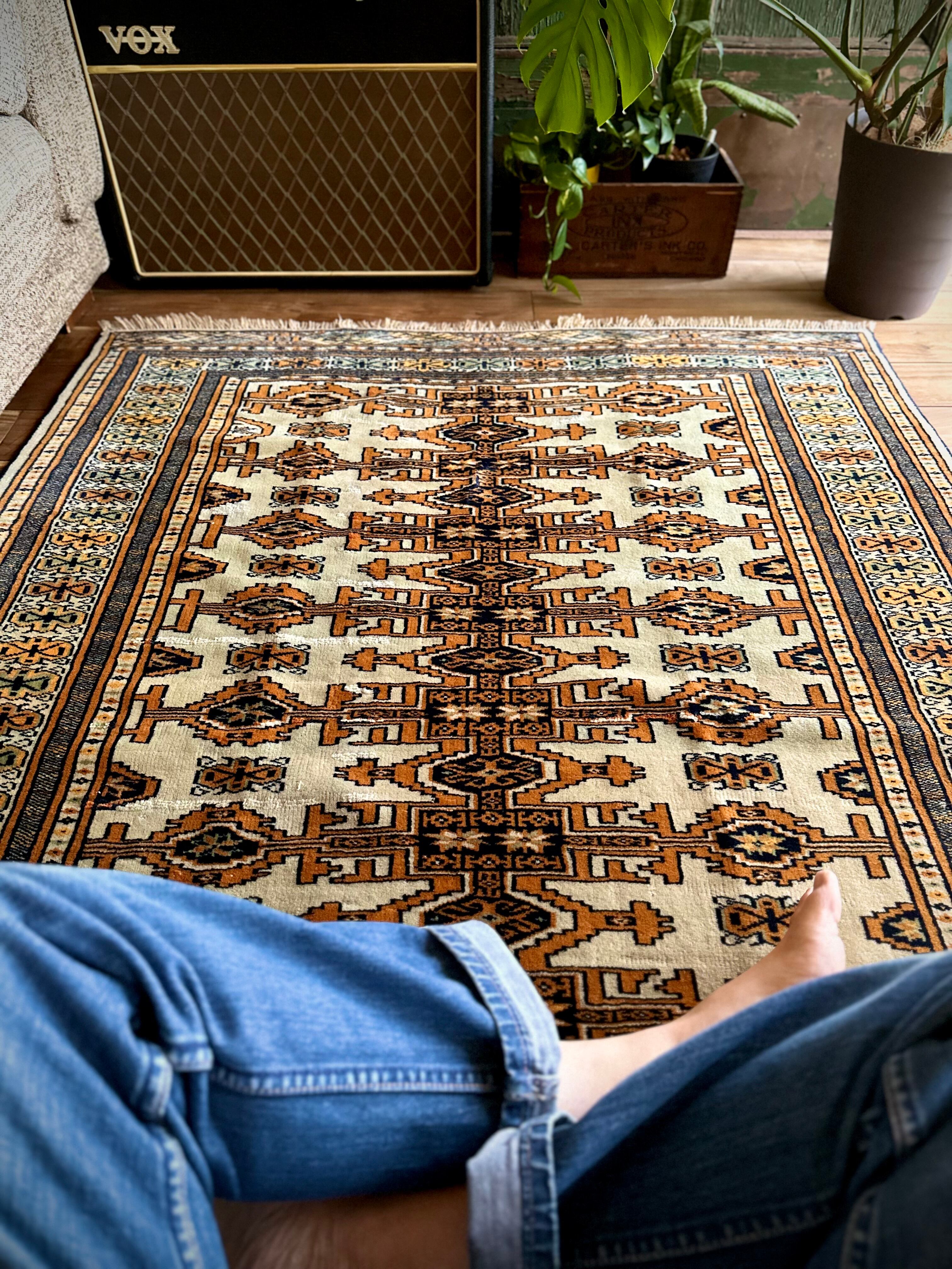 最後にラグそのものに関しては羊毛特有の匂いがあり、採寸は中央付近で計測していますが、手織りならではの歪みによる誤差や水洗いクリーニングによる縮み、また草木染めによる経年劣化の色ムラなどがありますが、それもまたヴィンテージラグの魅力かとご理解ください。
