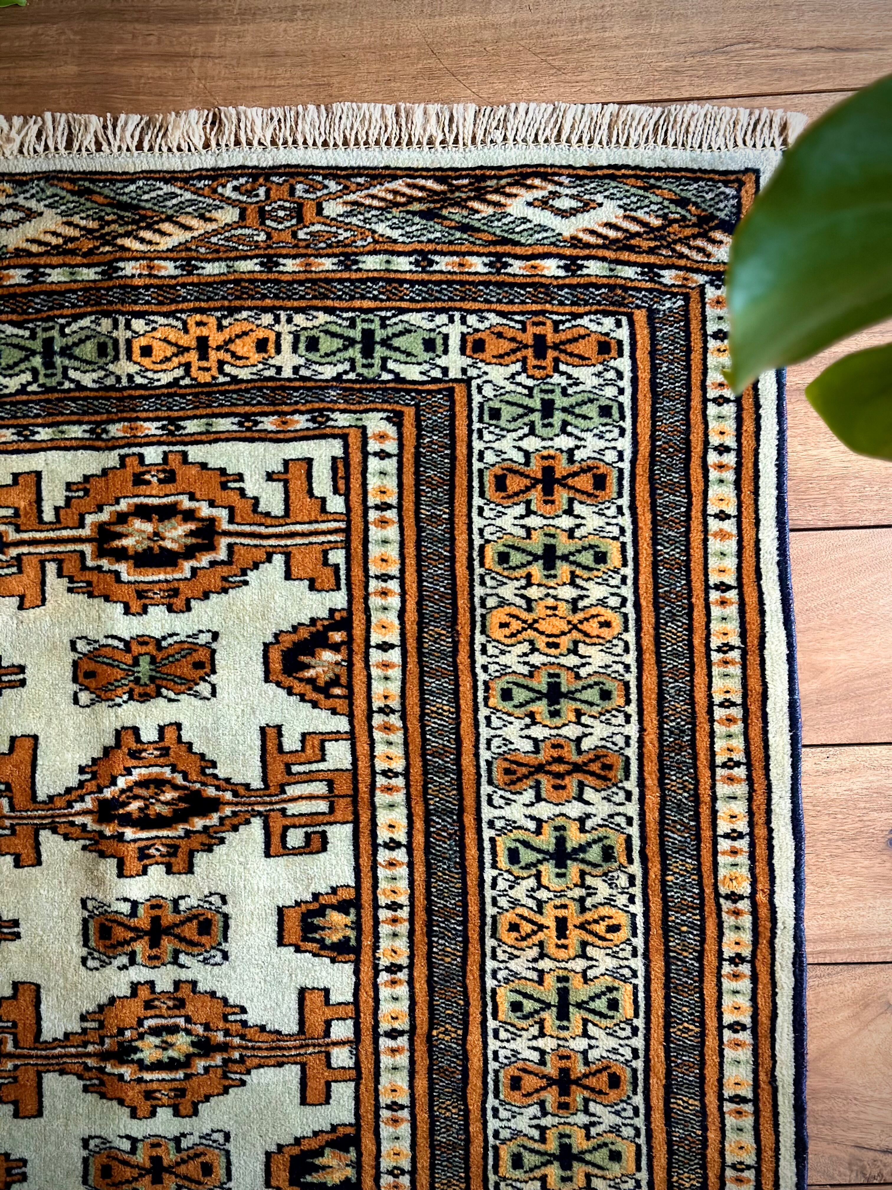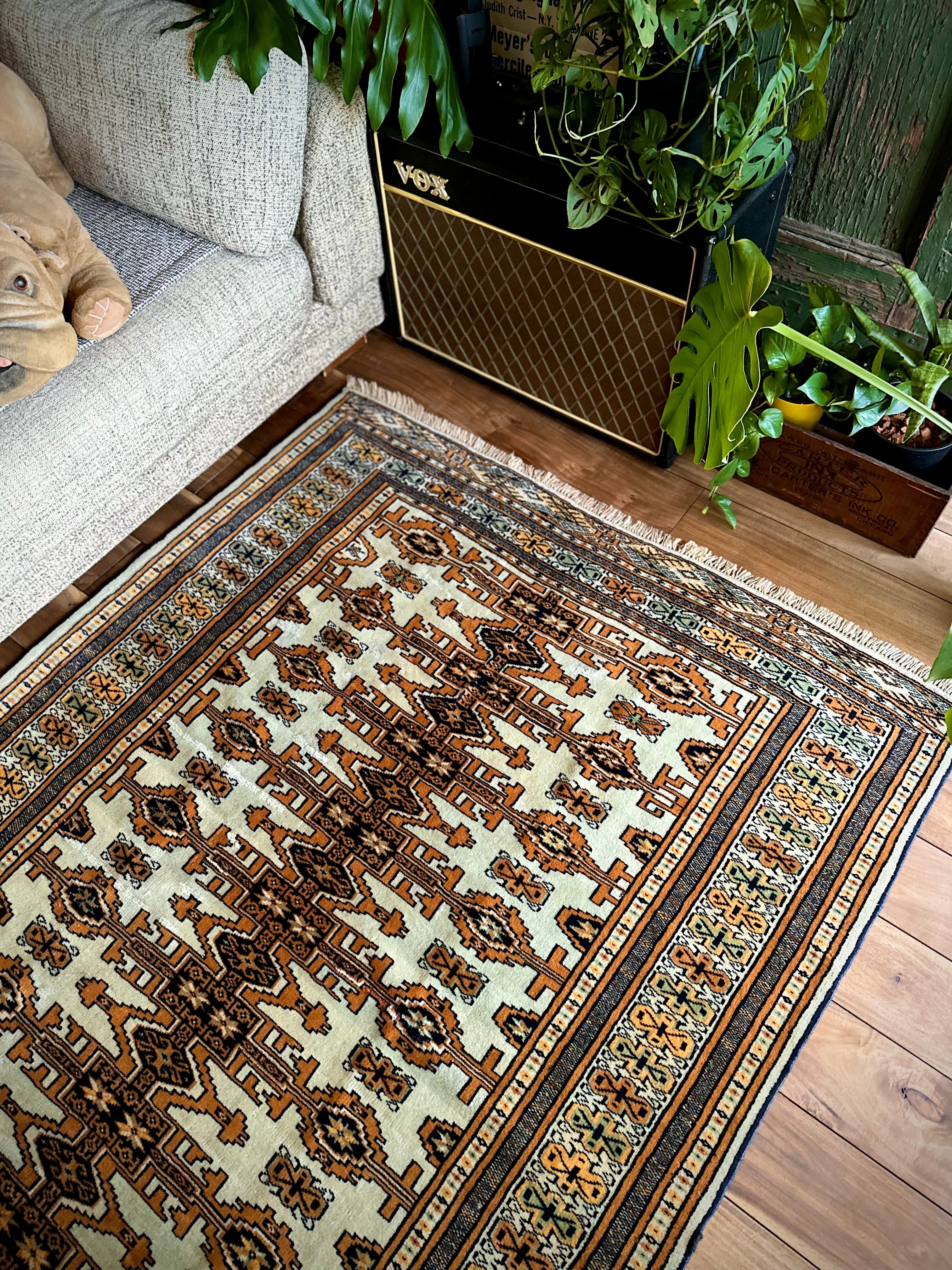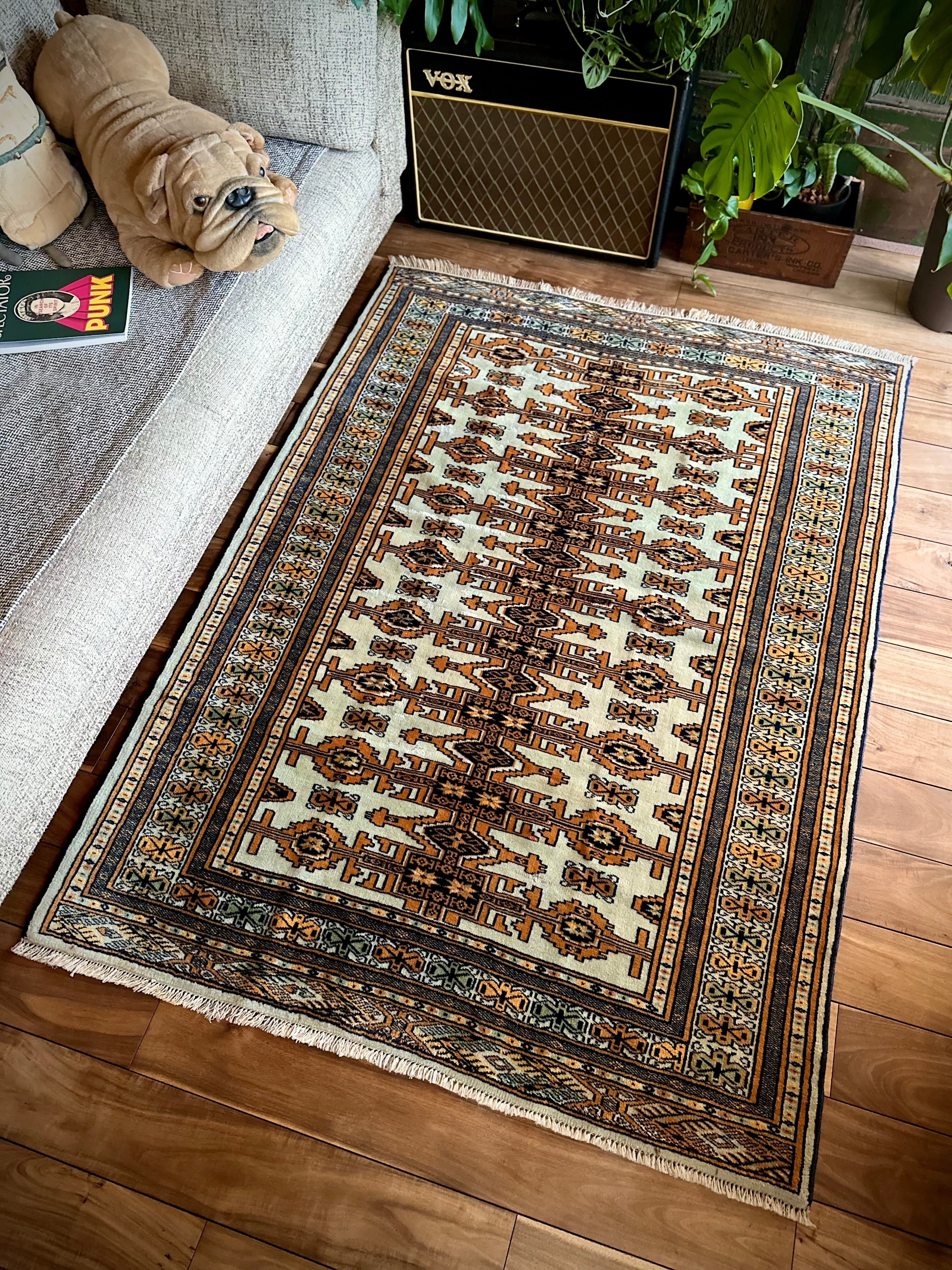シルヴァンとはイランの北部に位置するアゼルバイジャンにある街の名称で、その辺りに継承される織り柄を模造したラグは他国でも多く作られるほど伝統的なスタイルとして人気があり、こちらもそんな1枚でトライバルラグとは一線を画するコーカサスらしさが良いですね。