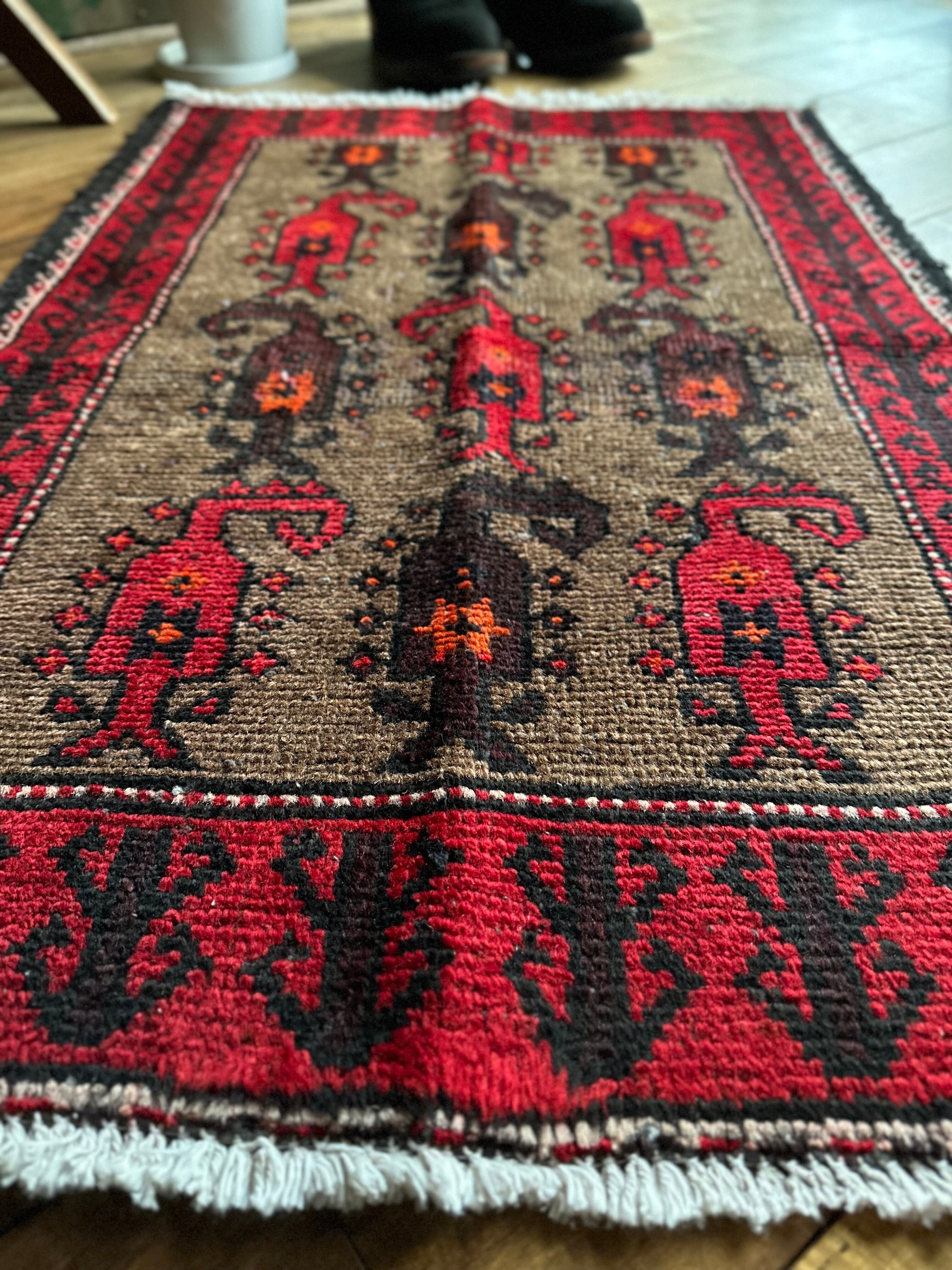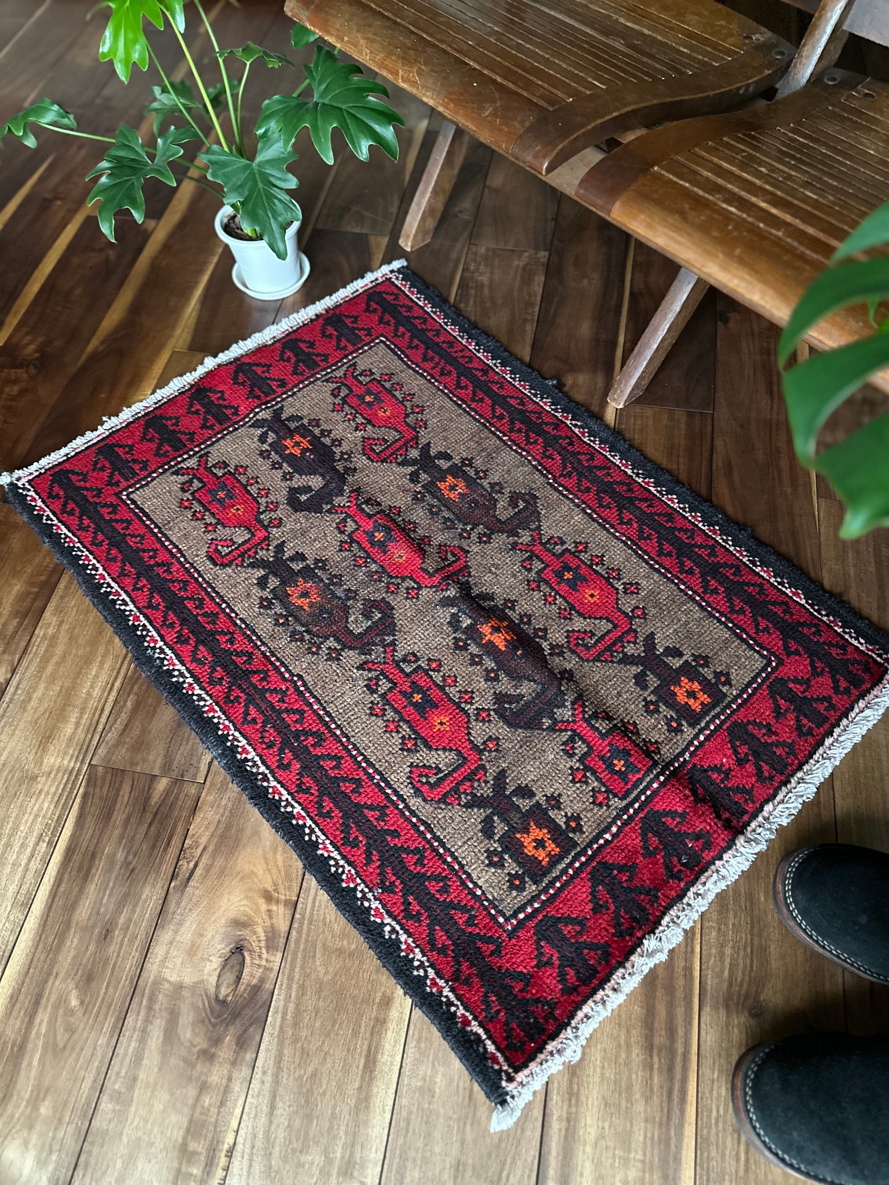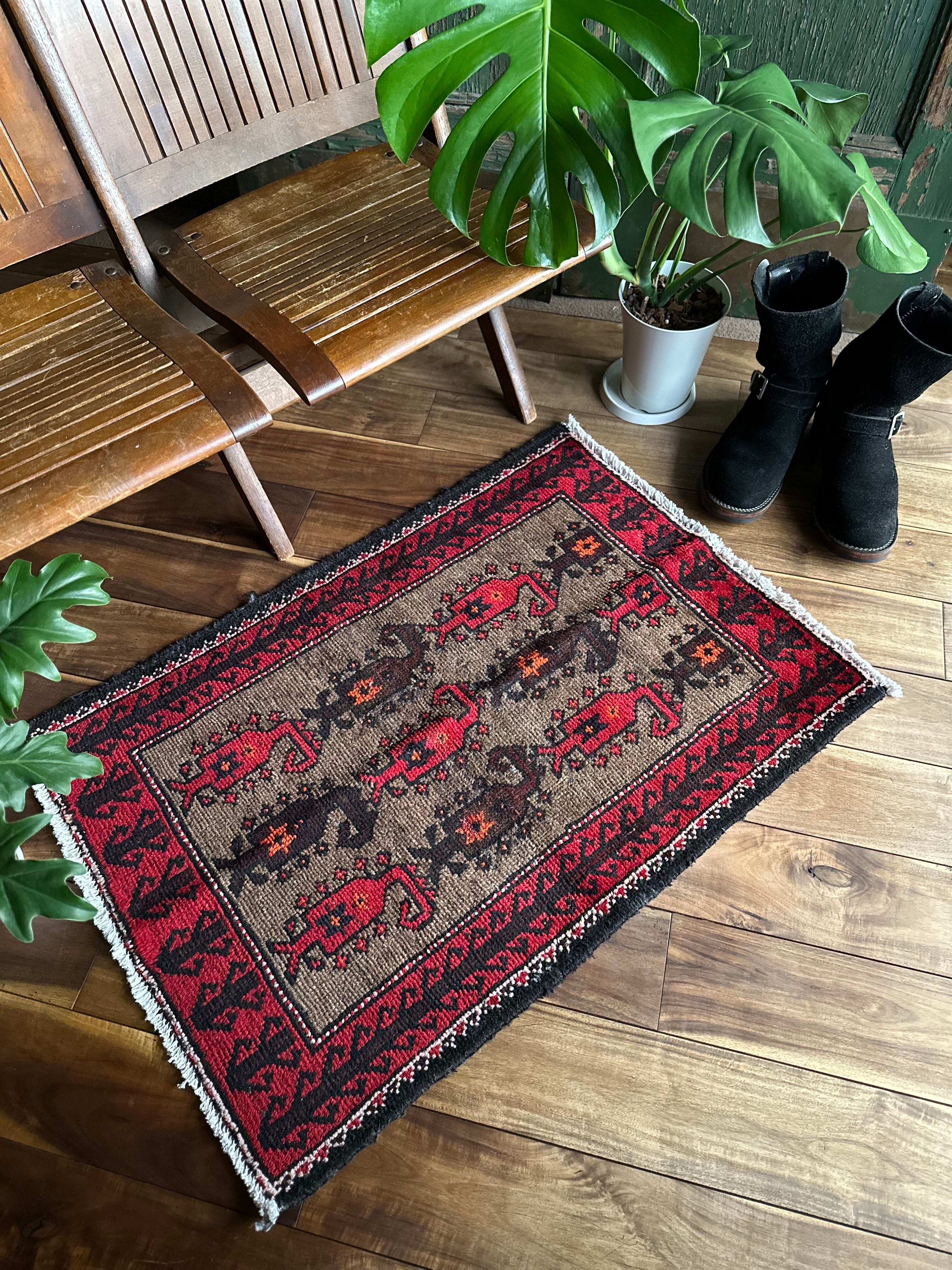 アフガン系のバルーチに見られる重厚さとは裏腹に、幼なげな印象が残るヴィレッジラグでしょうか、玄関マットに最適なサイズ感で毛足の短さもそれに適しています。